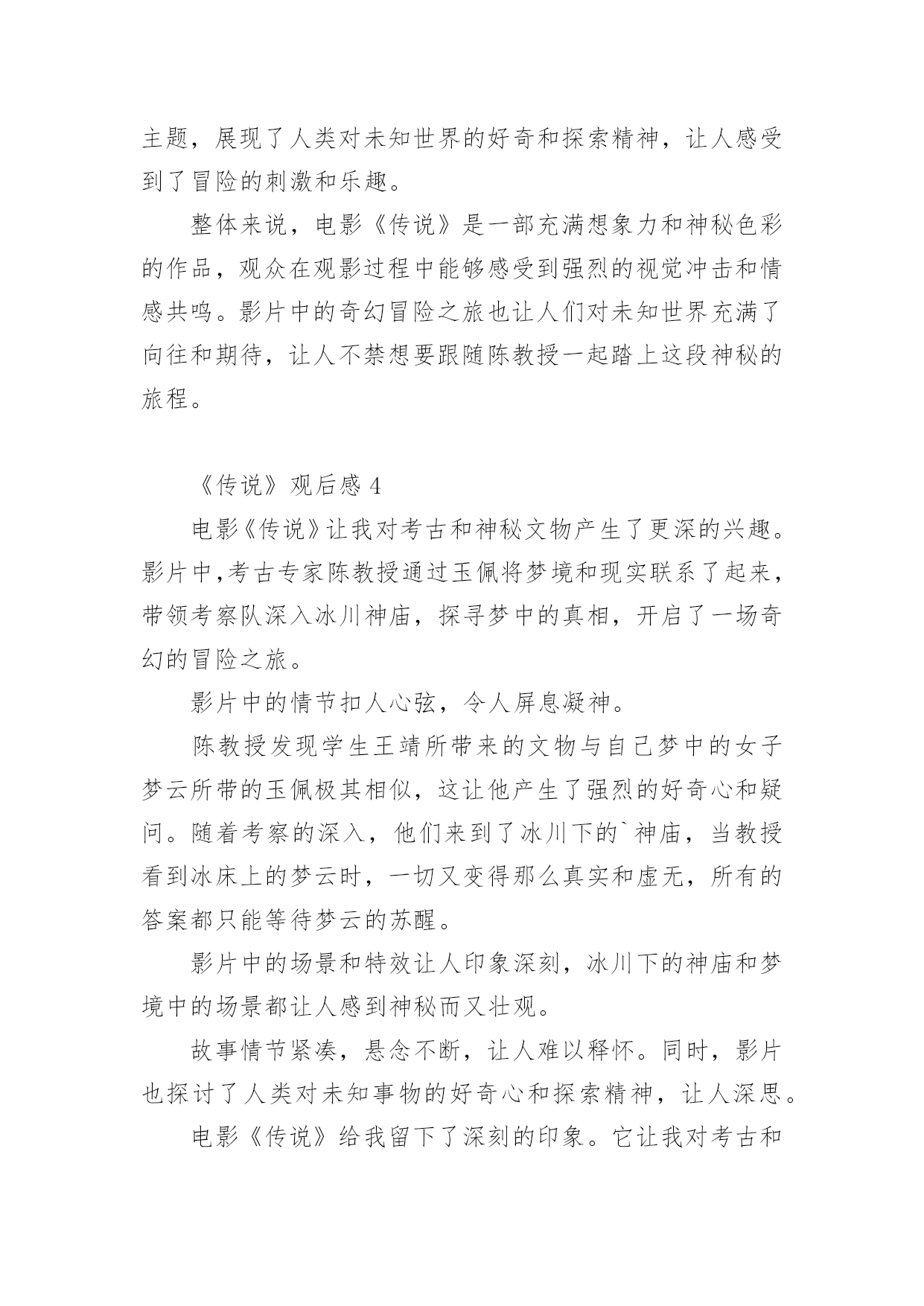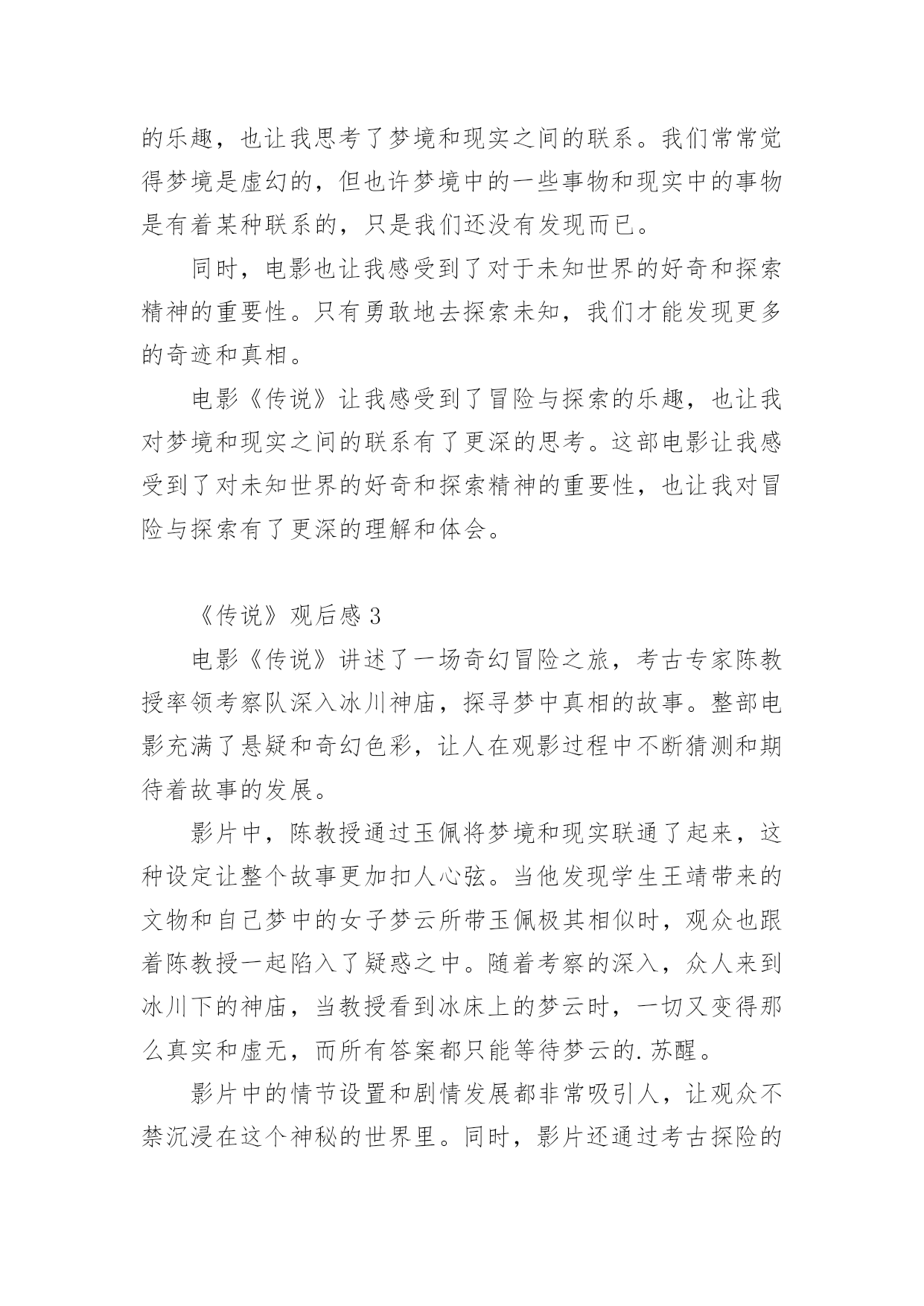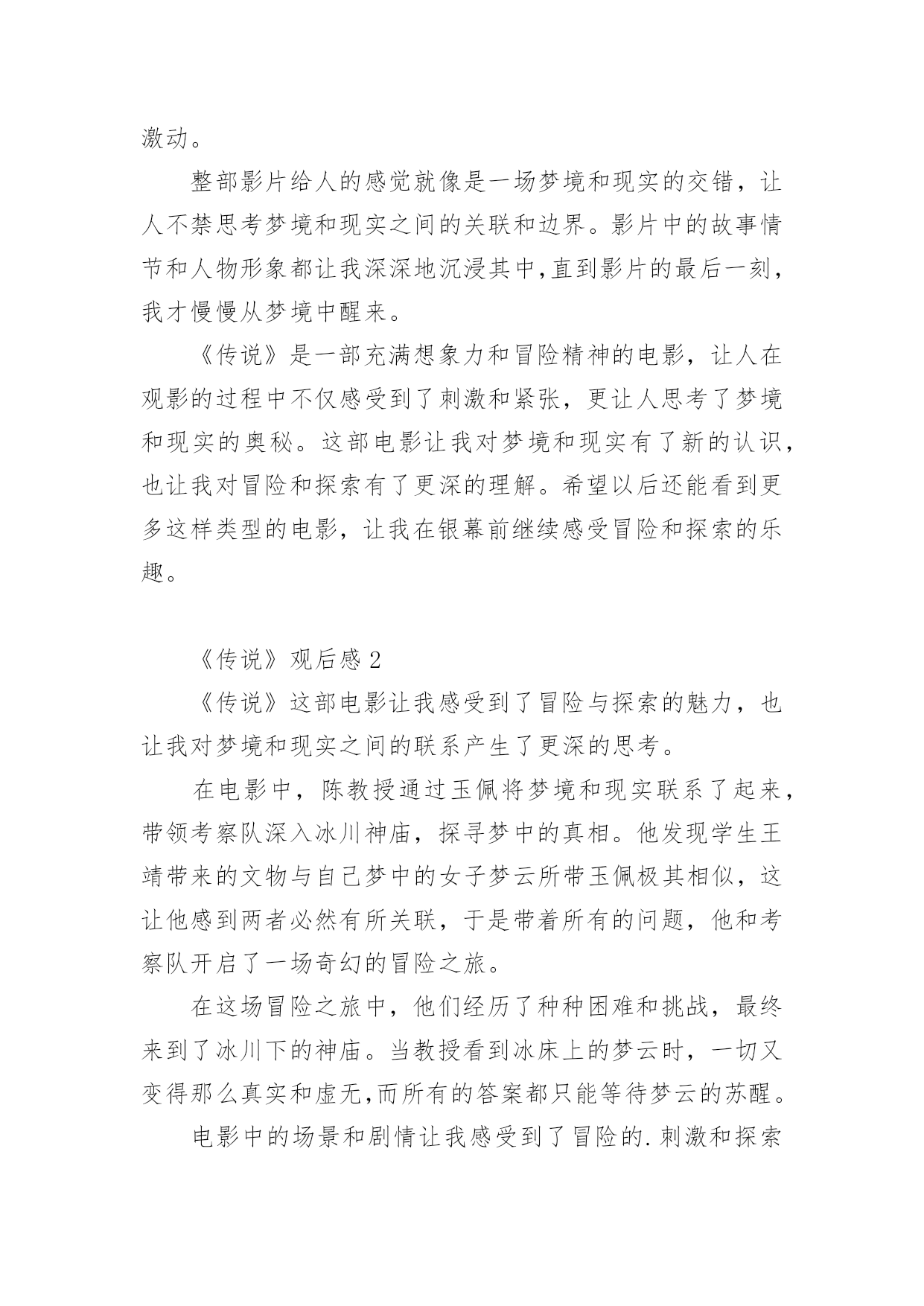 《传说》观后感《传说》观后感(通用6篇)当观看完一部影视作品后,相信大家增长不少见闻吧,撰写观后感可以帮助我们提升自己。那要怎么写好观后感呢?下面是小编为大家收集的《传说》观后感(通用6篇),仅供参考,大家一起来看看吧。《传说》观后感1电影《传说》给我留下了深刻的印象,它不仅仅是一部冒险片,更是一次对梦境和现实的探索和思考。影片中的考古专家陈教授通过玉佩将梦境和现实联系在一起,带领考察队深入冰川神庙,探寻梦中的真相,开启了一场奇幻的冒险之旅。影片中的情节扣人心弦,让我跟随着教授和考察队一起感受到了冒险的刺激和悬疑的紧张。特别是当教授发现学生王靖带来的文物与自己梦中的女子梦云所带玉佩极其相似时,我也跟着他一起感到了疑惑和好奇。随着考察的深入,当教授看到冰床上的`梦云时,一切又变得那么真实和虚无,所有的答案都只能等待梦云的苏醒。影片中的画面和音乐也给人留下了深刻的印象,冰川下的神庙和梦境中的景象都让人感到神秘而壮观。配乐更是恰到好处,让人情不自禁地跟随着教授一起感受冒险和探索的激动。整部影片给人的感觉就像是一场梦境和现实的交错,让人不禁思考梦境和现实之间的关联和边界。影片中的故事情节和人物形象都让我深深地沉浸其中,直到影片的最后一刻,我才慢慢从梦境中醒来。《传说》是一部充满想象力和冒险精神的电影,让人在观影的过程中不仅感受到了刺激和紧张,更让人思考了梦境和现实的奥秘。这部电影让我对梦境和现实有了新的认识,也让我对冒险和探索有了更深的理解。希望以后还能看到更多这样类型的电影,让我在银幕前继续感受冒险和探索的乐趣。《传说》观后感2《传说》这部电影让我感受到了冒险与探索的魅力,也让我对梦境和现实之间的联系产生了更深的思考。在电影中,陈教授通过玉佩将梦境和现实联系了起来,带领考察队深入冰川神庙,探寻梦中的真相。他发现学生王靖带来的文物与自己梦中的女子梦云所带玉佩极其相似,这让他感到两者必然有所关联,于是带着所有的问题,他和考察队开启了一场奇幻的冒险之旅。在这场冒险之旅中,他们经历了种种困难和挑战,最终来到了冰川下的神庙。当教授看到冰床上的梦云时,一切又变得那么真实和虚无,而所有的答案都只能等待梦云的苏醒。电影中的场景和剧情让我感受到了冒险的.刺激和探索的乐趣,也让我思考了梦境和现实之间的联系。我们常常觉得梦境是虚幻的,但也许梦境中的一些事物和现实中的事物是有着某种联系的,只是我们还没有发现而已。同时,电影也让我感受到了对于未知世界的好奇和探索精神的重要性。只有勇敢地去探索未知,我们才能发现更多的奇迹和真相。电影《传说》让我感受到了冒险与探索的乐趣,也让我对梦境和现实之间的联系有了更深的思考。这部电影让我感受到了对未知世界的好奇和探索精神的重要性,也让我对冒险与探索有了更深的理解和体会。《传说》观后感3电影《传说》讲述了一场奇幻冒险之旅,考古专家陈教授率领考察队深入冰川神庙,探寻梦中真相的故事。整部电影充满了悬疑和奇幻色彩,让人在观影过程中不断猜测和期待着故事的发展。影片中,陈教授通过玉佩将梦境和现实联通了起来,这种设定让整个故事更加扣人心弦。当他发现学生王靖带来的文物和自己梦中的女子梦云所带玉佩极其相似时,观众也跟着陈教授一起陷入了疑惑之中。随着考察的深入,众人来到冰川下的神庙,当教授看到冰床上的梦云时,一切又变得那么真实和虚无,而所有答案都只能等待梦云的.苏醒。影片中的情节设置和剧情发展都非常吸引人,让观众不禁沉浸在这个神秘的世界里。同时,影片还通过考古探险的主题,展现了人类对未知世界的好奇和探索精神,让人感受到了冒险的刺激和乐趣。整体来说,电影《传说》是一部充满想象力和神秘色彩的作品,观众在观影过程中能够感受到强烈的视觉冲击和情感共鸣。影片中的奇幻冒险之旅也让人们对未知世界充满了向往和期待,让人不禁想要跟随陈教授一起踏上这段神秘的旅程。《传说》观后感4电影《传说》让我对考古和神秘文物产生了更深的兴趣。影片中,考古专家陈教授通过玉佩将梦境和现实联系了起来,带领考察队深入冰川神庙,探寻梦中的真相,开启了一场奇幻的冒险之旅。影片中的情节扣人心弦,令人屏息凝神。陈教授发现学生王靖所带来的文物与自己梦中的女子梦云所带的玉佩极其相似,这让他产生了强烈的好奇心和疑问。随着考察的深入,他们来到了冰川下的`神庙,当教授看到冰床上的梦云时,一切又变得那么真实和虚无,所有的答案都只能等待梦云的苏醒。影片中的场景和特效让人印象深刻,冰川下的神庙和梦境中的场景都让人感到神秘而又壮观。故事情节紧凑,悬念不断,让人难以释怀。同时,影片也探讨了人类对未知事物的好奇心和探索精神,让人深思。电影《传说》给我留下了深刻的印象。它让我对考古和神秘文物产生了更大的兴趣,也让我对人类的探索精神有了更深的理解。这部电影不仅让我度过了一个愉快的电影时光,也让我对人类历史和文明的
