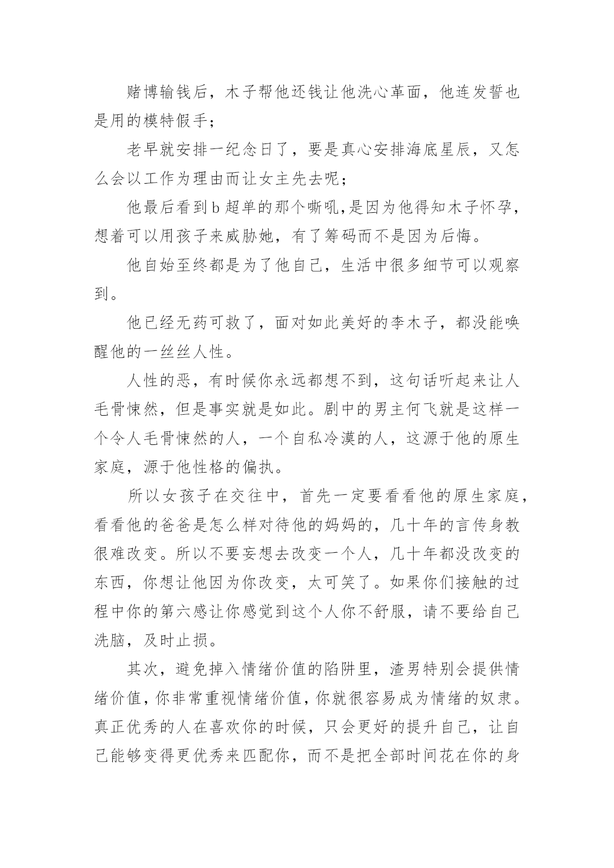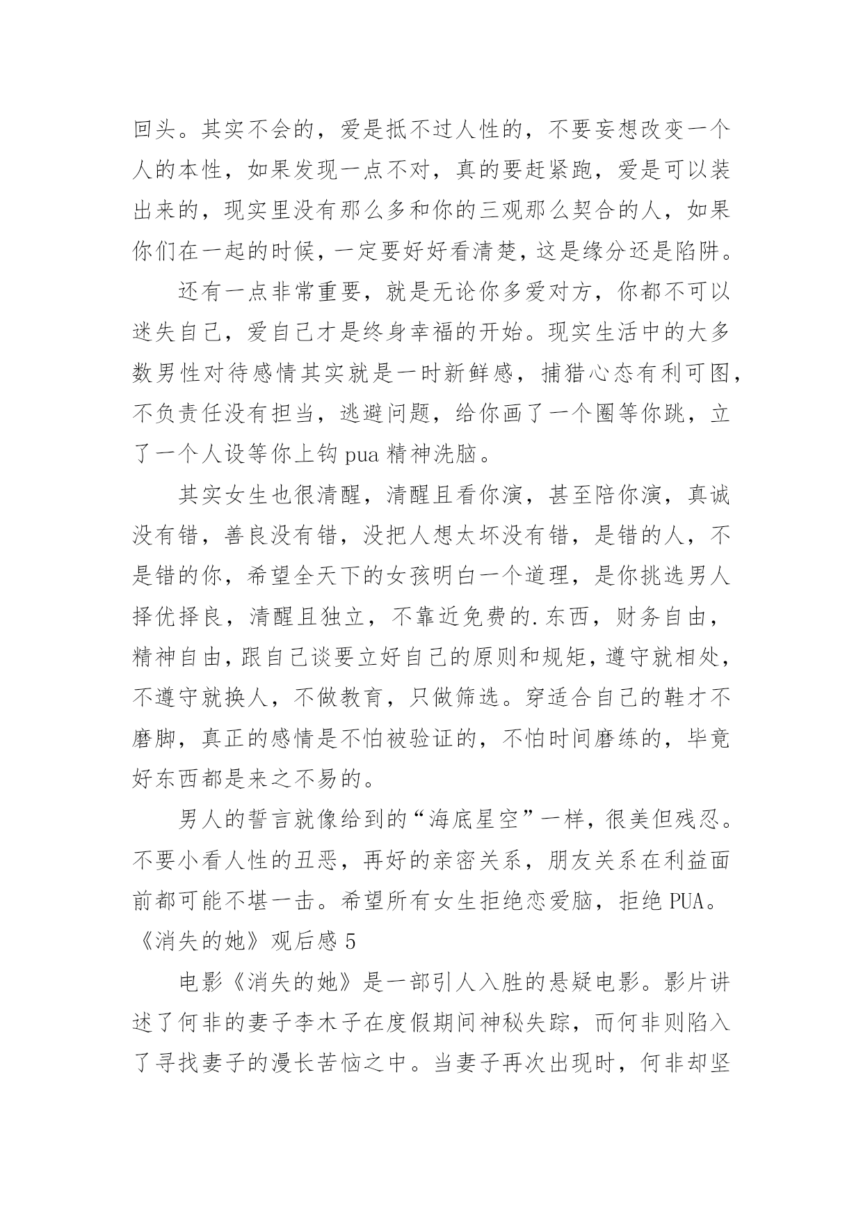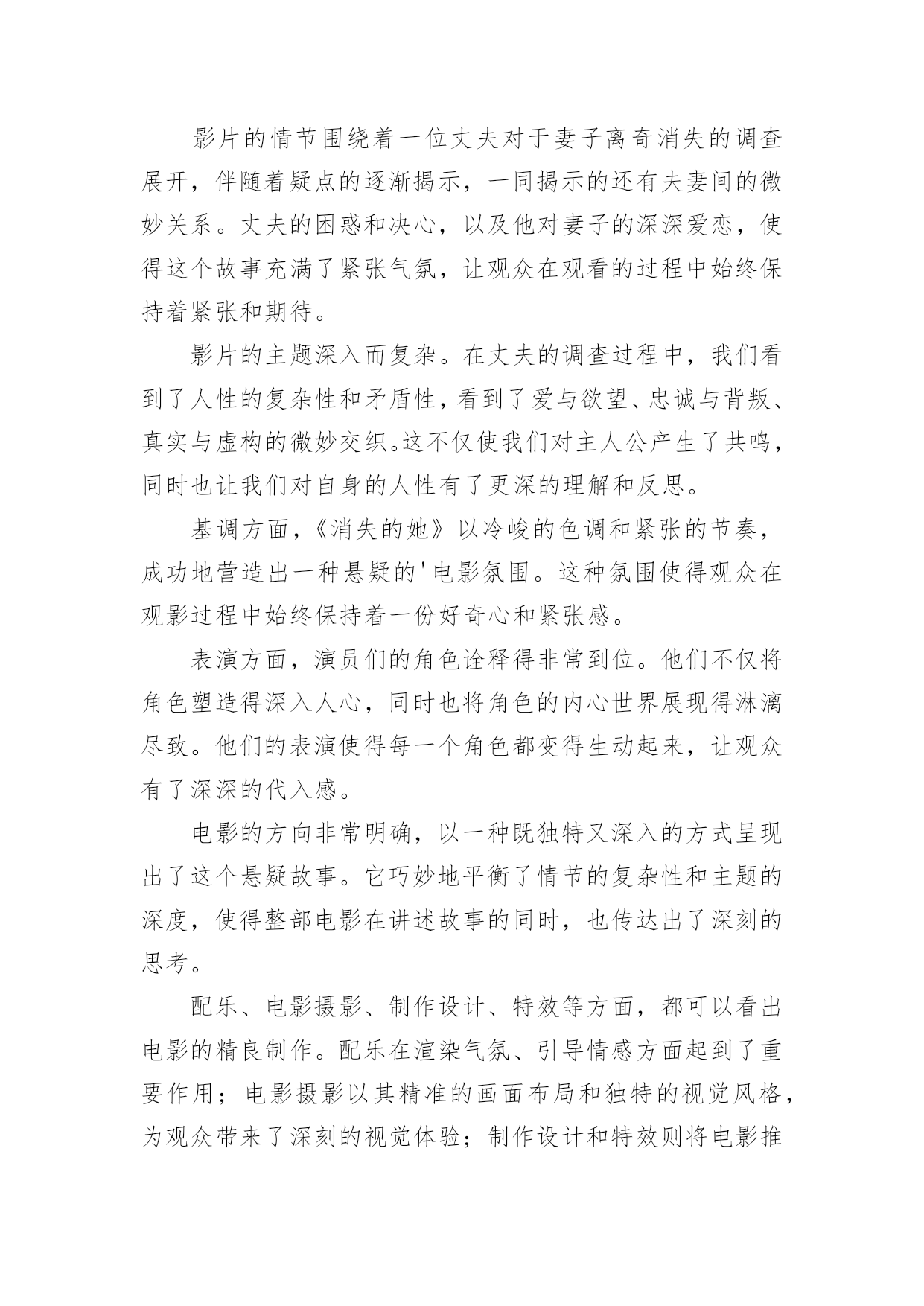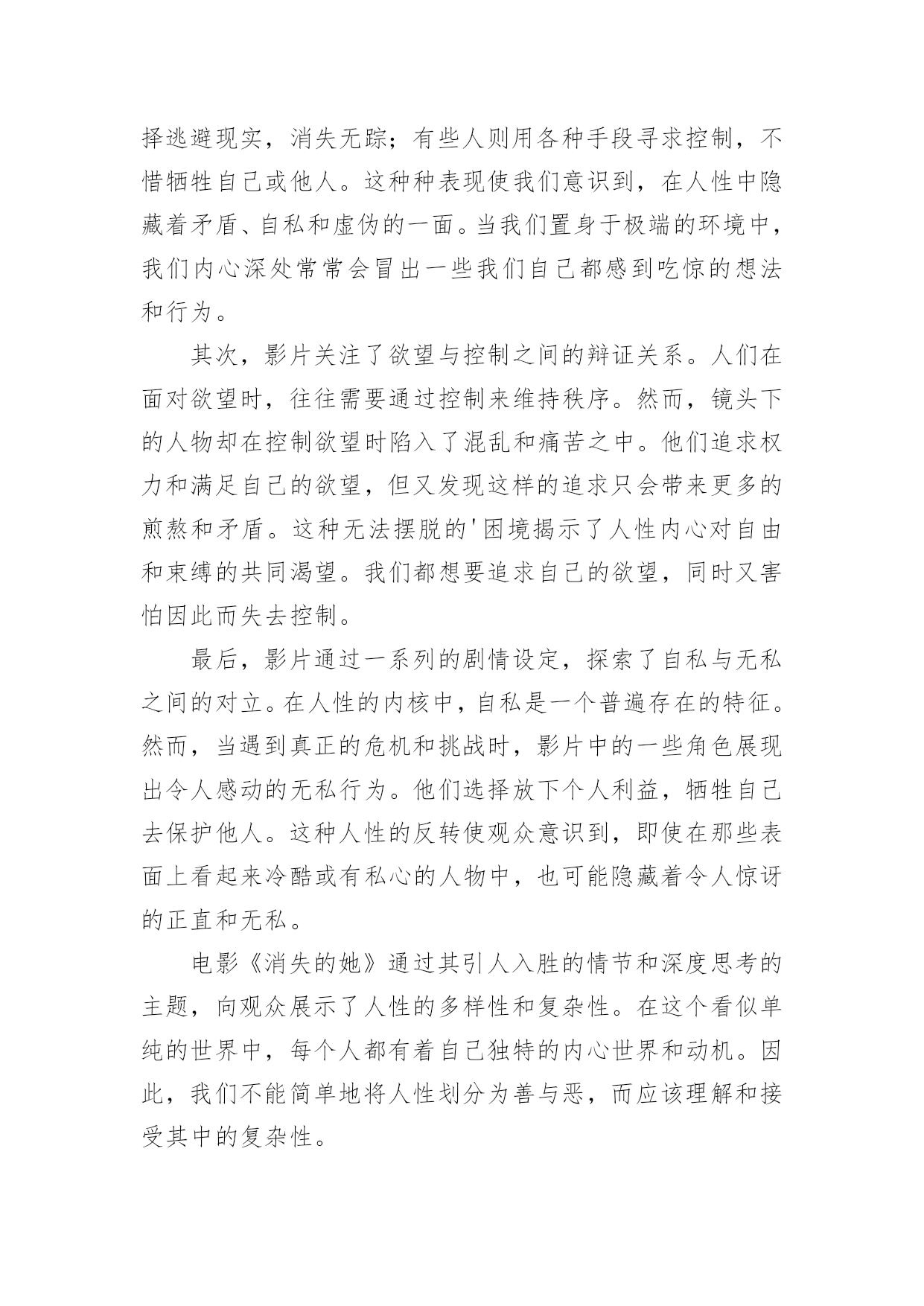 《消失的她》观后感《消失的她》观后感品味完一部作品后,相信大家有很多值得分享的东西吧,观后感简单来说就是观赏过后的感触。但是观后感有什么要求呢?以下是小编整理的《消失的她》观后感,仅供参考,希望能够帮助到大家。《消失的她》观后感1最近的热播电影《消失的她》频繁霸屏,引发网友很多的讨论,尤其是根据真实故事改编这个原因,不免吸引我去看了这部电影。不出所料,有些沉重,当最后看到木子自己拿掉氧气管的绝望,真的扎心,心里像是被人使劲揪着一样,喘不过气。人性的丑陋和贪婪就这样被一层一层的剥开展现在我们的面前,让你痛苦可又不得不感受。剧中男主何飞对木子的想法一直都是:你必须帮我,你不帮我,不帮我还钱,溺死在水里是你应有的结局,我不爱你,爱的只是你的钱。木子给他画的那幅他的画像,他都没有点查看原图,因为他的目的已经达到了,至于木子怎么表现出来,无所谓;即使是他自己设计的车祸,当车祸真正发生的情况下,他也是左转方向盘把副驾驶送到了受撞面,所以李木子车祸伤还比何非重;赌博输钱后,木子帮他还钱让他洗心革面,他连发誓也是用的模特假手;老早就安排一纪念日了,要是真心安排海底星辰,又怎么会以工作为理由而让女主先去呢;他最后看到b超单的那个嘶吼,是因为他得知木子怀孕,想着可以用孩子来威胁她,有了筹码而不是因为后悔。他自始至终都是为了他自己,生活中很多细节可以观察到。他已经无药可救了,面对如此美好的李木子,都没能唤醒他的一丝丝人性。人性的恶,有时候你永远都想不到,这句话听起来让人毛骨悚然,但是事实就是如此。剧中的男主何飞就是这样一个令人毛骨悚然的人,一个自私冷漠的人,这源于他的原生家庭,源于他性格的偏执。所以女孩子在交往中,首先一定要看看他的原生家庭,看看他的爸爸是怎么样对待他的妈妈的,几十年的言传身教很难改变。所以不要妄想去改变一个人,几十年都没改变的东西,你想让他因为你改变,太可笑了。如果你们接触的过程中你的第六感让你感觉到这个人你不舒服,请不要给自己洗脑,及时止损。其次,避免掉入情绪价值的陷阱里,渣男特别会提供情绪价值,你非常重视情绪价值,你就很容易成为情绪的奴隶。真正优秀的人在喜欢你的时候,只会更好的提升自己,让自己能够变得更优秀来匹配你,而不是把全部时间花在你的身上,用点不费任何成本的早安,午安,晚安,奶茶哄哄你骗骗你。男主何飞就是非常会提供情绪价值,给木子发了一个月的信息,聊梵高,聊艺术,制造车祸后,让木子感觉到这是一个特别可靠的男人。因为他在研究你,他会给你提供情绪价值,所以你以为的.爱情,说不定只是人家精心布置的陷阱。男人很理性的,很清楚对方能给他带来多少价值,从而权衡利弊去做选择,再次,很重要的一点,远离黄赌毒的男人,黄赌毒跟家暴一样,永远只有零次和无数次,一旦沾染,那就是深渊,你不知道什么时候他内心的那个邪恶的小火苗会再次被点燃。所以如果不幸遇到黄赌毒的人,就一个字,跑。海底星空是真的很美,却也是牢笼。堵他能够变好,还不如好好提升自己。希望所有的女孩子爱人先爱己,不要听对方说什么,而是要看对方做什么,不要自欺欺人。强大自己的内心,增加知识储备,扩大自己的而格局,成为更好更强的自己,这样才会更大可能遇到与你匹配的另一半。《消失的她》观后感2《消失的她》是一部充满悬疑与心理压迫感的电影,通过故事中人物的行为和反思,引发了对人性的深刻思考。影片展现了人性的多面性:恶与善、欲望与控制、自私与无私。这些主题深深地触动了观众的内心,让我们不禁思考起每个人内心深处存在的复杂情感和动机。首先,影片中的人物行为揭示了人类的弱点和复杂性。主角们在面对压力和困境时,展现出不同的反应。有些人选择逃避现实,消失无踪;有些人则用各种手段寻求控制,不惜牺牲自己或他人。这种种表现使我们意识到,在人性中隐藏着矛盾、自私和虚伪的一面。当我们置身于极端的环境中,我们内心深处常常会冒出一些我们自己都感到吃惊的想法和行为。其次,影片关注了欲望与控制之间的辩证关系。人们在面对欲望时,往往需要通过控制来维持秩序。然而,镜头下的人物却在控制欲望时陷入了混乱和痛苦之中。他们追求权力和满足自己的欲望,但又发现这样的追求只会带来更多的煎熬和矛盾。这种无法摆脱的'困境揭示了人性内心对自由和束缚的共同渴望。我们都想要追求自己的欲望,同时又害怕因此而失去控制。最后,影片通过一系列的剧情设定,探索了自私与无私之间的对立。在人性的内核中,自私是一个普遍存在的特征。然而,当遇到真正的危机和挑战时,影片中的一些角色展现出令人感动的无私行为。他们选择放下个人利益,牺牲自己去保护他人。这种人性的反转使观众意识到,即使在那些表面上看起来冷酷或有私心的人物中,也可能隐藏着令人惊讶的正直和无私。电影《消失的她》通过其引人入胜的情节和深度思考的主题,向观众展示了人性的多样性和复杂性。在这个看似单纯的世界中,每个人