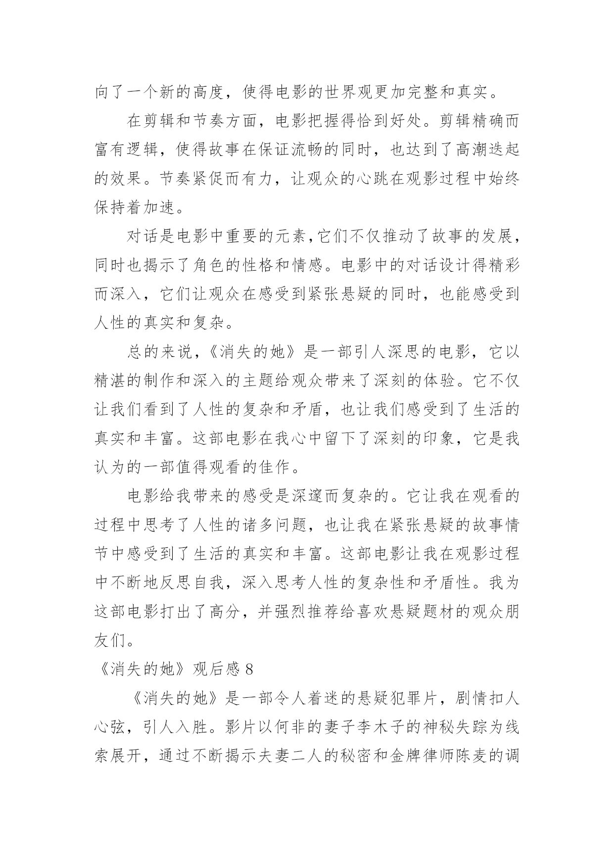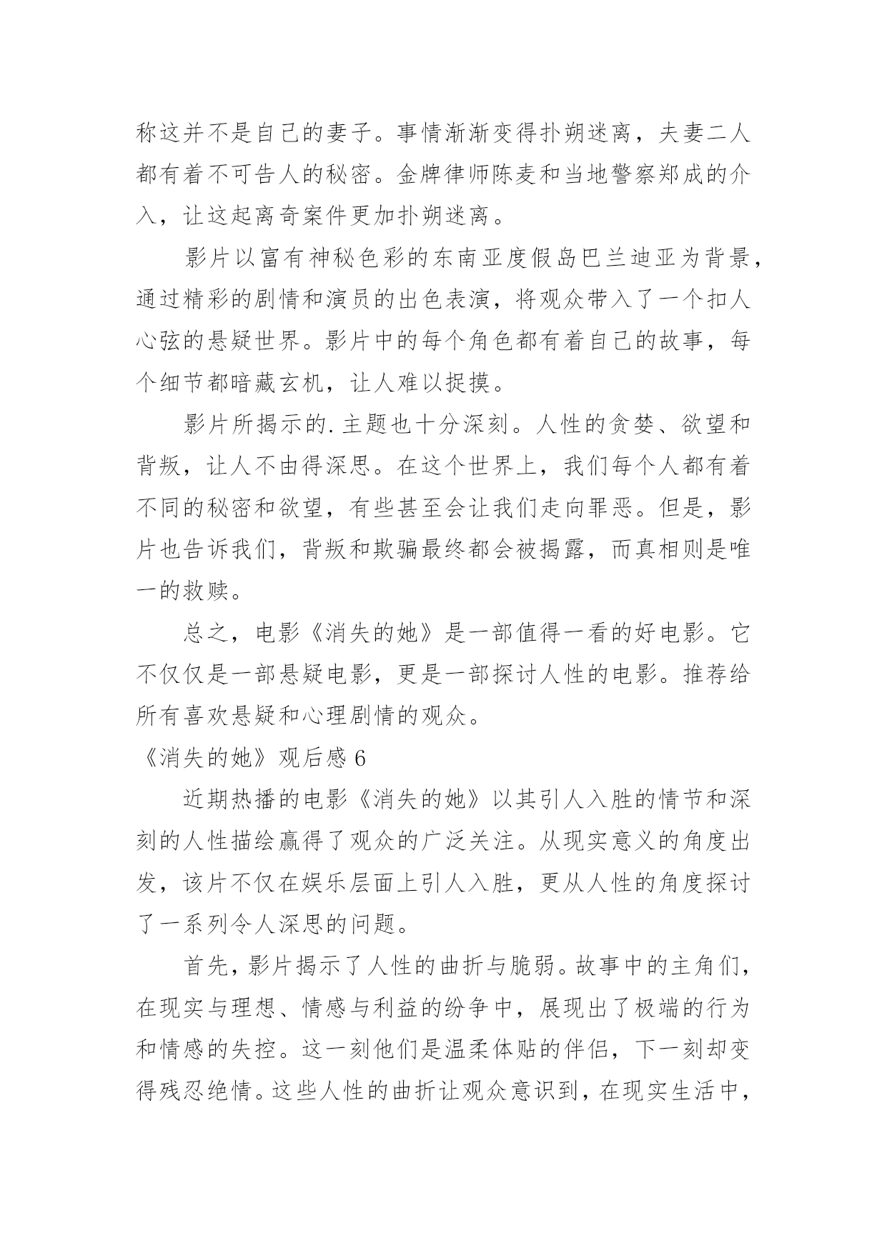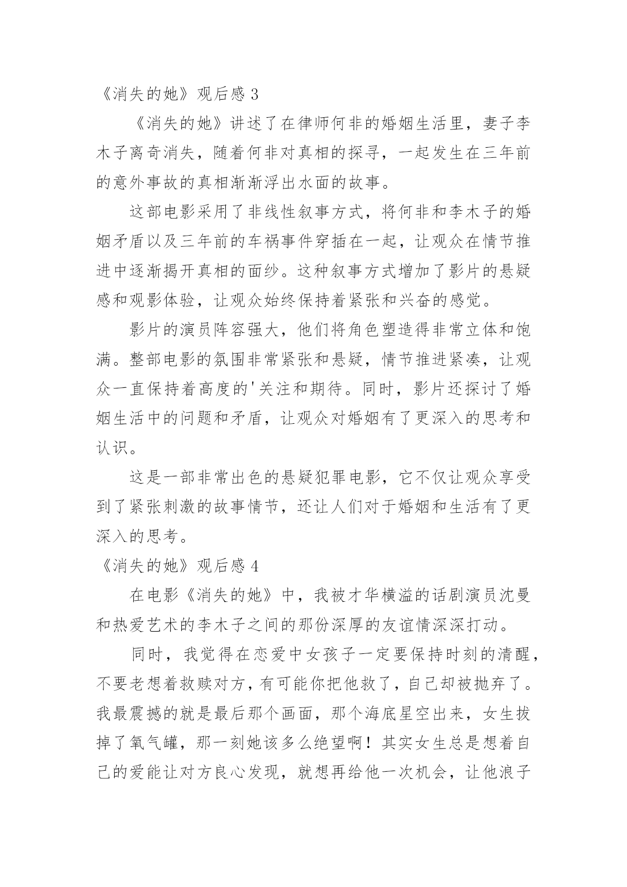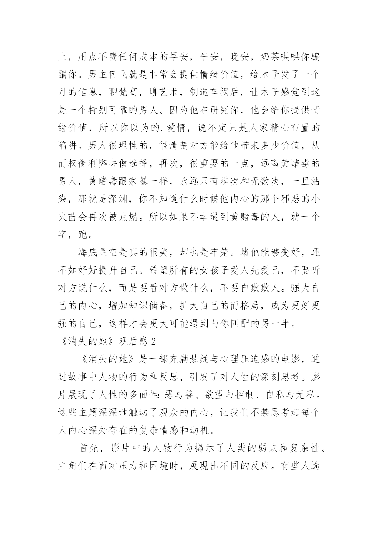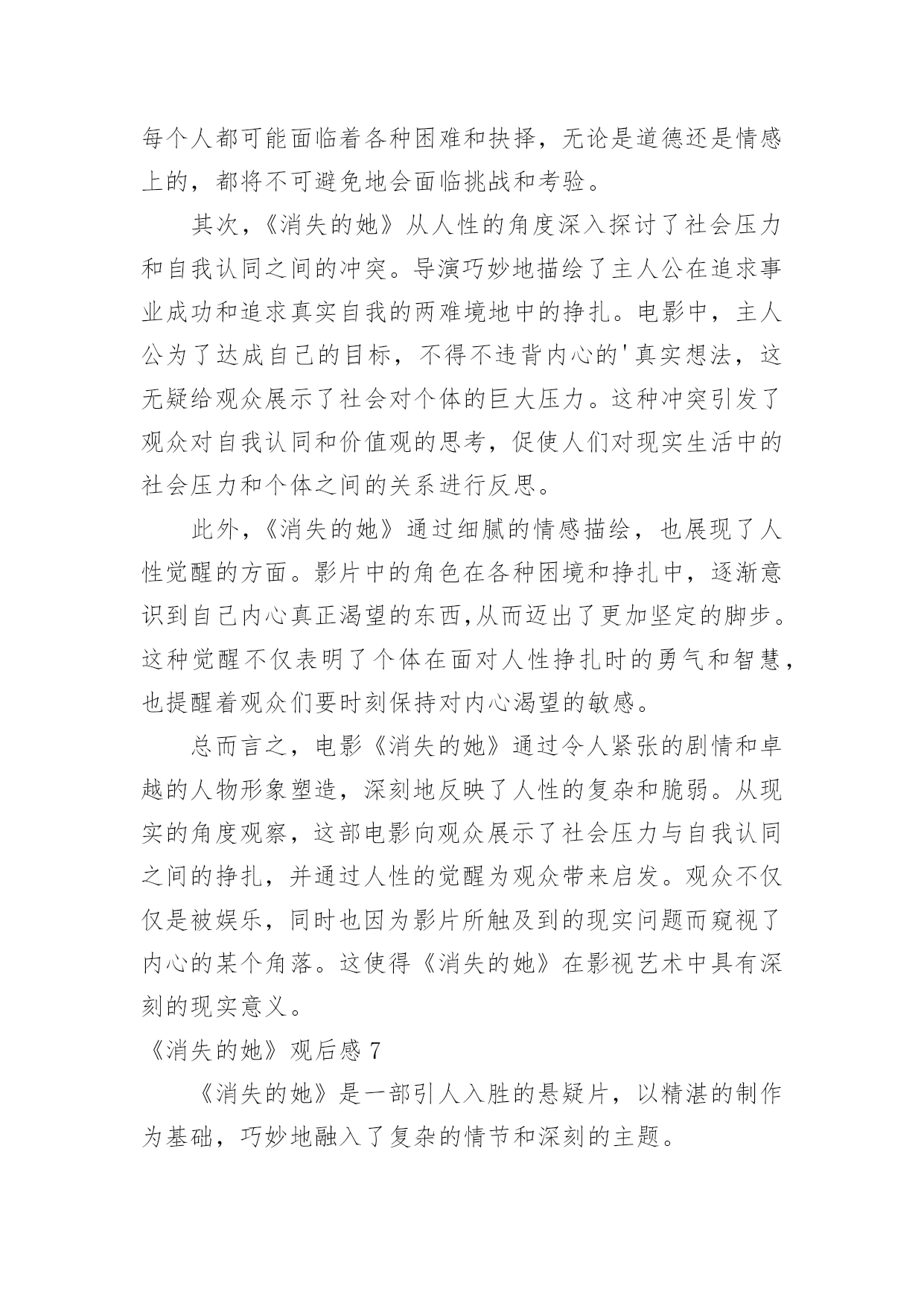 《消失的她》观后感《消失的她》观后感品味完一部作品后,相信大家有很多值得分享的东西吧,观后感简单来说就是观赏过后的感触。但是观后感有什么要求呢?以下是小编整理的《消失的她》观后感,仅供参考,希望能够帮助到大家。《消失的她》观后感1最近的热播电影《消失的她》频繁霸屏,引发网友很多的讨论,尤其是根据真实故事改编这个原因,不免吸引我去看了这部电影。不出所料,有些沉重,当最后看到木子自己拿掉氧气管的绝望,真的扎心,心里像是被人使劲揪着一样,喘不过气。人性的丑陋和贪婪就这样被一层一层的剥开展现在我们的面前,让你痛苦可又不得不感受。剧中男主何飞对木子的想法一直都是:你必须帮我,你不帮我,不帮我还钱,溺死在水里是你应有的结局,我不爱你,爱的只是你的钱。木子给他画的那幅他的画像,他都没有点查看原图,因为他的目的已经达到了,至于木子怎么表现出来,无所谓;即使是他自己设计的车祸,当车祸真正发生的情况下,他也是左转方向盘把副驾驶送到了受撞面,所以李木子车祸伤还比何非重;赌博输钱后,木子帮他还钱让他洗心革面,他连发誓也是用的模特假手;老早就安排一纪念日了,要是真心安排海底星辰,又怎么会以工作为理由而让女主先去呢;他最后看到b超单的那个嘶吼,是因为他得知木子怀孕,想着可以用孩子来威胁她,有了筹码而不是因为后悔。他自始至终都是为了他自己,生活中很多细节可以观察到。他已经无药可救了,面对如此美好的李木子,都没能唤醒他的一丝丝人性。人性的恶,有时候你永远都想不到,这句话听起来让人毛骨悚然,但是事实就是如此。剧中的男主何飞就是这样一个令人毛骨悚然的人,一个自私冷漠的人,这源于他的原生家庭,源于他性格的偏执。所以女孩子在交往中,首先一定要看看他的原生家庭,看看他的爸爸是怎么样对待他的妈妈的,几十年的言传身教很难改变。所以不要妄想去改变一个人,几十年都没改变的东西,你想让他因为你改变,太可笑了。如果你们接触的过程中你的第六感让你感觉到这个人你不舒服,请不要给自己洗脑,及时止损。其次,避免掉入情绪价值的陷阱里,渣男特别会提供情绪价值,你非常重视情绪价值,你就很容易成为情绪的奴隶。真正优秀的人在喜欢你的时候,只会更好的提升自己,让自己能够变得更优秀来匹配你,而不是把全部时间花在你的身上,用点不费任何成本的早安,午安,晚安,奶茶哄哄你骗骗你。男主何飞就是非常会提供情绪价值,给木子发了一个月的信息,聊梵高,聊艺术,制造车祸后,让木子感觉到这是一个特别可靠的男人。因为他在研究你,他会给你提供情绪价值,所以你以为的.爱情,说不定只是人家精心布置的陷阱。男人很理性的,很清楚对方能给他带来多少价值,从而权衡利弊去做选择,再次,很重要的一点,远离黄赌毒的男人,黄赌毒跟家暴一样,永远只有零次和无数次,一旦沾染,那就是深渊,你不知道什么时候他内心的那个邪恶的小火苗会再次被点燃。所以如果不幸遇到黄赌毒的人,就一个字,跑。海底星空是真的很美,却也是牢笼。堵他能够变好,还不如好好提升自己。希望所有的女孩子爱人先爱己,不要听对方说什么,而是要看对方做什么,不要自欺欺人。强大自己的内心,增加知识储备,扩大自己的而格局,成为更好更强的自己,这样才会更大可能遇到与你匹配的另一半。《消失的她》观后感2《消失的她》是一部充满悬疑与心理压迫感的电影,通过故事中人物的行为和反思,引发了对人性的深刻思考。影片展现了人性的多面性:恶与善、欲望与控制、自私与无私。这些主题深深地触动了观众的内心,让我们不禁思考起每个人内心深处存在的复杂情感和动机。首先,影片中的人物行为揭示了人类的弱点和复杂性。主角们在面对压力和困境时,展现出不同的反应。有些人选择逃避现实,消失无踪;有些人则用各种手段寻求控制,不惜牺牲自己或他人。这种种表现使我们意识到,在人性中隐藏着矛盾、自私和虚伪的一面。当我们置身于极端的环境中,我们内心深处常常会冒出一些我们自己都感到吃惊的想法和行为。其次,影片关注了欲望与控制之间的辩证关系。人们在面对欲望时,往往需要通过控制来维持秩序。然而,镜头下的人物却在控制欲望时陷入了混乱和痛苦之中。他们追求权力和满足自己的欲望,但又发现这样的追求只会带来更多的煎熬和矛盾。这种无法摆脱的'困境揭示了人性内心对自由和束缚的共同渴望。我们都想要追求自己的欲望,同时又害怕因此而失去控制。最后,影片通过一系列的剧情设定,探索了自私与无私之间的对立。在人性的内核中,自私是一个普遍存在的特征。然而,当遇到真正的危机和挑战时,影片中的一些角色展现出令人感动的无私行为。他们选择放下个人利益,牺牲自己去保护他人。这种人性的反转使观众意识到,即使在那些表面上看起来冷酷或有私心的人物中,也可能隐藏着令人惊讶的正直和无私。电影《消失的她》通过其引人入胜的情节和深度思考的主题,向观众展示了人性的多样性和复杂性。在这个看似单纯的世界中,每个人