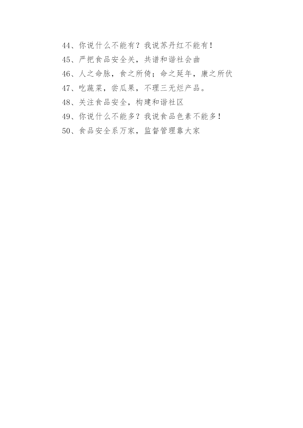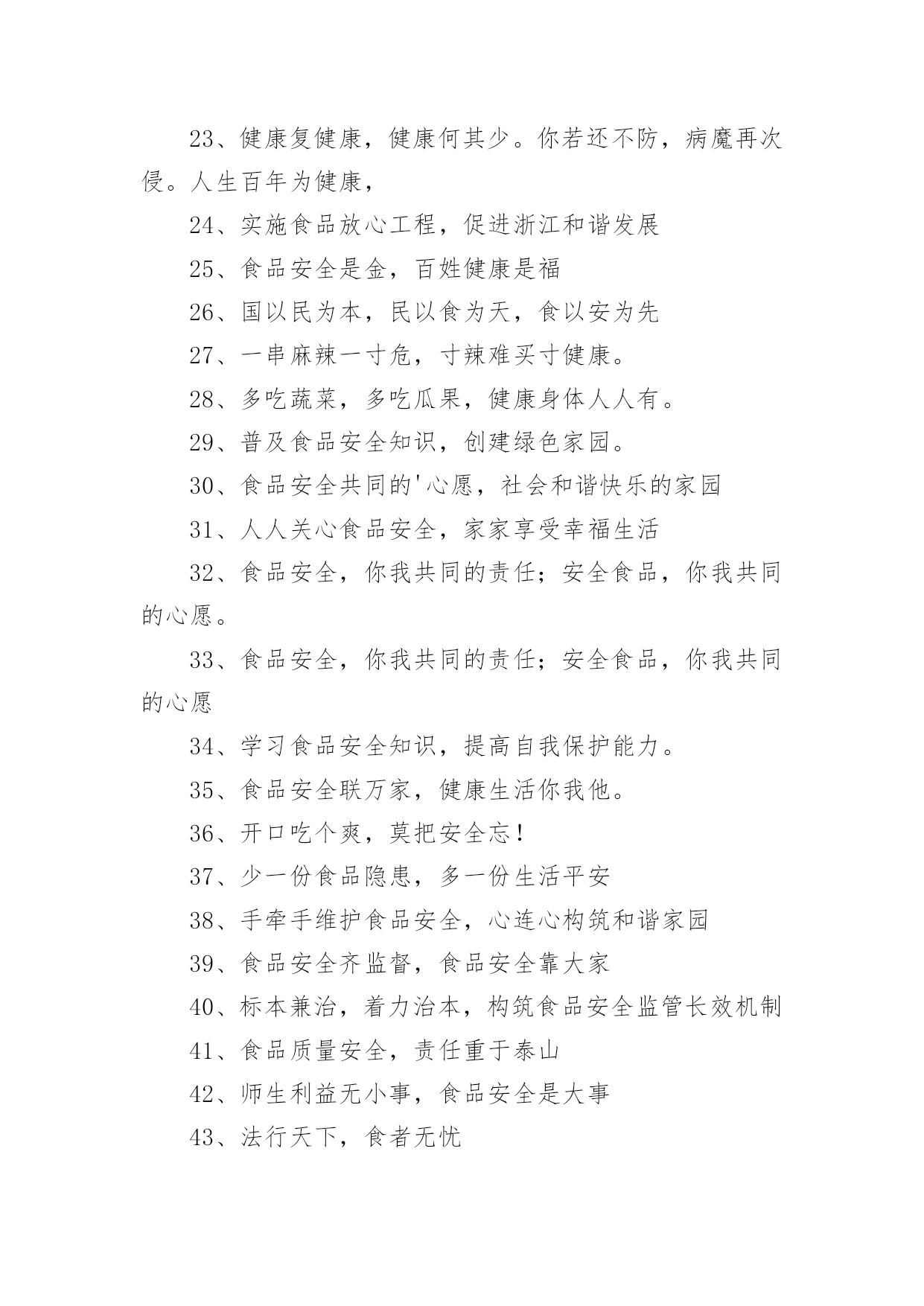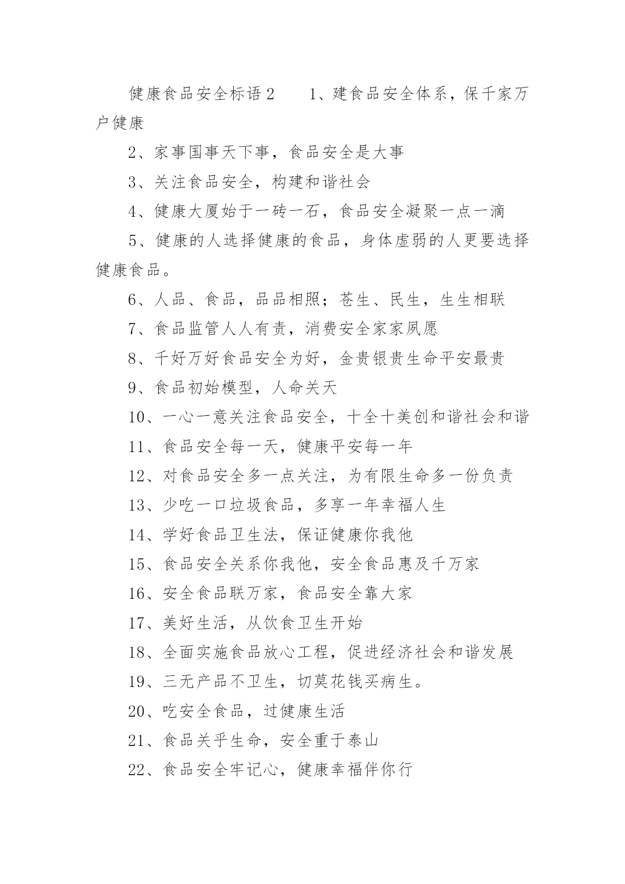 健康食品安全标语健康食品安全标语(精选65句)在平平淡淡的日常中,大家一定没少看到过标语吧,通过标语,可以增强人们的社会责任心。那什么样的标语才是经典的呢?以下是小编为大家收集的健康食品安全标语(精选65句),欢迎阅读与收藏。健康食品安全标语11、选购放心食品,吃出健康体魄。2、食品安全天天讲,健康生活岁岁享。3、营造食品安全大环境,呵护幸福健康小家庭。4、严厉打击生产加工假冒伪劣食品行为。5、构建食品安全网,谱写和谐社会曲。6、齐心协力抓食品安全,真心实意保群众健康。7、普及食品科学知识,提高安全防范能力。8、群策群力共创食品安全,互助互爱同筑和谐家园。9、严禁滥用食品添加剂,严禁伪造食品标签标识。10、培养食品安全公德心,争做和谐社会文明人。11、食品安全是天大的事。12、构筑食品安全“防火墙”,撑起群众健康“保护伞”。13、食品安全齐监督,健康生活同构筑。14、食品安全有保障,绿色消费享健康。15、一心一意关注食品安全,十全十美创建和谐社会。健康食品安全标语21、建食品安全体系,保千家万户健康2、家事国事天下事,食品安全是大事3、关注食品安全,构建和谐社会4、健康大厦始于一砖一石,食品安全凝聚一点一滴5、健康的人选择健康的食品,身体虚弱的人更要选择健康食品。6、人品、食品,品品相照;苍生、民生,生生相联7、食品监管人人有责,消费安全家家夙愿8、千好万好食品安全为好,金贵银贵生命平安最贵9、食品初始模型,人命关天10、一心一意关注食品安全,十全十美创和谐社会和谐11、食品安全每一天,健康平安每一年12、对食品安全多一点关注,为有限生命多一份负责13、少吃一口垃圾食品,多享一年幸福人生14、学好食品卫生法,保证健康你我他15、食品安全关系你我他,安全食品惠及千万家16、安全食品联万家,食品安全靠大家17、美好生活,从饮食卫生开始18、全面实施食品放心工程,促进经济社会和谐发展19、三无产品不卫生,切莫花钱买病生。20、吃安全食品,过健康生活21、食品关乎生命,安全重于泰山22、食品安全牢记心,健康幸福伴你行23、健康复健康,健康何其少。你若还不防,病魔再次侵。人生百年为健康,24、实施食品放心工程,促进浙江和谐发展25、食品安全是金,百姓健康是福26、国以民为本,民以食为天,食以安为先27、一串麻辣一寸危,寸辣难买寸健康。28、多吃蔬菜,多吃瓜果,健康身体人人有。29、普及食品安全知识,创建绿色家园。30、食品安全共同的'心愿,社会和谐快乐的家园31、人人关心食品安全,家家享受幸福生活32、食品安全,你我共同的责任;安全食品,你我共同的心愿。33、食品安全,你我共同的责任;安全食品,你我共同的心愿34、学习食品安全知识,提高自我保护能力。35、食品安全联万家,健康生活你我他。36、开口吃个爽,莫把安全忘!37、少一份食品隐患,多一份生活平安38、手牵手维护食品安全,心连心构筑和谐家园39、食品安全齐监督,食品安全靠大家40、标本兼治,着力治本,构筑食品安全监管长效机制41、食品质量安全,责任重于泰山42、师生利益无小事,食品安全是大事43、法行天下,食者无忧44、你说什么不能有?我说苏丹红不能有!45、严把食品安全关,共谱和谐社会曲46、人之命脉,食之所倚;命之延年,康之所伏47、吃蔬菜,尝瓜果,不理三无烂产品。48、关注食品安全,构建和谐社区49、你说什么不能多?我说食品色素不能多!50、食品安全系万家,监督管理靠大家