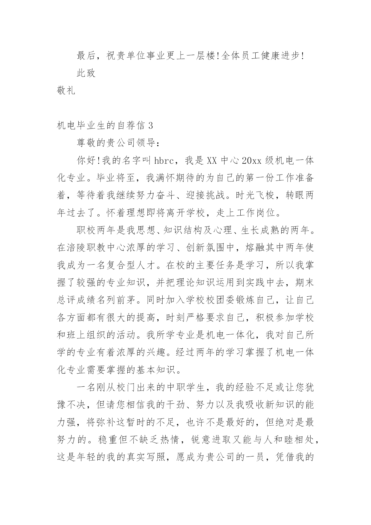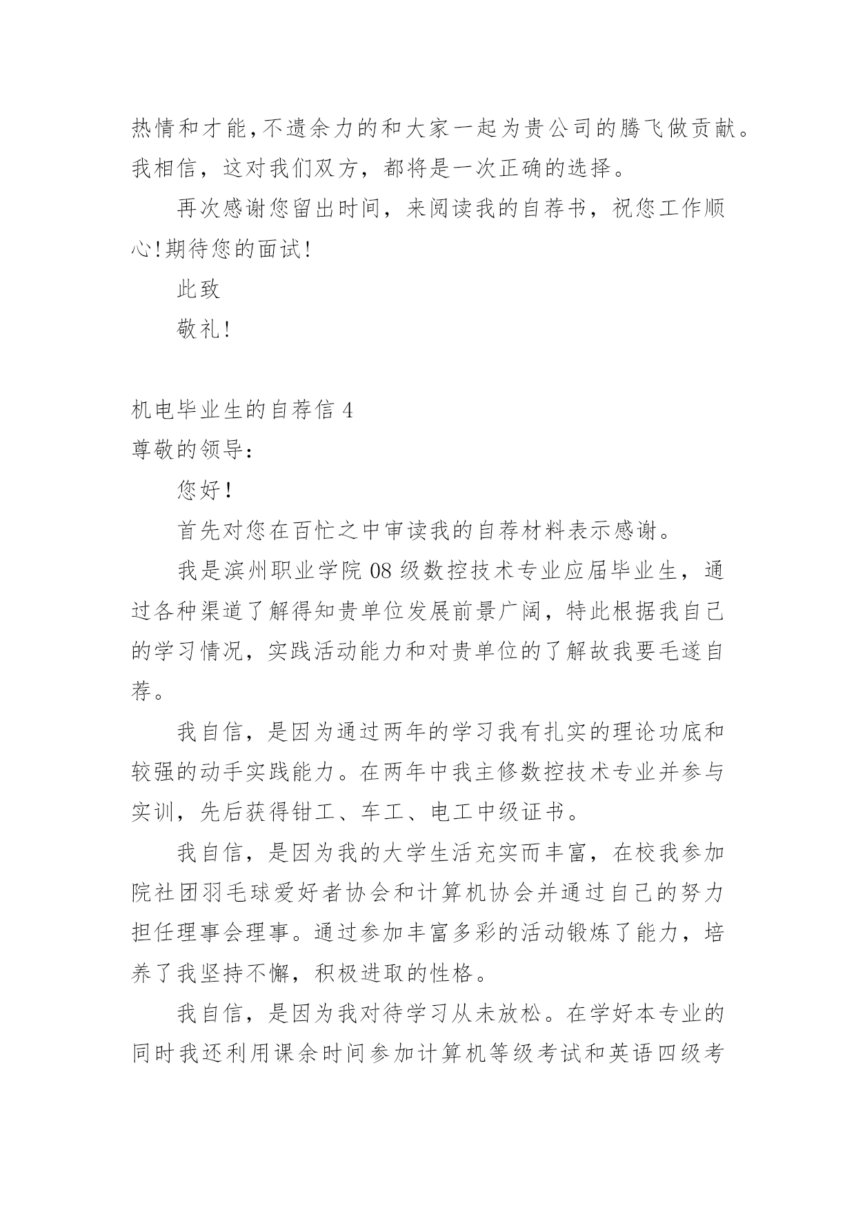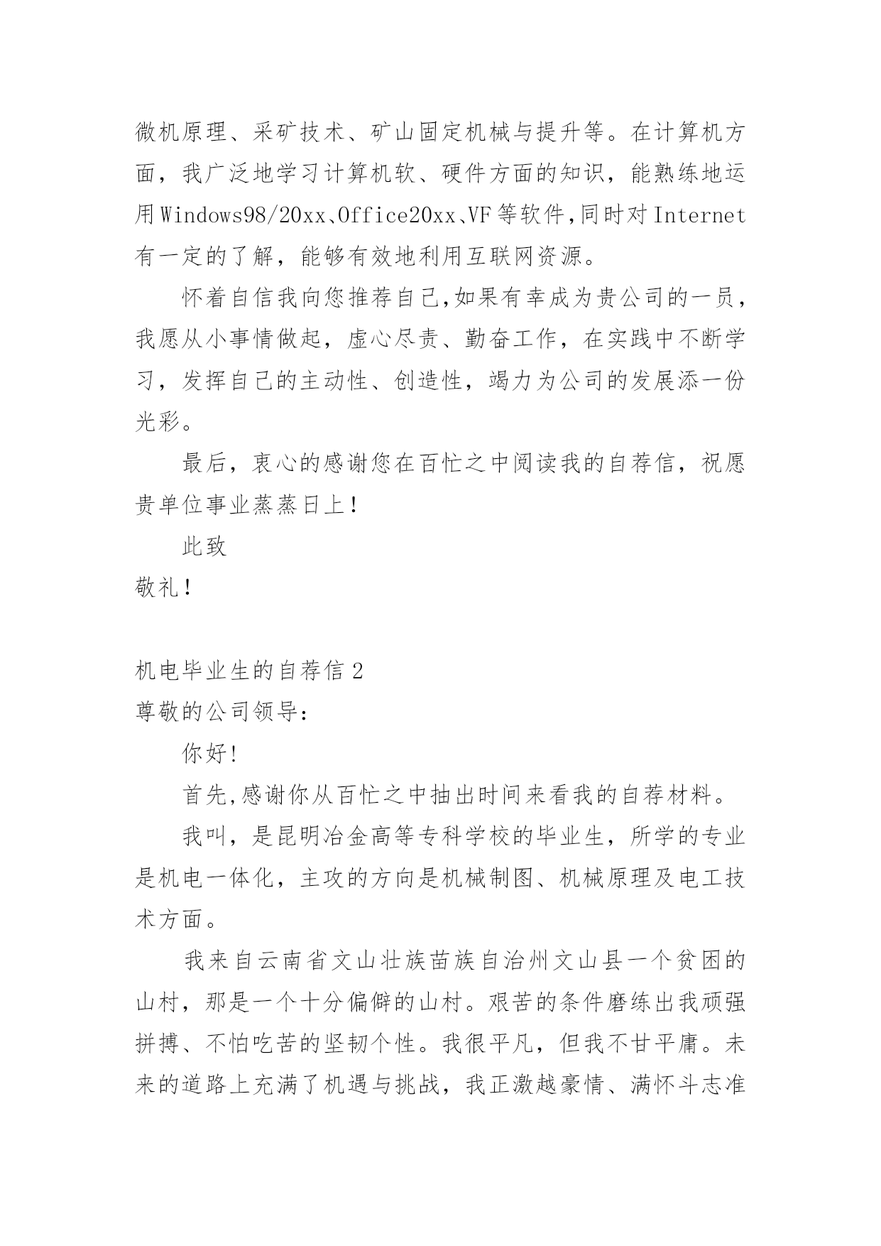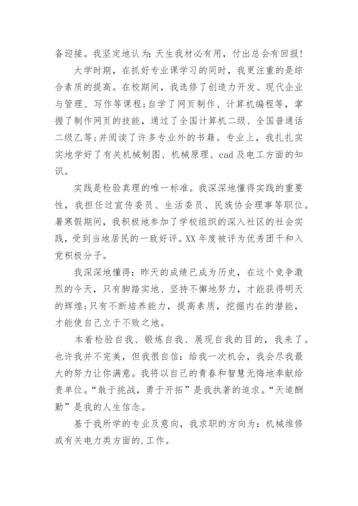机电毕业生的自荐信机电毕业生的自荐信在日常的学习、工作、生活中,大家都经常接触到书信吧,书信有助于增进人与人之间的交流。你知道书信怎样写才规范吗?下面是小编收集整理的机电毕业生的自荐信,欢迎阅读与收藏。机电毕业生的自荐信1尊敬的领导:您好!我是黑龙江科技学院机电专业08届的一名毕业生。非常感谢您在百忙之中抽出时间,阅读我这份自荐材料,给我一次迈向成功的机会。大学四年转眼即过,我满怀希望地走进社会这个更加博大的课堂。当今世界充满着竞争、充满着挑战,也充满了机遇。我希望能从贵公司得到一个机会、一个舞台,用我所学去服务公司,服务社会。大学期间,本着严谨求学的态度,在学习中我注重实际能力的培养,把专业知识与实践相结合,积极主动地参加各种社会活动,将我所学用于实践,不断增強自己的工作能力,为今后开展各项工作打下坚实的基础。在校期间主要学习电工原理、电子技术、电机学、自动控制原理、CAD制图、矿山供电、PLC与电气控制、单片机、微机原理、采矿技术、矿山固定机械与提升等。在计算机方面,我广泛地学习计算机软、硬件方面的知识,能熟练地运用Windows98/20xx、Office20xx、VF等软件,同时对Internet有一定的了解,能够有效地利用互联网资源。怀着自信我向您推荐自己,如果有幸成为贵公司的一员,我愿从小事情做起,虚心尽责、勤奋工作,在实践中不断学习,发挥自己的主动性、创造性,竭力为公司的发展添一份光彩。最后,衷心的感谢您在百忙之中阅读我的自荐信,祝愿贵单位事业蒸蒸日上!此致敬礼!机电毕业生的自荐信2尊敬的公司领导:你好!首先,感谢你从百忙之中抽出时间来看我的自荐材料。我叫,是昆明冶金高等专科学校的毕业生,所学的专业是机电一体化,主攻的方向是机械制图、机械原理及电工技术方面。我来自云南省文山壮族苗族自治州文山县一个贫困的山村,那是一个十分偏僻的山村。艰苦的条件磨练出我顽强拼搏、不怕吃苦的坚韧个性。我很平凡,但我不甘平庸。未来的道路上充满了机遇与挑战,我正激越豪情、满怀斗志准备迎接。我坚定地认为:天生我材必有用,付出总会有回报!大学时期,在抓好专业课学习的同时,我更注重的是综合素质的提高。在校期间,我选修了创造力开发、现代企业与管理、写作等课程;自学了网页制作、计算机编程等,掌握了制作网页的技能,通过了全国计算机二级、全国普通话二级乙等;并阅读了许多专业外的书籍。专业上,我扎扎实实地学好了有关机械制图、机械原理、cad及电工方面的知识。实践是检验真理的唯一标准。我深深地懂得实践的重要性,我担任过宣传委员、生活委员、民族协会理事等职位。暑寒假期间,我积极地参加了学校组织的深入社区的社会实践,受到当地居民的一致好评。XX年度被评为优秀团干和入党积极分子。我深深地懂得:昨天的成绩已成为历史,在这个竞争激烈的今天,只有脚踏实地、坚持不懈地努力,才能获得明天的辉煌;只有不断培养能力,提高素质,挖掘内在的潜能,才能使自己立于不败之地。本着检验自我、锻炼自我、展现自我的目的,我来了。也许我并不完美,但我很自信:给我一次机会,我会尽我最大的努力让你满意。我将以自己的青春和智慧无悔地奉献给贵单位。“敢于挑战,勇于开拓”是我执著的追求。“天道酬勤”是我的人生信念。基于我所学的专业及意向,我求职的方向为:机械维修或有关电力类方面的.工作。最后,祝贵单位事业更上一层楼!全体员工健康进步!此致敬礼机电毕业生的自荐信3尊敬的贵公司领导:你好!我的名字叫hbrc,我是XX中心20xx级机电一体化专业。毕业将至,我满怀期待的为自己的第一份工作准备着,等待着我继续努力奋斗、迎接挑战。时光飞梭,转眼两年过去了。怀着理想即将离开学校,走上工作岗位。职校两年是我思想、知识结构及心理、生长成熟的两年。在涪陵职教中心浓厚的学习、创新氛围中,熔融其中两年使我成为一名复合型人才。在校的主要任务是学习,所以我掌握了较强的专业知识,并把理论知识运用到实践中去,期末总评成绩名列前茅。同时加入学校校团委锻炼自己,让自己各方面都有很大的提高,时刻严格要求自己,积极参加学校和班上组织的活动。我所学专业是机电一体化,我对自己所学的专业有着浓厚的兴趣。经过两年的学习掌握了机电一体化专业需要掌握的基本知识。一名刚从校门出来的中职学生,我的经验不足或让您犹豫不决,但请您相信我的干劲、努力以及我吸收新知识的能力强,将弥补这暂时的不足,也许不是最好的,但绝对是最努力的。稳重但不缺乏热情,锐意进取又能与人和睦相处,这是年轻的我的真实写照,愿成为贵公司的一员,凭借我的热情和才能,不遗余力的和大家一起为贵公司的腾飞做贡献。我相信,这对我们双方,都将是一次正确的选择。再次感谢您留出时间,来阅读我的自荐书,祝您工作顺心!期待您的面试!此致敬礼!机电毕业生的自荐信4尊敬的领导:您好!首先对您在百忙之中审读我的自
