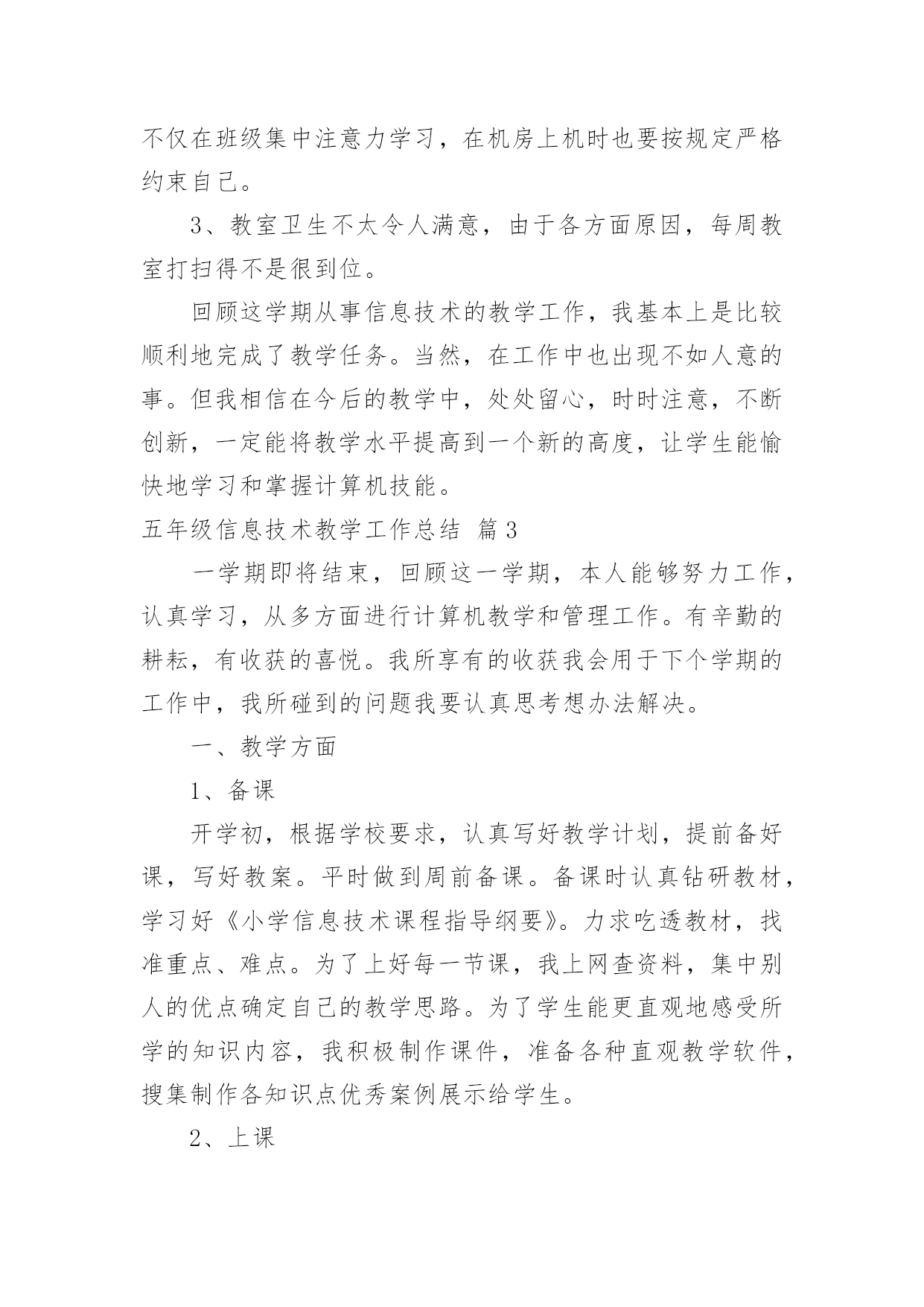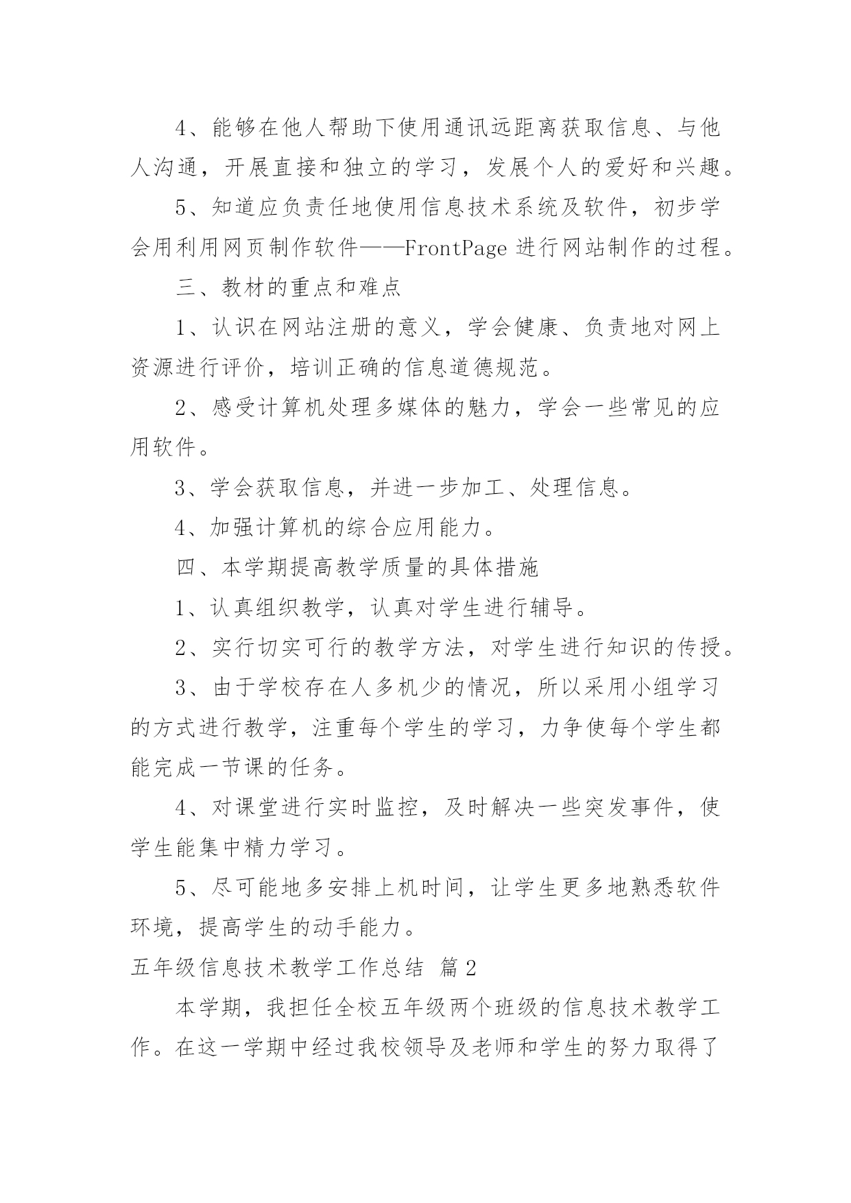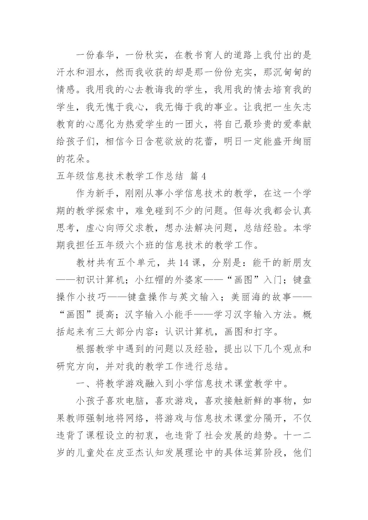 五年级信息技术教学工作总结五年级信息技术教学工作总结四篇总结是把一定阶段内的有关情况分析研究,做出有指导性结论的书面材料,它可使零星的、肤浅的、表面的感性认知上升到全面的、系统的、本质的理性认识上来,为此我们要做好回顾,写好总结。如何把总结做到重点突出呢?以下是小编帮大家整理的五年级信息技术教学工作总结4篇,仅供参考,希望能够帮助到大家。五年级信息技术教学工作总结篇1一、情况分析由于信息技术课时比较少,每周只有两节课,学生的遗忘性大,大多数学生学后没有注意巩固,学生掌握的情况不是很理想,参差不齐。我校大多数学生家里都有电脑,根据这一情况我把许多课堂上完不成的操作让学生回家练习,并且操作熟练,有一小部分学生纯粹是上课时间练习,课后就没有巩固的机会,所以,这一部分学生对所学知识遗忘较大,操作易生疏。二、本学期教学的主要任务和目的要求1、了解信息技术的应用环境和信息的一些表现形式。2、建立对计算机的感性认识,了解信息技术在日常生活中的应用,培养学生学习、使用计算机的兴趣和意识。3、在使用信息技术时学会与他人合作,学会使用与年龄发展相符的多媒体资源进行学习。4、能够在他人帮助下使用通讯远距离获取信息、与他人沟通,开展直接和独立的学习,发展个人的爱好和兴趣。5、知道应负责任地使用信息技术系统及软件,初步学会用利用网页制作软件——FrontPage进行网站制作的过程。三、教材的重点和难点1、认识在网站注册的意义,学会健康、负责地对网上资源进行评价,培训正确的信息道德规范。2、感受计算机处理多媒体的魅力,学会一些常见的应用软件。3、学会获取信息,并进一步加工、处理信息。4、加强计算机的综合应用能力。四、本学期提高教学质量的具体措施1、认真组织教学,认真对学生进行辅导。2、实行切实可行的教学方法,对学生进行知识的传授。3、由于学校存在人多机少的情况,所以采用小组学习的方式进行教学,注重每个学生的学习,力争使每个学生都能完成一节课的任务。4、对课堂进行实时监控,及时解决一些突发事件,使学生能集中精力学习。5、尽可能地多安排上机时间,让学生更多地熟悉软件环境,提高学生的动手能力。五年级信息技术教学工作总结篇2本学期,我担任全校五年级两个班级的信息技术教学工作。在这一学期中经过我校领导及老师和学生的努力取得了可喜的成绩。当然在工作中我享受到收获喜悦,也在工作中发现一些存在的问题。我所享有的收获我会用于新学期的工作中,我所碰到的问题我要认真思考想办法解决。本学期我主要做了这一些工作:一、教学方面1、做到期初有计划,有教学进度,使教学工作能有条不紊地顺利进行下去;由于教学计划安排的比较好,所以并没有给工作带来影响,反而在一定程度上有利于教学工作的进行,使得大量电脑理论知识得于传授给学生。2、按照学校工作管理规定,认真备好课,写好教案,努力上好每一节课。电脑课校安排的课时比较少(一周每班1节)这对于学生来讲的很重要的1节课;对老师来讲是比较难上的1节课。所以才能上好每1节课对老师对学生都是很关键的。除了备好课、写好教案外,我还要查阅各种资料,能上因特网时还上网寻找好的教学材料,教学课件,把它们和我所从事的工作结合起来,为我所用。3、学生方面:(1)采用学生竞赛的方法。相互学习,相互促进,看谁的表现操作、完成任务等最好。充分利用课堂时间,学习新知识,掌握新技能。(2)采用边学边用的方法。学一点就让学生应用起来,不仅要满足学生的好奇心,还要在应用过程中,充分肯定学生自身的能力,增强学生的自信心,保持和促进学生的积极性,进一步激发学生学习的`积极性和兴趣,形成良性循环。4、个人提高方面:深入钻研信息技术教学教材,在备课上下功夫,查阅大量的书籍。除了听课,评课,参加教研组教研活动外,我还注意到要自学。5、及时做总结、写反思。认真进行课后写教学博客。信息技术教学注重内容衔接,抓住重点。因此在课后要及时总结课堂上的不足,以便能及时更正。只有不断反思,才有不断进步。二、电脑室管理方面1、本学期,严格按照学校的规定,电脑室完成了教学和使用任务。2、及时进行设备的维护。好的设备必须进行及时的维护,出现问题后马上进行检修。不让机器耽误学生使用和教学。3、认真打扫一个教室的卫生。每周进行拖地扫地。保持良好的卫生环境,让学生和老师有一个良好的学习和备课环境。4、坚持按照学校的要求进行工作。每天下班进行设备的检查和用电方面的检查。是否关闭了电源和门窗。5、计算机室的使用严格按照规章制度来完成。教师上完课及时进行卫生的打扫。定期进行设备的维护。三、存在的不足1、对差生多些关心,多点爱心,再多一些耐心,使他们在对计算机的认识上有更大进步。2、加强机房纪律和机器使用道德方面的教育,使学生不仅在班级集中注意力学习,在机房上机时也要按规定严格约束自己。3、教室卫生不太令人满意,由于各方