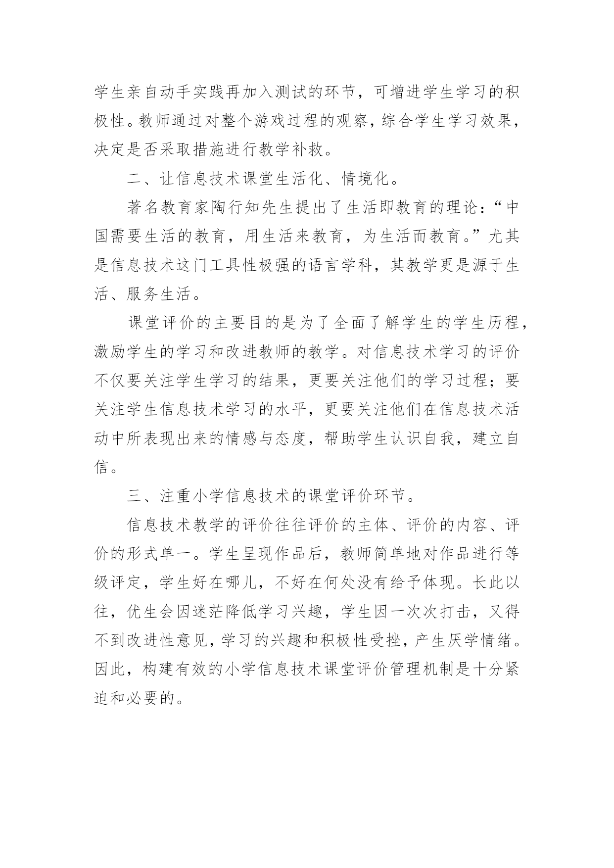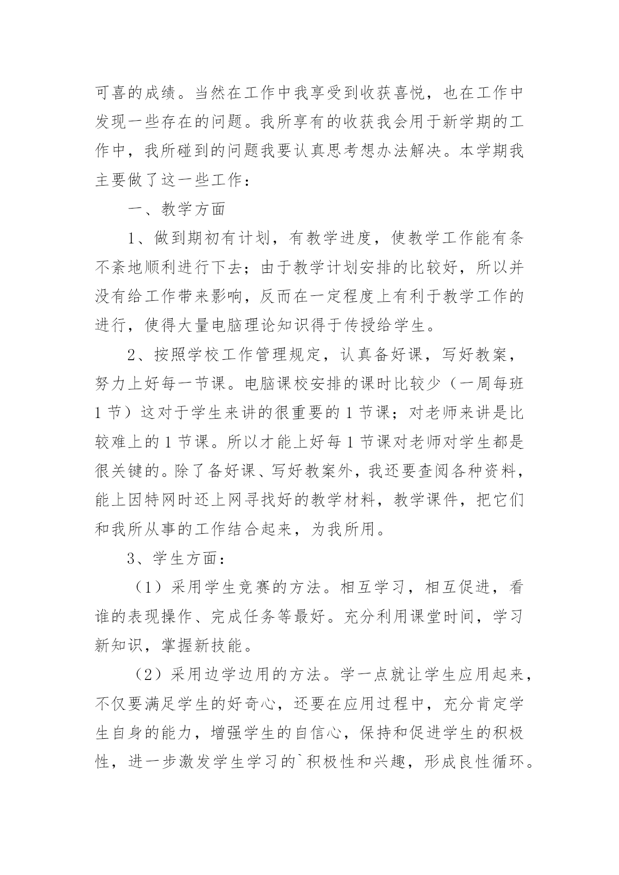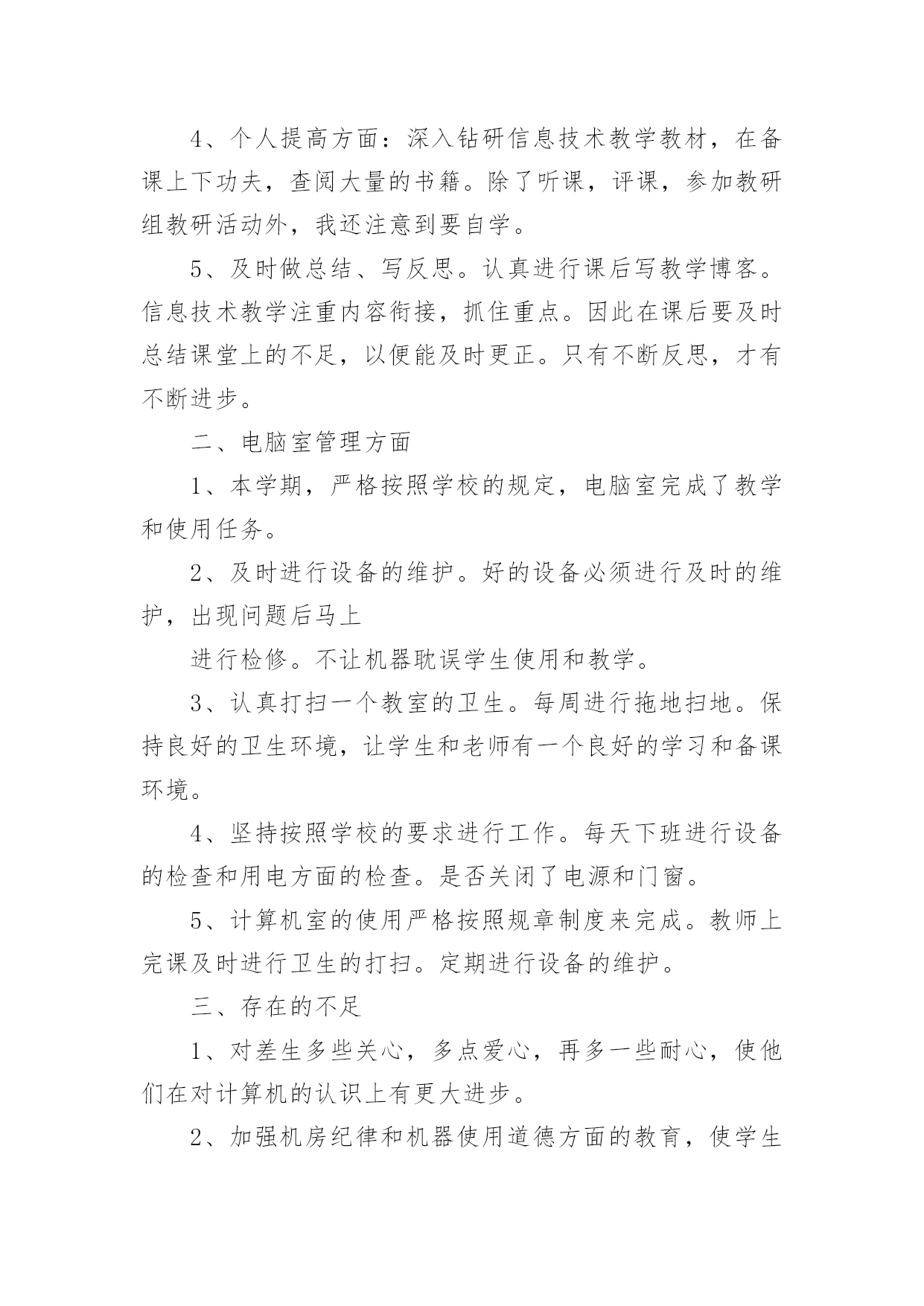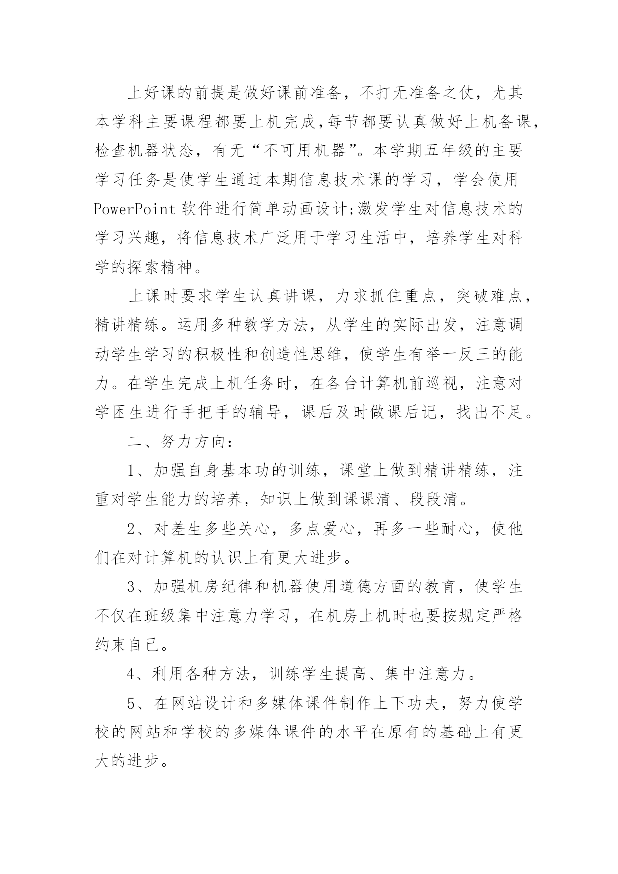 五年级信息技术教学工作总结五年级信息技术教学工作总结四篇总结是把一定阶段内的有关情况分析研究,做出有指导性结论的书面材料,它可使零星的、肤浅的、表面的感性认知上升到全面的、系统的、本质的理性认识上来,为此我们要做好回顾,写好总结。如何把总结做到重点突出呢?以下是小编帮大家整理的五年级信息技术教学工作总结4篇,仅供参考,希望能够帮助到大家。五年级信息技术教学工作总结篇1一、情况分析由于信息技术课时比较少,每周只有两节课,学生的遗忘性大,大多数学生学后没有注意巩固,学生掌握的情况不是很理想,参差不齐。我校大多数学生家里都有电脑,根据这一情况我把许多课堂上完不成的操作让学生回家练习,并且操作熟练,有一小部分学生纯粹是上课时间练习,课后就没有巩固的机会,所以,这一部分学生对所学知识遗忘较大,操作易生疏。二、本学期教学的主要任务和目的要求1、了解信息技术的应用环境和信息的一些表现形式。2、建立对计算机的感性认识,了解信息技术在日常生活中的应用,培养学生学习、使用计算机的兴趣和意识。3、在使用信息技术时学会与他人合作,学会使用与年龄发展相符的多媒体资源进行学习。4、能够在他人帮助下使用通讯远距离获取信息、与他人沟通,开展直接和独立的学习,发展个人的爱好和兴趣。5、知道应负责任地使用信息技术系统及软件,初步学会用利用网页制作软件——FrontPage进行网站制作的过程。三、教材的重点和难点1、认识在网站注册的意义,学会健康、负责地对网上资源进行评价,培训正确的信息道德规范。2、感受计算机处理多媒体的魅力,学会一些常见的应用软件。3、学会获取信息,并进一步加工、处理信息。4、加强计算机的综合应用能力。四、本学期提高教学质量的具体措施1、认真组织教学,认真对学生进行辅导。2、实行切实可行的教学方法,对学生进行知识的传授。3、由于学校存在人多机少的情况,所以采用小组学习的方式进行教学,注重每个学生的学习,力争使每个学生都能完成一节课的任务。4、对课堂进行实时监控,及时解决一些突发事件,使学生能集中精力学习。5、尽可能地多安排上机时间,让学生更多地熟悉软件环境,提高学生的动手能力。五年级信息技术教学工作总结篇2本学期,我担任全校五年级两个班级的信息技术教学工作。在这一学期中经过我校领导及老师和学生的努力取得了可喜的成绩。当然在工作中我享受到收获喜悦,也在工作中发现一些存在的问题。我所享有的收获我会用于新学期的工作中,我所碰到的问题我要认真思考想办法解决。本学期我主要做了这一些工作:一、教学方面1、做到期初有计划,有教学进度,使教学工作能有条不紊地顺利进行下去;由于教学计划安排的比较好,所以并没有给工作带来影响,反而在一定程度上有利于教学工作的进行,使得大量电脑理论知识得于传授给学生。2、按照学校工作管理规定,认真备好课,写好教案,努力上好每一节课。电脑课校安排的课时比较少(一周每班1节)这对于学生来讲的很重要的1节课;对老师来讲是比较难上的1节课。所以才能上好每1节课对老师对学生都是很关键的。除了备好课、写好教案外,我还要查阅各种资料,能上因特网时还上网寻找好的教学材料,教学课件,把它们和我所从事的工作结合起来,为我所用。3、学生方面:(1)采用学生竞赛的方法。相互学习,相互促进,看谁的表现操作、完成任务等最好。充分利用课堂时间,学习新知识,掌握新技能。(2)采用边学边用的方法。学一点就让学生应用起来,不仅要满足学生的好奇心,还要在应用过程中,充分肯定学生自身的能力,增强学生的自信心,保持和促进学生的积极性,进一步激发学生学习的`积极性和兴趣,形成良性循环。4、个人提高方面:深入钻研信息技术教学教材,在备课上下功夫,查阅大量的书籍。除了听课,评课,参加教研组教研活动外,我还注意到要自学。5、及时做总结、写反思。认真进行课后写教学博客。信息技术教学注重内容衔接,抓住重点。因此在课后要及时总结课堂上的不足,以便能及时更正。只有不断反思,才有不断进步。二、电脑室管理方面1、本学期,严格按照学校的规定,电脑室完成了教学和使用任务。2、及时进行设备的维护。好的设备必须进行及时的维护,出现问题后马上进行检修。不让机器耽误学生使用和教学。3、认真打扫一个教室的卫生。每周进行拖地扫地。保持良好的卫生环境,让学生和老师有一个良好的学习和备课环境。4、坚持按照学校的要求进行工作。每天下班进行设备的检查和用电方面的检查。是否关闭了电源和门窗。5、计算机室的使用严格按照规章制度来完成。教师上完课及时进行卫生的打扫。定期进行设备的维护。三、存在的不足1、对差生多些关心,多点爱心,再多一些耐心,使他们在对计算机的认识上有更大进步。2、加强机房纪律和机器使用道德方面的教育,使学生不仅在班级集中注意力学习,在机房上机时也要按规定严格约束自己。3、教室卫生不太令人满意,由于各方