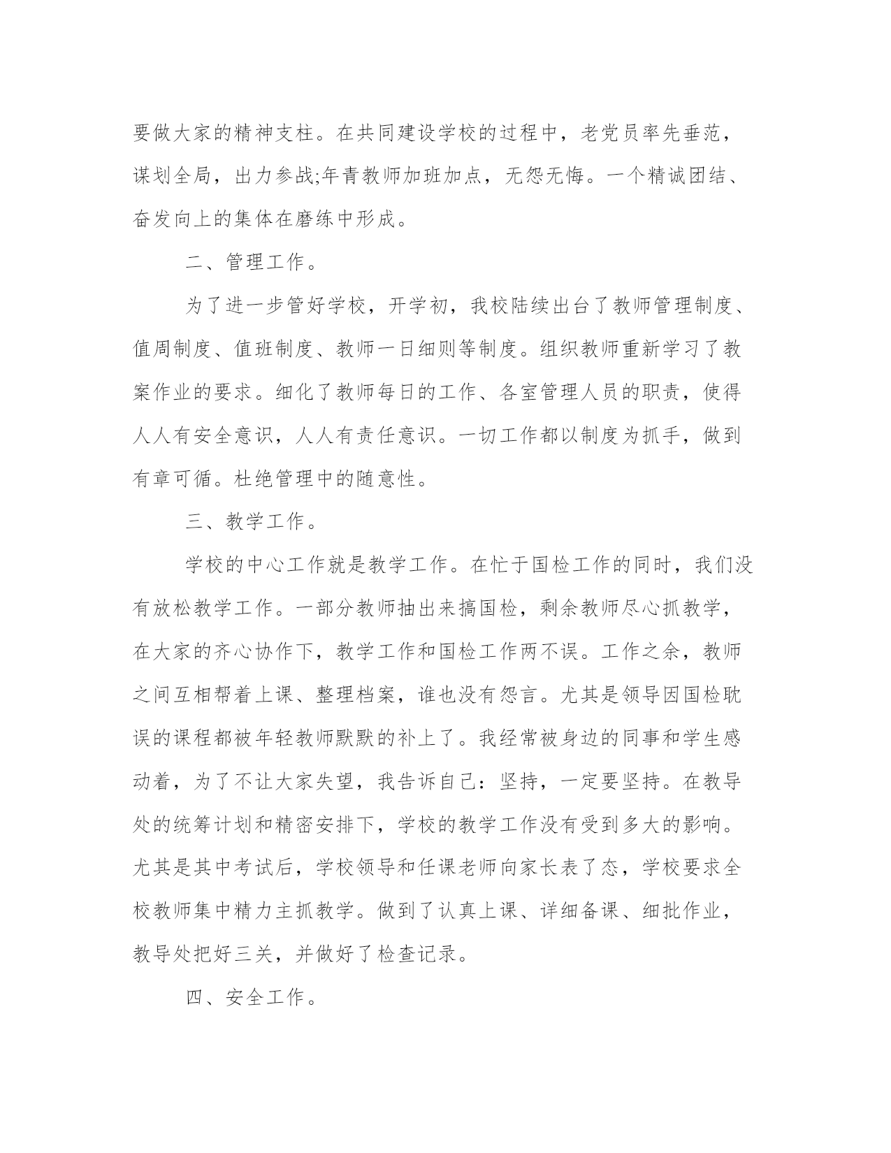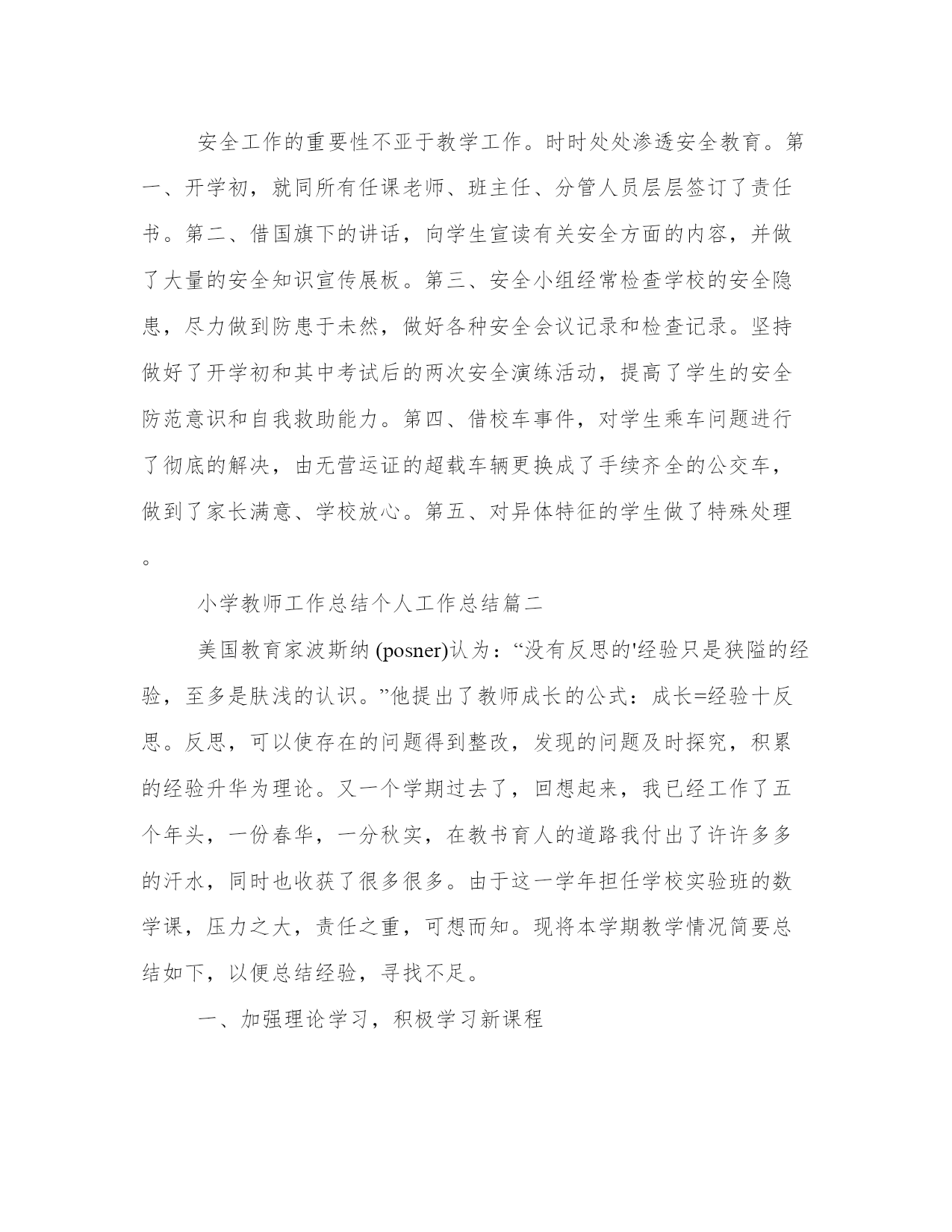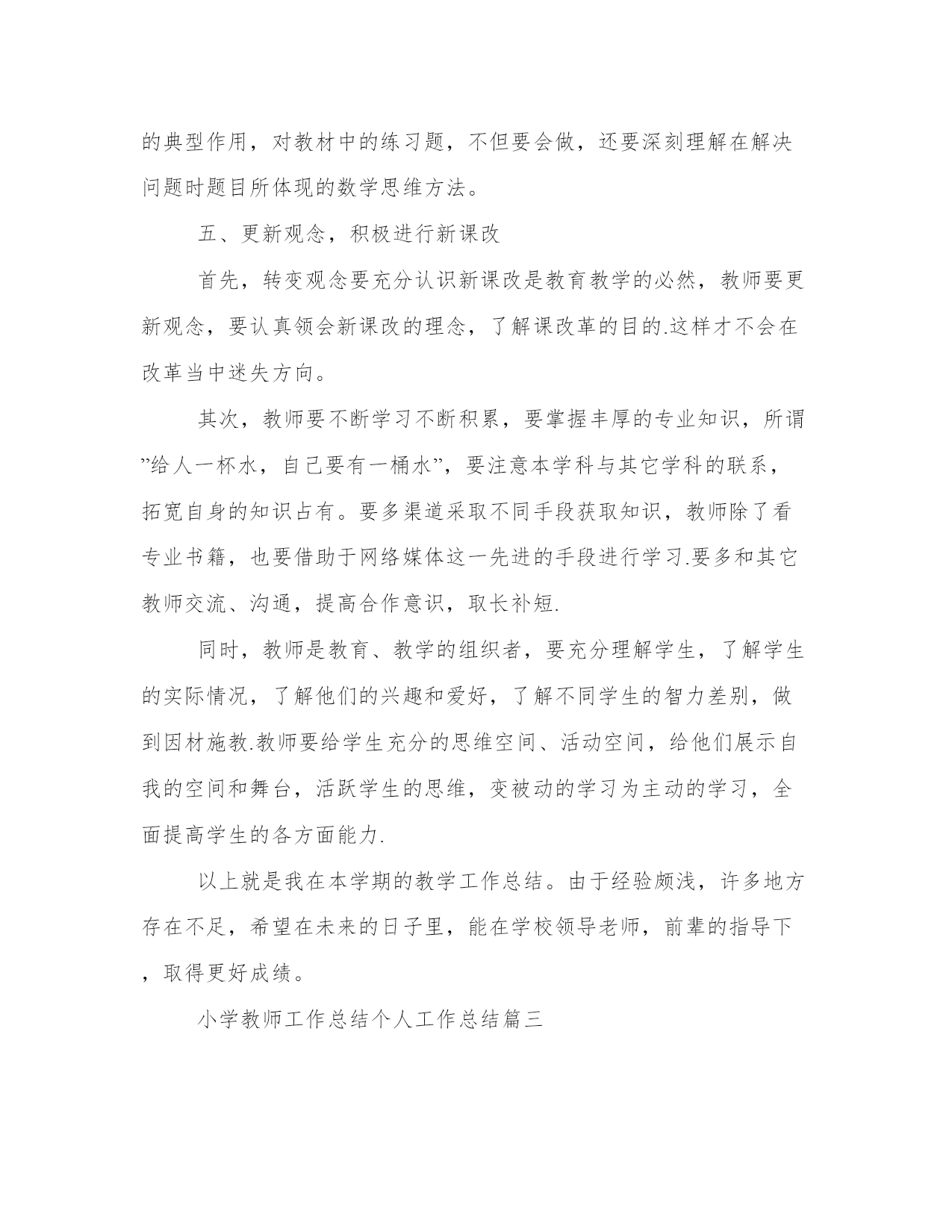 最新小学教师工作总结个人工作总结小学教师工作总结小学教师教学工作总结(通用9篇)总结是指对某一阶段的工作、学习或思想中的经验或情况加以总结和概括的书面材料,它可以明确下一步的工作方向,少走弯路,少犯错误,提高工作效益,因此,让我们写一份总结吧。总结书写有哪些要求呢?我们怎样才能写好一篇总结呢?下面是小编整理的个人今后的总结范文,欢迎阅读分享,希望对大家有所帮助。小学教师工作总结个人工作总结篇一一年来,全校师生在上级部门的有力领导下,我校的校园建设焕然一新,师生面貌和精神状态也更加振奋,教育教学更加规范化和科学化,各项管理也更加有章可循,安全工作深入人心。现将这学期的工作情况简述如下:一、思想工作。不遇大事,不知人心。借着国检工作的重要性,把教师的思想素质进行了更高层次的提升。首先,要求人人学习国检工作的内容和意义,熟记国检的基本知识和程序,并做有详细的学习笔记。其次,借无数次的大会、小会,树立身边的榜样和模范。经常表扬身边的老师和同学,激励其他教师的工作积极性和责任感。最后,做好自身表率。说得好不如做得到,自己先行一步,才能带动他人,要求教师做到的,领导必须做到。因此,领导班子不论多苦多累都要坚持,始终都要做大家的精神支柱。在共同建设学校的过程中,老党员率先垂范,谋划全局,出力参战;年青教师加班加点,无怨无悔。一个精诚团结、奋发向上的集体在磨练中形成。二、管理工作。为了进一步管好学校,开学初,我校陆续出台了教师管理制度、值周制度、值班制度、教师一日细则等制度。组织教师重新学习了教案作业的要求。细化了教师每日的工作、各室管理人员的职责,使得人人有安全意识,人人有责任意识。一切工作都以制度为抓手,做到有章可循。杜绝管理中的随意性。三、教学工作。学校的中心工作就是教学工作。在忙于国检工作的同时,我们没有放松教学工作。一部分教师抽出来搞国检,剩余教师尽心抓教学,在大家的齐心协作下,教学工作和国检工作两不误。工作之余,教师之间互相帮着上课、整理档案,谁也没有怨言。尤其是领导因国检耽误的课程都被年轻教师默默的补上了。我经常被身边的同事和学生感动着,为了不让大家失望,我告诉自己:坚持,一定要坚持。在教导处的统筹计划和精密安排下,学校的教学工作没有受到多大的影响。尤其是其中考试后,学校领导和任课老师向家长表了态,学校要求全校教师集中精力主抓教学。做到了认真上课、详细备课、细批作业,教导处把好三关,并做好了检查记录。四、安全工作。安全工作的重要性不亚于教学工作。时时处处渗透安全教育。第一、开学初,就同所有任课老师、班主任、分管人员层层签订了责任书。第二、借国旗下的讲话,向学生宣读有关安全方面的内容,并做了大量的安全知识宣传展板。第三、安全小组经常检查学校的安全隐患,尽力做到防患于未然,做好各种安全会议记录和检查记录。坚持做好了开学初和其中考试后的两次安全演练活动,提高了学生的安全防范意识和自我救助能力。第四、借校车事件,对学生乘车问题进行了彻底的解决,由无营运证的超载车辆更换成了手续齐全的公交车,做到了家长满意、学校放心。第五、对异体特征的学生做了特殊处理。小学教师工作总结个人工作总结篇二美国教育家波斯纳(posner)认为:“没有反思的'经验只是狭隘的经验,至多是肤浅的认识。”他提出了教师成长的公式:成长=经验十反思。反思,可以使存在的问题得到整改,发现的问题及时探究,积累的经验升华为理论。又一个学期过去了,回想起来,我已经工作了五个年头,一份春华,一分秋实,在教书育人的道路我付出了许许多多的汗水,同时也收获了很多很多。由于这一学年担任学校实验班的数学课,压力之大,责任之重,可想而知。现将本学期教学情况简要总结如下,以便总结经验,寻找不足。一、加强理论学习,积极学习新课程俗话说,理论是行动的先导。自山东省实行新课程以来,我是第一年带新课程的新授课,对新课程的认识了解还不够,因此,必须积极学习新课程改革的相关要求理论,仔细分析新的课程标准,并结合山东省的考试说明,及时更新自己的大脑,以适应新课程改革的需要。同时为了和教学一线的同行们交流,积极利用好互联网络,开通了教育教学博客,养成了及时写教学反思的好习惯。作为一位年轻的数学教师,我发现在教学前后,进行教学反思尤为重要,在课堂教学过程中,学生是学习的主体,学生总会独特的见解,教学前后,都要进行反思,对以后上课积累了经验,奠定了基础。同时,这些见解也是对课堂教学非常重要的一部分,积累经验,教后反思,是上好一堂精彩而又有效课的第一手材料。二、关心爱护学生,积极分析学情所谓“亲其师,信其道”,“爱是最好的教育”,作为教师不仅仅要担任响应的教学,同时还肩负着育人的责任。如何育人?我认为,爱学生是根本。爱学生,就需要我们尊重学生的人格、兴趣、爱好,了解学生习惯以及为人处