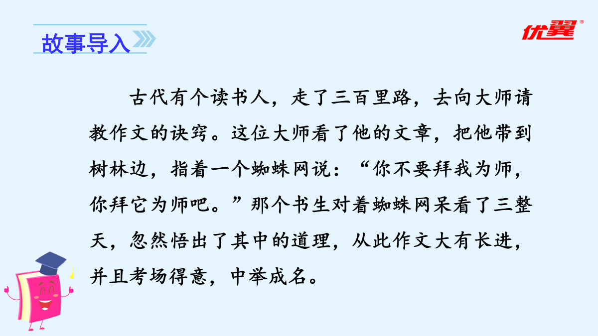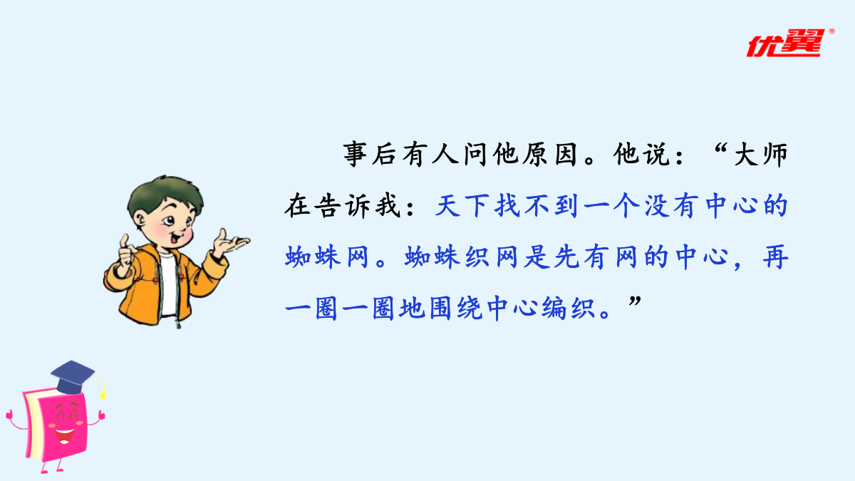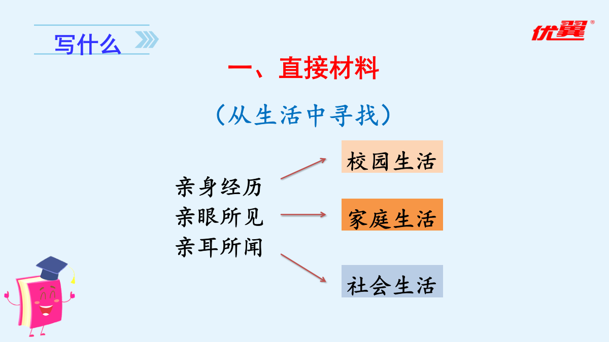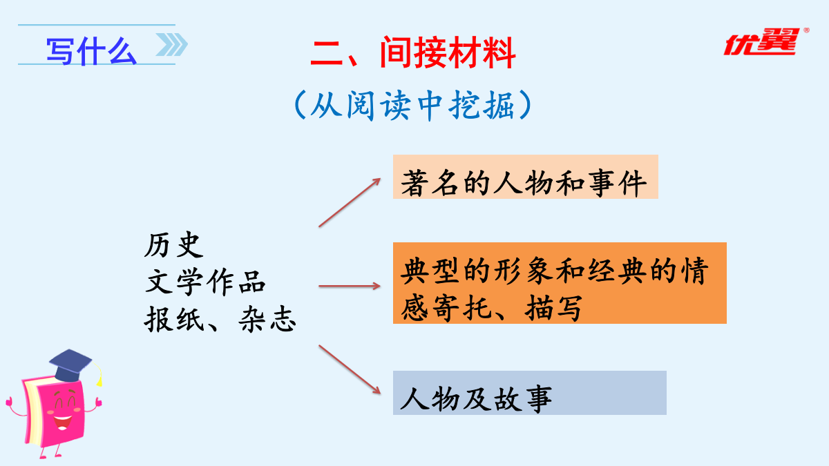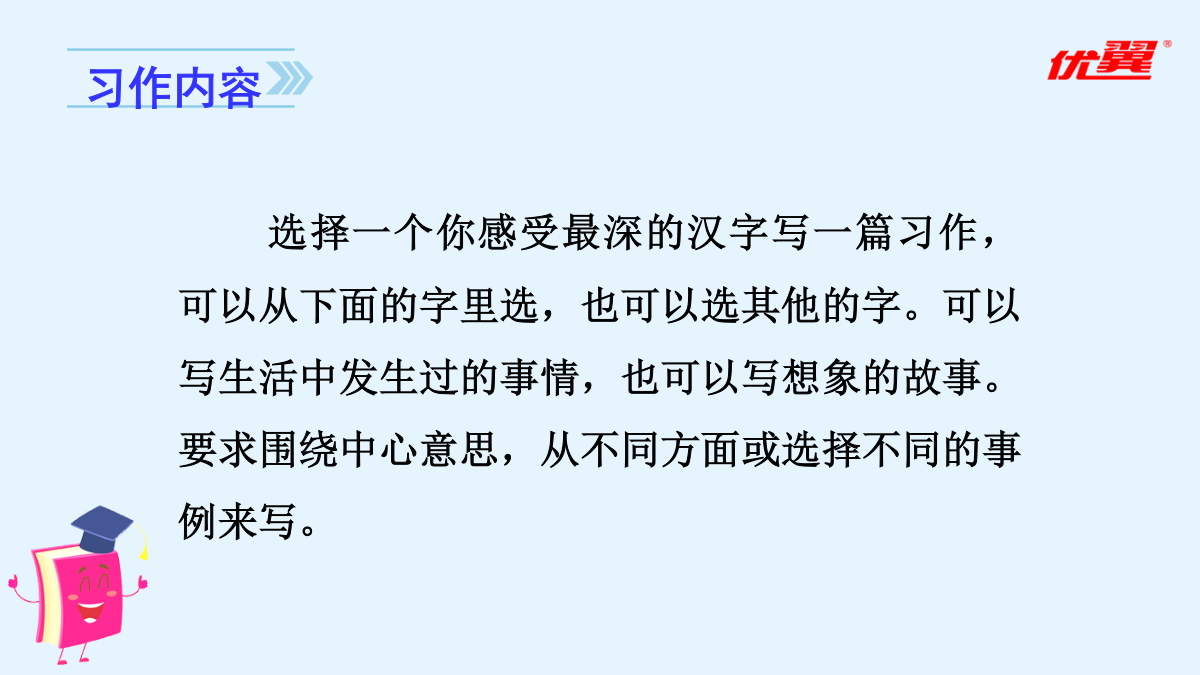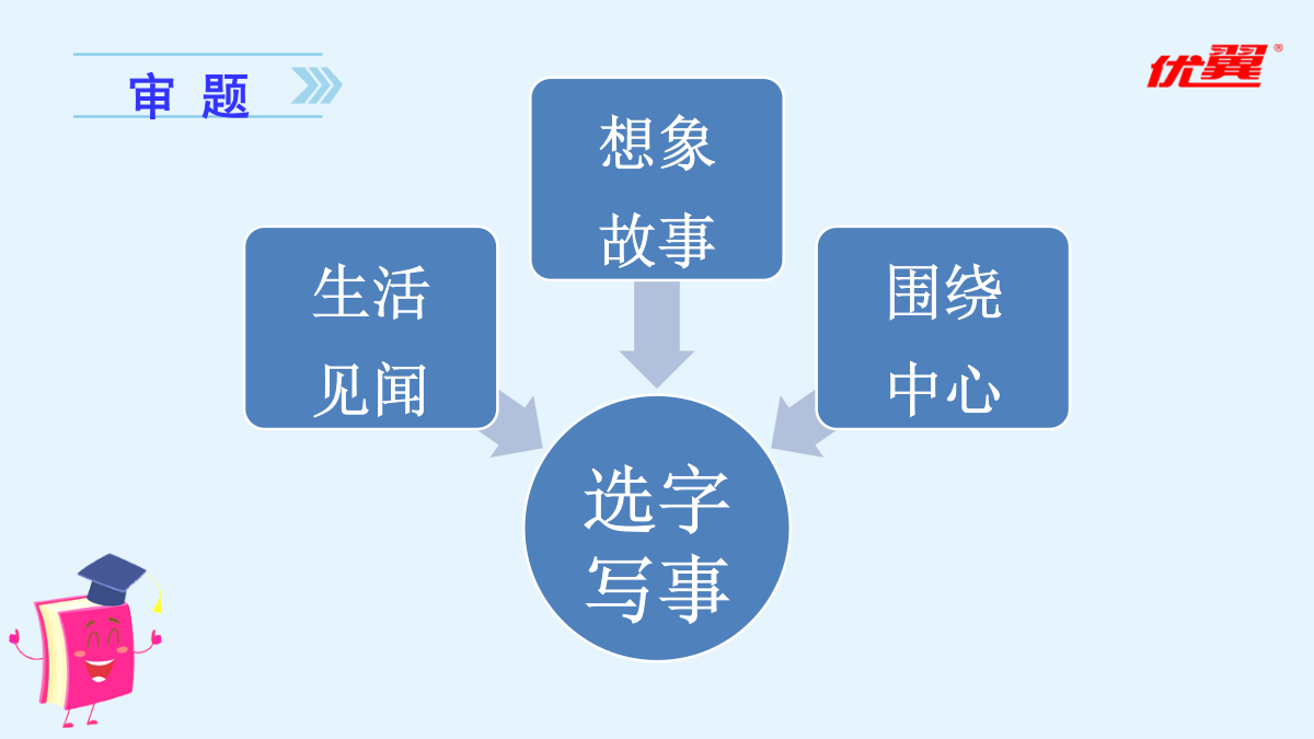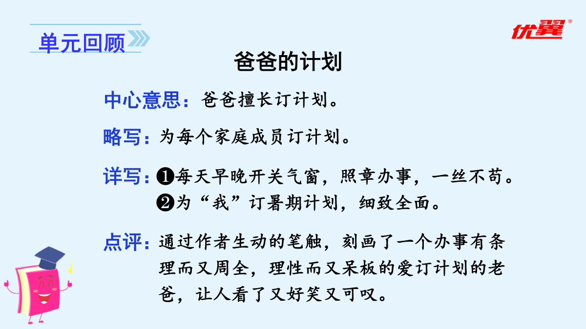 习作五:围绕中心意思写审题立意一、直接材料二、间接材料爸爸的计划确立中心1.填一填,明确本次习作的任务。(2)审清重点对于本次习作的重点,下列说法错误的一项是()。A.围绕一个人,通过不同的事例,展现这个人的特点。B.选取一个字,可以写真实发生的事例,也可以写想象的故事来体现字的内涵。C.可以选取教材中的字来写,也可以选取自己感受最深的字来写。D.写出一个字表达的多个内涵。2.【选材训练】下面哪些材料适合本次习作?在括号里打“√”。爸爸妈妈都睡了,隐约中我听到了一阵虚弱的狗叫。正当我要翻箱倒柜找零食时,我看到了一盒狗罐头。等等,我好像忘了什么,是什么呢?不知为何,我便开始数手上的狗罐头,看看最近是不是又要给你加餐了。“一、二、三、四、五、六、七……”“咦,怎么还有二十七包?今天喂完球球就应该只剩二十四包了。整整多了三包!不对呀!等等,这……这叫声怎么这么熟悉呢?难道……啊,对了!我今天因为出去玩,一整天都没有喂食球球!这痛苦的呻吟声就是球球的叫声呀!”我急了,不管三七二十一就抽出一包狗罐头往阳台上跑。果不其然,你一动不动地趴在太阳椅下,痛苦地叫着。我慌了,于是赶忙给你准备吃的,可是在我把吃的倒好后,你的身体已经在一点点地变冷了。我吓坏了,赶紧叫醒妈妈,妈妈告诉我:“它病了,再这样下去它可是会死的!”后来我们快速地把病恹恹的你送去医院,兽医给你开了药。在妈妈和医生的帮忙下,你又重获得了生命,妈妈却说:“你是养不活它的,它在你的手里一定会死的,送人吧!”还没等我反驳,妈妈就约定好要送的人家了。第二天一大早,我听到了一阵乱哄哄的谈话声和几声狗叫,一开始我还没怎么注意,当我醒悟过来时,你却已不见了身影。可惜,世上是不会有后悔药的!爱你的小主人这样对你,与你不辞而别,你能原谅我吗?这样一位差劲的前主人,也只能盼望着你能有个更为负责的好主人了。希望你在别处生活得更加幸福……我考试没考好,就是说我走路太慢。寒冷的日子,听着他的责备,就好像内心结了厚厚的冰似的。前不久我生了病,少不了听爸爸的怪罪:“让你多穿点儿衣服,你还不听!”如果再咳嗽,就更不得了了,他会和妈妈一起找药,看着我吃下去才安心。中午放学回家,我从冰箱拿出一盒牛奶,刚准备喝,爸爸便一把夺过去:“病还没好呢,就喝冰的,我去给你热了再喝。”看着他转身走进厨房,只觉得内心涌起一股暖流。喝着热过的牛奶,暖意涌上心间,一瞬间,我读懂了父亲的爱。是谁在我半夜咳嗽厉害时托起睡意正浓的我的头,把药送入我口中?是谁在我生日那天,吹了一堆的气球布置家里?是谁风里来雨里去,载我回到温暖的家?是爸爸!爸爸是关心我的,只是不善于用语言来表达罢了。他责备我,是为了让我更加出色。可惜,年少的我不善于从现象看本质,被表面所迷惑,忽视了爸爸爱我的心。这暖暖的爱,已然在我心中点燃,融化了那因为无知而结下的坚冰。亲爱的爸爸,谢谢你告诉了我什么是无言的爱,让我发现,我一直生活在爱中。这个冬天,好冷,庆幸,还有一份爱,在我心中点燃。心若暖,晴空万里。爱如火焰,融化冰雪。爱在身边,暖意连绵。——后记本文没有离奇生动的故事情节,一切看似平淡,读了全文,却觉得在字里行间蕴藏着一种浓浓的情、深深的爱。作者最终读懂了父爱,理解了爸爸。文章结构紧凑,详略得当,中心突出。要围绕中心,围绕着主旨选材。表现中心的主要材料要有用、典型、新颖、具体,这是文章的主要构成部分。行文要做到主次分明、详略得当。同学之间闹了一点小矛盾。事情虽小,却被天性敏感的我无限倍扩大,到最后,就成了大家都针对我。房间里空荡荡的,就像我的心一样空荡荡。世界上为什么会有“悲伤”这个词,我一遍遍地问自己。我情不自禁地流下了眼泪,滚烫的泪水顺着我的脸颊流下去。我选择了孤单,只有孤单是我的好朋友,和朋友闹了一点小摩擦时,也只有孤单一个人陪着我。“你为什么要这样?”我抬起被泪水浸湿的脸,是妈妈。“又是和同学闹了小矛盾吧?你们是朋友,朋友需要互相谅解,懂吗?”“嗯。”第二天,我主动向同学道歉,我们又重归于好了。——《悲》节选素材宝库填一填,理清本次习作的思路。(3)围绕中心:我先写;再写,;最后写,。