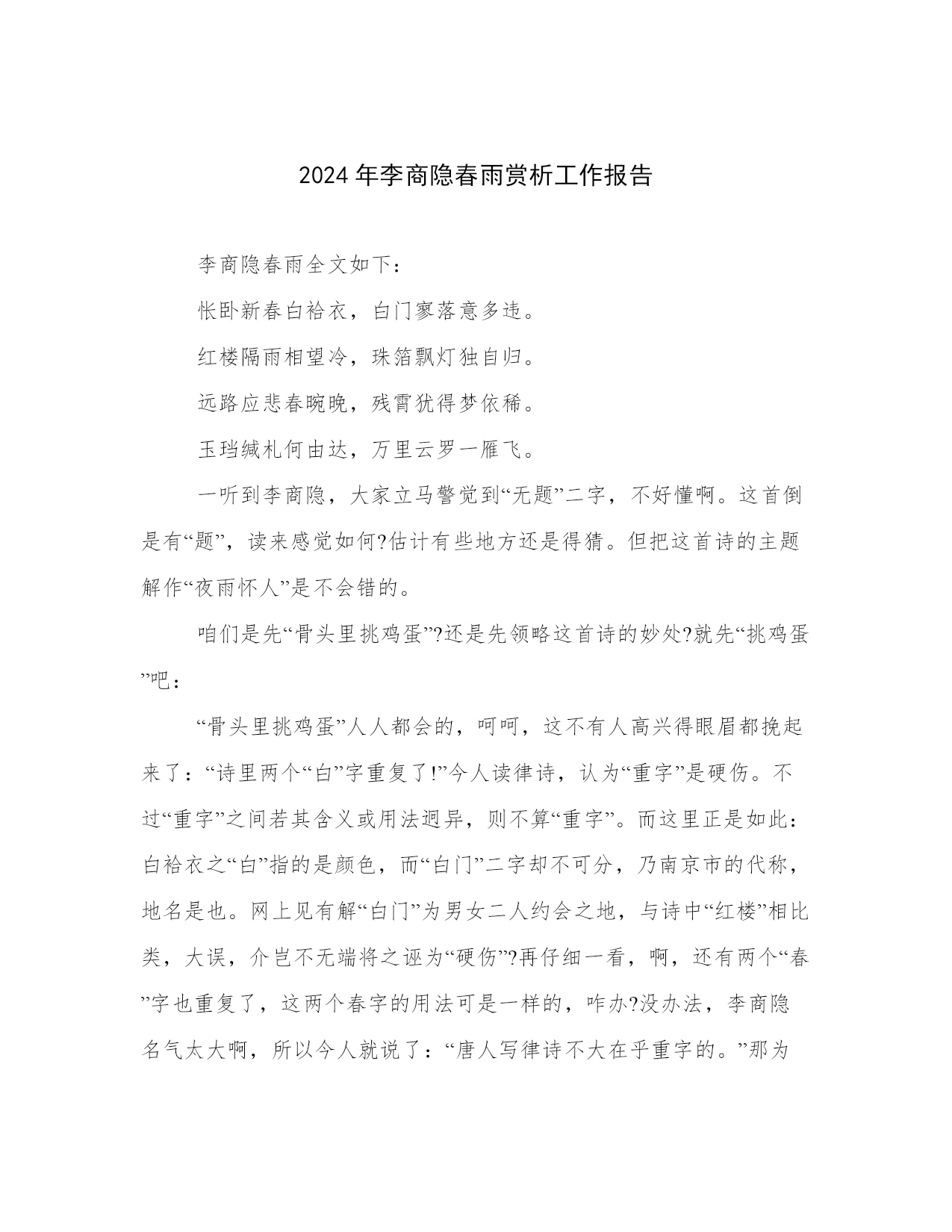 2024年李商隐春雨赏析工作报告李商隐春雨全文如下:怅卧新春白袷衣,白门寥落意多违。红楼隔雨相望冷,珠箔飘灯独自归。远路应悲春晼晚,残霄犹得梦依稀。玉珰缄札何由达,万里云罗一雁飞。一听到李商隐,大家立马警觉到“无题”二字,不好懂啊。这首倒是有“题”,读来感觉如何?估计有些地方还是得猜。但把这首诗的主题解作“夜雨怀人”是不会错的。咱们是先“骨头里挑鸡蛋”?还是先领略这首诗的妙处?就先“挑鸡蛋”吧:“骨头里挑鸡蛋”人人都会的,呵呵,这不有人高兴得眼眉都挽起来了:“诗里两个“白”字重复了!”今人读律诗,认为“重