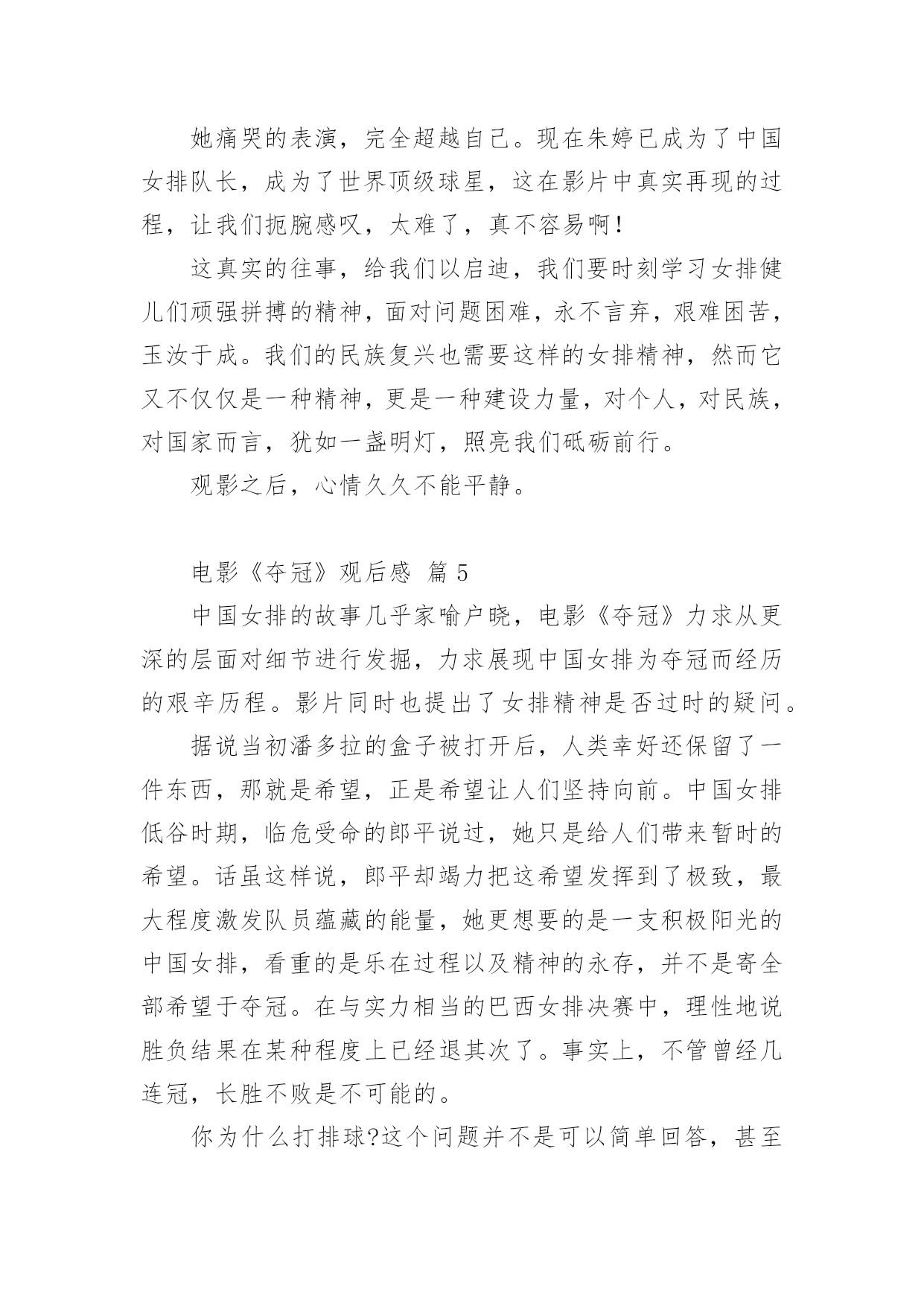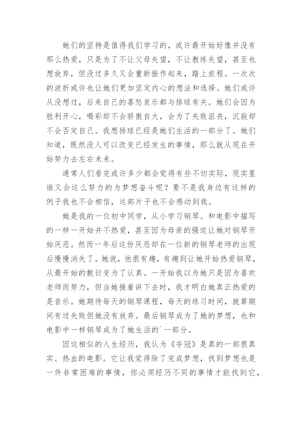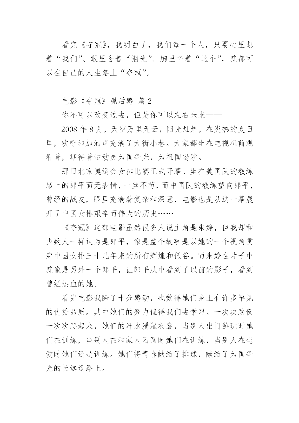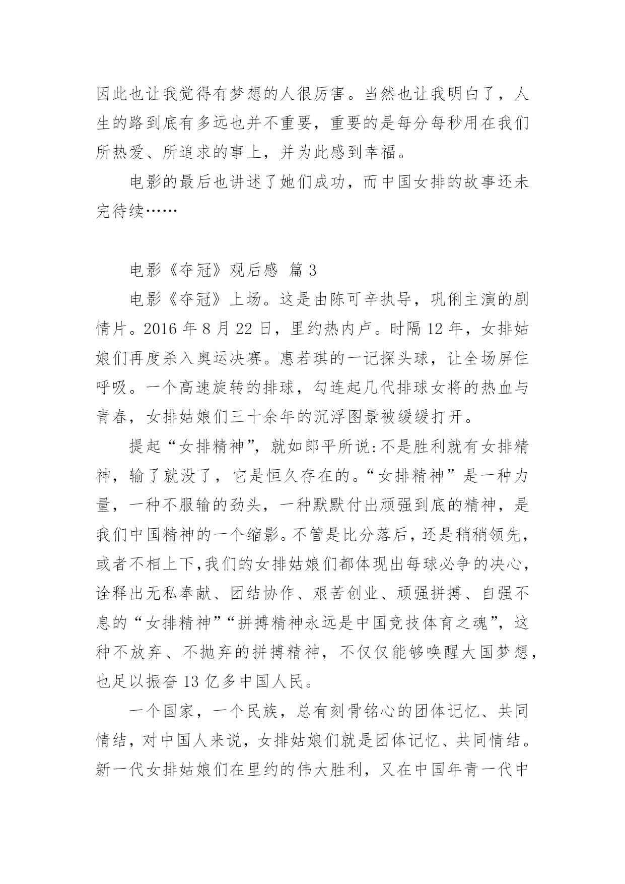 电影《夺冠》观后感电影《夺冠》观后感(通用31篇)认真观看完一部影视作品以后,相信你一定有很多值得分享的收获,需要写一篇观后感好好地作记录了。那么你真的会写观后感吗?下面是小编帮大家整理的电影《夺冠》观后感,欢迎大家分享。电影《夺冠》观后感篇1这个国庆假期让我印象最深刻的,既不是外出游玩的快乐,也不是在家看书的安逸,而是观看电影《夺冠》带来的感动……《夺冠》中有三个场景让我感动得泪流满面。影片开始不久,老教练站在训练场上,对新来的陪打教练和老女排队员说:“中国女排是什么?中国女排没有你,没有我,只有我们。”我的心一颤,“我们”是谁?我带着疑问继续往下看。当我看到7号队员负着腰伤上阵,为主攻手郎平赢得宝贵的休息时间时,这不正是“我们”吗?当我看到面对日本对手遥遥领先,女排队员凝成一股劲、咬牙死瞌、要球不要命、绝地反击时,这不正是“我们”吗?当我看到女排夺冠,大家都冲上大街敲锣打鼓、摇旗欢呼呐喊时,这不正是“我们”吗?我明白了,正是因为女排队员心里装着“我们”,用五连冠一次次证明了“我们中国人行”,作为新时代的我们,在生活中更应该多想到“我们”而不是“我”。影片放到2008年中美女排大战,美国女排战胜中国女排时,镜头拉近,椅子上球衣USA字母映入眼帘,美国女排教练郎平平静地站起来,拿起球衣,背上球袋,缓慢地走出赛场,对身边的欢呼声、呐喊声、怒骂声充耳不闻,眼里却分明闪着点点泪光。这点点泪光啊,刺得我的心一痛,似乎感应到了她心里的'纠结、矛盾和哀伤。是啊,作为一名曾经的中国女排队员,一名中国人,她当然希望中国女排再次夺冠,但作为一名职业的美国女排教练,她也希望自己带的队伍能夺冠啊。这“点点泪光”不正是我们中国人对祖国深沉的爱吗?镜头来到2016年中国女排备战里约奥运会,新女排队员状态不佳,不明白“为了谁打球”、“爱不爱排球”,郎平教练把她们带回当年老女排的训练基地。一天深夜,曾经的陪打教练来到基地,摸着墙上的球印对夜宿球场的新女排队员说:“这墙上的每个球印,就是以前那帮傻姑娘,一个球一个球给凿出来的。”“我们那时什么都没有,但我们有‘这个’。”教练指着心口说。我的心一震,“这个”是什么呢?当我看到新女排队员迎战世界排名第一的巴西女排,她们抛下包袱,放开了打,豁出去了打,顽强拼搏,把比分一分一分咬下来,最后逆转夺冠时,我明白了“这个”是什么。要知道当时的女排处于低谷,排名下滑到世界第七,多少年没站在冠军领奖台了。“这个”不正是一代代女排不放弃、不言输、竭尽全力夺冠的团队精神吗?“这个”不正是我们国家从贫困落后走向繁荣富强的精神源泉吗?看完《夺冠》,我明白了,我们每一个人,只要心里想着“我们”、眼里含着“泪光”、胸里怀着“这个”,就都可以在自己的人生路上“夺冠”。电影《夺冠》观后感篇2你不可以改变过去,但是你可以左右未来——2008年8月,天空万里无云,阳光灿烂,在炎热的夏日里,欢呼和加油声充满了大街小巷。大家都坐在电视机前观看着,期待着运动员为国争光,为祖国喝彩。那日北京奥运会女排比赛正式开幕。坐在美国队的教练席上的郎平面无表情,一丝不苟,而中国队的教练望向郎平,曾经的战友,眼里充满着复杂和深意,电影也是从这一幕展开了中国女排艰辛而伟大的历史……《夺冠》这部电影虽然很多人说主角是朱婷,但我却和少数人一样认为是郎平,像是整个故事是以她的一个视角贯穿中国女排三十几年来的所有辉煌和低谷。而朱婷在片子中就像是另外一个郎平,让郎平从中看到了以前的影子,看到曾经热血的她。看完电影我除了十分感动,也觉得她们身上有许多罕见的优秀品质。其中她们的努力值得我们去学习。一次次跌倒一次次爬起来,她们的汗水浸湿衣裳,当别人出门游玩时她们在训练,当别人在和家人团圆时她们在训练,当别人在恋爱时她们还是训练。她们将青春献给了排球,献给了为国争光的长远道路上。她们的坚持是值得我们学习的,或许最开始好像并没有那么热爱,只是为了不让父母失望,不让教练失望,甚至也想放弃,但没过多久又会重新振作起来,踏上旅程。一次次的波折或许也让她们更加坚定内心的想法和选择。她们或许从没想过,后来自己的喜怒哀乐都与排球有关。她们会因为胜利开心,喝彩却不会骄傲自大,会为了失败沮丧,沉寂却不会否定自己。我想排球已经是她们生活的一部分了。她们知道,既然没人可以改变已经发生的事情,那么就从现在开始努力去左右未来。通常人们看完或许多少都会觉得有些不切实际,现实里谁又会这么努力的为梦想奋斗呢?要不是我身边有这样的例子我也不会相信,这部片子也不会感动到我。她是我的一位初中同学,从小学习钢琴。和电影中描写的一样一开始并不热爱,甚至因为母亲的强迫让她对钢琴开始厌恶。然而一年后这份厌恶却在一位新的钢琴老师的出现后慢慢消失了。她说,他很有趣,有趣到让她开始热爱钢琴,从最开始的敷衍变为了认真。一开始我以为她只是
