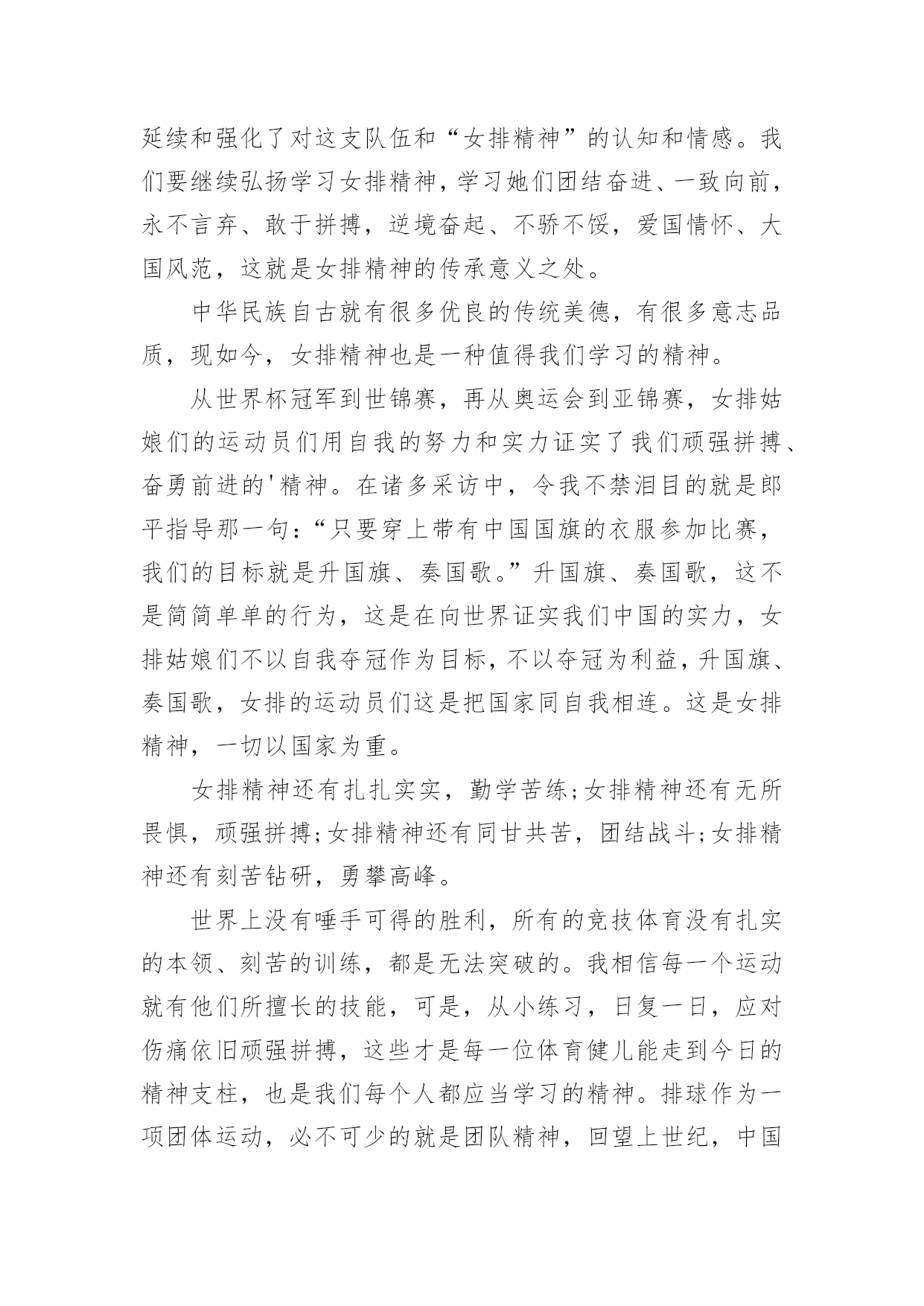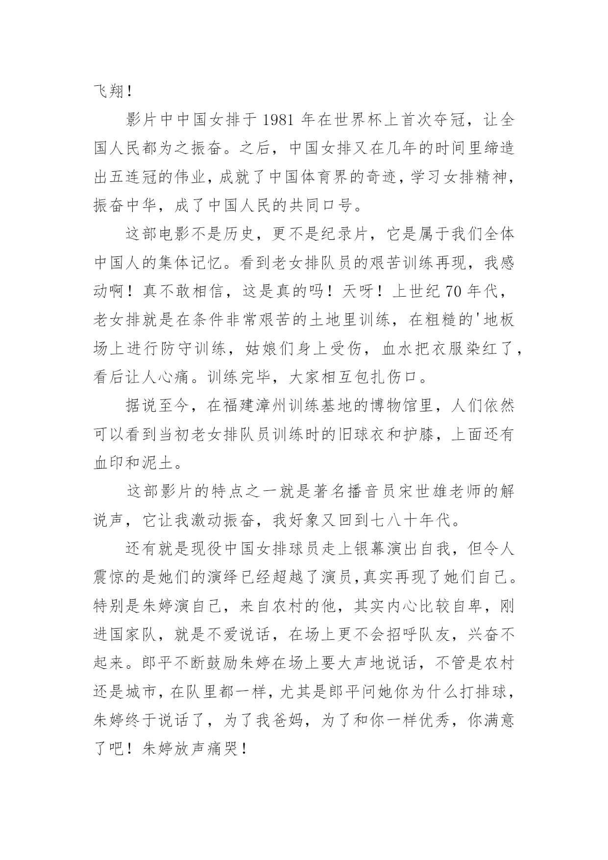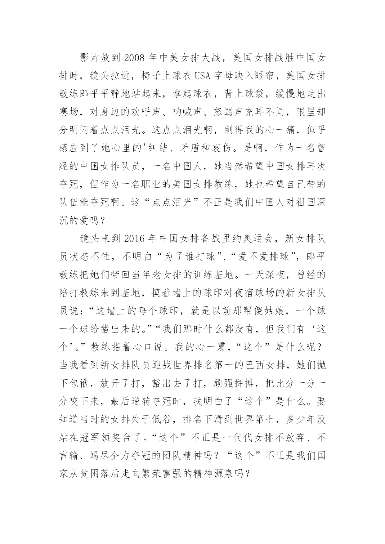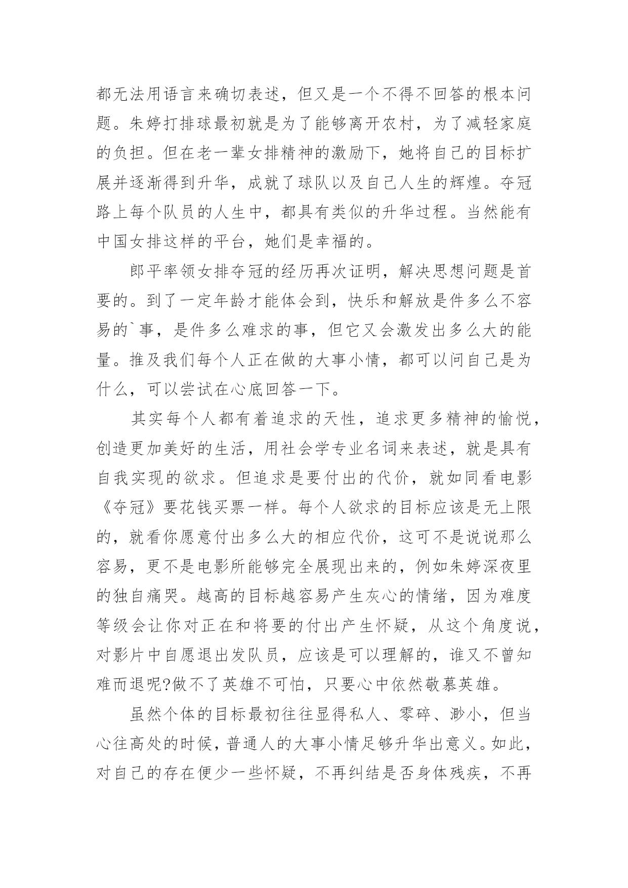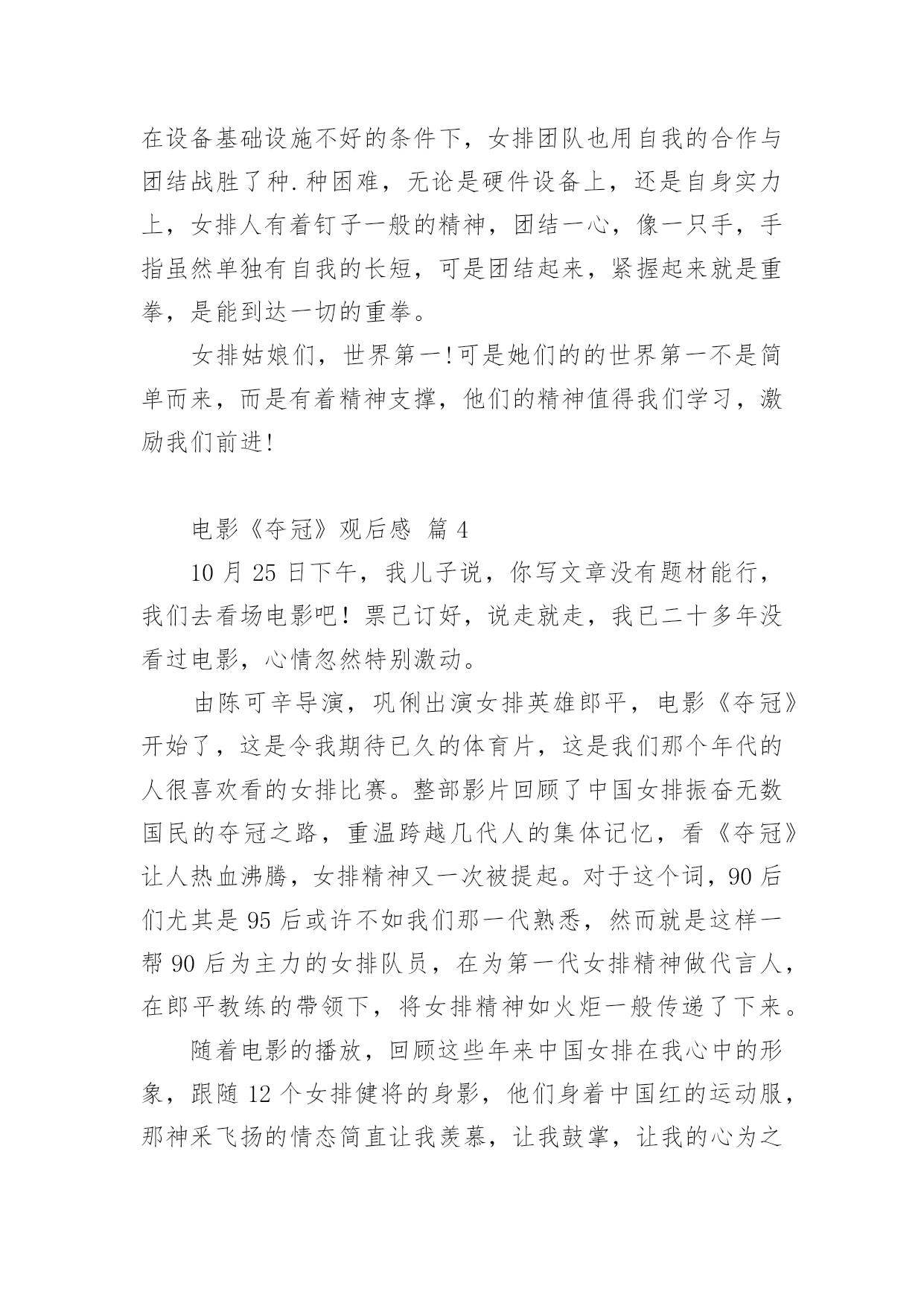 电影《夺冠》观后感电影《夺冠》观后感(通用31篇)认真观看完一部影视作品以后,相信你一定有很多值得分享的收获,需要写一篇观后感好好地作记录了。那么你真的会写观后感吗?下面是小编帮大家整理的电影《夺冠》观后感,欢迎大家分享。电影《夺冠》观后感篇1这个国庆假期让我印象最深刻的,既不是外出游玩的快乐,也不是在家看书的安逸,而是观看电影《夺冠》带来的感动……《夺冠》中有三个场景让我感动得泪流满面。影片开始不久,老教练站在训练场上,对新来的陪打教练和老女排队员说:“中国女排是什么?中国女排没有你,没有我,只有我们。”我的心一颤,“我们”是谁?我带着疑问继续往下看。当我看到7号队员负着腰伤上阵,为主攻手郎平赢得宝贵的休息时间时,这不正是“我们”吗?当我看到面对日本对手遥遥领先,女排队员凝成一股劲、咬牙死瞌、要球不要命、绝地反击时,这不正是“我们”吗?当我看到女排夺冠,大家都冲上大街敲锣打鼓、摇旗欢呼呐喊时,这不正是“我们”吗?我明白了,正是因为女排队员心里装着“我们”,用五连冠一次次证明了“我们中国人行”,作为新时代的我们,在生活中更应该多想到“我们”而不是“我”。影片放到2008年中美女排大战,美国女排战胜中国女排时,镜头拉近,椅子上球衣USA字母映入眼帘,美国女排教练郎平平静地站起来,拿起球衣,背上球袋,缓慢地走出赛场,对身边的欢呼声、呐喊声、怒骂声充耳不闻,眼里却分明闪着点点泪光。这点点泪光啊,刺得我的心一痛,似乎感应到了她心里的'纠结、矛盾和哀伤。是啊,作为一名曾经的中国女排队员,一名中国人,她当然希望中国女排再次夺冠,但作为一名职业的美国女排教练,她也希望自己带的队伍能夺冠啊。这“点点泪光”不正是我们中国人对祖国深沉的爱吗?镜头来到2016年中国女排备战里约奥运会,新女排队员状态不佳,不明白“为了谁打球”、“爱不爱排球”,郎平教练把她们带回当年老女排的训练基地。一天深夜,曾经的陪打教练来到基地,摸着墙上的球印对夜宿球场的新女排队员说:“这墙上的每个球印,就是以前那帮傻姑娘,一个球一个球给凿出来的。”“我们那时什么都没有,但我们有‘这个’。”教练指着心口说。我的心一震,“这个”是什么呢?当我看到新女排队员迎战世界排名第一的巴西女排,她们抛下包袱,放开了打,豁出去了打,顽强拼搏,把比分一分一分咬下来,最后逆转夺冠时,我明白了“这个”是什么。要知道当时的女排处于低谷,排名下滑到世界第七,多少年没站在冠军领奖台了。“这个”不正是一代代女排不放弃、不言输、竭尽全力夺冠的团队精神吗?“这个”不正是我们国家从贫困落后走向繁荣富强的精神源泉吗?看完《夺冠》,我明白了,我们每一个人,只要心里想着“我们”、眼里含着“泪光”、胸里怀着“这个”,就都可以在自己的人生路上“夺冠”。电影《夺冠》观后感篇2你不可以改变过去,但是你可以左右未来——2008年8月,天空万里无云,阳光灿烂,在炎热的夏日里,欢呼和加油声充满了大街小巷。大家都坐在电视机前观看着,期待着运动员为国争光,为祖国喝彩。那日北京奥运会女排比赛正式开幕。坐在美国队的教练席上的郎平面无表情,一丝不苟,而中国队的教练望向郎平,曾经的战友,眼里充满着复杂和深意,电影也是从这一幕展开了中国女排艰辛而伟大的历史……《夺冠》这部电影虽然很多人说主角是朱婷,但我却和少数人一样认为是郎平,像是整个故事是以她的一个视角贯穿中国女排三十几年来的所有辉煌和低谷。而朱婷在片子中就像是另外一个郎平,让郎平从中看到了以前的影子,看到曾经热血的她。看完电影我除了十分感动,也觉得她们身上有许多罕见的优秀品质。其中她们的努力值得我们去学习。一次次跌倒一次次爬起来,她们的汗水浸湿衣裳,当别人出门游玩时她们在训练,当别人在和家人团圆时她们在训练,当别人在恋爱时她们还是训练。她们将青春献给了排球,献给了为国争光的长远道路上。她们的坚持是值得我们学习的,或许最开始好像并没有那么热爱,只是为了不让父母失望,不让教练失望,甚至也想放弃,但没过多久又会重新振作起来,踏上旅程。一次次的波折或许也让她们更加坚定内心的想法和选择。她们或许从没想过,后来自己的喜怒哀乐都与排球有关。她们会因为胜利开心,喝彩却不会骄傲自大,会为了失败沮丧,沉寂却不会否定自己。我想排球已经是她们生活的一部分了。她们知道,既然没人可以改变已经发生的事情,那么就从现在开始努力去左右未来。通常人们看完或许多少都会觉得有些不切实际,现实里谁又会这么努力的为梦想奋斗呢?要不是我身边有这样的例子我也不会相信,这部片子也不会感动到我。她是我的一位初中同学,从小学习钢琴。和电影中描写的一样一开始并不热爱,甚至因为母亲的强迫让她对钢琴开始厌恶。然而一年后这份厌恶却在一位新的钢琴老师的出现后慢慢消失了。她说,他很有趣,有趣到让她开始热爱钢琴,从最开始的敷衍变为了认真。一开始我以为她只是