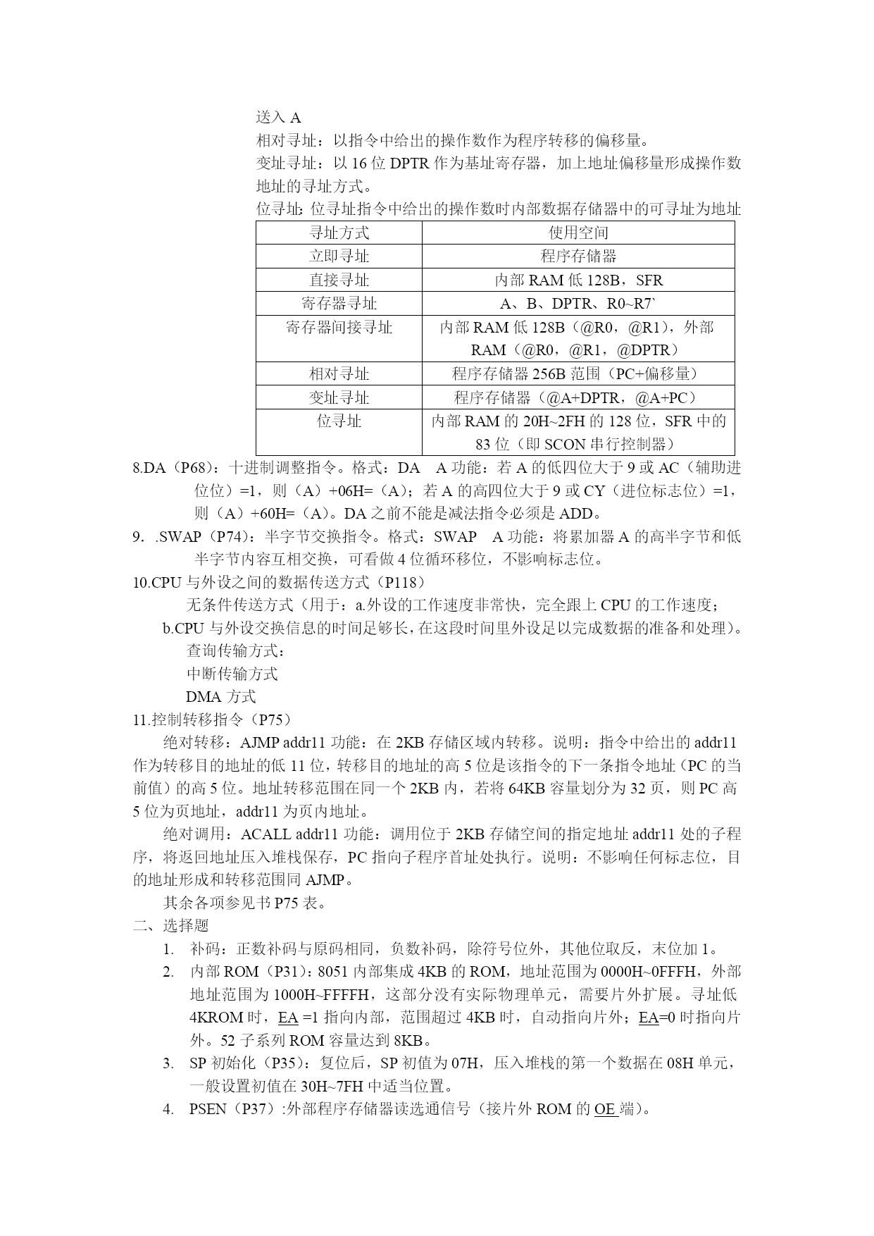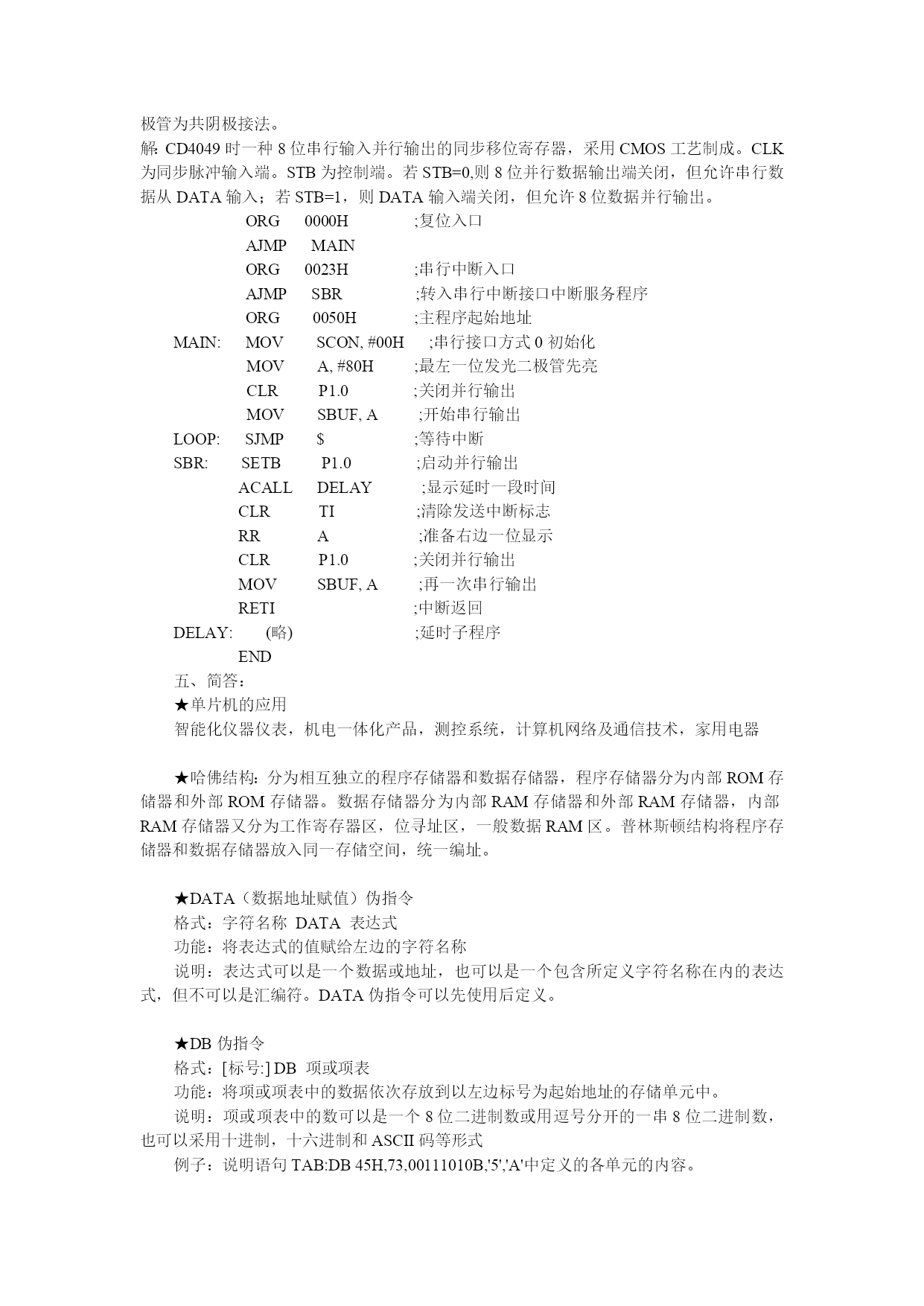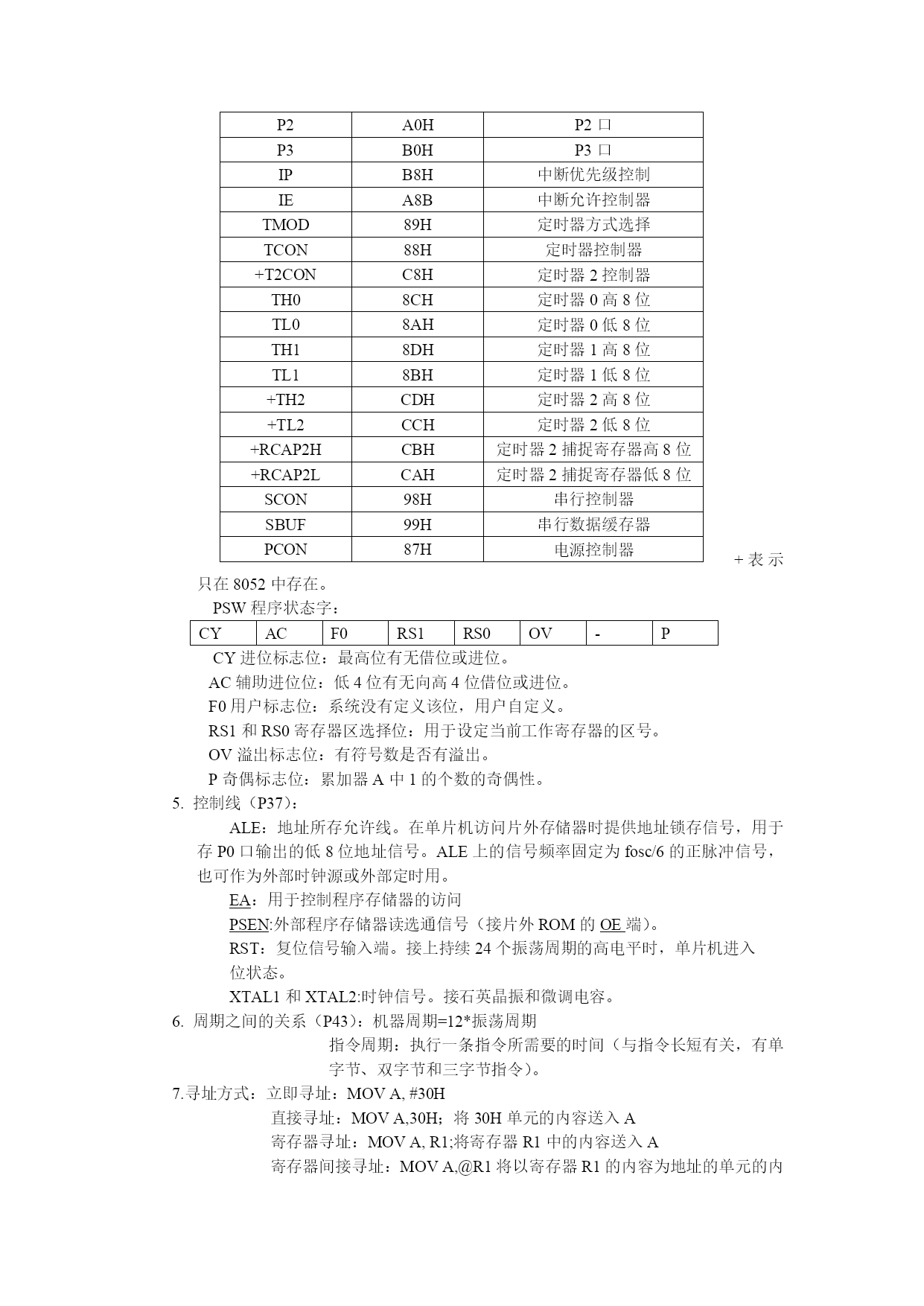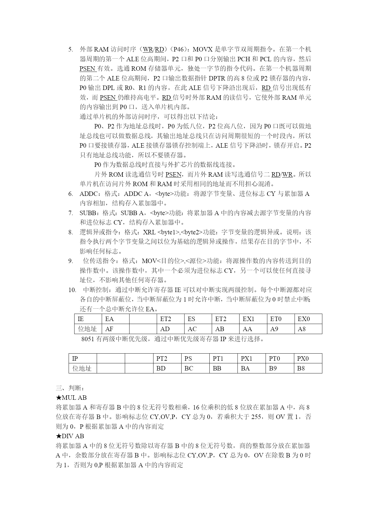 填空题单片机最小系统(P47-48):8051/8751/AT89C51等芯片内部都集成有程序存储器,构成最小系统时只需要外配时钟电路和复位电路即可。所有I/O接口都可以做为输入和输出,EA接高电平(EA=1单片机指向片内ROM超过后自动指向片外,EA=0时从0000H开始,单片机的寻址全部指向片外ROM)8031单片机内无ROM,使用最小系统时,还要外扩程序存储器。P0和P2作为片外ROM的地址总线,P0接地址锁存器提供低8位,P2提供高8位,P0还被作为数据总线使用。扩展的程序存储器的OE受单片机的程序存储器读控制信号PSEN控制。程序计数器PC(P27):它用来存放下一条指令的地址,即程序计数器的内容决定CPU将要执行哪一条命令,它是一个16位寄存器,寻址范围为64KB,它复位后的初值为0000H,没执行一条命令自动增1。中断入口(P131):中断源中断服务程序入口INT00003H定时器T0000BHINT10013H定时器T1001BH串行接口中断0023H4.内部RAM(P31):8051内部集成256个RAM,分成两个部分(低128位和高128位)A、低128位:(1)、工作寄存器区(00H~1FH):共32个单元,分成4各区域0区、1区、2区、3区;没区分成R0到R7共8个单元。通过PSW中的RS0和RS1选择。(2)、位寻址区(20H~2FH)16单元对应128位。既可以对整个单元进行操作,又可以对某个单元中的1位进行操作。位寻址区中的128个位拥有各自的地址,从20H单元(每个单元8位)最低位00H到2FH单元最高位7FH。(3)、用户RAM区(30H~7FH):这部分操作只能以一个单元为整体进行字节操作。存放参与运算的数据、运算的结果和与外设交换的数据等。B、高128位:特殊功能寄存器SFR:符号物理地址名称ACCE0H累加器BF0HB寄存器PSWD0H程序状态字SP81H堆栈指针DPL82H数据寄存器指针DPH83H数据寄存器指针P080HP0口P190HP1口P2A0HP2口P3B0HP3口IPB8H中断优先级控制IEA8B中断允许控制器TMOD89H定时器方式选择TCON88H定时器控制器+T2CONC8H定时器2控制器TH08CH定时器0高8位TL08AH定时器0低8位TH18DH定时器1高8位TL18BH定时器1低8位+TH2CDH定时器2高8位+TL2CCH定时器2低8位+RCAP2HCBH定时器2捕捉寄存器高8位+RCAP2LCAH定时器2捕捉寄存器低8位SCON98H串行控制器SBUF99H串行数据缓存器PCON87H电源控制器+表示只在8052中存在。PSW程序状态字:CYACF0RS1RS0OV-PCY进位标志位:最高位有无借位或进位。AC辅助进位位:低4位有无向高4位借位或进位。F0用户标志位:系统没有定义该位,用户自定义。RS1和RS0寄存器区选择位:用于设定当前工作寄存器的区号。OV溢出标志位:有符号数是否有溢出。P奇偶标志位:累加器A中1的个数的奇偶性。5.控制线(P37):ALE:地址所存允许线。在单片机访问片外存储器时提供地址锁存信号,用于存P0口输出的低8位地址信号。ALE上的信号频率固定为fosc/6的正脉冲信号,也可作为外部时钟源或外部定时用。EA:用于控制程序存储器的访问PSEN:外部程序存储器读选通信号(接片外ROM的OE端)。RST:复位信号输入端。接上持续24个振荡周期的高电平时,单片机进入位状态。XTAL1和XTAL2:时钟信号。接石英晶振和微调电容。6.周期之间的关系(P43):机器周期=12*振荡周期指令周期:执行一条指令所需要的时间(与指令长短有关,有单字节、双字节和三字节指令)。7.寻址方式:立即寻址:MOVA,#30H直接寻址:MOVA,30H;将30H单元的内容送入A寄存器寻址:MOVA,R1;将寄存器R1中的内容送入A寄存器间接寻址:MOVA,@R1将以寄存器R1的内容为地址的单元的内送入A相对寻址:以指令中给出的操作数作为程序转移的偏移量。变址寻址:以16位DPTR作为基址寄存器,加上地址偏移量形成操作数地址的寻址方式。位寻址:位寻址指令中给出的操作数时内部数据存储器中的可寻址为地址寻址方式使用空间立即寻址程序存储器直接寻址内部RAM低128B,SFR寄存器寻址A、B、DPTR、R0~R7`寄存器间接寻址内部RAM低128B(@R0,@R1),外部RAM(@R0,@R1,@DPTR)相对寻址程序存储器256B范围(PC+偏移量)变址