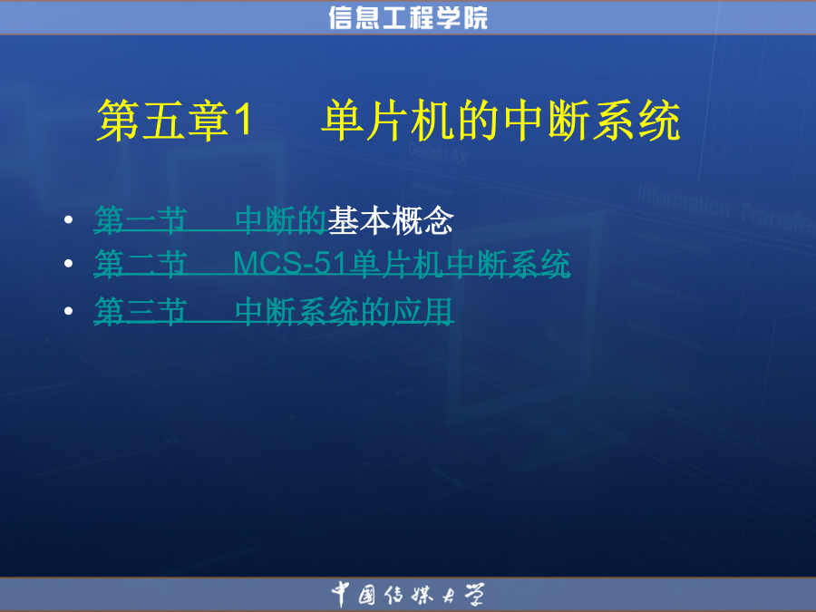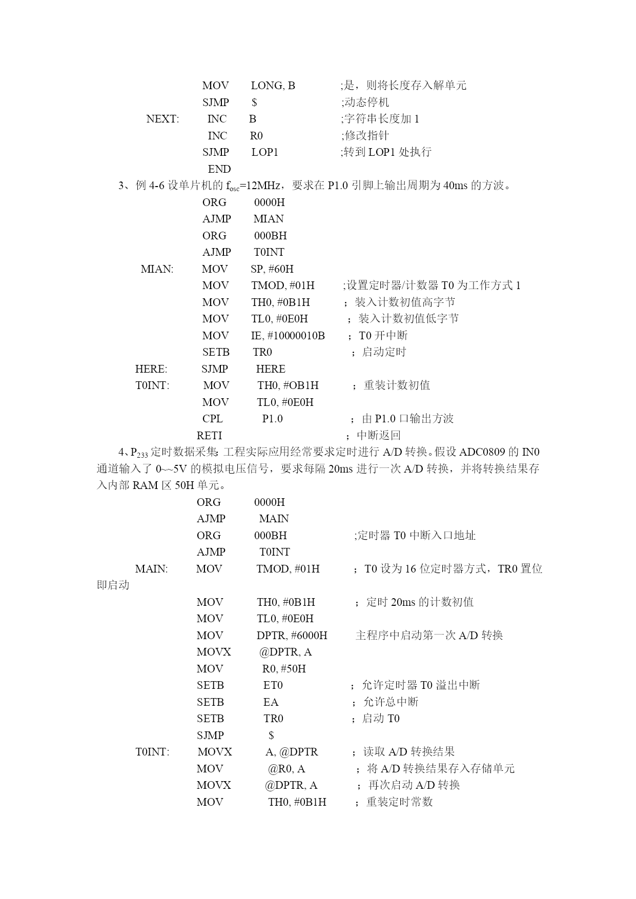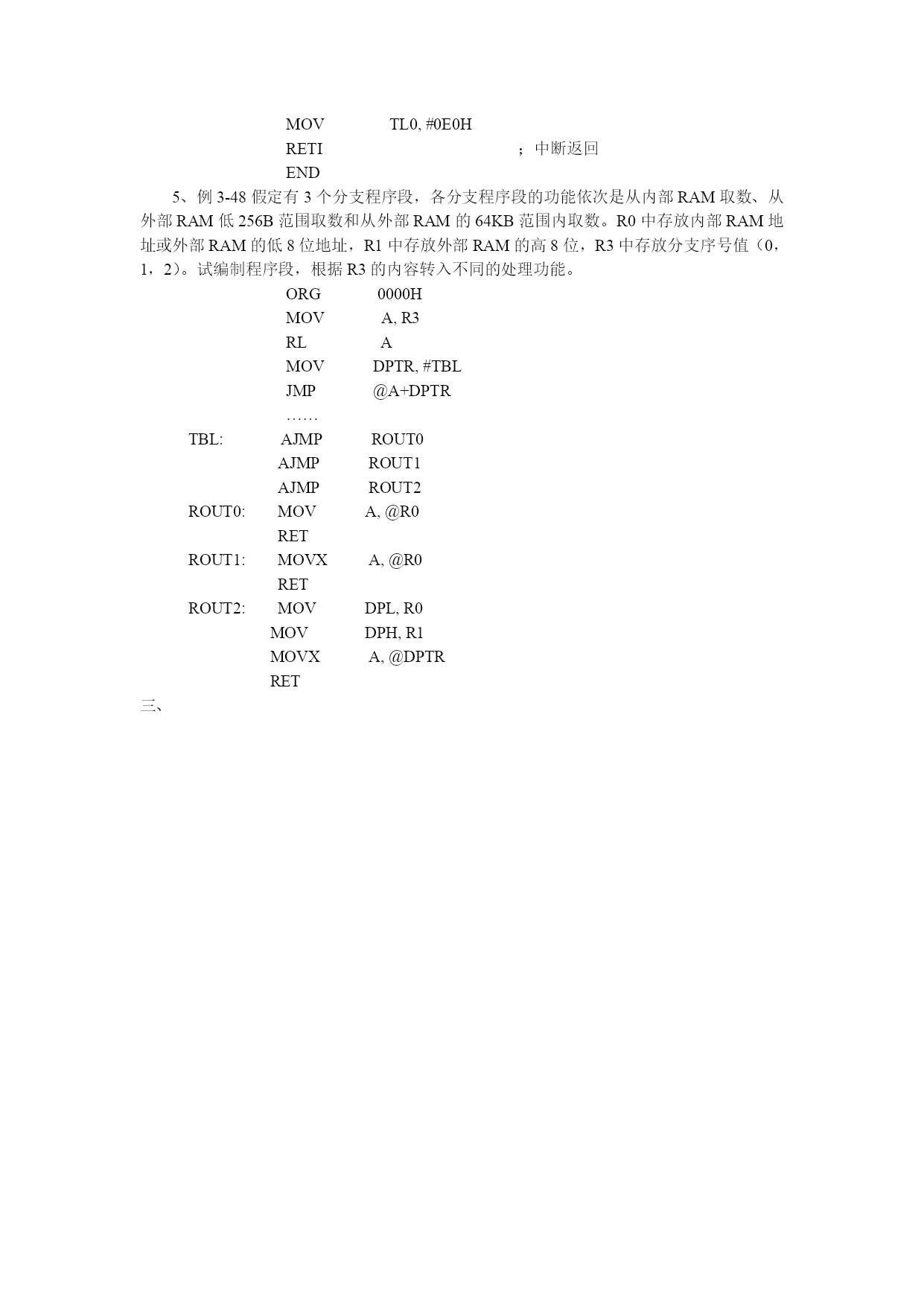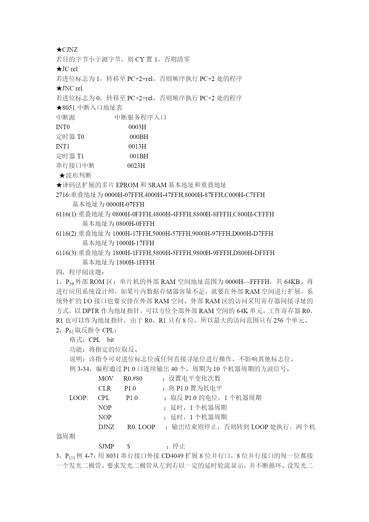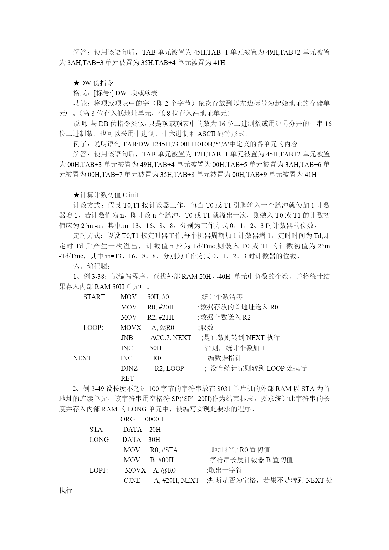 填空题单片机最小系统(P47-48):8051/8751/AT89C51等芯片内部都集成有程序存储器,构成最小系统时只需要外配时钟电路和复位电路即可。所有I/O接口都可以做为输入和输出,EA接高电平(EA=1单片机指向片内ROM超过后自动指向片外,EA=0时从0000H开始,单片机的寻址全部指向片外ROM)8031单片机内无ROM,使用最小系统时,还要外扩程序存储器。P0和P2作为片外ROM的地址总线,P0接地址锁存器提供低8位,P2提供高8位,P0还被作为数据总线使用。扩展的程序存储器的OE受单片机的程序存储器读控制信号PSEN控制。程序计数器PC(P27):它用来存放下一条指令的地址,即程序计数器的内容决定CPU将要执行哪一条命令,它是一个16位寄存器,寻址范围为64KB,它复位后的初值为0000H,没执行一条命令自动增1。中断入口(P131):中断源中断服务程序入口INT00003H定时器T0000BHINT10013H定时器T1001BH串行接口中断0023H4.内部RAM(P31):8051内部集成256个RAM,分成两个部分(低128位和高128位)A、低128位:(1)、工作寄存器区(00H~1FH):共32个单元,分成4各区域0区、1区、2区、3区;没区分成R0到R7共8个单元。通过PSW中的RS0和RS1选择。(2)、位寻址区(20H~2FH)16单元对应128位。既可以对整个单元进行操作,又可以对某个单元中的1位进行操作。位寻址区中的128个位拥有各自的地址,从20H单元(每个单元8位)最低位00H到2FH单元最高位7FH。(3)、用户RAM区(30H~7FH):这部分操作只能以一个单元为整体进行字节操作。存放参与运算的数据、运算的结果和与外设交换的数据等。B、高128位:特殊功能寄存器SFR:符号物理地址名称ACCE0H累加器BF0HB寄存器PSWD0H程序状态字SP81H堆栈指针DPL82H数据寄存器指针DPH83H数据寄存器指针P080HP0口P190HP1口P2A0HP2口P3B0HP3口IPB8H中断优先级控制IEA8B中断允许控制器TMOD89H定时器方式选择TCON88H定时器控制器+T2CONC8H定时器2控制器TH08CH定时器0高8位TL08AH定时器0低8位TH18DH定时器1高8位TL18BH定时器1低8位+TH2CDH定时器2高8位+TL2CCH定时器2低8位+RCAP2HCBH定时器2捕捉寄存器高8位+RCAP2LCAH定时器2捕捉寄存器低8位SCON98H串行控制器SBUF99H串行数据缓存器PCON87H电源控制器+表示只在8052中存在。PSW程序状态字:CYACF0RS1RS0OV-PCY进位标志位:最高位有无借位或进位。AC辅助进位位:低4位有无向高4位借位或进位。F0用户标志位:系统没有定义该位,用户自定义。RS1和RS0寄存器区选择位:用于设定当前工作寄存器的区号。OV溢出标志位:有符号数是否有溢出。P奇偶标志位:累加器A中1的个数的奇偶性。5.控制线(P37):ALE:地址所存允许线。在单片机访问片外存储器时提供地址锁存信号,用于存P0口输出的低8位地址信号。ALE上的信号频率固定为fosc/6的正脉冲信号,也可作为外部时钟源或外部定时用。EA:用于控制程序存储器的访问PSEN:外部程序存储器读选通信号(接片外ROM的OE端)。RST:复位信号输入端。接上持续24个振荡周期的高电平时,单片机进入位状态。XTAL1和XTAL2:时钟信号。接石英晶振和微调电容。6.周期之间的关系(P43):机器周期=12*振荡周期指令周期:执行一条指令所需要的时间(与指令长短有关,有单字节、双字节和三字节指令)。7.寻址方式:立即寻址:MOVA,#30H直接寻址:MOVA,30H;将30H单元的内容送入A寄存器寻址:MOVA,R1;将寄存器R1中的内容送入A寄存器间接寻址:MOVA,@R1将以寄存器R1的内容为地址的单元的内送入A相对寻址:以指令中给出的操作数作为程序转移的偏移量。变址寻址:以16位DPTR作为基址寄存器,加上地址偏移量形成操作数地址的寻址方式。位寻址:位寻址指令中给出的操作数时内部数据存储器中的可寻址为地址寻址方式使用空间立即寻址程序存储器直接寻址内部RAM低128B,SFR寄存器寻址A、B、DPTR、R0~R7`寄存器间接寻址内部RAM低128B(@R0,@R1),外部RAM(@R0,@R1,@DPTR)相对寻址程序存储器256B范围(PC+偏移量)变址