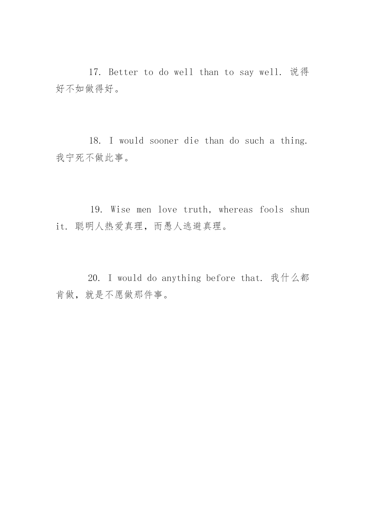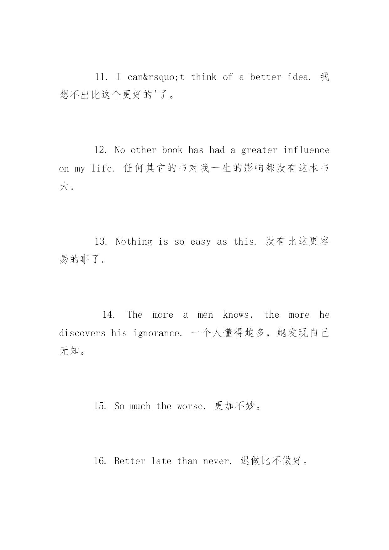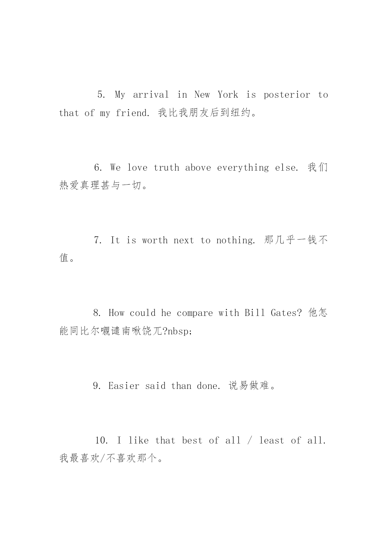托福口语考试常用句型2016年托福口语考试常用句型以下是小编整理的2016年托福口语考试中经常会用到的句型,各位1.Sheisnolessdiligentthanhereldersister.她和她姐姐一样用功。2.Oneminutetoolateisnomoreintimethanhalfanhour(is).迟到一分钟与迟到半小时同样是不准时。3.Hisstrengthissuperiortomine.他的力气比我大。4.Coloredpeoplearebynomeansinferiortowhitepeople.有色人种丝毫不比白人低劣。5.MyarrivalinNewYorkisposteriortothatofmyfriend.我比我朋友后到纽约。6.Welovetruthaboveeverythingelse.我们热爱真理甚与一切。7.Itisworthnexttonothing.那几乎一钱不值。8.HowcouldhecomparewithBillGates?他怎能同比尔嚫谴南啾饶兀?nbsp;9.Easiersaidthandone.说易做难。10.Ilikethatbestofall/leastofall.我最喜欢/不喜欢那个。11.Ican’tthinkofabetteridea.我想不出比这个更好的'了。12.Nootherbookhashadagreaterinfluenceonmylife.任何其它的书对我一生的影响都没有这本书大。13.Nothingissoeasyasthis.没有比这更容易的事了。14.Themoreamenknows,themorehediscovershisignorance.一个人懂得越多,越发现自己无知。15.Somuchtheworse.更加不妙。16.Betterlatethannever.迟做比不做好。17.Bettertodowellthantosaywell.说得好不如做得好。18.Iwouldsoonerdiethandosuchathing.我宁死不做此事。19.Wisemenlovetruth,whereasfoolsshunit.聪明人热爱真理,而愚人逃避真理。20.Iwoulddoanythingbeforethat.我什么都肯做,就是不愿做那件事。