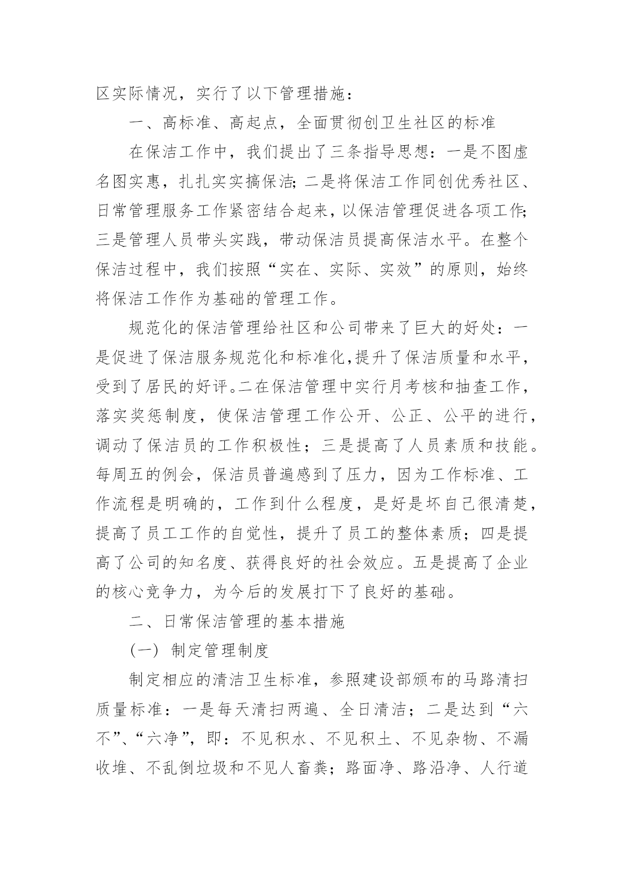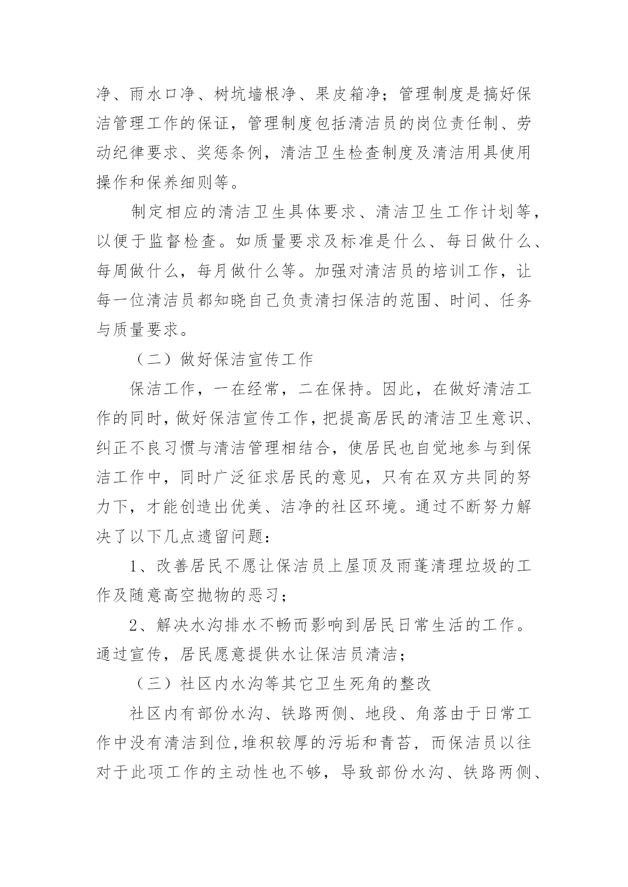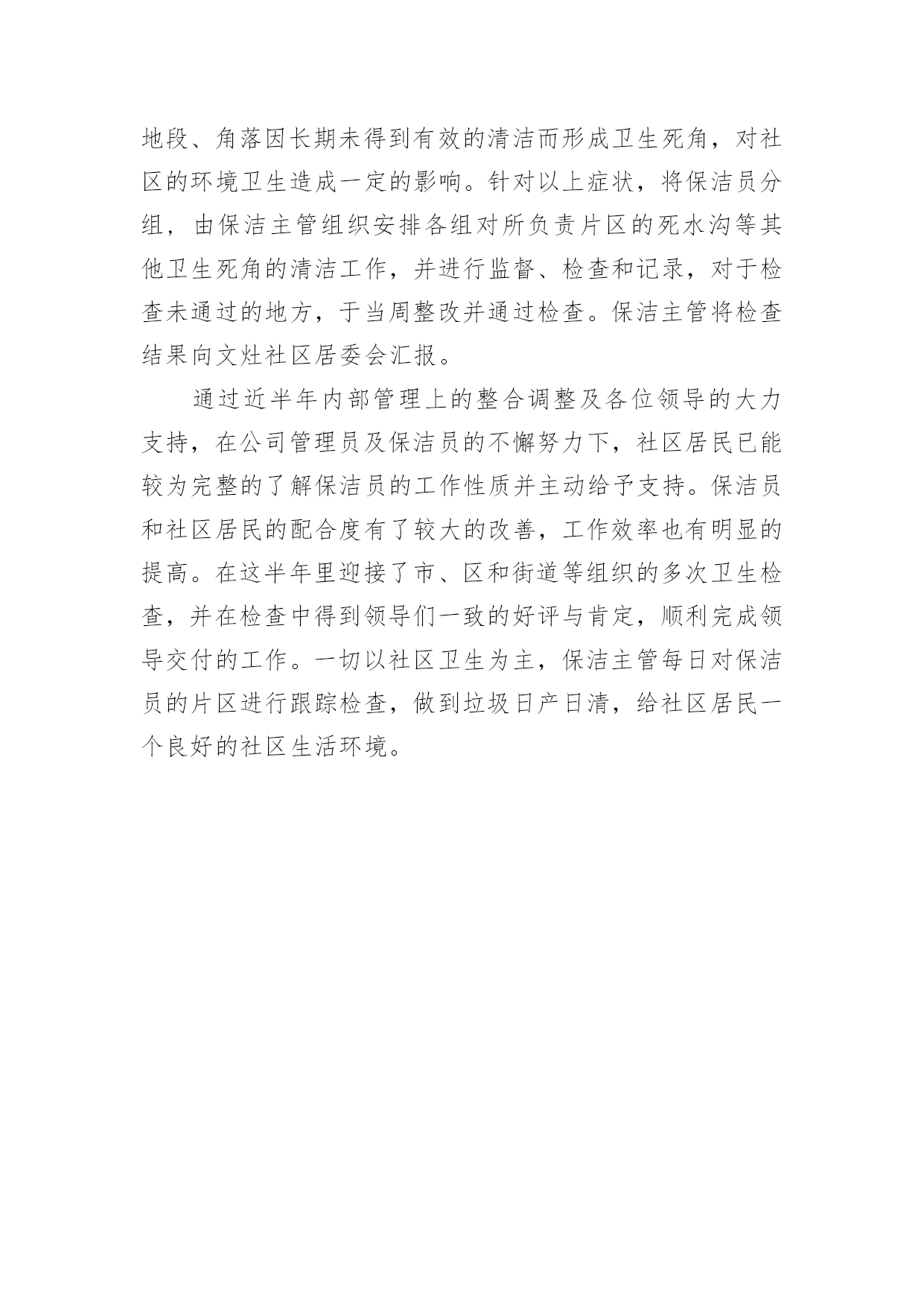 家政公司工作报告家政公司工作报告家政公司工作报告目前,在我国家政服务公司作为一个企业与社区联手,借以拓展生意的公司不在少数,而以承包社区保洁工作为起点再向家政多方位拓展的公司,在我国还是鲜见,尤其在厦门;文灶社区与敏丽家政的合作方式是一种创新,在既不增加社区费用支出的前提下,启动社区资源,由企业对保洁员进行统一管理和培训,使其规范化、标准化、科学化,增加保洁员的企业归属感和集体荣誉感,提高保洁员的工作效率和工作质量,为社区居委会省事、省心,圆满完成上级领导交付的工作,达到社区与企业双赢的结果,这是一种首创,并已起到了良好的社会效应。保洁管理是社区日常管理中一项经常性的管理服务工作,其目的是净化环境,给住、用人提供一个清洁宜人的工作、生活环境。良好的环境卫生不但可以保持社区区域容貌的整洁,而且对于减少疾病、促进身心健康十分有益。同时,对社区精神文明建设也有很重要的作用。敏丽家政自8月份正式接管文灶社区保洁工作以来,由于社区保洁管理工作的特殊性,为了顺应城市管理职能重心下移的改革方向,进一步适应社区发展的需要,提升社区环境卫生及市容品位,积极参与开展创卫生达标社区居委会的活动,根据新的环境卫生考评办法等有关内容,结合文灶社区实际情况,实行了以下管理措施:一、高标准、高起点,全面贯彻创卫生社区的标准在保洁工作中,我们提出了三条指导思想:一是不图虚名图实惠,扎扎实实搞保洁;二是将保洁工作同创优秀社区、日常管理服务工作紧密结合起来,以保洁管理促进各项工作;三是管理人员带头实践,带动保洁员提高保洁水平。在整个保洁过程中,我们按照“实在、实际、实效”的原则,始终将保洁工作作为基础的管理工作。规范化的保洁管理给社区和公司带来了巨大的好处:一是促进了保洁服务规范化和标准化,提升了保洁质量和水平,受到了居民的好评。二在保洁管理中实行月考核和抽查工作,落实奖惩制度,使保洁管理工作公开、公正、公平的进行,调动了保洁员的工作积极性;三是提高了人员素质和技能。每周五的例会,保洁员普遍感到了压力,因为工作标准、工作流程是明确的,工作到什么程度,是好是坏自己很清楚,提高了员工工作的自觉性,提升了员工的整体素质;四是提高了公司的知名度、获得良好的社会效应。五是提高了企业的核心竞争力,为今后的发展打下了良好的基础。二、日常保洁管理的基本措施(一)制定管理制度制定相应的清洁卫生标准,参照建设部颁布的马路清扫质量标准:一是每天清扫两遍、全日清洁;二是达到“六不”、“六净”,即:不见积水、不见积土、不见杂物、不漏收堆、不乱倒垃圾和不见人畜粪;路面净、路沿净、人行道净、雨水口净、树坑墙根净、果皮箱净;管理制度是搞好保洁管理工作的保证,管理制度包括清洁员的岗位责任制、劳动纪律要求、奖惩条例,清洁卫生检查制度及清洁用具使用操作和保养细则等。制定相应的清洁卫生具体要求、清洁卫生工作计划等,以便于监督检查。如质量要求及标准是什么、每日做什么、每周做什么,每月做什么等。加强对清洁员的培训工作,让每一位清洁员都知晓自己负责清扫保洁的范围、时间、任务与质量要求。(二)做好保洁宣传工作保洁工作,一在经常,二在保持。因此,在做好清洁工作的同时,做好保洁宣传工作,把提高居民的清洁卫生意识、纠正不良习惯与清洁管理相结合,使居民也自觉地参与到保洁工作中,同时广泛征求居民的意见,只有在双方共同的努力下,才能创造出优美、洁净的社区环境。通过不断努力解决了以下几点遗留问题:1、改善居民不愿让保洁员上屋顶及雨蓬清理垃圾的工作及随意高空抛物的恶习;2、解决水沟排水不畅而影响到居民日常生活的工作。通过宣传,居民愿意提供水让保洁员清洁;(三)社区内水沟等其它卫生死角的整改社区内有部份水沟、铁路两侧、地段、角落由于日常工作中没有清洁到位,堆积较厚的污垢和青苔,而保洁员以往对于此项工作的主动性也不够,导致部份水沟、铁路两侧、地段、角落因长期未得到有效的清洁而形成卫生死角,对社区的环境卫生造成一定的影响。针对以上症状,将保洁员分组,由保洁主管组织安排各组对所负责片区的死水沟等其他卫生死角的清洁工作,并进行监督、检查和记录,对于检查未通过的地方,于当周整改并通过检查。保洁主管将检查结果向文灶社区居委会汇报。通过近半年内部管理上的整合调整及各位领导的大力支持,在公司管理员及保洁员的不懈努力下,社区居民已能较为完整的了解保洁员的工作性质并主动给予支持。保洁员和社区居民的配合度有了较大的改善,工作效率也有明显的提高。在这半年里迎接了市、区和街道等组织的多次卫生检查,并在检查中得到领导们一致的好评与肯定,顺利完成领导交付的工作。一切以社区卫生为主,保洁主管每日对保洁员的片区进行跟踪检查,做到垃圾日产日清,给社区居民一个良好的社区生活环境。