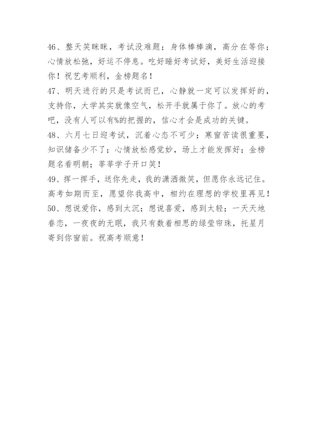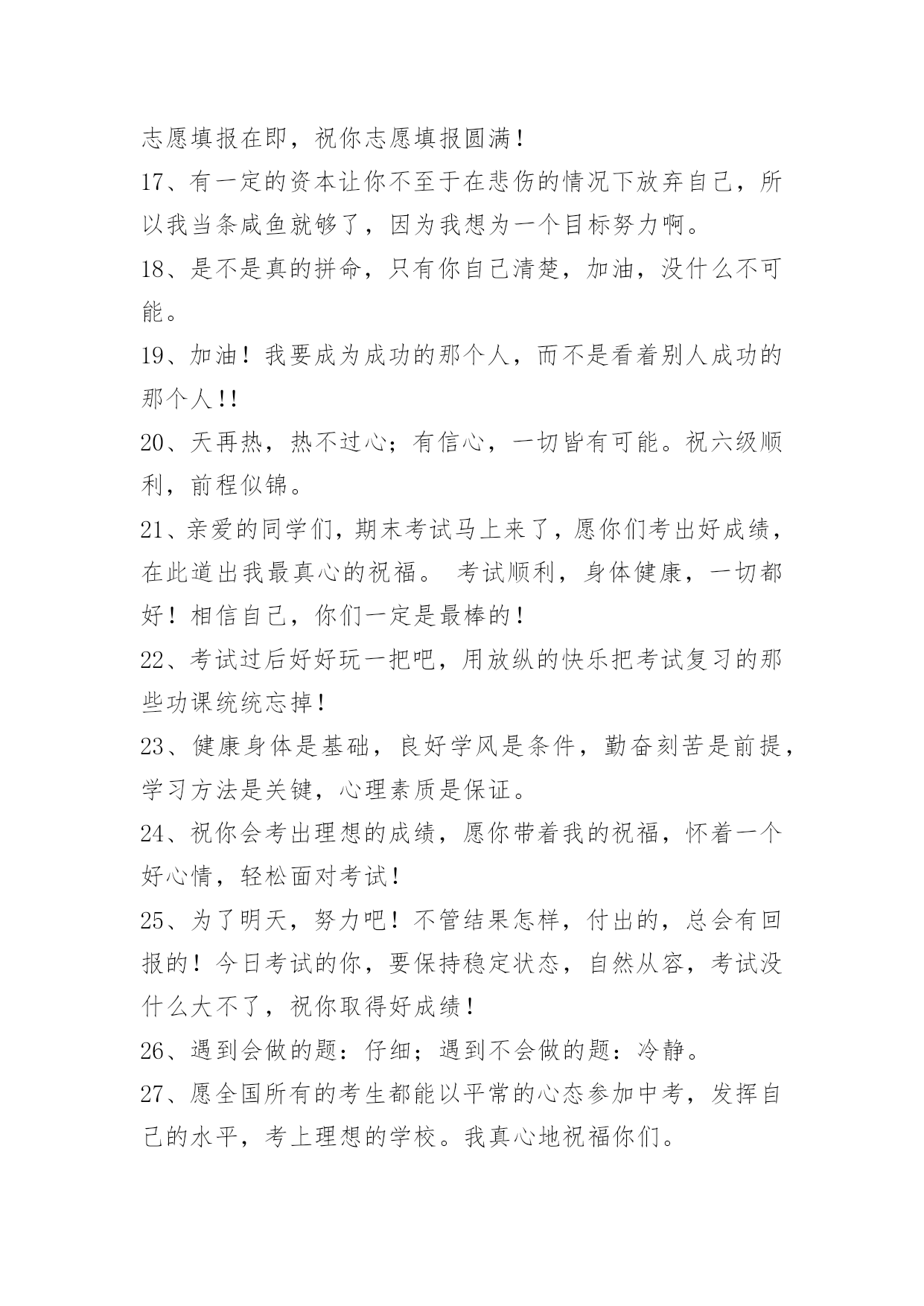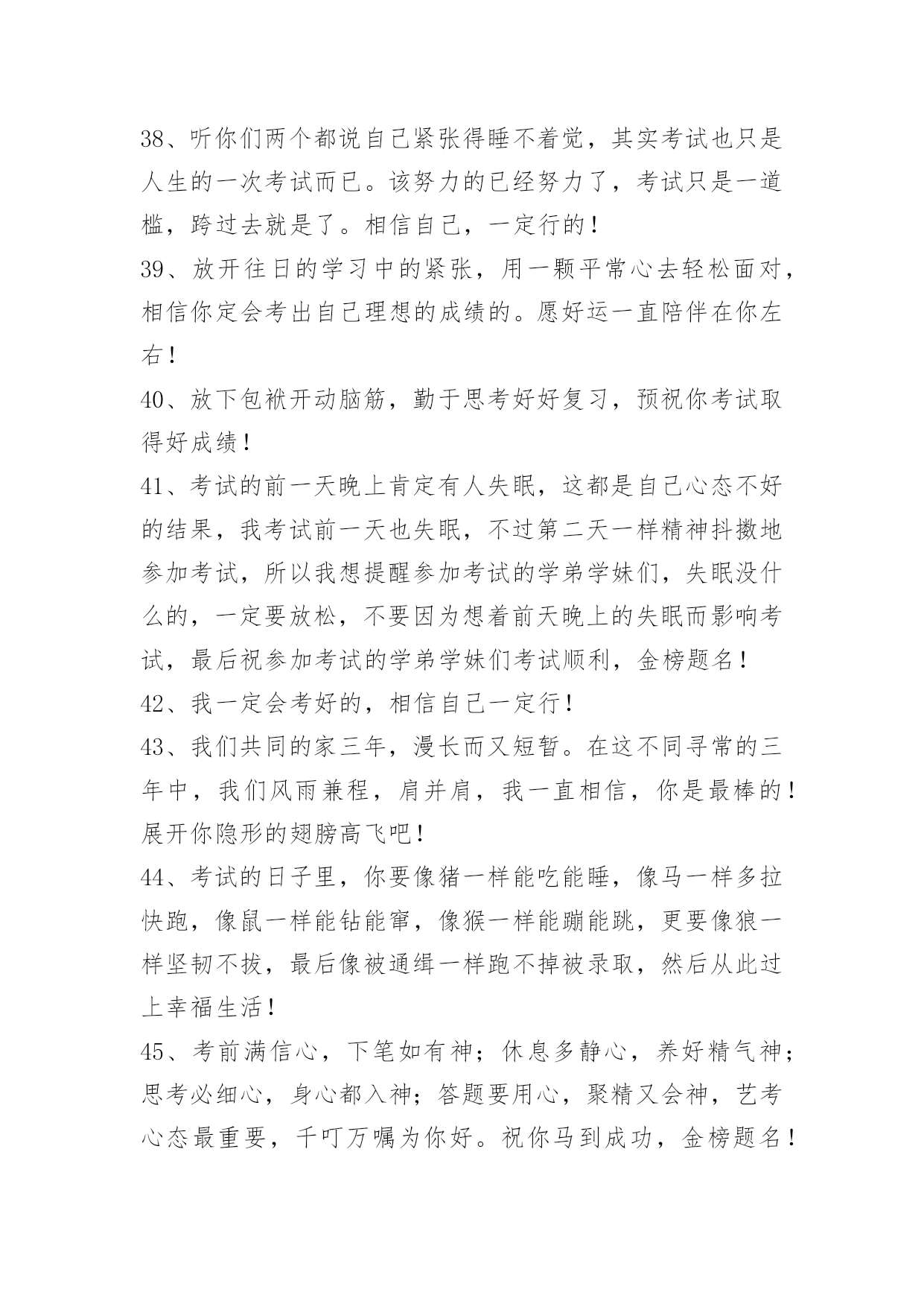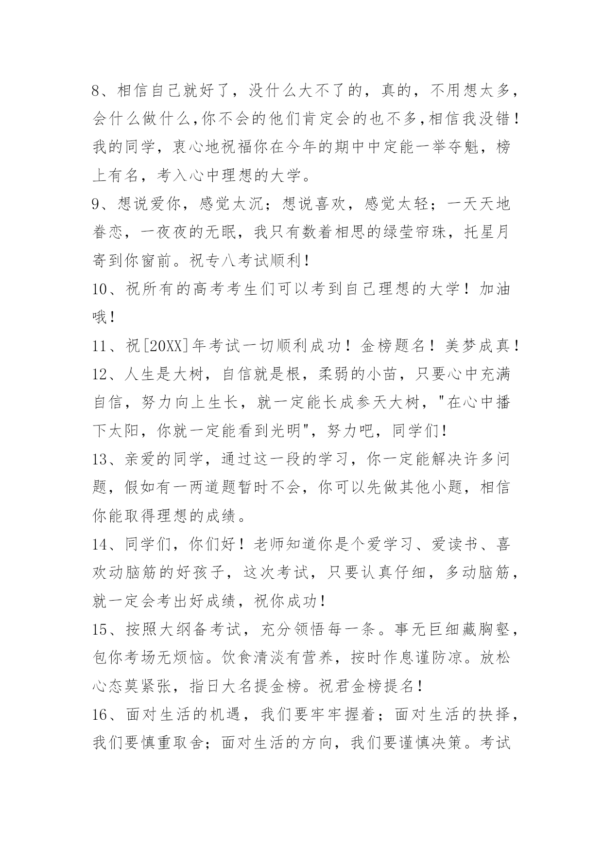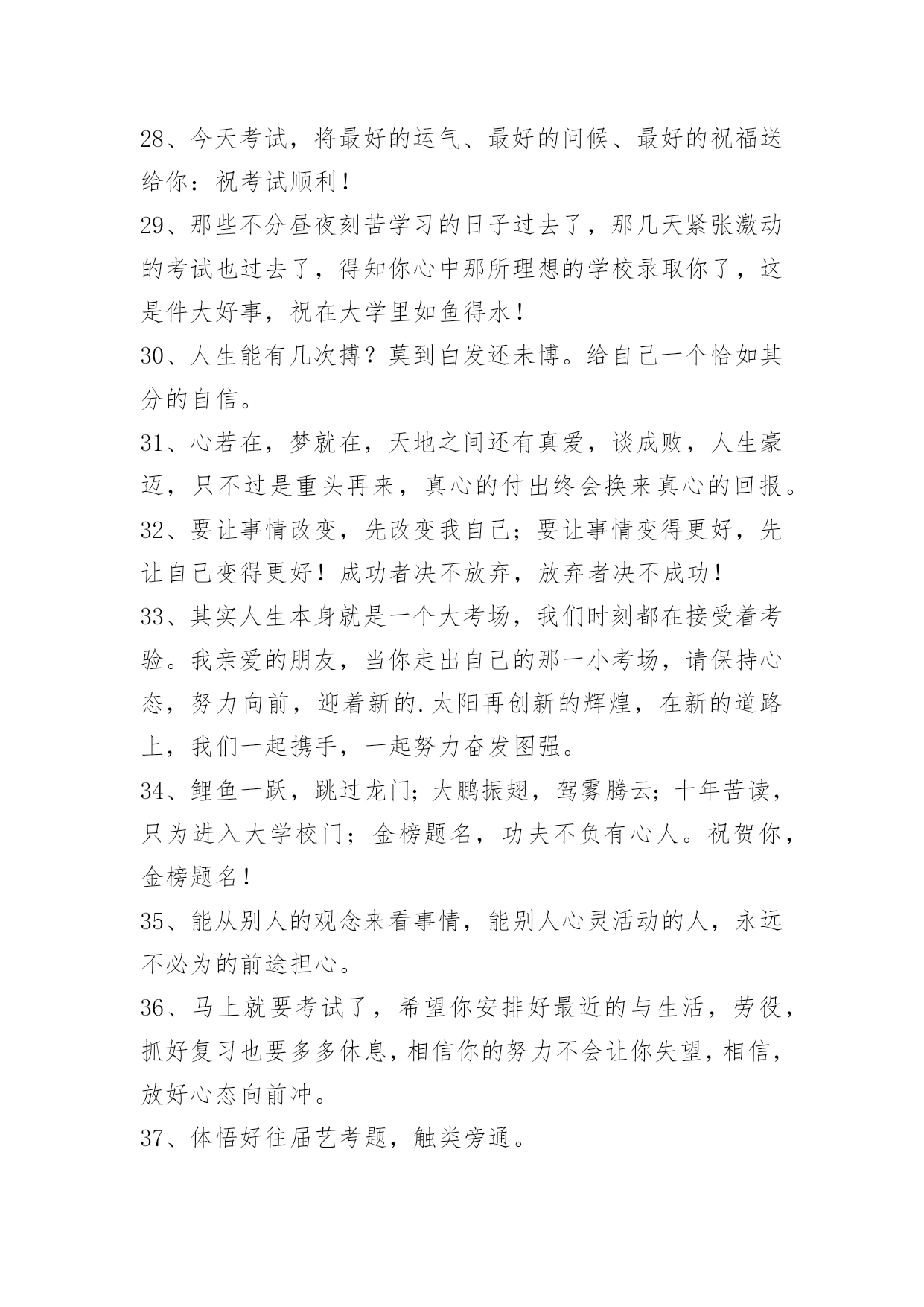 考试顺利祝福语关于考试顺利祝福语(通用50句)证券考试没有什么大不了的,我能做得出的题目别人不一定能做出来,我做不出的题目别人同样做不出,我所做的就是对的,我就是最棒的!下文是小编为你整理的一些考试顺利祝福语,欢迎大家阅读,希望对大家有所帮助。1、千淘万漉虽辛苦,吹尽狂沙始到金。寒窗苦读终不悔,高考之后梦成真。为了我们的梦想,我们愿意历尽千辛万苦,我们愿意每天闻鸡起舞。祝你考试顺利,梦圆今朝!2、十年寒窗苦,只为那刻甜!今日考试,为未来努力,憧憬着,想着未来的阳光,未来的欢笑,亲人的期望,这几天再苦,也没什么。期盼你顺利通过考试哟!3、愿全国所有的考生都能以平常的心态参加四级考试,发挥自己的水平,考上理想的学校。我真心地祝福你们。4、四级考试没有什么大不了的,我能做得出的题目别人不一定能做出来,我做不出的题目别人同样做不出,我所做的就是对的,我就是最棒的!5、愿全国所有的考生都能以平常的心态参加期末考试,发挥自己的水平,考上理想的学校。我真心地祝福你们。6、愿你今年考上心中的大学。考试顺利!7、考试加油!亲爱的朋友,平和一下自己的心态,控制自己的情绪,以平常心态应考,考完一门忘一门,让自己尽量放松,好好休息。希望你一举高中喔!8、相信自己就好了,没什么大不了的,真的,不用想太多,会什么做什么,你不会的他们肯定会的也不多,相信我没错!我的同学,衷心地祝福你在今年的期中中定能一举夺魁,榜上有名,考入心中理想的大学。9、想说爱你,感觉太沉;想说喜欢,感觉太轻;一天天地眷恋,一夜夜的无眠,我只有数着相思的绿莹帘珠,托星月寄到你窗前。祝专八考试顺利!10、祝所有的高考考生们可以考到自己理想的大学!加油哦!11、祝[20XX]年考试一切顺利成功!金榜题名!美梦成真!12、人生是大树,自信就是根,柔弱的小苗,只要心中充满自信,努力向上生长,就一定能长成参天大树,"在心中播下太阳,你就一定能看到光明",努力吧,同学们!13、亲爱的同学,通过这一段的学习,你一定能解决许多问题,假如有一两道题暂时不会,你可以先做其他小题,相信你能取得理想的成绩。14、同学们,你们好!老师知道你是个爱学习、爱读书、喜欢动脑筋的好孩子,这次考试,只要认真仔细,多动脑筋,就一定会考出好成绩,祝你成功!15、按照大纲备考试,充分领悟每一条。事无巨细藏胸壑,包你考场无烦恼。饮食清淡有营养,按时作息谨防凉。放松心态莫紧张,指日大名提金榜。祝君金榜提名!16、面对生活的机遇,我们要牢牢握着;面对生活的抉择,我们要慎重取舍;面对生活的方向,我们要谨慎决策。考试志愿填报在即,祝你志愿填报圆满!17、有一定的资本让你不至于在悲伤的情况下放弃自己,所以我当条咸鱼就够了,因为我想为一个目标努力啊。18、是不是真的拼命,只有你自己清楚,加油,没什么不可能。19、加油!我要成为成功的那个人,而不是看着别人成功的那个人!!20、天再热,热不过心;有信心,一切皆有可能。祝六级顺利,前程似锦。21、亲爱的同学们,期末考试马上来了,愿你们考出好成绩,在此道出我最真心的祝福。考试顺利,身体健康,一切都好!相信自己,你们一定是最棒的!22、考试过后好好玩一把吧,用放纵的快乐把考试复习的那些功课统统忘掉!23、健康身体是基础,良好学风是条件,勤奋刻苦是前提,学习方法是关键,心理素质是保证。24、祝你会考出理想的成绩,愿你带着我的祝福,怀着一个好心情,轻松面对考试!25、为了明天,努力吧!不管结果怎样,付出的,总会有回报的!今日考试的你,要保持稳定状态,自然从容,考试没什么大不了,祝你取得好成绩!26、遇到会做的题:仔细;遇到不会做的题:冷静。27、愿全国所有的考生都能以平常的心态参加中考,发挥自己的水平,考上理想的学校。我真心地祝福你们。28、今天考试,将最好的运气、最好的问候、最好的祝福送给你:祝考试顺利!29、那些不分昼夜刻苦学习的日子过去了,那几天紧张激动的考试也过去了,得知你心中那所理想的学校录取你了,这是件大好事,祝在大学里如鱼得水!30、人生能有几次搏?莫到白发还未博。给自己一个恰如其分的自信。31、心若在,梦就在,天地之间还有真爱,谈成败,人生豪迈,只不过是重头再来,真心的付出终会换来真心的回报。32、要让事情改变,先改变我自己;要让事情变得更好,先让自己变得更好!成功者决不放弃,放弃者决不成功!33、其实人生本身就是一个大考场,我们时刻都在接受着考验。我亲爱的朋友,当你走出自己的那一小考场,请保持心态,努力向前,迎着新的.太阳再创新的辉煌,在新的道路上,我们一起携手,一起努力奋发图强。34、鲤鱼一跃,跳过龙门;大鹏振翅,驾雾腾云;十年苦读,只为进入大学校门;金榜题名,功夫不负有心人。祝贺你,金榜题名!35、能从别人的观念来看事情,能别人心灵活动的人,永远不必为的前途担心。36、马上就