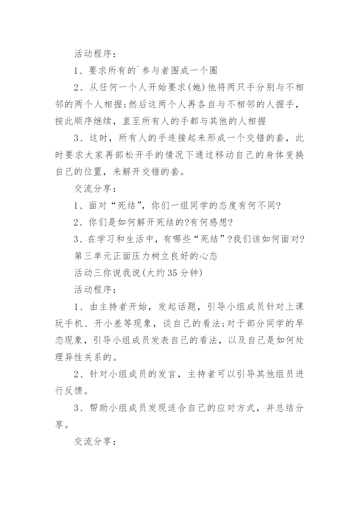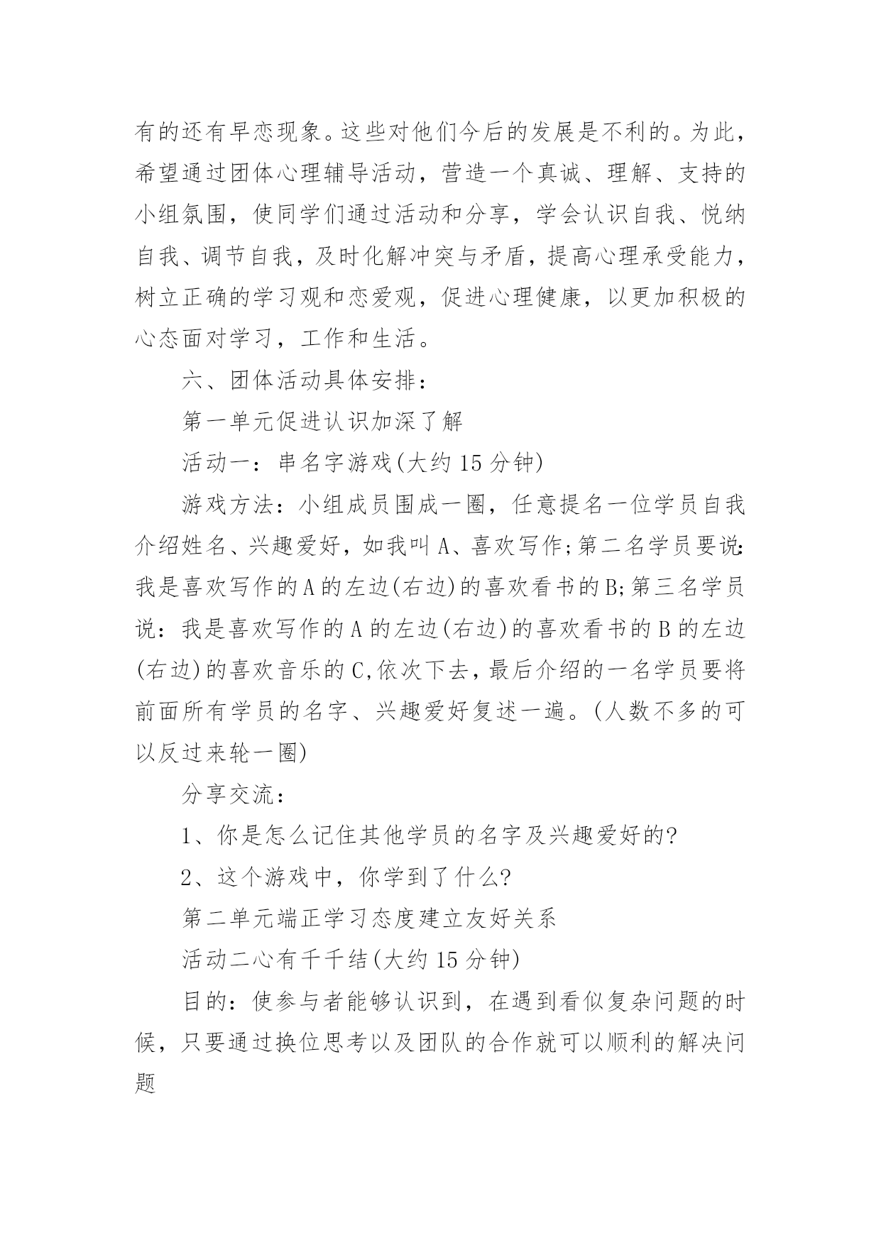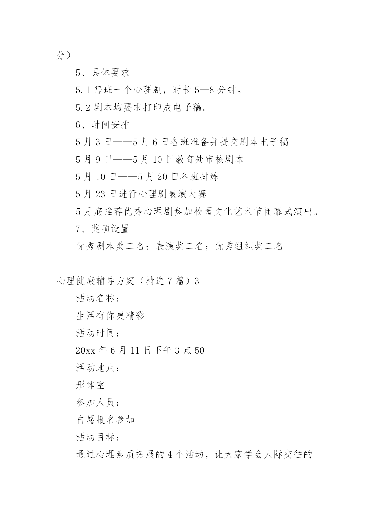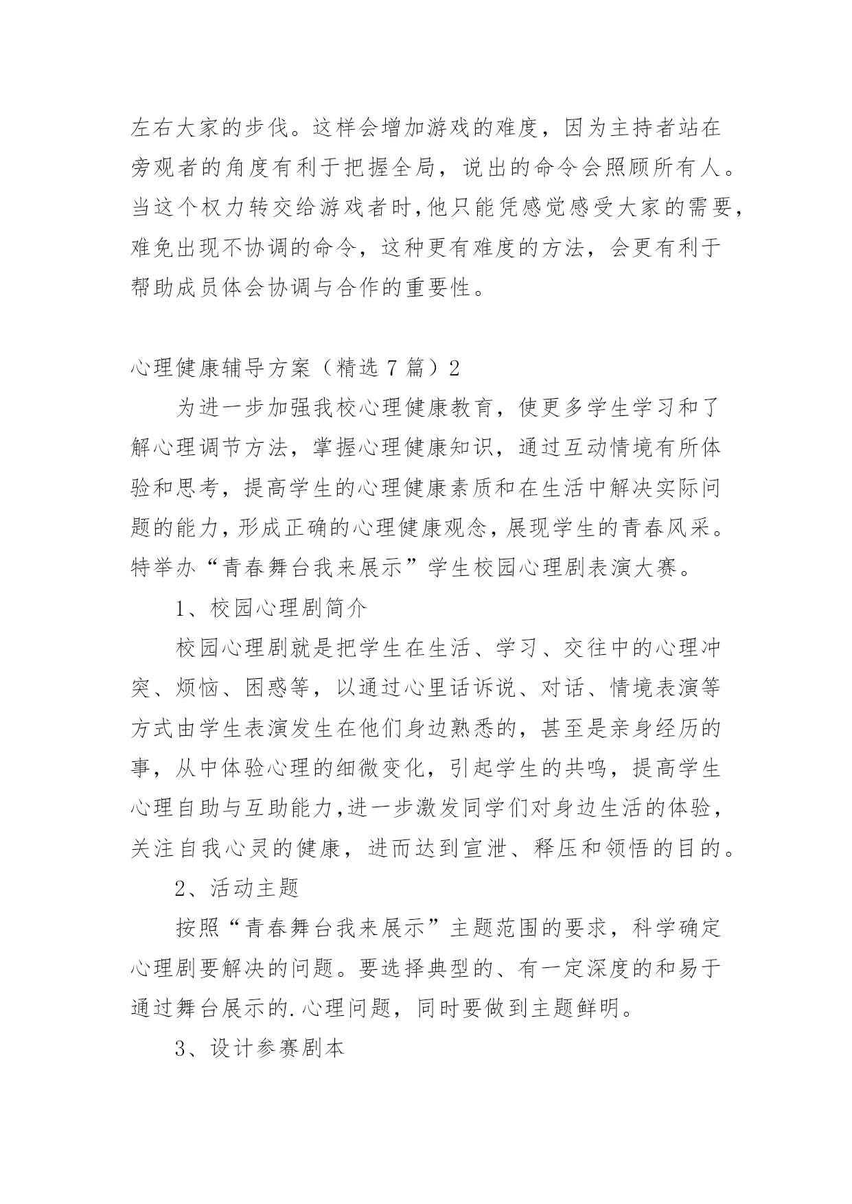 心理健康辅导方案心理健康辅导方案(精选7篇)为了确保事情或工作有序有力开展,就常常需要事先准备方案,方案是为某一行动所制定的具体行动实施办法细则、步骤和安排等。那要怎么制定科学的方案呢?以下是小编帮大家整理的心理健康辅导方案(精选7篇),希望对大家有所帮助。心理健康辅导方案(精选7篇)1一、团体方案名称:良好课堂,友好关系——我可以二、团体规模由7—9人一小组、9个小组组成三、参加对象xx附中初三班全体同学,xx师院xx心理学部分学生四、活动时间:20xx年12月2日下午4:00——5:30活动地点:xx附中校内(具体待定)五、团体整体目标不管在生活上还是学习上,初三学生都有着不同程度的问题和压力,特别是中考临近,初三学生的精神压力大。我们发现,部分学生还存在上课不用心听讲,注意力不集中,有的还有早恋现象。这些对他们今后的发展是不利的。为此,希望通过团体心理辅导活动,营造一个真诚、理解、支持的小组氛围,使同学们通过活动和分享,学会认识自我、悦纳自我、调节自我,及时化解冲突与矛盾,提高心理承受能力,树立正确的学习观和恋爱观,促进心理健康,以更加积极的心态面对学习,工作和生活。六、团体活动具体安排:第一单元促进认识加深了解活动一:串名字游戏(大约15分钟)游戏方法:小组成员围成一圈,任意提名一位学员自我介绍姓名、兴趣爱好,如我叫A、喜欢写作;第二名学员要说:我是喜欢写作的A的左边(右边)的喜欢看书的B;第三名学员说:我是喜欢写作的A的左边(右边)的喜欢看书的B的左边(右边)的喜欢音乐的C,依次下去,最后介绍的一名学员要将前面所有学员的名字、兴趣爱好复述一遍。(人数不多的可以反过来轮一圈)分享交流:1、你是怎么记住其他学员的名字及兴趣爱好的?2、这个游戏中,你学到了什么?第二单元端正学习态度建立友好关系活动二心有千千结(大约15分钟)目的:使参与者能够认识到,在遇到看似复杂问题的时候,只要通过换位思考以及团队的合作就可以顺利的解决问题活动程序:1、要求所有的`参与者围成一个圈2、从任何一个人开始要求(她)他将两只手分别与不相邻的两个人相握;然后这两个人再各自与不相邻的人握手,按此顺序继续,直至所有人的手都与其他的人相握3、这时,所有人的手连接起来形成一个交错的套,此时要求大家再部松开手的情况下通过移动自己的身体变换自己的位置,来解开交错的套。交流分享:1、面对“死结”,你们一组同学的态度有何不同?2、你们是如何解开死结的?有何感想?3、在学习和生活中,有哪些“死结”?我们该如何面对?第三单元正面压力树立良好的心态活动三你说我说(大约35分钟)活动程序:1、由主持者开始,发起话题,引导小组成员针对上课玩手机、开小差等现象,谈自己的看法;对于部分同学的早恋现象,引导小组成员发表自己的看法,以及自己是如何处理异性关系的。2、针对小组成员的发言,主持者可以引导其他组员进行反馈。3、帮助小组成员发现适合自己的应对方式,并总结分享。交流分享:1、从交流中你感悟到了什么?2、谈谈你可以有什么改进的地方?第四单元舒缓压力以自信饱满的心去迎接未来活动四放松——兔子舞活动顺序:1、让小组成员站成一列纵队,要求后面的成员双手搭在前面成员的双肩上。2、主持人站在一边为他们发号施令:如左脚跳两下,右脚跳两下,双腿合并向前跳一下,向后跳一下,再连续向前跳两下全体成员听从统一口令,全神贯注的作出统一动作。3、伴随着音乐,全体成员共同跳兔子舞,体验放松操放松的感觉。交流分享:1、在玩的过程中,什么时候会出现步调不一致?为什么会出现这种情况?2、当出现步调不一致时,你们的心理感觉如何?游戏后是否感觉放松?xx注意事项:1、除了主持人需要技巧外,参加者也需要加入很大的注意力,不仅注意倾听主持者的命令,还要注意前后同伴的动作,免得踩到别人的脚。这是一个很重要的问题,一个人的不专心很可能影响到他前后几个人的情绪,甚至扰乱他们的步伐。因此,作为主持者,发现这种情况时,要及时用幽默的语言提醒那个走神的人,以保持整个团队的游戏效果。2、游戏一开始的时候是可以由主持者发号施令,随着游戏的推进,主持者可以将这个权力交给某个游戏者,让他左右大家的步伐。这样会增加游戏的难度,因为主持者站在旁观者的角度有利于把握全局,说出的命令会照顾所有人。当这个权力转交给游戏者时,他只能凭感觉感受大家的需要,难免出现不协调的命令,这种更有难度的方法,会更有利于帮助成员体会协调与合作的重要性。心理健康辅导方案(精选7篇)2为进一步加强我校心理健康教育,使更多学生学习和了解心理调节方法,掌握心理健康知识,通过互动情境有所体验和思考,提高学生的心理健康素质和在生活中解决实际问题的能力,形成正确的心理健康观念,展现学生的青春风采。特举办“青春舞台我来展示”学生校园心理剧表演大赛。1、校园心理剧简介校园心理