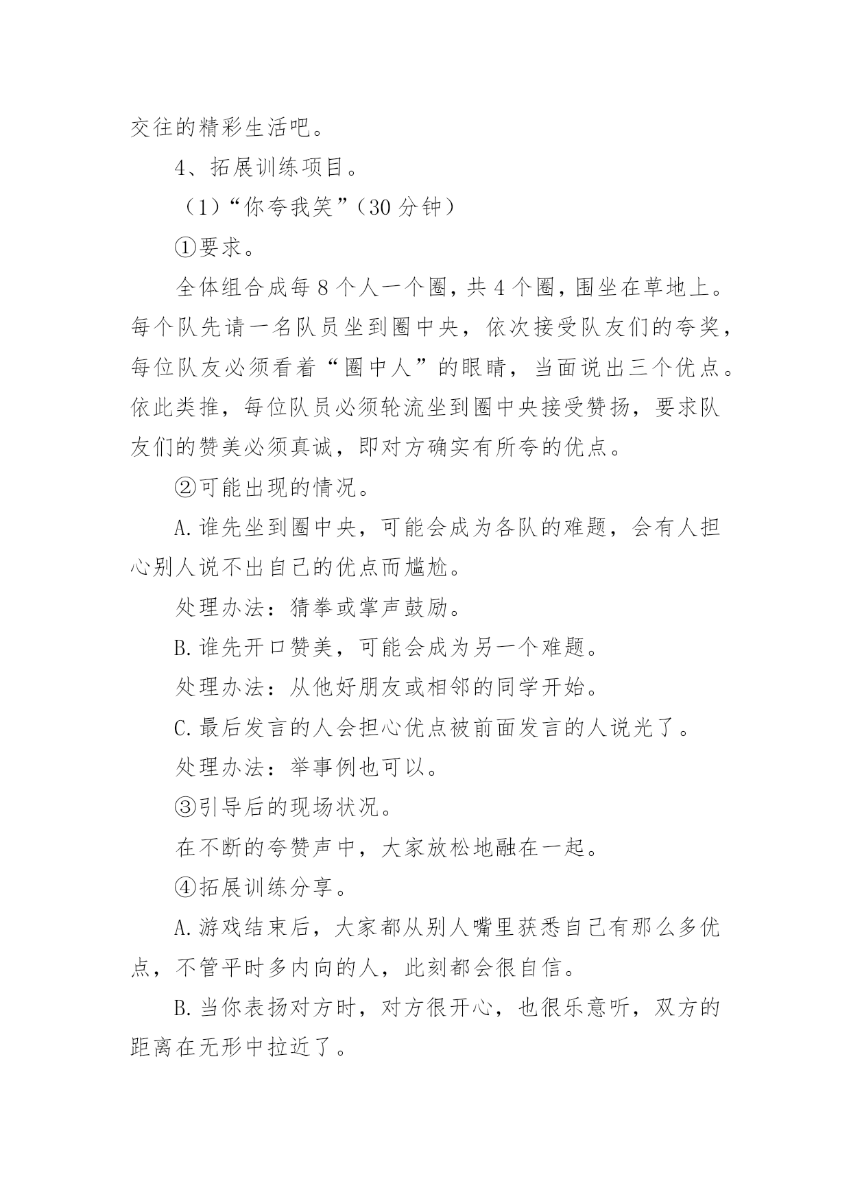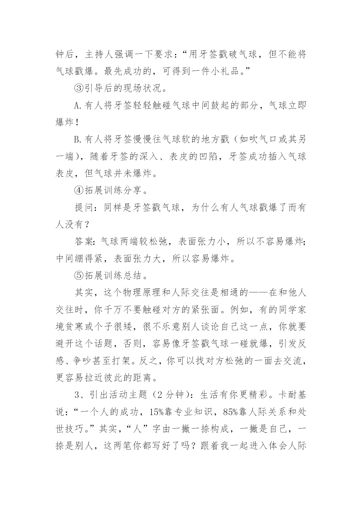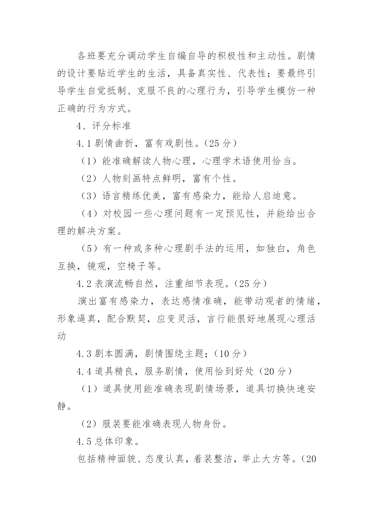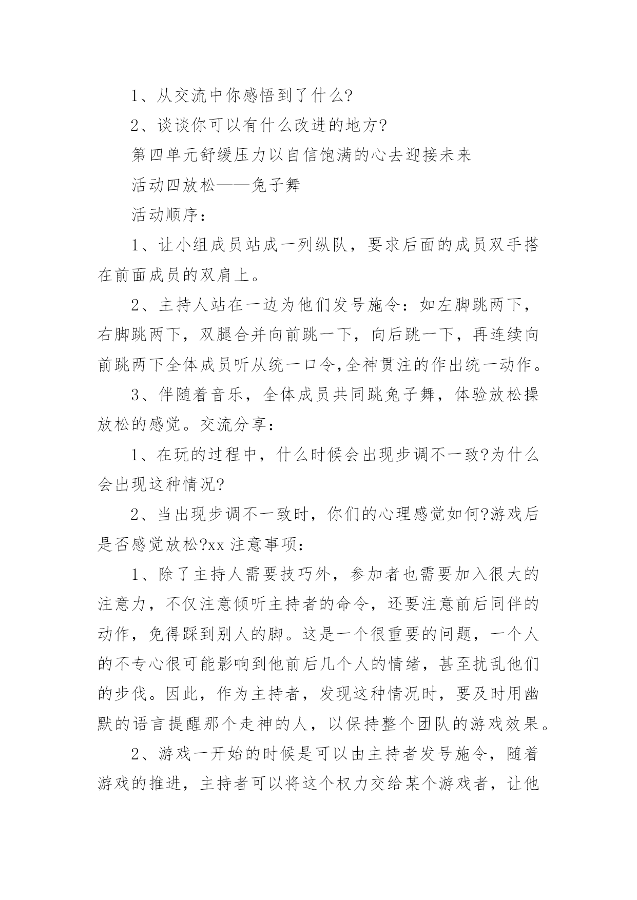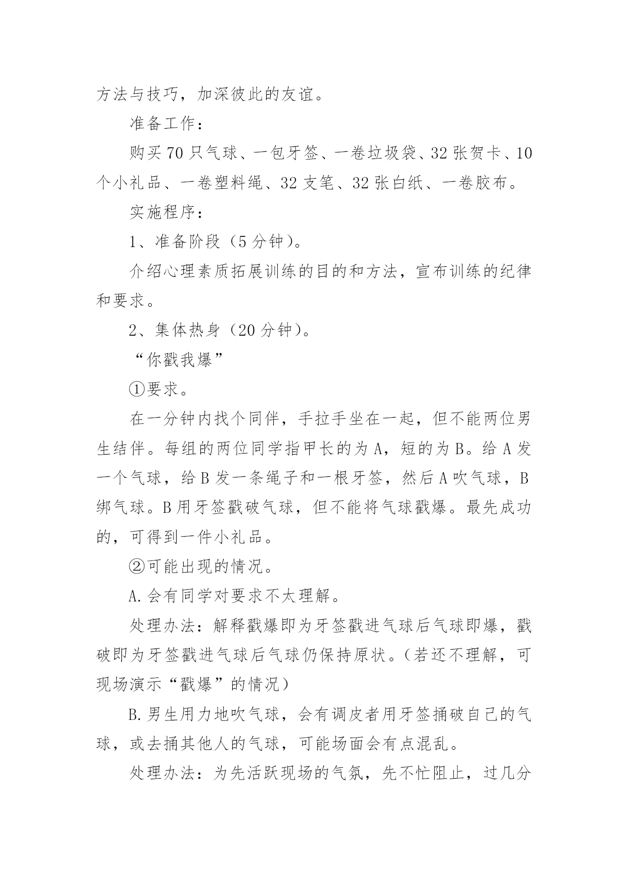 心理健康辅导方案心理健康辅导方案(精选7篇)为了确保事情或工作有序有力开展,就常常需要事先准备方案,方案是为某一行动所制定的具体行动实施办法细则、步骤和安排等。那要怎么制定科学的方案呢?以下是小编帮大家整理的心理健康辅导方案(精选7篇),希望对大家有所帮助。心理健康辅导方案(精选7篇)1一、团体方案名称:良好课堂,友好关系——我可以二、团体规模由7—9人一小组、9个小组组成三、参加对象xx附中初三班全体同学,xx师院xx心理学部分学生四、活动时间:20xx年12月2日下午4:00——5:30活动地点:xx附中校内(具体待定)五、团体整体目标不管在生活上还是学习上,初三学生都有着不同程度的问题和压力,特别是中考临近,初三学生的精神压力大。我们发现,部分学生还存在上课不用心听讲,注意力不集中,有的还有早恋现象。这些对他们今后的发展是不利的。为此,希望通过团体心理辅导活动,营造一个真诚、理解、支持的小组氛围,使同学们通过活动和分享,学会认识自我、悦纳自我、调节自我,及时化解冲突与矛盾,提高心理承受能力,树立正确的学习观和恋爱观,促进心理健康,以更加积极的心态面对学习,工作和生活。六、团体活动具体安排:第一单元促进认识加深了解活动一:串名字游戏(大约15分钟)游戏方法:小组成员围成一圈,任意提名一位学员自我介绍姓名、兴趣爱好,如我叫A、喜欢写作;第二名学员要说:我是喜欢写作的A的左边(右边)的喜欢看书的B;第三名学员说:我是喜欢写作的A的左边(右边)的喜欢看书的B的左边(右边)的喜欢音乐的C,依次下去,最后介绍的一名学员要将前面所有学员的名字、兴趣爱好复述一遍。(人数不多的可以反过来轮一圈)分享交流:1、你是怎么记住其他学员的名字及兴趣爱好的?2、这个游戏中,你学到了什么?第二单元端正学习态度建立友好关系活动二心有千千结(大约15分钟)目的:使参与者能够认识到,在遇到看似复杂问题的时候,只要通过换位思考以及团队的合作就可以顺利的解决问题活动程序:1、要求所有的`参与者围成一个圈2、从任何一个人开始要求(她)他将两只手分别与不相邻的两个人相握;然后这两个人再各自与不相邻的人握手,按此顺序继续,直至所有人的手都与其他的人相握3、这时,所有人的手连接起来形成一个交错的套,此时要求大家再部松开手的情况下通过移动自己的身体变换自己的位置,来解开交错的套。交流分享:1、面对“死结”,你们一组同学的态度有何不同?2、你们是如何解开死结的?有何感想?3、在学习和生活中,有哪些“死结”?我们该如何面对?第三单元正面压力树立良好的心态活动三你说我说(大约35分钟)活动程序:1、由主持者开始,发起话题,引导小组成员针对上课玩手机、开小差等现象,谈自己的看法;对于部分同学的早恋现象,引导小组成员发表自己的看法,以及自己是如何处理异性关系的。2、针对小组成员的发言,主持者可以引导其他组员进行反馈。3、帮助小组成员发现适合自己的应对方式,并总结分享。交流分享:1、从交流中你感悟到了什么?2、谈谈你可以有什么改进的地方?第四单元舒缓压力以自信饱满的心去迎接未来活动四放松——兔子舞活动顺序:1、让小组成员站成一列纵队,要求后面的成员双手搭在前面成员的双肩上。2、主持人站在一边为他们发号施令:如左脚跳两下,右脚跳两下,双腿合并向前跳一下,向后跳一下,再连续向前跳两下全体成员听从统一口令,全神贯注的作出统一动作。3、伴随着音乐,全体成员共同跳兔子舞,体验放松操放松的感觉。交流分享:1、在玩的过程中,什么时候会出现步调不一致?为什么会出现这种情况?2、当出现步调不一致时,你们的心理感觉如何?游戏后是否感觉放松?xx注意事项:1、除了主持人需要技巧外,参加者也需要加入很大的注意力,不仅注意倾听主持者的命令,还要注意前后同伴的动作,免得踩到别人的脚。这是一个很重要的问题,一个人的不专心很可能影响到他前后几个人的情绪,甚至扰乱他们的步伐。因此,作为主持者,发现这种情况时,要及时用幽默的语言提醒那个走神的人,以保持整个团队的游戏效果。2、游戏一开始的时候是可以由主持者发号施令,随着游戏的推进,主持者可以将这个权力交给某个游戏者,让他左右大家的步伐。这样会增加游戏的难度,因为主持者站在旁观者的角度有利于把握全局,说出的命令会照顾所有人。当这个权力转交给游戏者时,他只能凭感觉感受大家的需要,难免出现不协调的命令,这种更有难度的方法,会更有利于帮助成员体会协调与合作的重要性。心理健康辅导方案(精选7篇)2为进一步加强我校心理健康教育,使更多学生学习和了解心理调节方法,掌握心理健康知识,通过互动情境有所体验和思考,提高学生的心理健康素质和在生活中解决实际问题的能力,形成正确的心理健康观念,展现学生的青春风采。特举办“青春舞台我来展示”学生校园心理剧表演大赛。1、校园心理剧简介校园心理