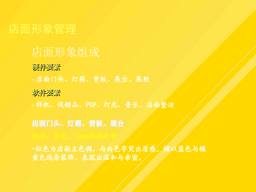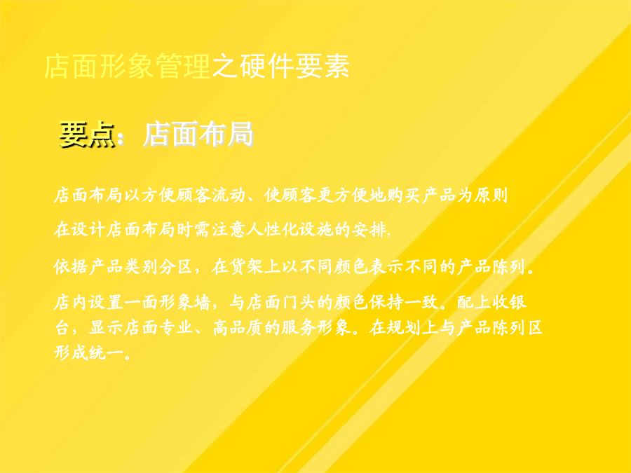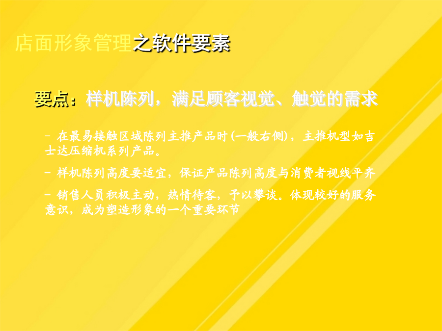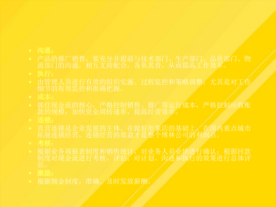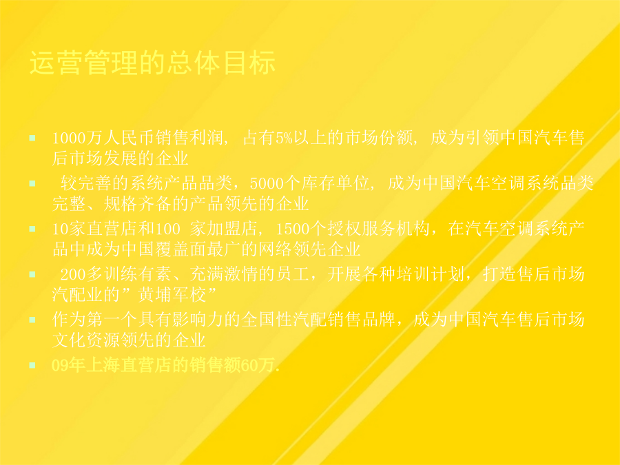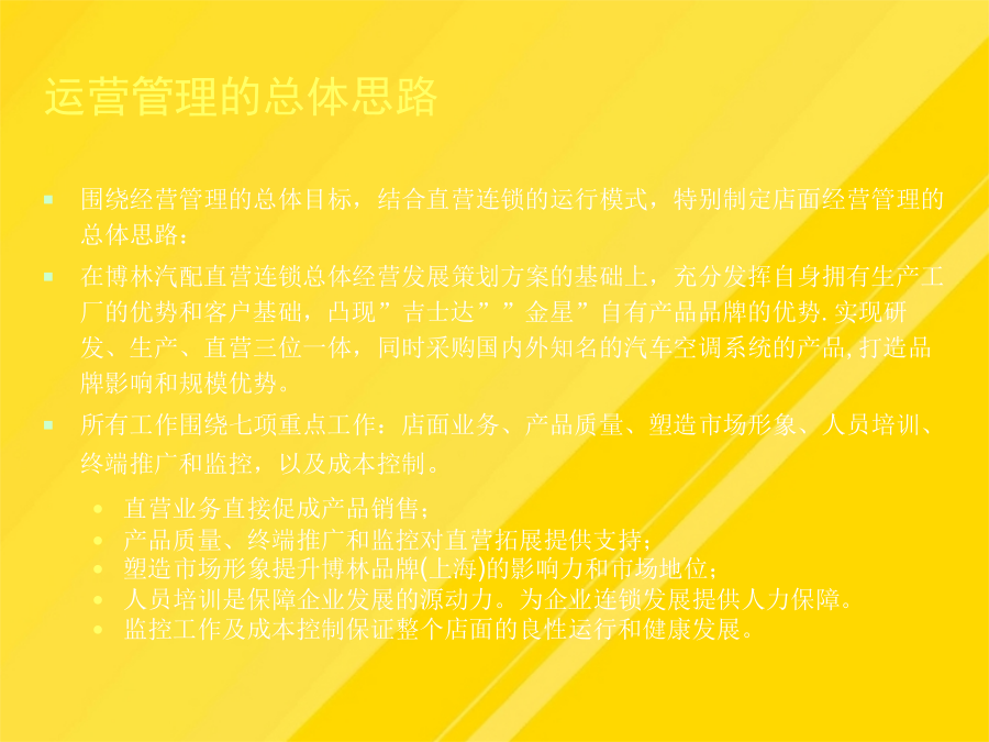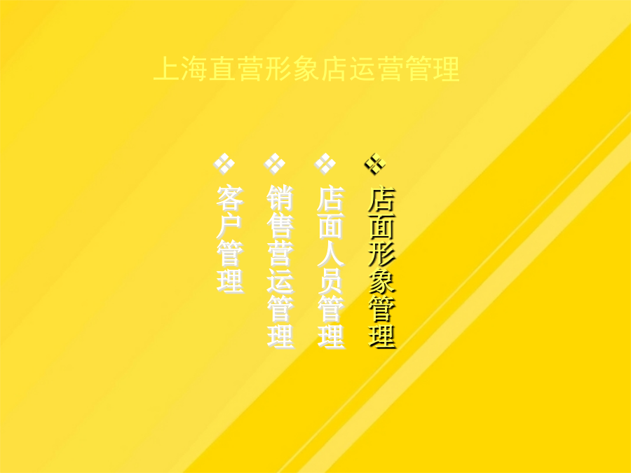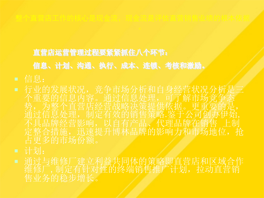 目录运营管理的总体目标运营管理的总体思路整个直营店工作的核心是现金流,现金流是评估直营销售业绩的根本依据。产品质量、终端推广和监控对直营拓展提供支持;对员工的业绩进行合理的激励依据产品类别分区,在货架上以不同颜色表示不同的产品陈列。PROFRESSIONAL-给予店面人员相应的产品、销售技巧培训,制定相关的奖励-有助于经验的总结、分享对于半年到一年没有销售出去的产品,不仅占用大量资金,影响资金周转的同时也使得更多的获利机会被丧失。直营店人员管理岗位操作规范上海直营形象店运营管理-直营店前一年度的销售状况分析它是进行人员招募、工作业绩评价、薪金定位以及进行培训的依据-确保所有的工作都落实到人,没有遗漏1、直营店店长在销售营运管理方面的职责有助于培养员工相同的价值观根据试用情况予以转正。09年上海直营店的销售额60万.促销:有竞争力的促销,如折扣等上海直营形象店运营管理店面形象管理要点:店面布局店面形象管理之硬件要素店面形象管理之软件要素店面形象管理之软件要素店面形象管理上海直营形象店运营管理入库时,仓管需查看产品采购单及质量检测单,确认品类型号、数量、日期方可入库。入库时,仓管需查看产品采购单及质量检测单,确认品类型号、数量、日期方可入库。人员培训是保障企业发展的源动力。-建立与店员就评价结果进行沟通的制度-工作权限(工作承担者的权限范围,如决策权、监督权)-开发新客户的成本是维护老顾客成本的5倍!根据试用情况予以转正。一个职业的销售人员应具有的最基本能力就是“面对面的影响力”,而这又很大程度地取决于是否能够留给客户良好的第一印象。鉴于公司创办伊始,不具品牌经营影响,以自有产品、代理品牌在销售上制定整合措施,迅速提升博林品牌的影响力和市场地位,抢占更多的市场份额。-保证店面可以持续地运营将销售任务合理分配到每一个销售员上海直营形象店运营管理-店面基本销售进度情况店面形象管理之软件要素-确保所有的工作都落实到人,没有遗漏利用电子邮件、短信等在节日问候客户-职责划分清晰,防止产生相互推委责任的现象-销售人员积极主动,热情待客,予以攀谈。大方有礼的行为举止直营店人员管理直营店人员管理岗位操作规范直营店人员管理直营店人员管理直营店人员管理直营店人员管理直营店人员管理直营店人员管理直营店人员管理店面形象管理人员管理销售营运管理客户管理店面销售营运管理店面销售营运管理3、制定详细的店面月度销售计划店面销售营运管理店面销售营运管理店面销售营运管理店面销售营运管理店面销售营运管理单件销售直营店销售营运管理—仓库提货流程店面销售营运管理9、提高店面销售营运管理的工具直营加盟店运营管理店面形象管理销售营运管理人员管理客户管理直营店客户管理变反应型营销为可靠型营销直营店客户管理的方法直营店业务流程直营店财务结算流程直营店人员考核日常功能表格明细谢谢观看