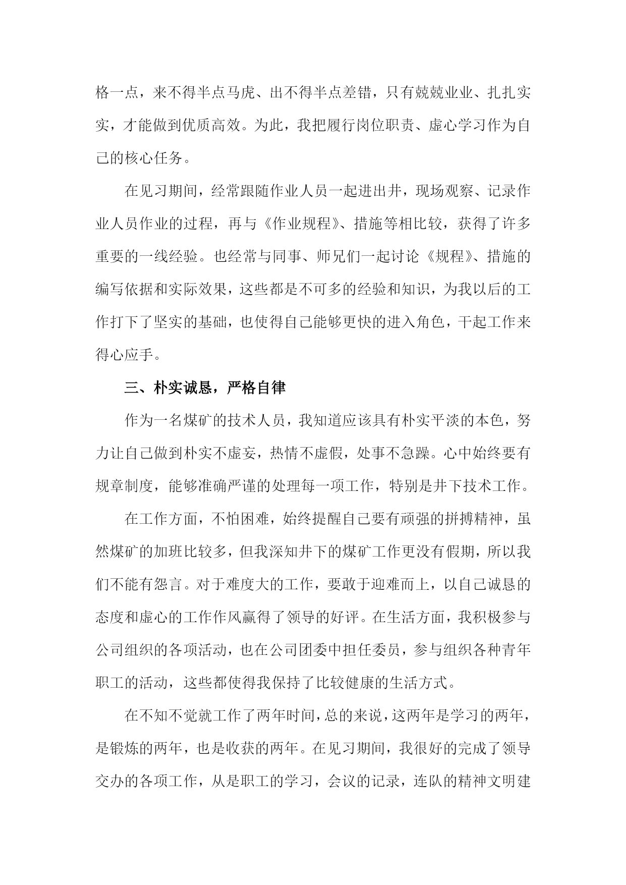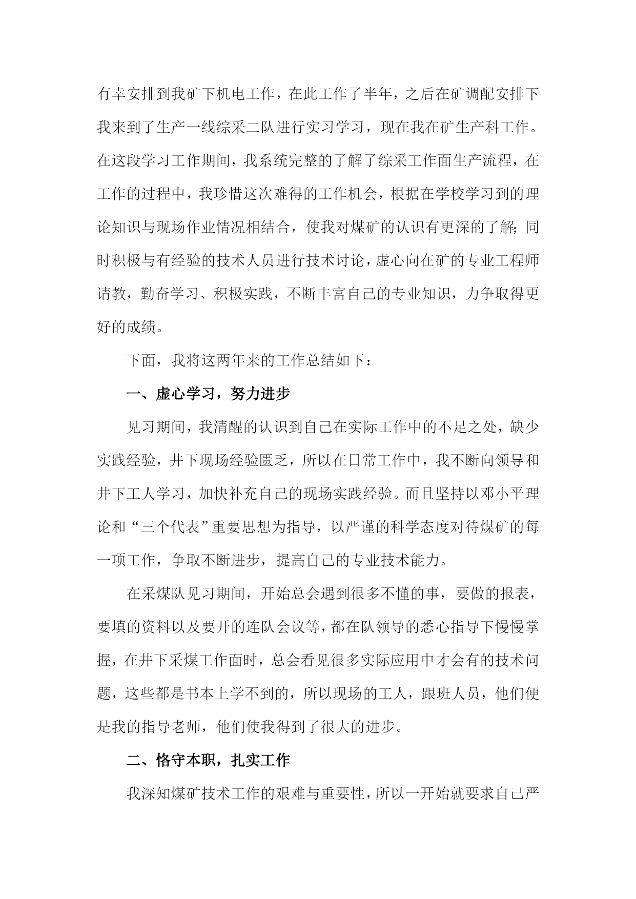 个人工作总结我叫安仰峰,二〇一一年七月毕业于华北科技学院机电一体化专业,二〇一一年七月到新阳煤业,自从参加工作以来,我用积极的工作心态做着自已的煤矿技术员工作,并时刻提醒自己是一名工程技术人员,对工作要严谨务实,去伪存真,尊重科学。在工作过程中,要经常下井亲临工作现场,了解实际的作业情况,根据我矿实际矿情和现场的作业情况,编写相关作业规程、操作规程、安全技术措施,以促进煤矿的安全生产总结一年来工作中的经验、教训,有利于在以后的工作中扬长避短,更好的做好本职工作。俗话说“干一行、爱一行”,我既然选择了矿山,那我将沿老一辈煤矿工人的足迹,为祖国多出煤、出好煤做出自己的最大贡献,我要以他们为榜样,发扬他们几十年如一日的忘我工作精神和不怕苦、不怕累的优秀品质,将自己青春和热血无怨无悔的奉献给矿山,成为新时期新一代的煤矿工人。参加工作以来,一方面坚持不断地学习有关的专业理论知识、安全知识、质量标准、操作标准,丰富专业知识内涵,努力提高自身的业务素质;另一方面,坚持做到理论和实践相结合,把所掌握的知识用于工作实际和生产实践中,工作中做到沉下身子,深入现场,亲身到生产一线中实践,向有经验的老工人请教,达到学以致用,积极解决生产中的技术难题,推进煤炭科技进步。在工作中,一步一个脚印,得到了充实和发展。新阳煤业是一个综合机械化程度较高的现代化矿井,在我入矿时,有幸安排到我矿下机电工作,在此工作了半年,之后在矿调配安排下我来到了生产一线综采二队进行实习学习,现在我在矿生产科工作。在这段学习工作期间,我系统完整的了解了综采工作面生产流程,在工作的过程中,我珍惜这次难得的工作机会,根据在学校学习到的理论知识与现场作业情况相结合,使我对煤矿的认识有更深的了解;同时积极与有经验的技术人员进行技术讨论,虚心向在矿的专业工程师请教,勤奋学习、积极HYPERLINK"http://www.so100.cn/html/shijianbaogao/index.html"\t"_blank"实践,不断丰富自己的专业知识,力争取得更好的成绩。下面,我将这两年来的工作总结如下:一、虚心学习,努力进步见习期间,我清醒的认识到自己在实际工作中的不足之处,缺少实践经验,井下现场经验匮乏,所以在日常工作中,我不断向领导和井下工人学习,加快补充自己的现场实践经验。而且坚持以邓小平理论和“三个代表”重要思想为指导,以严谨的科学态度对待煤矿的每一项工作,争取不断进步,提高自己的专业技术能力。在采煤队见习期间,开始总会遇到很多不懂的事,要做的报表,要填的资料以及要开的连队会议等,都在队领导的悉心指导下慢慢掌握,在井下采煤工作面时,总会看见很多实际应用中才会有的技术问题,这些都是书本上学不到的,所以现场的工人,跟班人员,他们便是我的指导老师,他们使我得到了很大的进步。二、恪守本职,扎实工作我深知煤矿技术工作的艰难与重要性,所以一开始就要求自己严格一点,来不得半点马虎、出不得半点差错,只有兢兢业业、扎扎实实,才能做到优质高效。为此,我把履行岗位职责、虚心学习作为自己的核心任务。在见习期间,经常跟随作业人员一起进出井,现场观察、记录作业人员作业的过程,再与《作业规程》、措施等相比较,获得了许多重要的一线经验。也经常与同事、师兄们一起讨论《规程》、措施的编写依据和实际效果,这些都是不可多的经验和知识,为我以后的工作打下了坚实的基础,也使得自己能够更快的进入角色,干起工作来得心应手。三、朴实诚恳,严格自律作为一名煤矿的技术人员,我知道应该具有朴实平淡的本色,努力让自己做到朴实不虚妄,热情不虚假,处事不急躁。心中始终要有规章制度,能够准确严谨的处理每一项工作,特别是井下技术工作。在工作方面,不怕困难,始终提醒自己要有顽强的拼搏精神,虽然煤矿的加班比较多,但我深知井下的煤矿工作更没有假期,所以我们不能有怨言。对于难度大的工作,要敢于迎难而上,以自己诚恳的态度和虚心的工作作风赢得了领导的好评。在生活方面,我积极参与公司组织的各项活动,也在公司团委中担任委员,参与组织各种青年职工的活动,这些都使得我保持了比较健康的生活方式。在不知不觉就工作了两年时间,总的来说,这两年是学习的两年,是锻炼的两年,也是收获的两年。在见习期间,我很好的完成了领导交办的各项工作,从是职工的学习,会议的记录,连队的精神文明建设到现场的跟班,我都能较好的完成;在公司机关,也积极的做自己力所能及的事情,我很想跟科室的同事们学习,希望能多看到,多学到,偶尔能帮上忙的地方也积极参与。由于前期自身经验的不足,使得我养成了虚心学习的好习惯,我知道未来的学习和工作之路还很长,我也将以一百分的热情投入到煤矿技术的工作当中,始终保持严谨扎实的态度,积极思考,善于开拓,争取在自己的岗位上为企业和社会贡献力量。