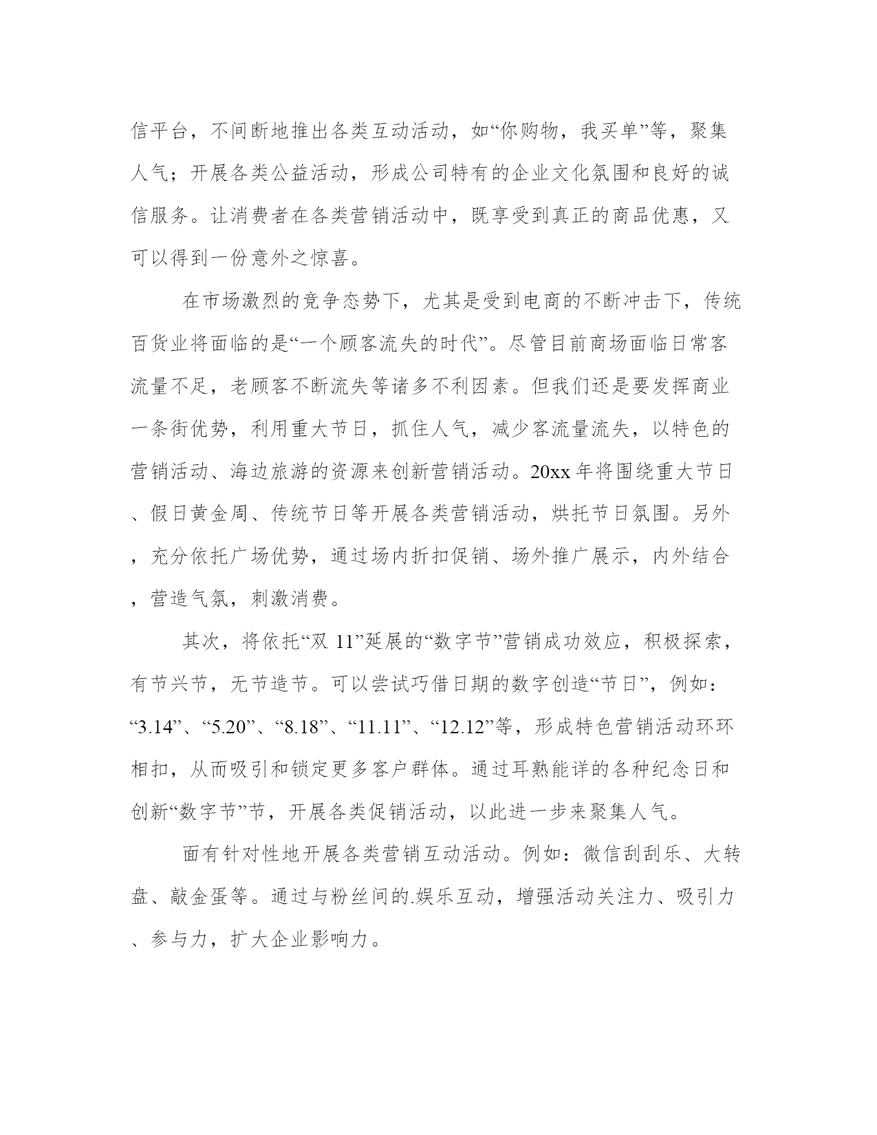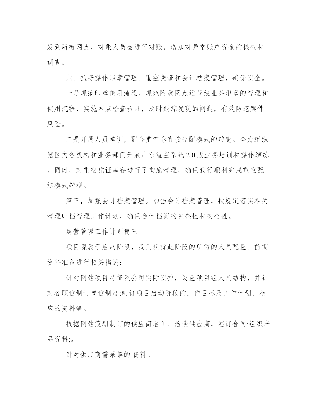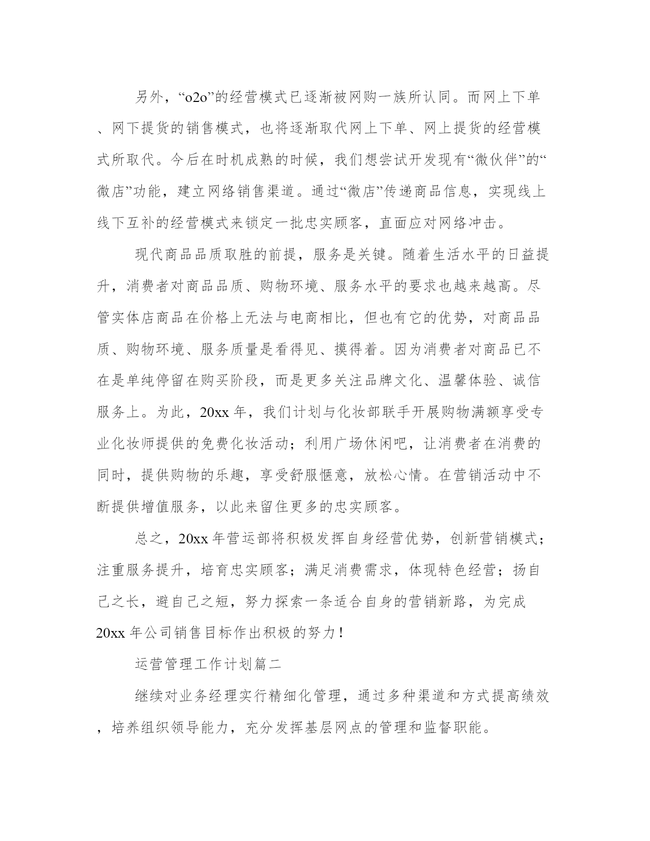 2023年运营管理工作计划(大全10篇)计划是一种为了实现特定目标而制定的有条理的行动方案。我们在制定计划时需要考虑到各种因素的影响,并保持灵活性和适应性。以下是小编收集整理的工作计划书范文,仅供参考,希望能够帮助到大家。运营管理工作计划篇一伴随着电商“双11”销售的再一次刷新,电商销售占据整个零售行业半壁江山已是不争事实。不可否认,目前网购已不再是年轻一族的专利,吸引越来越多的消费群体主动加入其中。面对如此电商迅猛的发展势头,实体店步履艰难,尤其是像我们这些中小型的单一百货店首当其冲,受到的影响尤为明显和突出。顾客流失严重、人气难以聚集、促销打折不再被吸引,销售逐渐下降。如何面对网购,恢复昔日人气如何抵御同行竞争,扭转目前的经营困境如何开展适销对路的营销活动是营运部明年思考的问题和工作重点。为此,我们将做好以下几方面工作。具体如下:雷同的经营模式和营销手段只会导致同行业的恶性竞争。20xx年我们应根据自身优势和区域消费特点,把握机遇,捕捉商机,提升销售。通过开展差异化营销、调研和分析市场,掌握消费者的所需、所想、所求,来策划好营销活动方案,锁定消费群体,培养忠实顾客。例如:根据季节不同,举行换季特卖和回馈活动,带动销售;发挥微信平台,不间断地推出各类互动活动,如“你购物,我买单”等,聚集人气;开展各类公益活动,形成公司特有的企业文化氛围和良好的诚信服务。让消费者在各类营销活动中,既享受到真正的商品优惠,又可以得到一份意外之惊喜。在市场激烈的竞争态势下,尤其是受到电商的不断冲击下,传统百货业将面临的是“一个顾客流失的时代”。尽管目前商场面临日常客流量不足,老顾客不断流失等诸多不利因素。但我们还是要发挥商业一条街优势,利用重大节日,抓住人气,减少客流量流失,以特色的营销活动、海边旅游的资源来创新营销活动。20xx年将围绕重大节日、假日黄金周、传统节日等开展各类营销活动,烘托节日氛围。另外,充分依托广场优势,通过场内折扣促销、场外推广展示,内外结合,营造气氛,刺激消费。其次,将依托“双11”延展的“数字节”营销成功效应,积极探索,有节兴节,无节造节。可以尝试巧借日期的数字创造“节日”,例如:“3.14”、“5.20”、“8.18”、“11.11”、“12.12”等,形成特色营销活动环环相扣,从而吸引和锁定更多客户群体。通过耳熟能详的各种纪念日和创新“数字节”节,开展各类促销活动,以此进一步来聚集人气。面有针对性地开展各类营销互动活动。例如:微信刮刮乐、大转盘、敲金蛋等。通过与粉丝间的.娱乐互动,增强活动关注力、吸引力、参与力,扩大企业影响力。另外,“o2o”的经营模式已逐渐被网购一族所认同。而网上下单、网下提货的销售模式,也将逐渐取代网上下单、网上提货的经营模式所取代。今后在时机成熟的时候,我们想尝试开发现有“微伙伴”的“微店”功能,建立网络销售渠道。通过“微店”传递商品信息,实现线上线下互补的经营模式来锁定一批忠实顾客,直面应对网络冲击。现代商品品质取胜的前提,服务是关键。随着生活水平的日益提升,消费者对商品品质、购物环境、服务水平的要求也越来越高。尽管实体店商品在价格上无法与电商相比,但也有它的优势,对商品品质、购物环境、服务质量是看得见、摸得着。因为消费者对商品已不在是单纯停留在购买阶段,而是更多关注品牌文化、温馨体验、诚信服务上。为此,20xx年,我们计划与化妆部联手开展购物满额享受专业化妆师提供的免费化妆活动;利用广场休闲吧,让消费者在消费的同时,提供购物的乐趣,享受舒服惬意,放松心情。在营销活动中不断提供增值服务,以此来留住更多的忠实顾客。总之,20xx年营运部将积极发挥自身经营优势,创新营销模式;注重服务提升,培育忠实顾客;满足消费需求,体现特色经营;扬自己之长,避自己之短,努力探索一条适合自身的营销新路,为完成20xx年公司销售目标作出积极的努力!运营管理工作计划篇二继续对业务经理实行精细化管理,通过多种渠道和方式提高绩效,培养组织领导能力,充分发挥基层网点的管理和监督职能。一是继续坚持业务经理例会制度。继续每月召开业务经理例会,丰富例会的形式和内容,提高业务经理的精细化管理,指出业务经理的工作重点和方向,提升业务管理能力和技能水平,实现巩固、学习、提高业务知识和加强风险内控管理的根本目标。第二,继续为企业管理者提供全面的培训。继续实行部门联动,定期组织各条线业务部门对业务经理进行业务知识、风险防范和履职培训,促进基层网点业务水平和内控实力的双重提升。定期评估业务经理履职能力,通过支行组织的季度层级考核,帮助业务经理高标准顺利完成省行组织的测试,提高业务经理的工作水平。第三,加强对企业管理者绩效的检查。加大对业务经理履职情况的检查力度,严格遵循省级银行每季度检查机构数量不低于所辖机构
