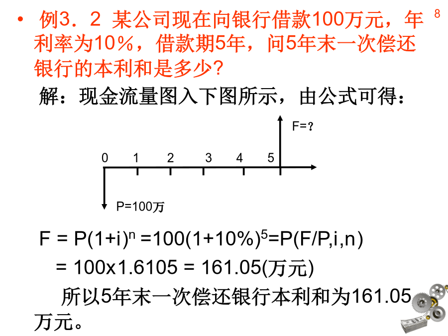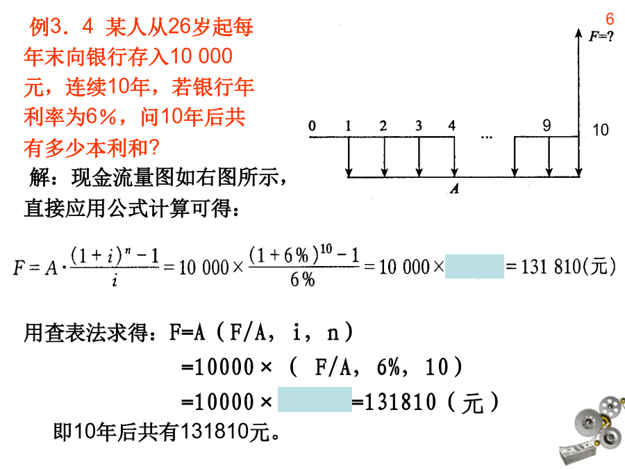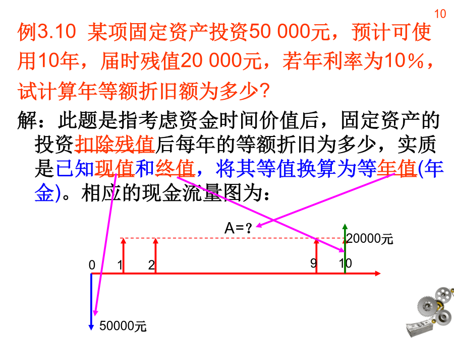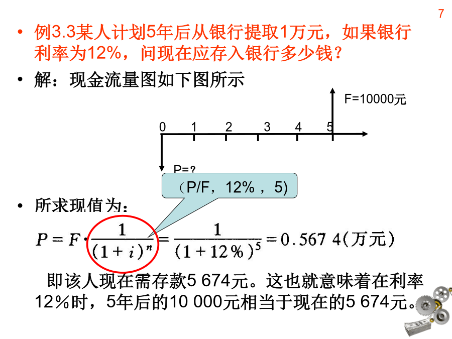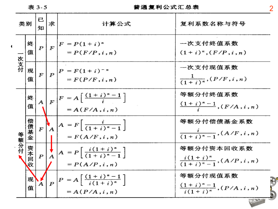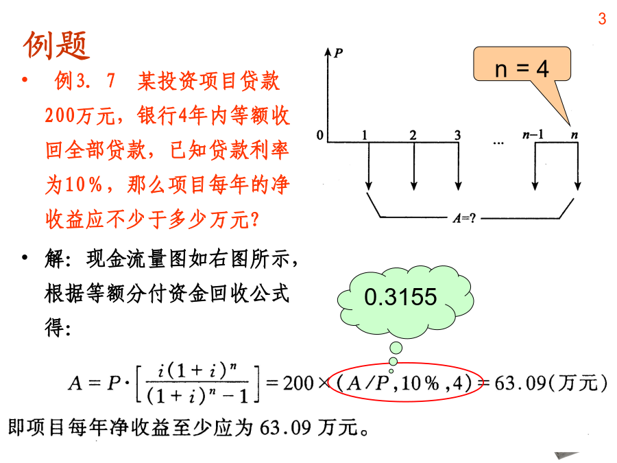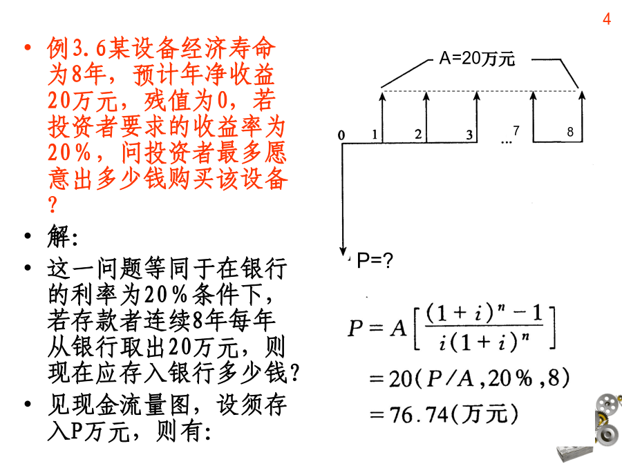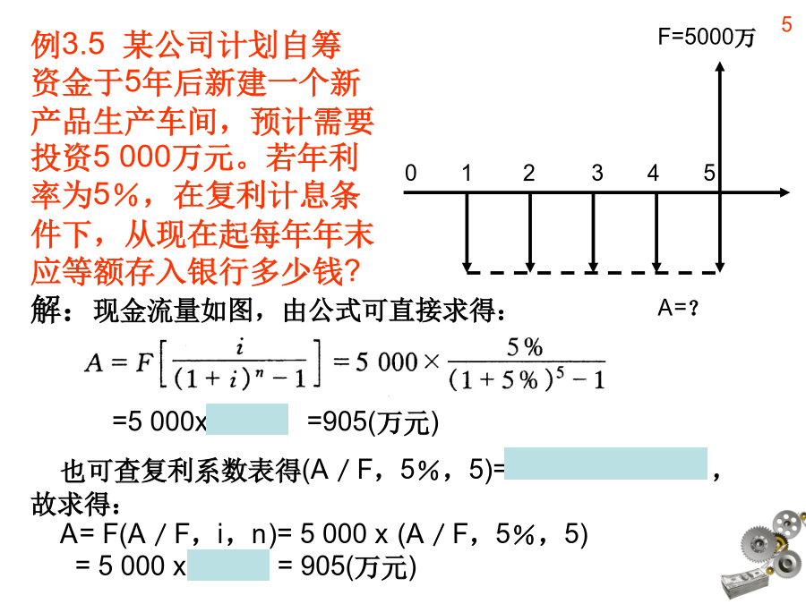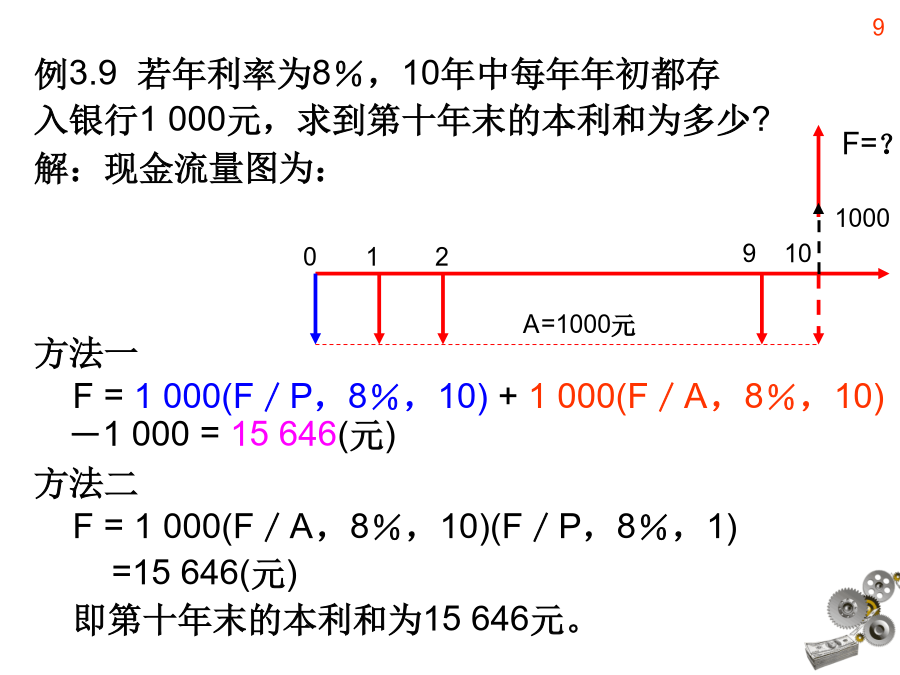 第二章经济性评价基本要素(四)(习题课)例题套已知F求P公式:套已知F求P公式:典型习题:下图中,考虑资金的时间价值后,总现金流出等于总现金流入。试利用各种资金等值计算系数,用已知项表示未知项。(1)已知A1,A2,P1,i,求P2;(2)已知P1,P2,A1,i,求A2;(3)已知P1,P2,A2,i,求A1。(2)解:由题意,在第五年末,有P1(F/P,i,5)+P2=A1(F/A,i,4)(F/P,i,1)+A2(P/A,i,5)故有:A2=[P1(F/P,i,5)+P2-A1(F/A,i,4)(F/P,i,1)]/(P/A,i,5)期数与利率的计算(1)期数n的计算式(P61)例题(2)利率i的计算式例题作业练习:课本P73:7、8、9、10P74:12、18