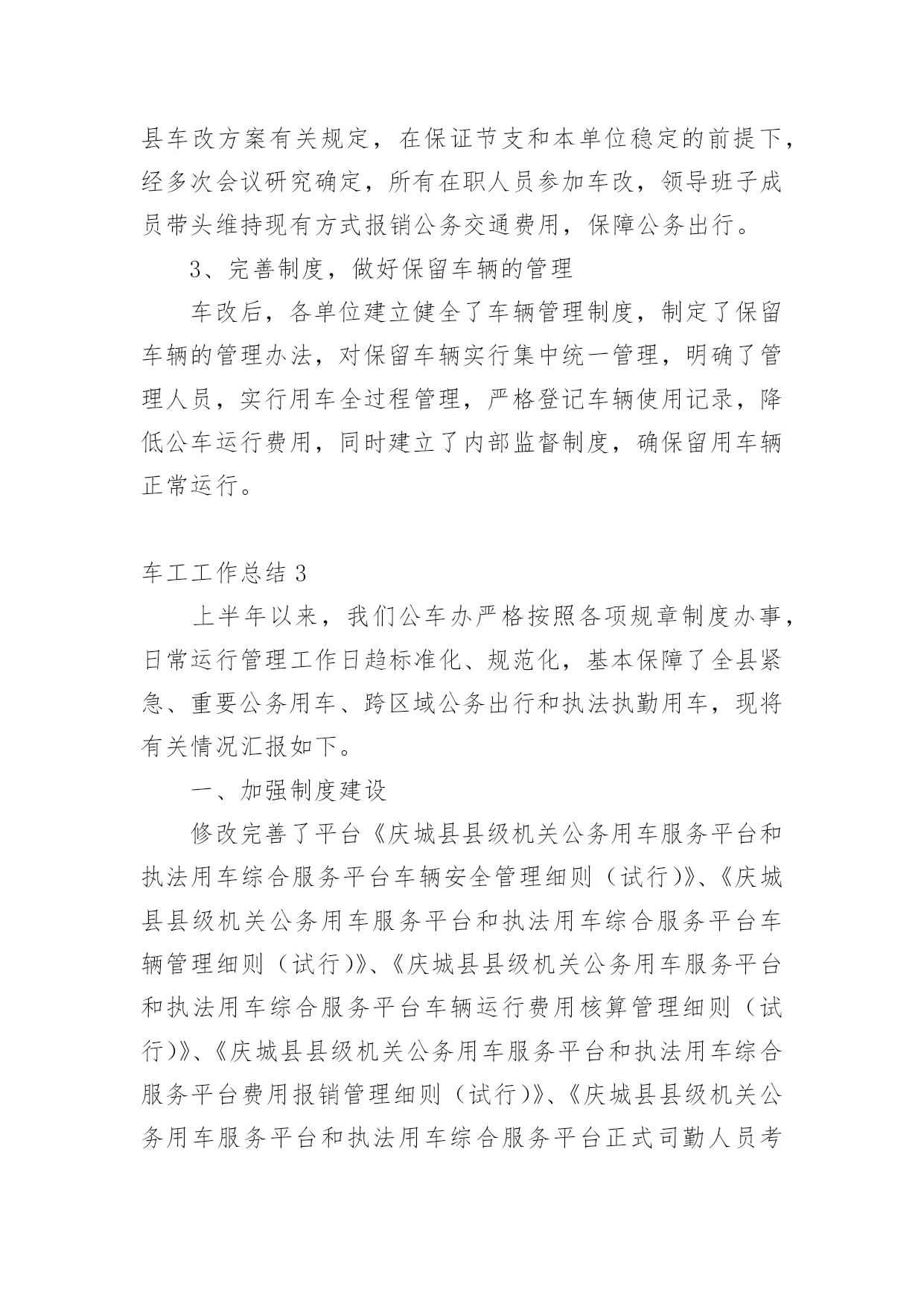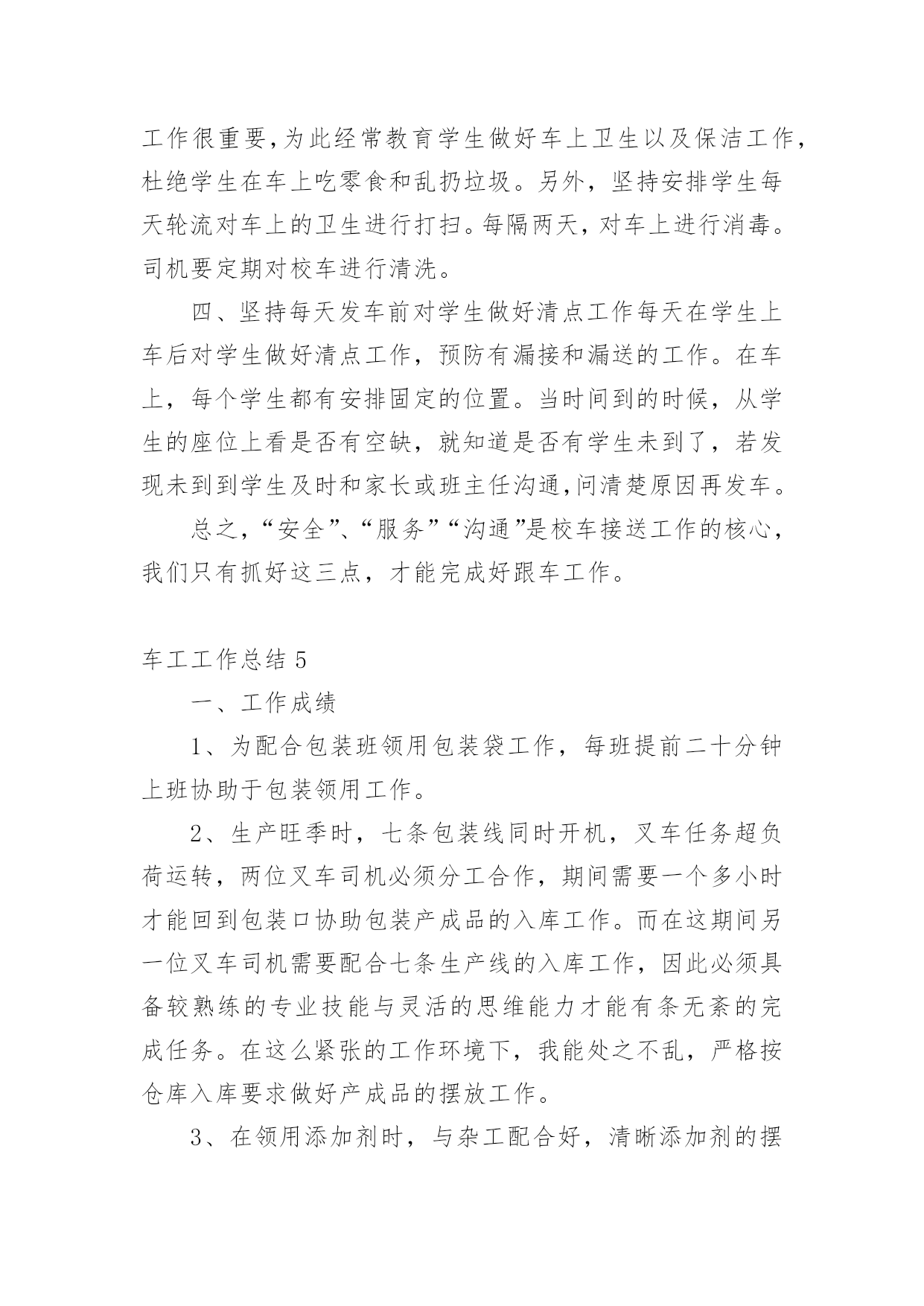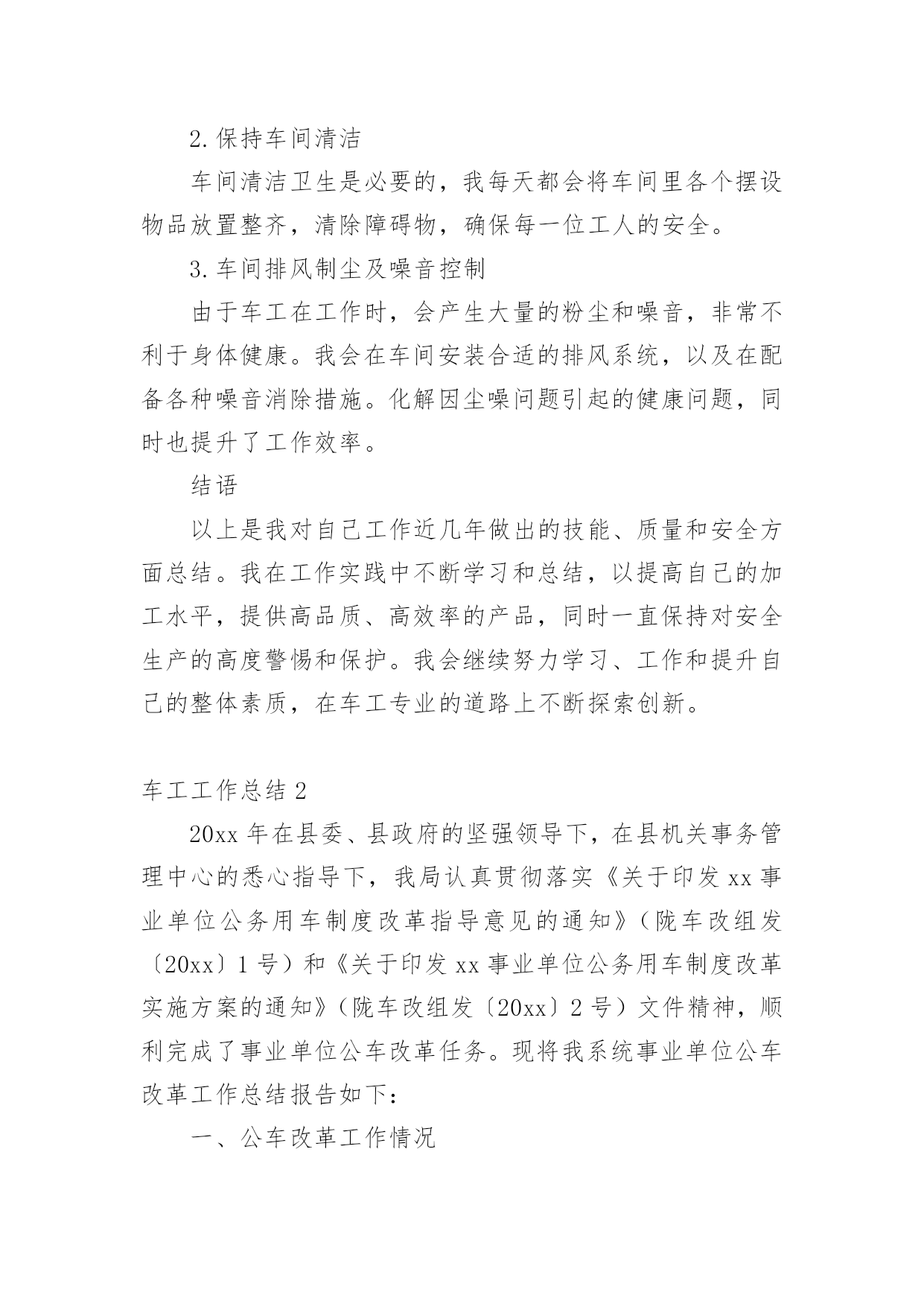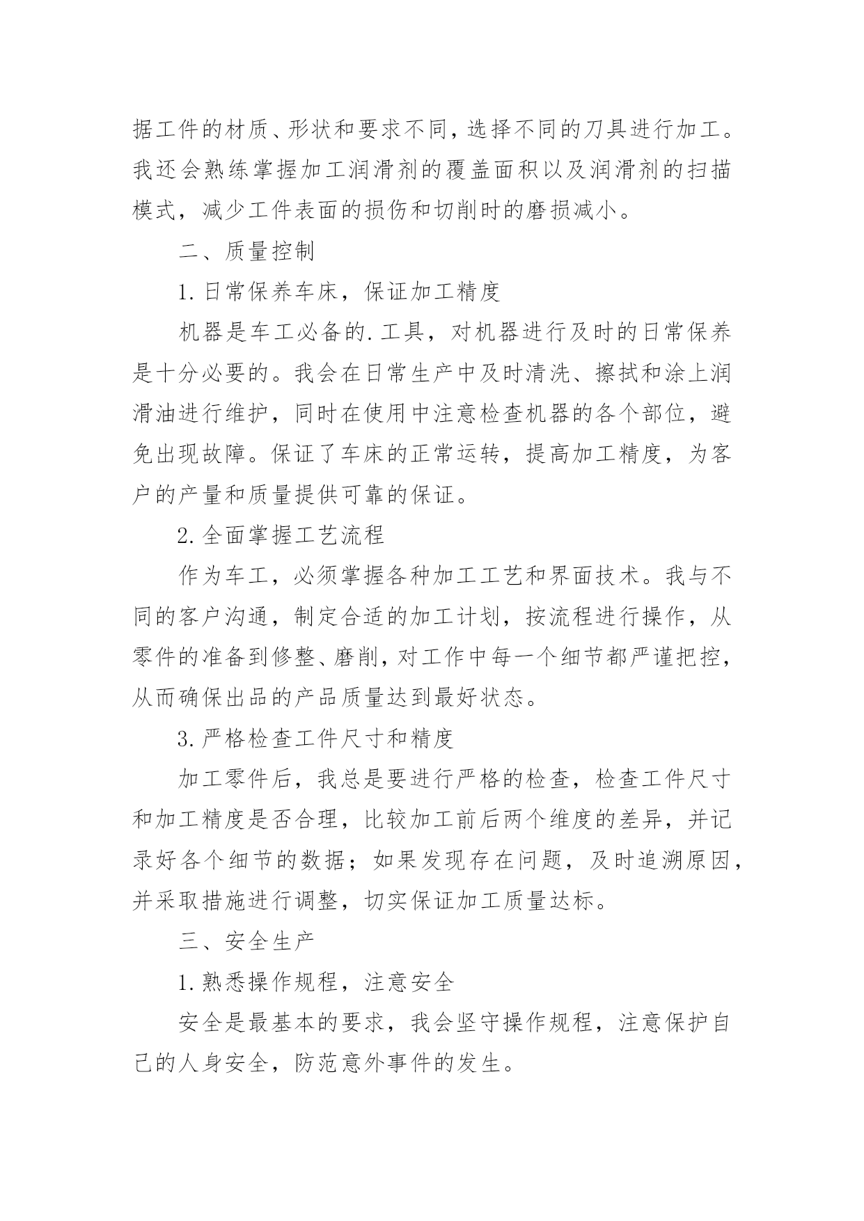 车工工作总结(热)车工工作总结总结是事后对某一阶段的学习、工作或其完成情况加以回顾和分析的一种书面材料,它能够给人努力工作的动力,因此好好准备一份总结吧。我们该怎么写总结呢?下面是小编精心整理的车工工作总结,仅供参考,大家一起来看看吧。车工工作总结1我从事车工专业已有十年时间,回顾这十年的工作经验,我感到收获颇丰,总结了以下几点:一、技能方面1.熟练掌握车床的操作技能在车工专业中,熟练掌握车床的操作技能是非常重要的。我在实际工作中多次操作,逐渐累积了精湛的技术。我通常会先脑补一下工件的制作工序,确定好方案后,再开始进行操作。我还会认真调整好车刀的角度和光洁度,让工件旋转更加流畅,最大限度地保证了加工质量和效率。2.熟练掌握测量工具使用技能工件的尺寸和几何形状都是必须掌握的常识,我能够熟练使用千分尺、游标卡尺和角度尺等测量工具,确保零件精度符合要求,同时也大大提高了自己的工作效率。3.会使用各类刀具进行加工在车工过程中,刀具的选择和使用是十分重要的。我根据工件的材质、形状和要求不同,选择不同的刀具进行加工。我还会熟练掌握加工润滑剂的覆盖面积以及润滑剂的扫描模式,减少工件表面的损伤和切削时的磨损减小。二、质量控制1.日常保养车床,保证加工精度机器是车工必备的.工具,对机器进行及时的日常保养是十分必要的。我会在日常生产中及时清洗、擦拭和涂上润滑油进行维护,同时在使用中注意检查机器的各个部位,避免出现故障。保证了车床的正常运转,提高加工精度,为客户的产量和质量提供可靠的保证。2.全面掌握工艺流程作为车工,必须掌握各种加工工艺和界面技术。我与不同的客户沟通,制定合适的加工计划,按流程进行操作,从零件的准备到修整、磨削,对工作中每一个细节都严谨把控,从而确保出品的产品质量达到最好状态。3.严格检查工件尺寸和精度加工零件后,我总是要进行严格的检查,检查工件尺寸和加工精度是否合理,比较加工前后两个维度的差异,并记录好各个细节的数据;如果发现存在问题,及时追溯原因,并采取措施进行调整,切实保证加工质量达标。三、安全生产1.熟悉操作规程,注意安全安全是最基本的要求,我会坚守操作规程,注意保护自己的人身安全,防范意外事件的发生。2.保持车间清洁车间清洁卫生是必要的,我每天都会将车间里各个摆设物品放置整齐,清除障碍物,确保每一位工人的安全。3.车间排风制尘及噪音控制由于车工在工作时,会产生大量的粉尘和噪音,非常不利于身体健康。我会在车间安装合适的排风系统,以及在配备各种噪音消除措施。化解因尘噪问题引起的健康问题,同时也提升了工作效率。结语以上是我对自己工作近几年做出的技能、质量和安全方面总结。我在工作实践中不断学习和总结,以提高自己的加工水平,提供高品质、高效率的产品,同时一直保持对安全生产的高度警惕和保护。我会继续努力学习、工作和提升自己的整体素质,在车工专业的道路上不断探索创新。车工工作总结220xx年在县委、县政府的坚强领导下,在县机关事务管理中心的悉心指导下,我局认真贯彻落实《关于印发xx事业单位公务用车制度改革指导意见的通知》(陇车改组发〔20xx〕1号)和《关于印发xx事业单位公务用车制度改革实施方案的通知》(陇车改组发〔20xx〕2号)文件精神,顺利完成了事业单位公车改革任务。现将我系统事业单位公车改革工作总结报告如下:一、公车改革工作情况1、参改单位情况文广系统涉及车改的有xx文化馆、xx图书馆、xx博物馆、xx广播电视台、xx文化市场综合执法局共计5个事业单位,单位性质均为公益一类全额拨款事业单位。现各单位均按照《xx事业单位公务用车制度改革指导意见》和《xx事业单位公务用车制度改革实施方案》要求,研究制定了本单位的车改实施方案,经我局审核,各单位实施方案均符合实际情况和事业单位车改政策要求。2、参改车辆保留、取消情况各参改事业单位现有必要的业务、生产用车共计7辆,其中:县文化馆业务用车2辆;县图书馆业务用车3辆;县电视台业务用车2辆;县博物馆和县文化市场综合执法局均无车辆。改革后继续保留必要的业务、生产用车共计6辆,其中:保留县文化馆业务用车2辆,县图书馆业务用车3辆;取消县电视台业务用车1辆,现剩余1辆业务用车。3、参改人员情况各参改事业单位编制核定51人,实有37人。其中文化馆9人;图书馆6人;博物馆5人;电视台13人;文化市场综合执法局4人。所有参改人员全部执行报销公务交通费用。4、司勤人员安置情况车改后根据各事业单位保留车辆结合实际情况,我文广系统事业单位继续保留2名司勤人员(1名在册在编,1名合同工)。二、主要做法1、健全机构、落实任务为推进文广系统事业单位公务用车制度改革工作顺利开展,我局及时成立了由局主要领导任组长,主管领导任副组长,事业单位主要负责人为成员的事业单位公车改革领导小组,加强车改宣传力度,统一思想,
