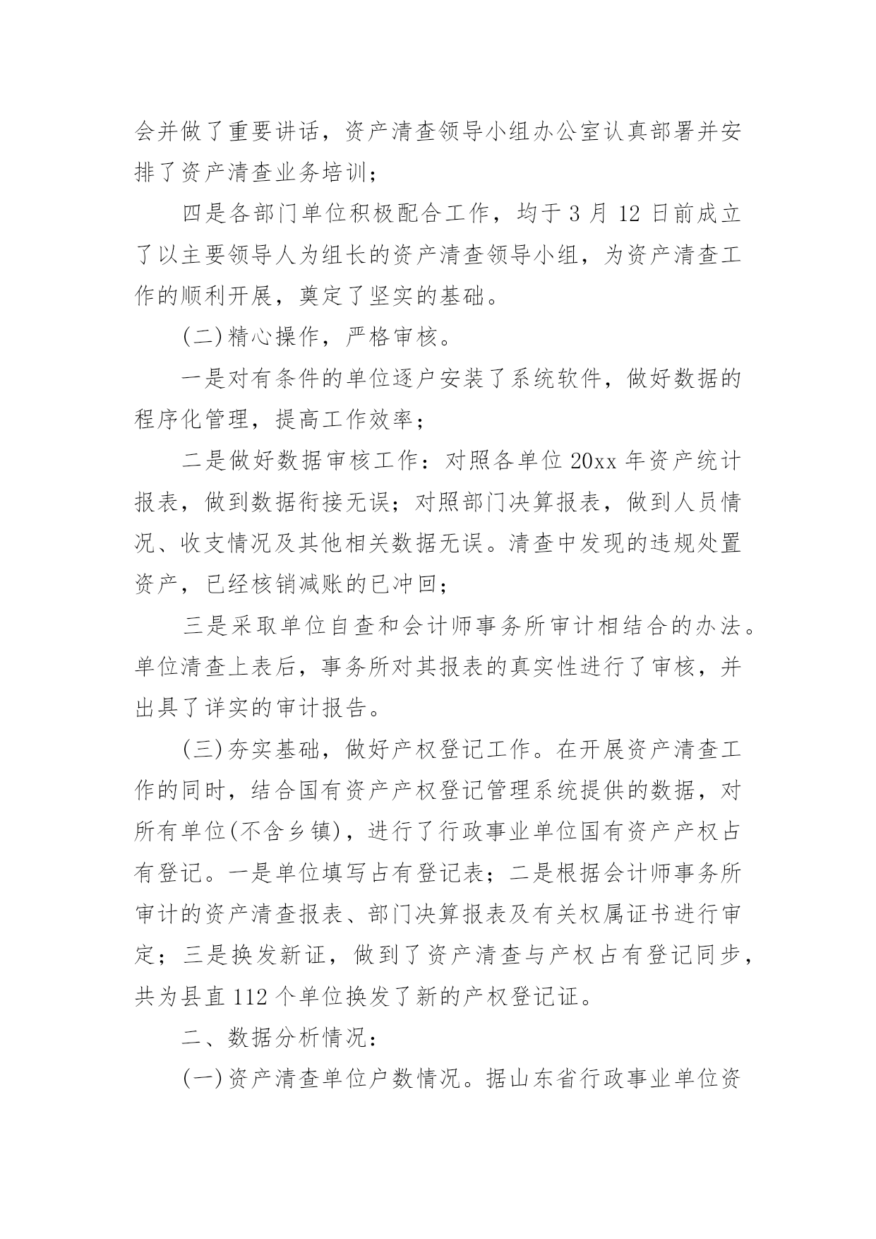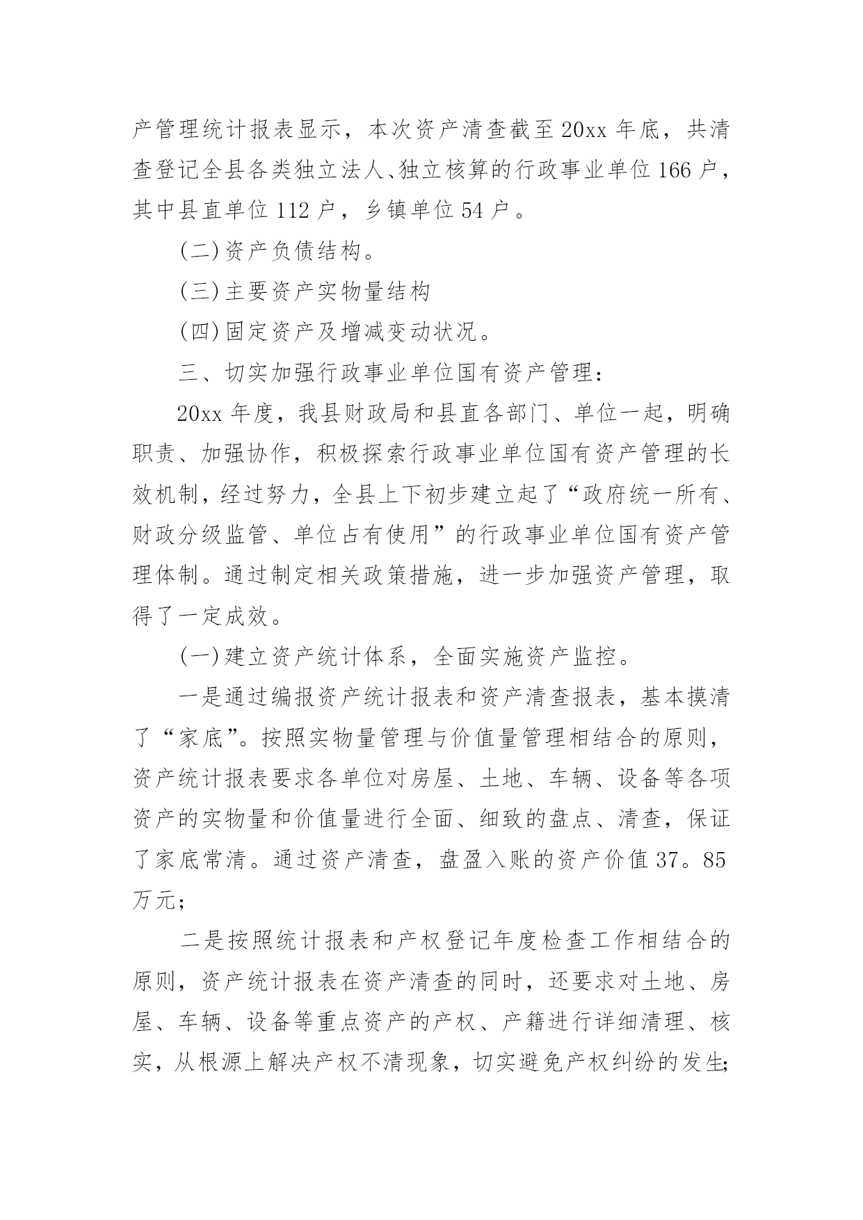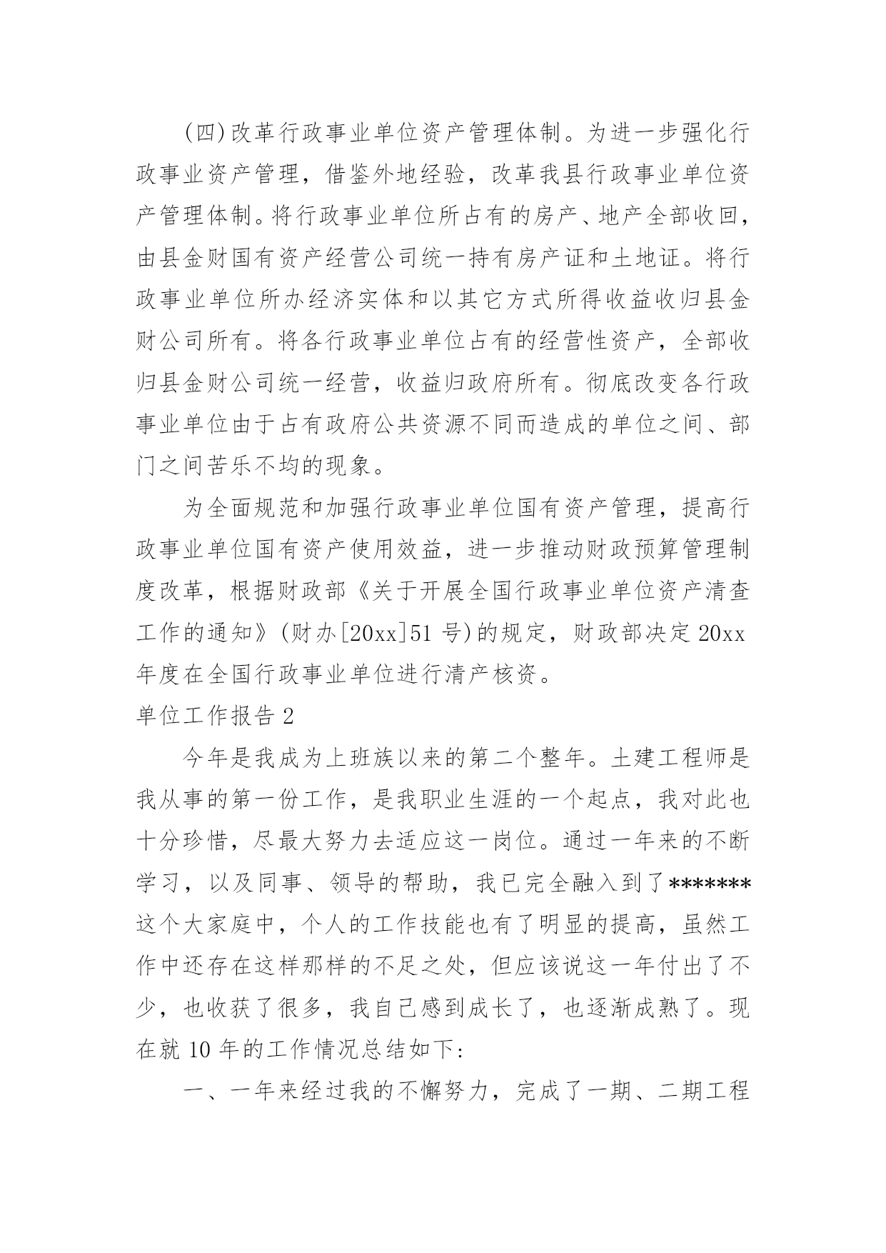 单位工作报告单位工作报告在当下这个社会中,越来越多的事务都会使用到报告,多数报告都是在事情做完或发生后撰写的。那么报告应该怎么写才合适呢?以下是小编精心整理的单位工作报告,欢迎大家分享。单位工作报告1按照上级的统一部署,经过财政部门的精心组织和各部门单位的密切配合,我县的行政事业单位固定资产清产核资工作已圆满完成。现将有关情况报告如下:一、资产清查及管理信息统计工作主要情况:资产清查和管理信息统计工作是国有资产管理的一项基础工作,是确定产权关系,维护国有资产安全完整的重要手段,为了做好这项工作,不断提高管理质量,我们主要采取了以下措施:(一)领导重视,责任明确。一是迅速整理了上级资产清查会议精神汇报提纲,向县政府领导做了汇报;二是成立了我县资产清查工作领导小组,公布了《汶上县行政事业单位资产清查工作实施方案》;三是召开了全县资产清查工作动员大会,县政府领导到会并做了重要讲话,资产清查领导小组办公室认真部署并安排了资产清查业务培训;四是各部门单位积极配合工作,均于3月12日前成立了以主要领导人为组长的资产清查领导小组,为资产清查工作的顺利开展,奠定了坚实的基础。(二)精心操作,严格审核。一是对有条件的单位逐户安装了系统软件,做好数据的程序化管理,提高工作效率;二是做好数据审核工作:对照各单位20xx年资产统计报表,做到数据衔接无误;对照部门决算报表,做到人员情况、收支情况及其他相关数据无误。清查中发现的违规处置资产,已经核销减账的已冲回;三是采取单位自查和会计师事务所审计相结合的办法。单位清查上表后,事务所对其报表的真实性进行了审核,并出具了详实的审计报告。(三)夯实基础,做好产权登记工作。在开展资产清查工作的同时,结合国有资产产权登记管理系统提供的数据,对所有单位(不含乡镇),进行了行政事业单位国有资产产权占有登记。一是单位填写占有登记表;二是根据会计师事务所审计的资产清查报表、部门决算报表及有关权属证书进行审定;三是换发新证,做到了资产清查与产权占有登记同步,共为县直112个单位换发了新的产权登记证。二、数据分析情况:(一)资产清查单位户数情况。据山东省行政事业单位资产管理统计报表显示,本次资产清查截至20xx年底,共清查登记全县各类独立法人、独立核算的行政事业单位166户,其中县直单位112户,乡镇单位54户。(二)资产负债结构。(三)主要资产实物量结构(四)固定资产及增减变动状况。三、切实加强行政事业单位国有资产管理:20xx年度,我县财政局和县直各部门、单位一起,明确职责、加强协作,积极探索行政事业单位国有资产管理的长效机制,经过努力,全县上下初步建立起了“政府统一所有、财政分级监管、单位占有使用”的行政事业单位国有资产管理体制。通过制定相关政策措施,进一步加强资产管理,取得了一定成效。(一)建立资产统计体系,全面实施资产监控。一是通过编报资产统计报表和资产清查报表,基本摸清了“家底”。按照实物量管理与价值量管理相结合的原则,资产统计报表要求各单位对房屋、土地、车辆、设备等各项资产的实物量和价值量进行全面、细致的盘点、清查,保证了家底常清。通过资产清查,盘盈入账的资产价值37。85万元;二是按照统计报表和产权登记年度检查工作相结合的原则,资产统计报表在资产清查的同时,还要求对土地、房屋、车辆、设备等重点资产的产权、产籍进行详细清理、核实,从根源上解决产权不清现象,切实避免产权纠纷的发生;三是按照静态管理与动态管理相结合的原则,资产统计报告要求详细披露本年资产特别是固定资产的增减变动情况,对未按规定程序配置和处置资产的行为要求有关单位及时予以纠正,纠正价值48。57万元;四是按照资产管理与预算管理以及经营性资产收益情况进行监督,增强预算执行的严肃性,防止财政收入流失,提高财政精细化管理水平,同时也为今后加强资产配置预算编制审核打下坚实的基础。(二)以促进有效使用为目的,加强资产处置及其收益管理。加强资产处置及其收益监管,是确保国有资产有效使用和防止国有资产及其收入流失的重要环节。严格按程序办事,通过三项措施加强对资产处置及其收益的管理。一是规范资产处置程序,杜绝了私自处置资产的行为。有效防止了国有资产的随意处置、低价买卖,确保实现了国有资产价值最大化;二是强化经营性资产监管。对行政事业单位国有资产出租、出借和事业单位对外投资、担保活动等改变用途的行为,严格履行审批手续,鼓励盘活存量资产;三是强化资产收益管理,防止财政收入流失。积极加强土地、房屋建筑物、车辆、通用专用设备等行政事业单位资产处置收入管理工作。四、存在的问题:当前,行政事业单位国有资产管理工作中,还存在不少问题急需研究解决。(一)资产管理与预算管理脱节,影响了财政资金的使用效益。在当前实际工作中,资产管理与预算管理存在脱节的问题,不仅造成了资产重复购置、闲