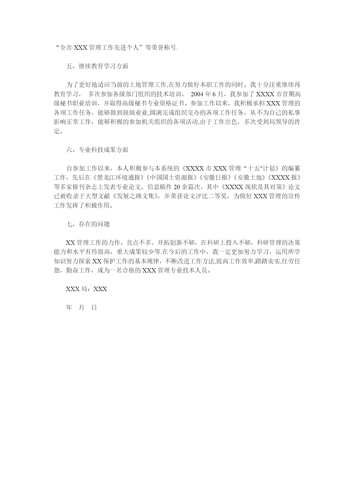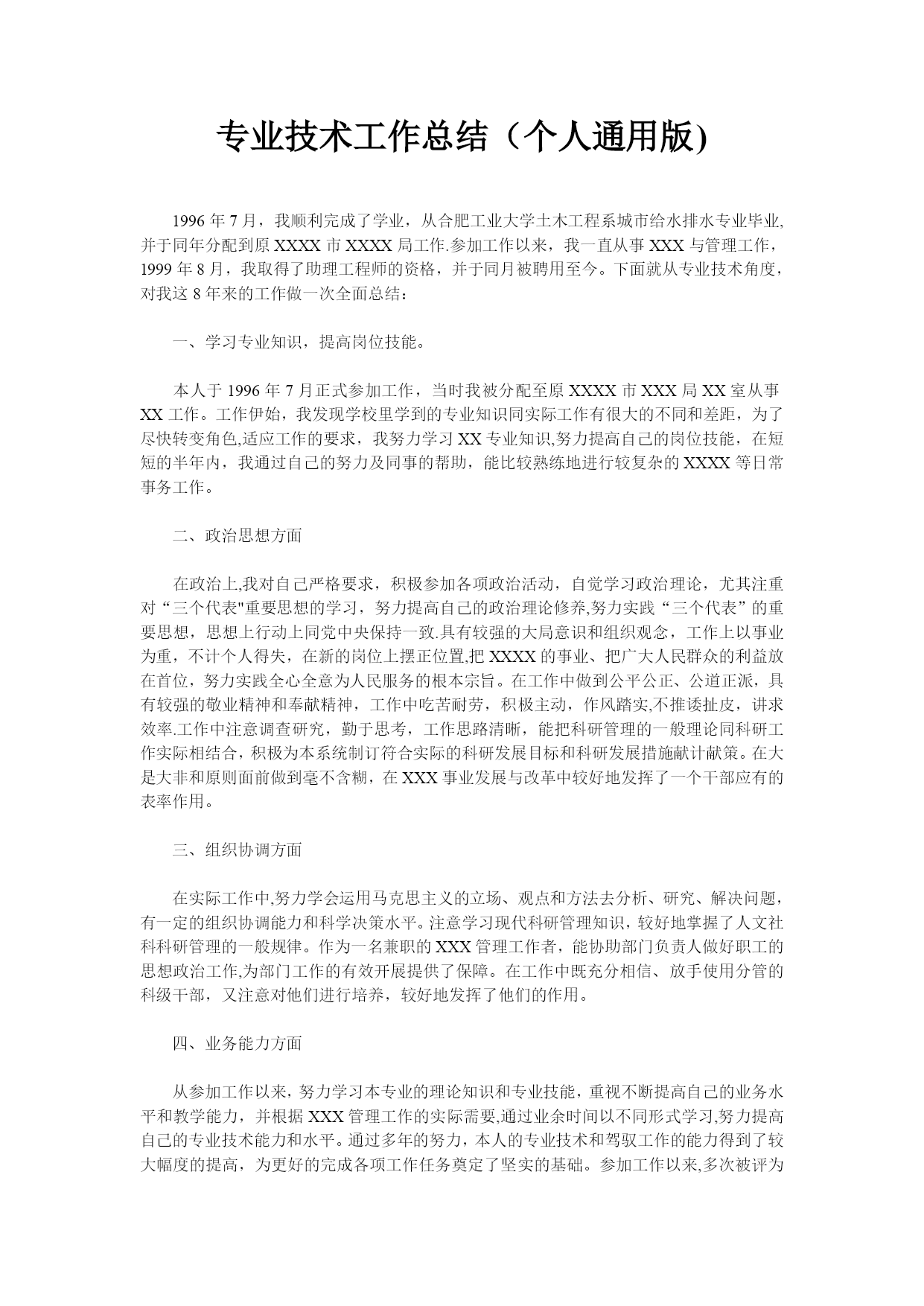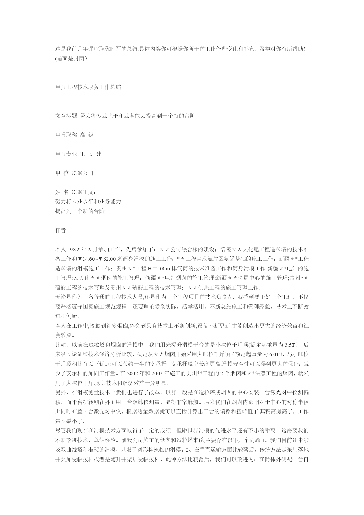 职称申报用专业技术工作总结-职称申报具体工作(可以直接使用,可编辑优秀版资料,欢迎下载)专业技术工作总结(个人通用版)1996年7月,我顺利完成了学业,从合肥工业大学土木工程系城市给水排水专业毕业,并于同年分配到原XXXX市XXXX局工作.参加工作以来,我一直从事XXX与管理工作,1999年8月,我取得了助理工程师的资格,并于同月被聘用至今。下面就从专业技术角度,对我这8年来的工作做一次全面总结:一、学习专业知识,提高岗位技能。本人于1996年7月正式参加工作,当时我被分配至原XXXX市XXX局XX室从事XX工作。工作伊始,我发现学校里学到的专业知识同实际工作有很大的不同和差距,为了尽快转变角色,适应工作的要求,我努力学习XX专业知识,努力提高自己的岗位技能,在短短的半年内,我通过自己的努力及同事的帮助,能比较熟练地进行较复杂的XXXX等日常事务工作。二、政治思想方面在政治上,我对自己严格要求,积极参加各项政治活动,自觉学习政治理论,尤其注重对“三个代表"重要思想的学习,努力提高自己的政治理论修养,努力实践“三个代表”的重要思想,思想上行动上同党中央保持一致.具有较强的大局意识和组织观念,工作上以事业为重,不计个人得失,在新的岗位上摆正位置,把XXXX的事业、把广大人民群众的利益放在首位,努力实践全心全意为人民服务的根本宗旨。在工作中做到公平公正、公道正派,具有较强的敬业精神和奉献精神,工作中吃苦耐劳,积极主动,作风踏实,不推诿扯皮,讲求效率.工作中注意调查研究,勤于思考,工作思路清晰,能把科研管理的一般理论同科研工作实际相结合,积极为本系统制订符合实际的科研发展目标和科研发展措施献计献策。在大是大非和原则面前做到毫不含糊,在XXX事业发展与改革中较好地发挥了一个干部应有的表率作用。三、组织协调方面在实际工作中,努力学会运用马克思主义的立场、观点和方法去分析、研究、解决问题,有一定的组织协调能力和科学决策水平。注意学习现代科研管理知识,较好地掌握了人文社科科研管理的一般规律。作为一名兼职的XXX管理工作者,能协助部门负责人做好职工的思想政治工作,为部门工作的有效开展提供了保障。在工作中既充分相信、放手使用分管的科级干部,又注意对他们进行培养,较好地发挥了他们的作用。四、业务能力方面从参加工作以来,努力学习本专业的理论知识和专业技能,重视不断提高自己的业务水平和教学能力,并根据XXX管理工作的实际需要,通过业余时间以不同形式学习,努力提高自己的专业技术能力和水平。通过多年的努力,本人的专业技术和驾驭工作的能力得到了较大幅度的提高,为更好的完成各项工作任务奠定了坚实的基础。参加工作以来,多次被评为“全市XXX管理工作先进个人”等荣誉称号.五、继续教育学习方面为了更好地适应当前的土地管理工作,在努力做好本职工作的同时。我十分注重继续再教育学习,多次参加各级部门组织的技术培训,2004年6月,我参加了XXXX市首期高级秘书职业培训,并取得高级秘书专业资格证书。参加工作以来,我积极承担XXX管理的各项工作任务,能够做到兢兢业业,圆满完成组织交办的各项工作任务,从不为自己的私事影响正常工作,能够积极的参加机关组织的各项活动,由于工作出色,多次受到局领导的肯定。六、专业科技成果方面自参加工作以来,本人积极参与本系统的《XXXX市XXX管理“十五"计划》的编纂工作,先后在《黑龙江环境通报》《中国国土资源报》《安徽日报》《安徽土地》《XXXX报》等多家报刊杂志上发表专业论文、信息稿件20余篇次,其中《XXXX现状及其对策》论文已被收录于大型文献《发展之路文集》,并荣获论文评比二等奖,为做好XXX管理的宣传工作发挥了积极作用。七、存在的问题XX管理工作的力作、亮点不多,开拓创新不够,在科研上投入不够,科研管理的决策能力和水平有待提高,重大成果较少等.在今后的工作中,我一定更加努力学习,运用所学知识努力探索XX保护工作的基本规律,不断改进工作方法,提高工作效率,踏踏实实,任劳任怨,勤奋工作,成为一名合格的XXX管理专业技术人员。XXX局:XXX年月日这是我前几年评审职称时写的总结,具体内容你可根据你所干的工作作些变化和补充。希望对你有所帮助!(前面是封面)申报工程技术职务工作总结文章标题努力将专业水平和业务能力提高到一个新的台阶申报职称高级申报专业工民建单位※※公司姓名※※正文:努力将专业水平和业务能力提高到一个新的台阶作者:本人198*年*月参加工作,先后参加了:**公司综合楼的建设;涪陵**大化肥工程造粒塔的技术准备工作和▼14.60~▼82.00米筒身滑模的施工工作;**工程合成氨片区氨罐基础的施工工作;新疆**工程造粒塔的滑模施工工作;