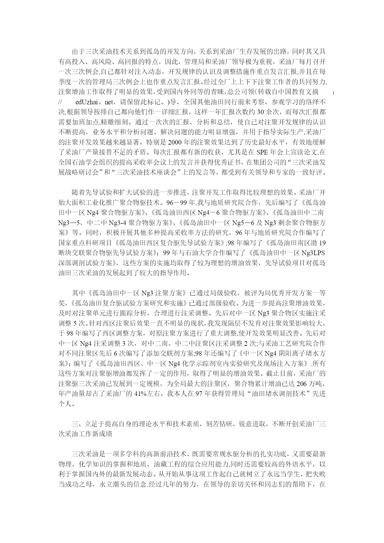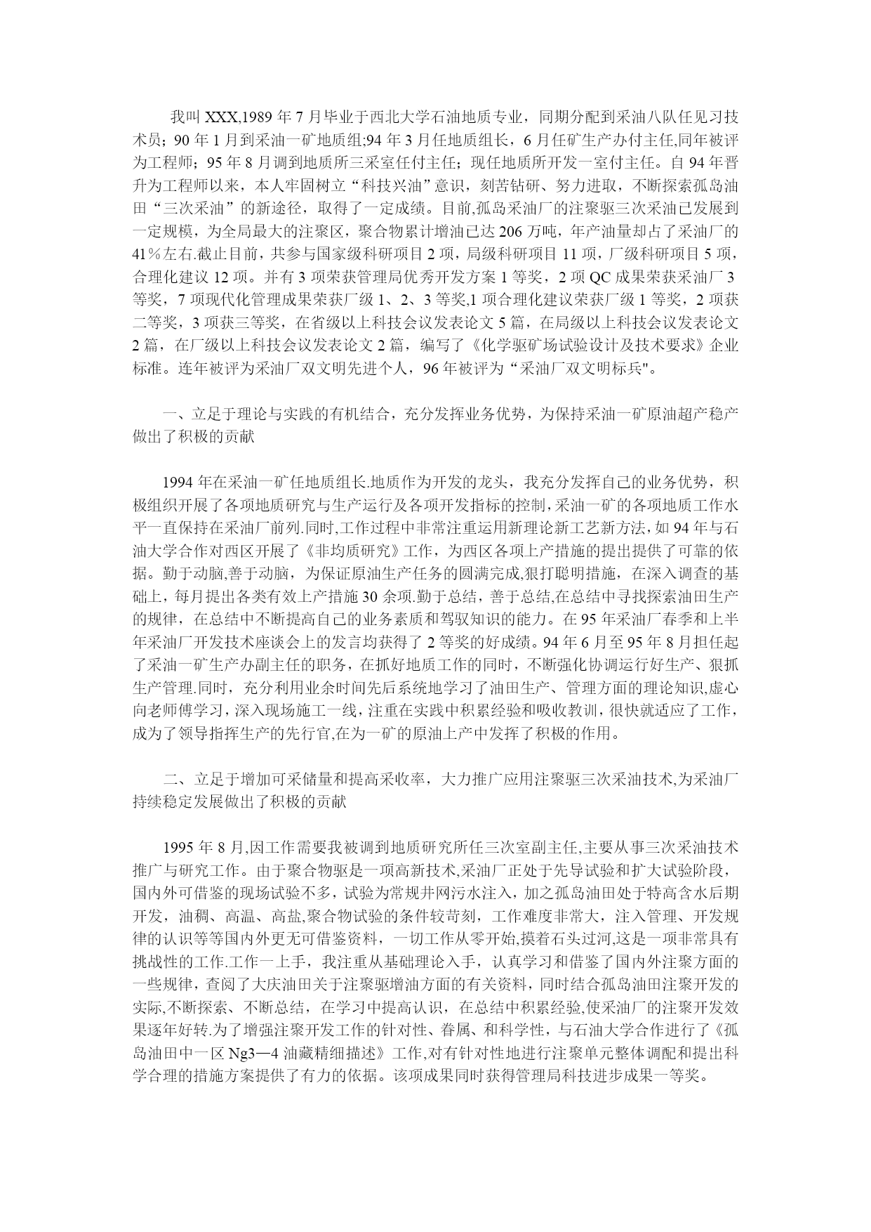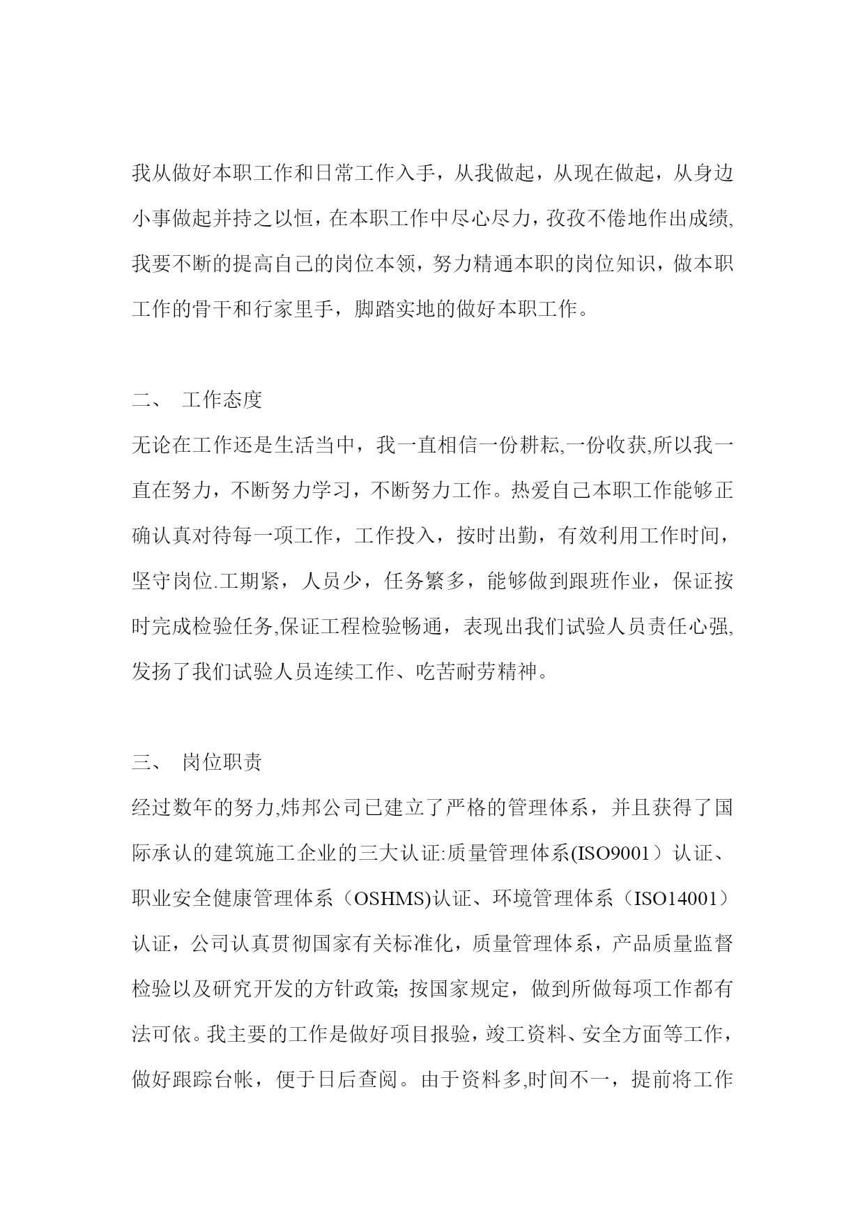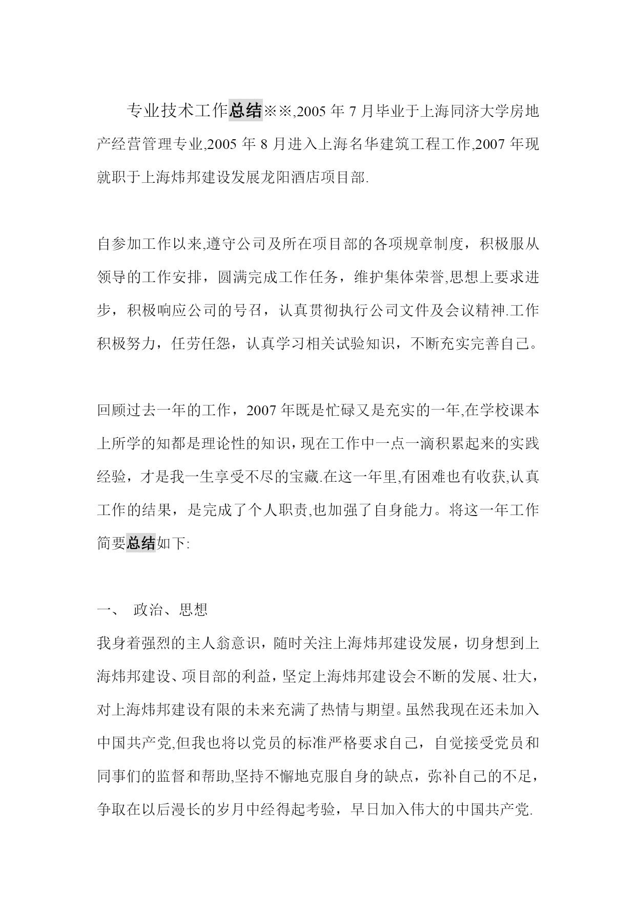 职称申报用专业技术工作总结-职称申报具体工作(可以直接使用,可编辑优秀版资料,欢迎下载)专业技术工作总结(个人通用版)1996年7月,我顺利完成了学业,从合肥工业大学土木工程系城市给水排水专业毕业,并于同年分配到原XXXX市XXXX局工作.参加工作以来,我一直从事XXX与管理工作,1999年8月,我取得了助理工程师的资格,并于同月被聘用至今。下面就从专业技术角度,对我这8年来的工作做一次全面总结:一、学习专业知识,提高岗位技能。本人于1996年7月正式参加工作,当时我被分配至原XXXX市XXX局XX室从事XX工作。工作伊始,我发现学校里学到的专业知识同实际工作有很大的不同和差距,为了尽快转变角色,适应工作的要求,我努力学习XX专业知识,努力提高自己的岗位技能,在短短的半年内,我通过自己的努力及同事的帮助,能比较熟练地进行较复杂的XXXX等日常事务工作。二、政治思想方面在政治上,我对自己严格要求,积极参加各项政治活动,自觉学习政治理论,尤其注重对“三个代表"重要思想的学习,努力提高自己的政治理论修养,努力实践“三个代表”的重要思想,思想上行动上同党中央保持一致.具有较强的大局意识和组织观念,工作上以事业为重,不计个人得失,在新的岗位上摆正位置,把XXXX的事业、把广大人民群众的利益放在首位,努力实践全心全意为人民服务的根本宗旨。在工作中做到公平公正、公道正派,具有较强的敬业精神和奉献精神,工作中吃苦耐劳,积极主动,作风踏实,不推诿扯皮,讲求效率.工作中注意调查研究,勤于思考,工作思路清晰,能把科研管理的一般理论同科研工作实际相结合,积极为本系统制订符合实际的科研发展目标和科研发展措施献计献策。在大是大非和原则面前做到毫不含糊,在XXX事业发展与改革中较好地发挥了一个干部应有的表率作用。三、组织协调方面在实际工作中,努力学会运用马克思主义的立场、观点和方法去分析、研究、解决问题,有一定的组织协调能力和科学决策水平。注意学习现代科研管理知识,较好地掌握了人文社科科研管理的一般规律。作为一名兼职的XXX管理工作者,能协助部门负责人做好职工的思想政治工作,为部门工作的有效开展提供了保障。在工作中既充分相信、放手使用分管的科级干部,又注意对他们进行培养,较好地发挥了他们的作用。四、业务能力方面从参加工作以来,努力学习本专业的理论知识和专业技能,重视不断提高自己的业务水平和教学能力,并根据XXX管理工作的实际需要,通过业余时间以不同形式学习,努力提高自己的专业技术能力和水平。通过多年的努力,本人的专业技术和驾驭工作的能力得到了较大幅度的提高,为更好的完成各项工作任务奠定了坚实的基础。参加工作以来,多次被评为“全市XXX管理工作先进个人”等荣誉称号.五、继续教育学习方面为了更好地适应当前的土地管理工作,在努力做好本职工作的同时。我十分注重继续再教育学习,多次参加各级部门组织的技术培训,2004年6月,我参加了XXXX市首期高级秘书职业培训,并取得高级秘书专业资格证书。参加工作以来,我积极承担XXX管理的各项工作任务,能够做到兢兢业业,圆满完成组织交办的各项工作任务,从不为自己的私事影响正常工作,能够积极的参加机关组织的各项活动,由于工作出色,多次受到局领导的肯定。六、专业科技成果方面自参加工作以来,本人积极参与本系统的《XXXX市XXX管理“十五"计划》的编纂工作,先后在《黑龙江环境通报》《中国国土资源报》《安徽日报》《安徽土地》《XXXX报》等多家报刊杂志上发表专业论文、信息稿件20余篇次,其中《XXXX现状及其对策》论文已被收录于大型文献《发展之路文集》,并荣获论文评比二等奖,为做好XXX管理的宣传工作发挥了积极作用。七、存在的问题XX管理工作的力作、亮点不多,开拓创新不够,在科研上投入不够,科研管理的决策能力和水平有待提高,重大成果较少等.在今后的工作中,我一定更加努力学习,运用所学知识努力探索XX保护工作的基本规律,不断改进工作方法,提高工作效率,踏踏实实,任劳任怨,勤奋工作,成为一名合格的XXX管理专业技术人员。XXX局:XXX年月日这是我前几年评审职称时写的总结,具体内容你可根据你所干的工作作些变化和补充。希望对你有所帮助!(前面是封面)申报工程技术职务工作总结文章标题努力将专业水平和业务能力提高到一个新的台阶申报职称高级申报专业工民建单位※※公司姓名※※正文:努力将专业水平和业务能力提高到一个新的台阶作者:本人198*年*月参加工作,先后参加了:**公司综合楼的建设;涪陵**大化肥工程造粒塔的技术准备工作和▼14.60~▼82.00米筒身滑模的施工工作;**工程合成氨片区氨罐基础的施工工作;新疆**工程造粒塔的滑模施工工作;
