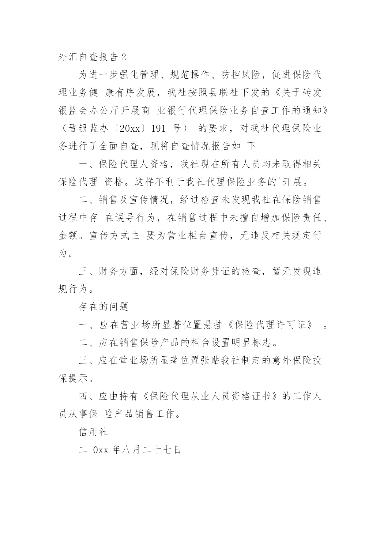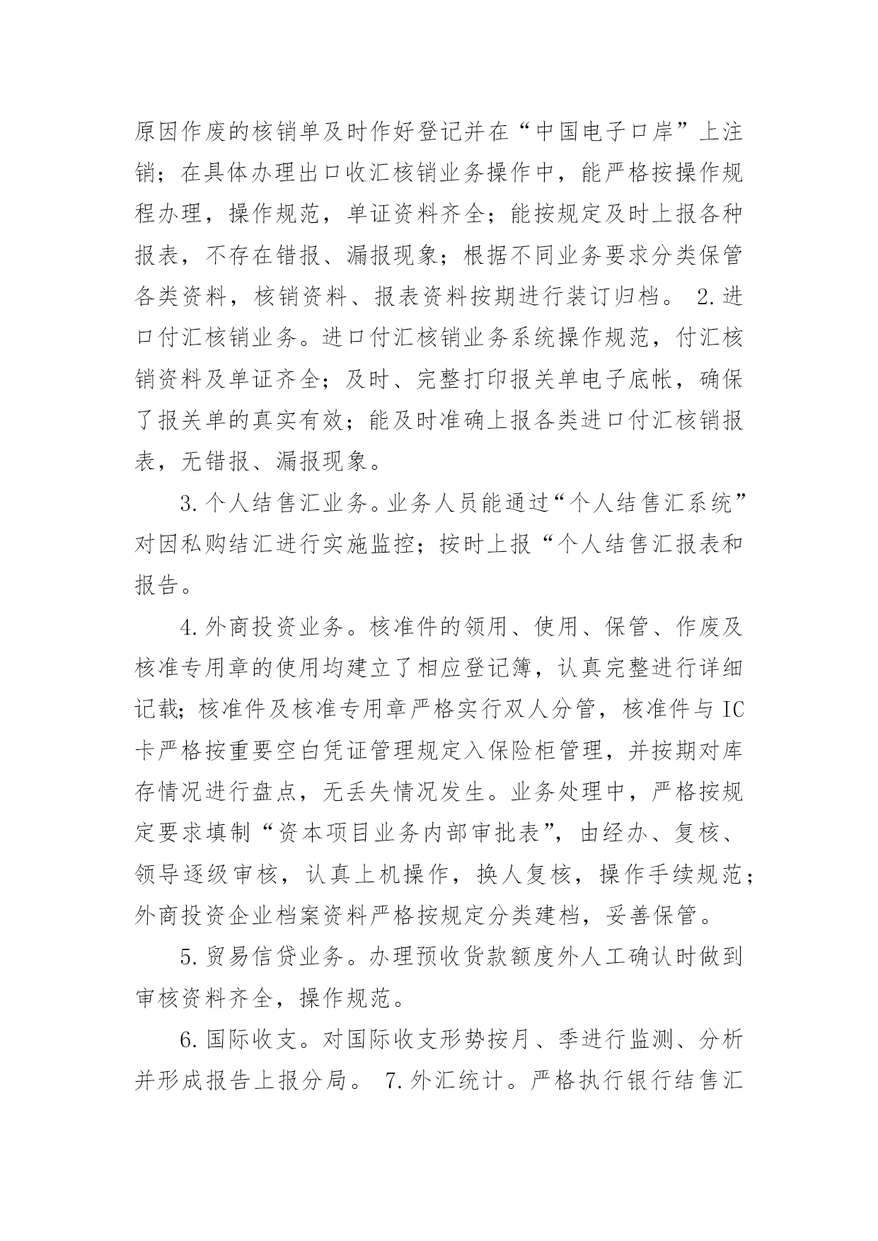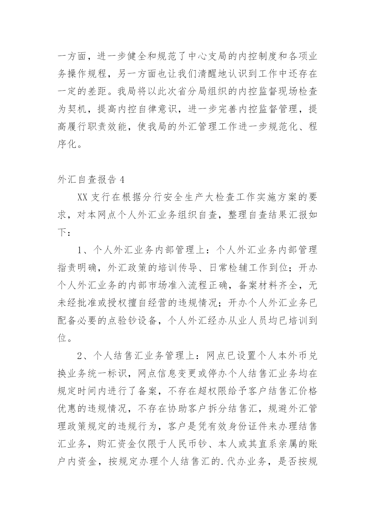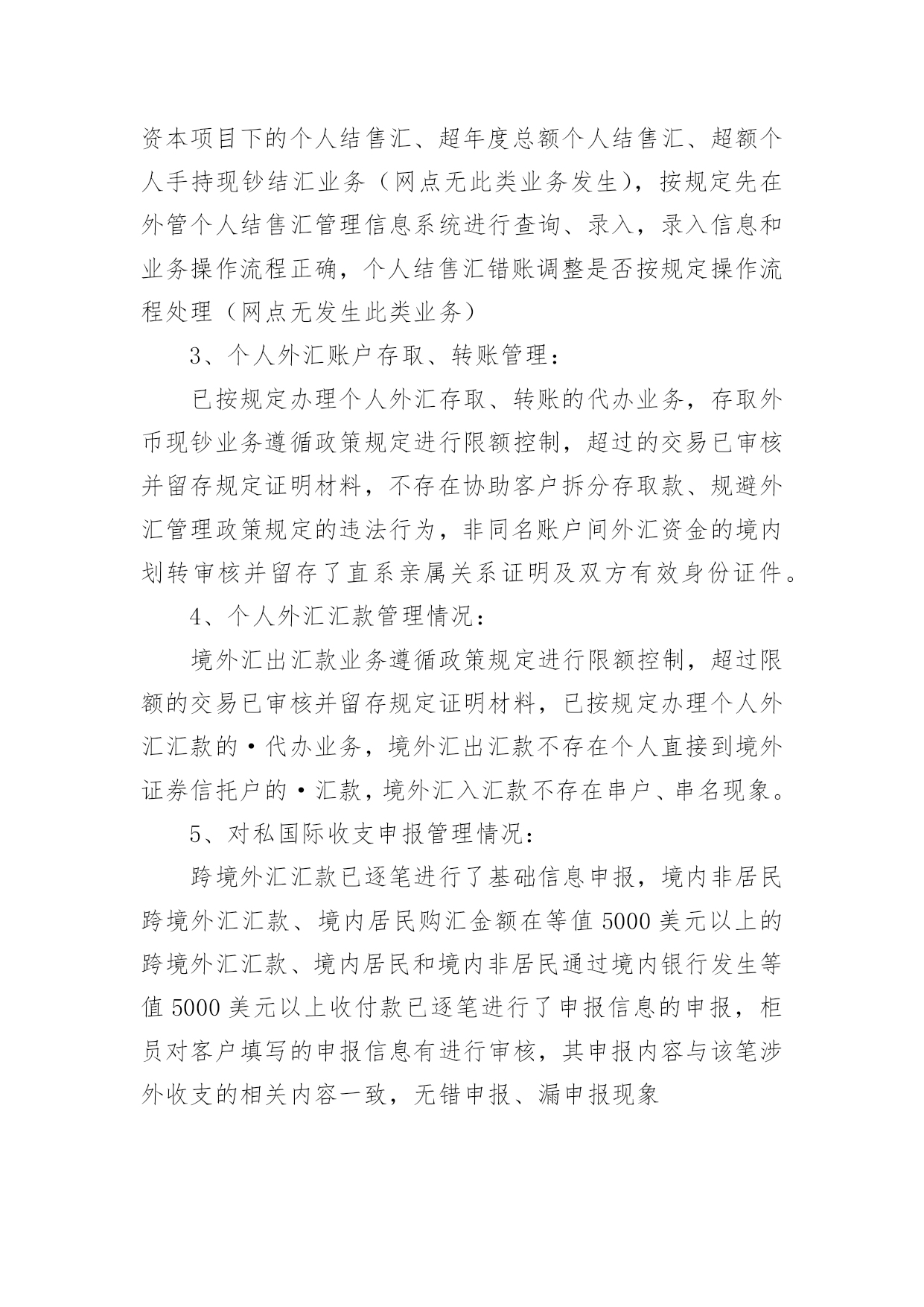 外汇自查报告随着社会不断地进步,报告十分的重要,我们在写报告的时候要注意涵盖报告的基本要素。其实写报告并没有想象中那么难,下面是小编整理的外汇自查报告,欢迎大家分享。外汇自查报告1XX支行在根据分行安全生产大检查工作实施方案的要求,对本网点个人外汇业务组织自查,整理自查结果汇报如下:1、个人外汇业务内部管理上:个人外汇业务内部管理指责明确,外汇政策的培训传导、日常检辅工作到位;开办个人外汇业务的内部市场准入流程正确,备案材料齐全,无未经批准或授权擅自经营的违规情况;开办个人外汇业务已配备必要的点验钞设备,个人外汇经办从业人员均已培训到位。2、个人结售汇业务管理上:网点已设置个人本外币兑换业务统一标识,网点信息变更或停办个人结售汇业务均在规定时间内进行了备案,不存在超权限给予客户结售汇价格优惠的`违规情况,不存在协助客户拆分结售汇,规避外汇管理政策规定的违规行为,客户是凭有效身份证件来办理结售汇业务,购汇资金仅限于人民币钞、本人或其直系亲属的账户内资金,按规定办理个人结售汇的代办业务,是否按规定审核留存相关证明材料办理资本项目下的个人结售汇、超年度总额个人结售汇、超额个人手持现钞结汇业务(网点无此类业务发生),按规定先在外管个人结售汇管理信息系统进行查询、录入,录入信息和业务操作流程正确,个人结售汇错账调整是否按规定操作流程处理(网点无发生此类业务)3、个人外汇账户存取、转账管理:已按规定办理个人外汇存取、转账的代办业务,存取外币现钞业务遵循政策规定进行限额控制,超过的交易已审核并留存规定证明材料,不存在协助客户拆分存取款、规避外汇管理政策规定的违法行为,非同名账户间外汇资金的境内划转审核并留存了直系亲属关系证明及双方有效身份证件。4、个人外汇汇款管理情况:境外汇出汇款业务遵循政策规定进行限额控制,超过限额的交易已审核并留存规定证明材料,已按规定办理个人外汇汇款的·代办业务,境外汇出汇款不存在个人直接到境外证券信托户的·汇款,境外汇入汇款不存在串户、串名现象。5、对私国际收支申报管理情况:跨境外汇汇款已逐笔进行了基础信息申报,境内非居民跨境外汇汇款、境内居民购汇金额在等值5000美元以上的跨境外汇汇款、境内居民和境内非居民通过境内银行发生等值5000美元以上收付款已逐笔进行了申报信息的申报,柜员对客户填写的申报信息有进行审核,其申报内容与该笔涉外收支的相关内容一致,无错申报、漏申报现象外汇自查报告2为进一步强化管理、规范操作、防控风险,促进保险代理业务健康有序发展,我社按照县联社下发的《关于转发银监会办公厅开展商业银行代理保险业务自查工作的通知》(晋银监办〔20xx〕191号)的要求,对我社代理保险业务进行了全面自查,现将自查情况报告如下一、保险代理人资格,我社现在所有人员均未取得相关保险代理资格。这样不利于我社代理保险业务的'开展。二、销售及宣传情况,经过检查未发现我社在保险销售过程中存在误导行为,在销售过程中未擅自增加保险责任、金额。宣传方式主要为营业柜台宣传,无违反相关规定行为。三、财务方面,经对保险财务凭证的检查,暂无发现违规行为。存在的问题一、应在营业场所显著位置悬挂《保险代理许可证》。二、应在销售保险产品的柜台设置明显标志。三、应在营业场所显著位置张贴我社制定的意外保险投保提示。四、应由持有《保险代理从业人员资格证书》的工作人员从事保险产品销售工作。信用社二0xx年八月二十七日外汇自查报告3xx银行基础金融服务情况汇报xx银行辖内设立营业网点x个,其中:农村网点x个,城区网点x个,从业人员x人。根据银监局相关要求,我行对辖内基础金融“村村通”服务情况进行了调查,现汇报如下:一、基本情况截止9月末,我行在辖内x个网点共布放自助取款机x台、存取款一体机x台;布放POS机x台,其他机具x台,其中:助农取款服务机具x台,自助机具到村覆盖率x%,累计办理查询、存取款及转账业务x余万笔。全行累计发行福祥卡x万张,拓展手机银行用户x户,网上银行用户x户,累计办理各项查询、转账、缴费业务x余万笔。累计代理发放各项涉农补贴x万笔、金额x万元。二、主要做法(一)领导重视,统筹安排作为服务农村金融的主力军,xx银行坚持“改制不改向、更名不改姓”,始终坚持立足农村、支持农业、服务农业的“三农”服务理念,董事会下设成立了专门的三农发展规划委员会,统筹安排农村金融服务工作。(二)开展宣传,稳步推进近年来,我行先后开展了送金融知识下乡宣传活动x场、手机银行业务推广宣传x次、金融知识进校园专题活动x次;举办了“xx杯”xx比赛、xx走进x银行、xx有礼助学活动等宣传x场;在x个营业网点布放宣传展台x份、业务宣传资料x余份,对辖内基础金融服务进行了广泛宣传和推广。(三)合理规划,拓展服务年初,我行就对辖内布放自助设备及自助机具进行了合理规划,对金