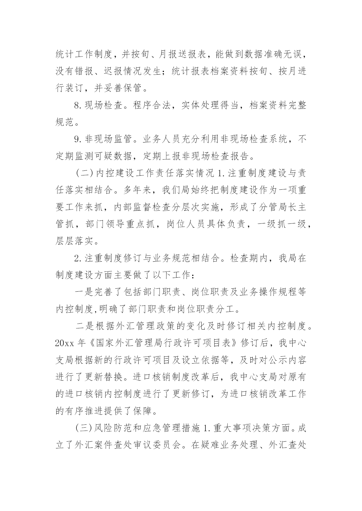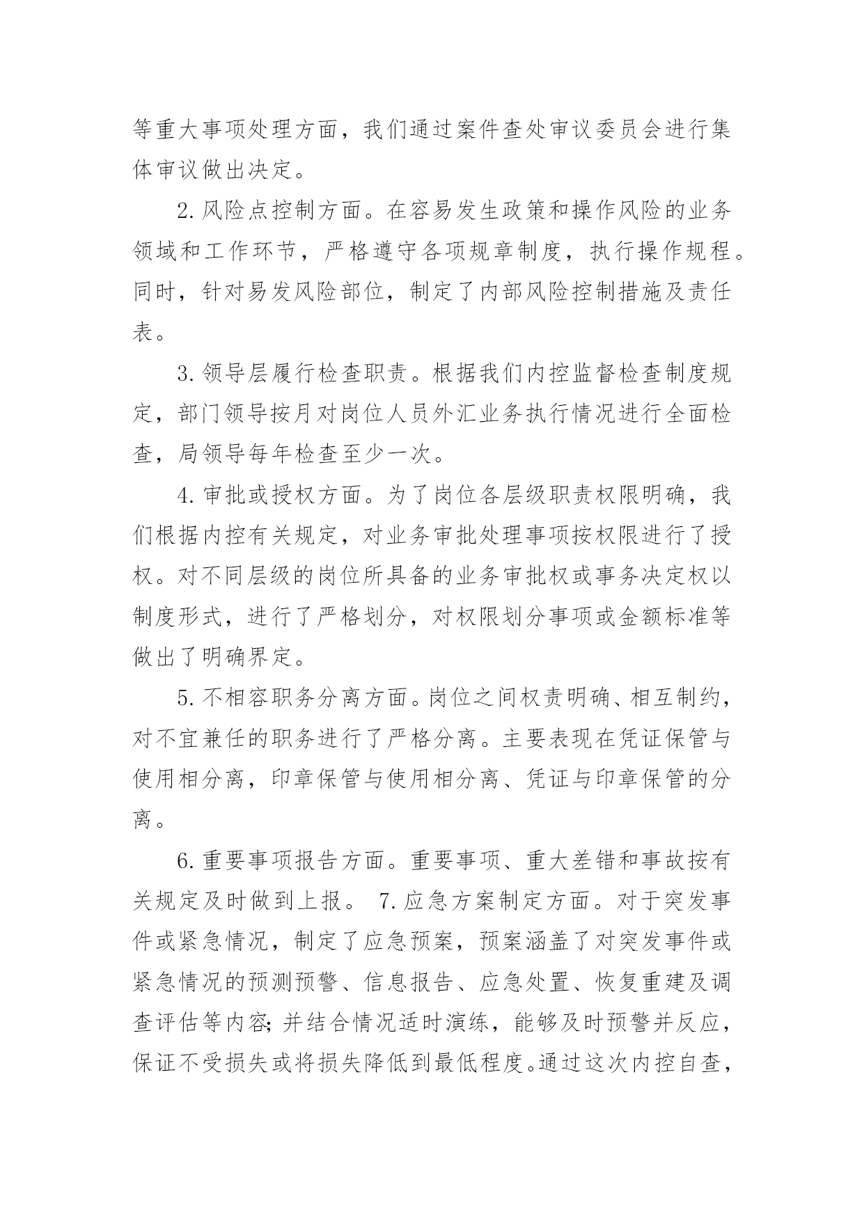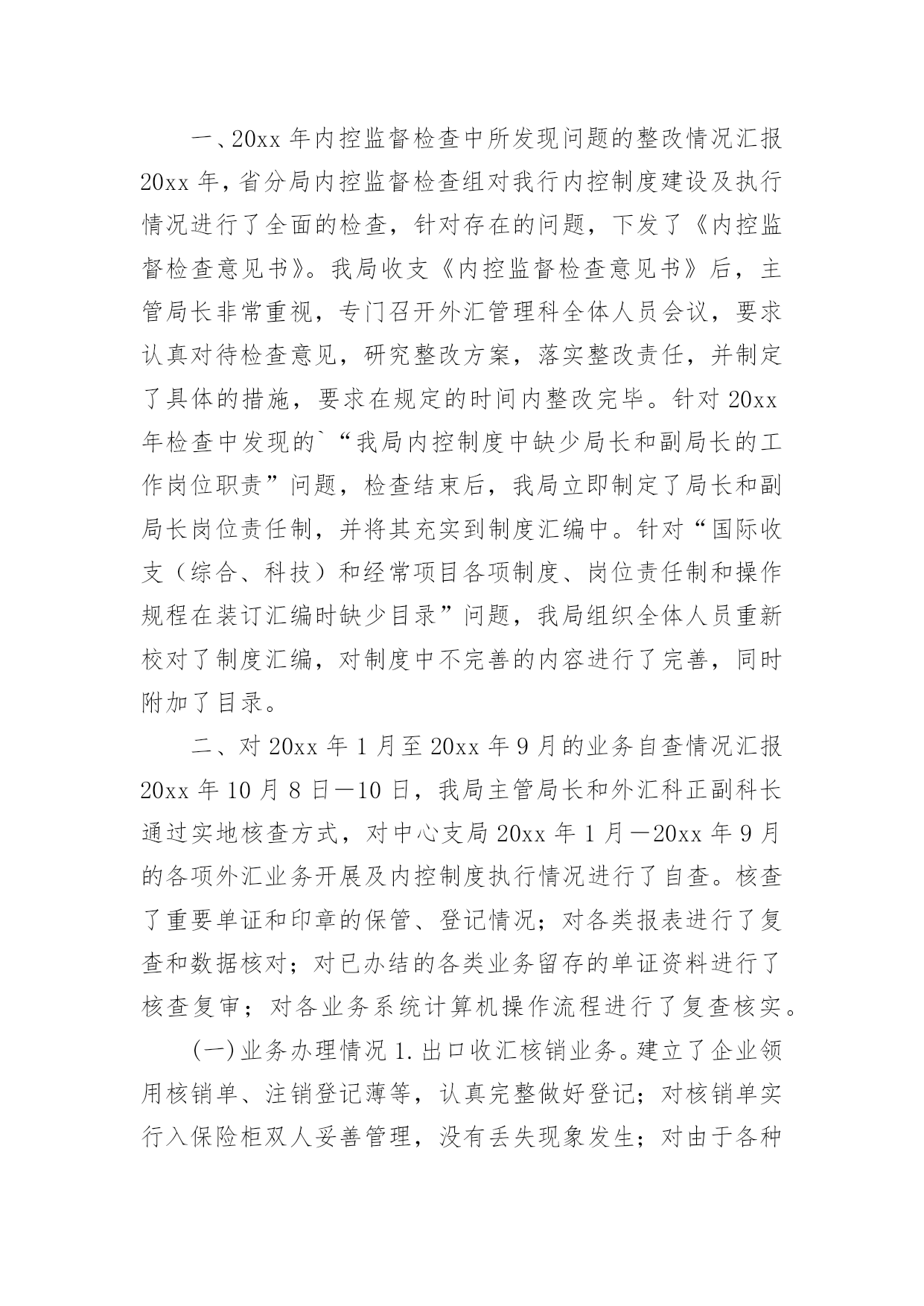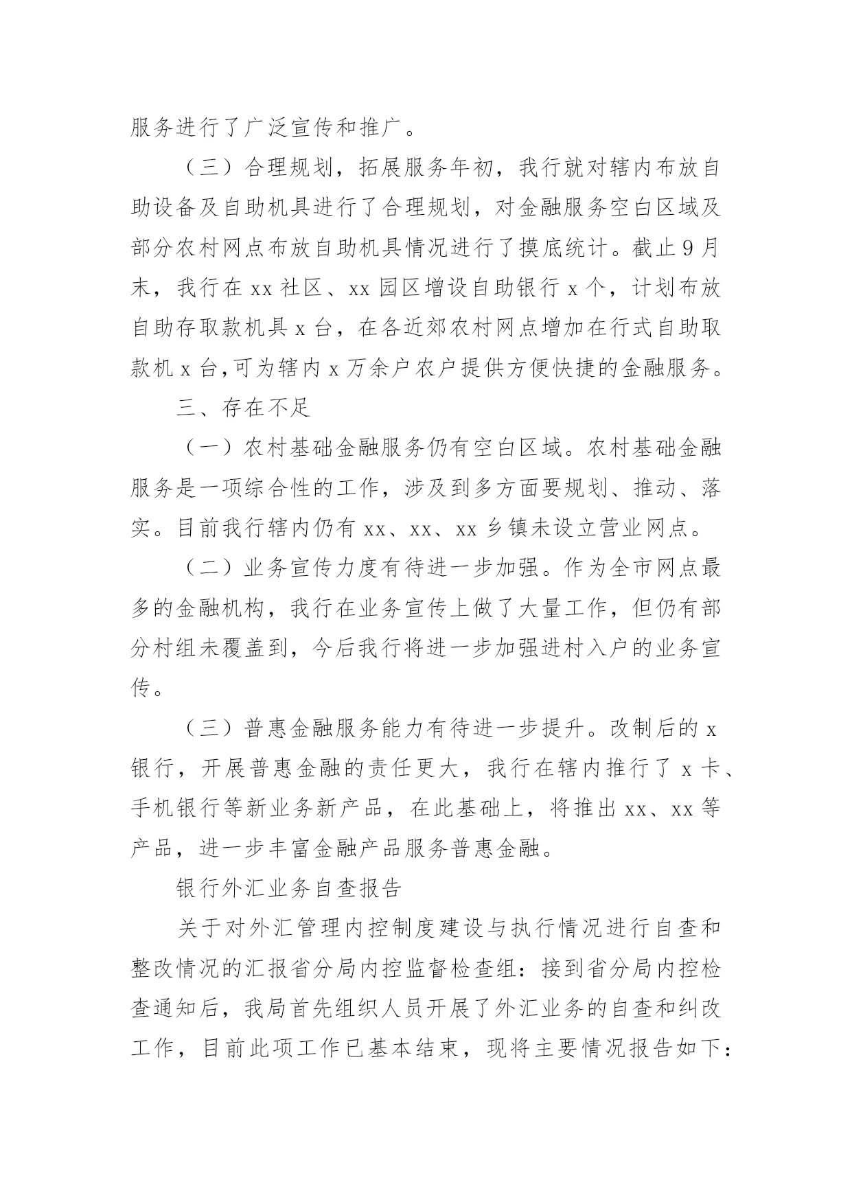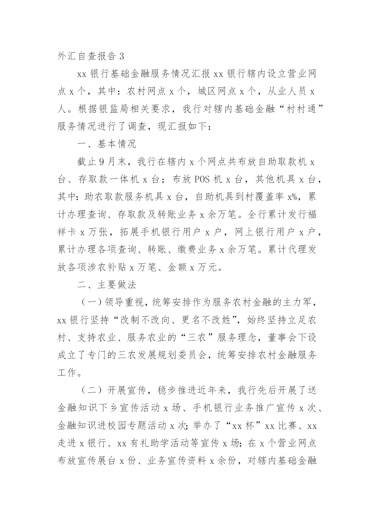 外汇自查报告随着社会不断地进步,报告十分的重要,我们在写报告的时候要注意涵盖报告的基本要素。其实写报告并没有想象中那么难,下面是小编整理的外汇自查报告,欢迎大家分享。外汇自查报告1XX支行在根据分行安全生产大检查工作实施方案的要求,对本网点个人外汇业务组织自查,整理自查结果汇报如下:1、个人外汇业务内部管理上:个人外汇业务内部管理指责明确,外汇政策的培训传导、日常检辅工作到位;开办个人外汇业务的内部市场准入流程正确,备案材料齐全,无未经批准或授权擅自经营的违规情况;开办个人外汇业务已配备必要的点验钞设备,个人外汇经办从业人员均已培训到位。2、个人结售汇业务管理上:网点已设置个人本外币兑换业务统一标识,网点信息变更或停办个人结售汇业务均在规定时间内进行了备案,不存在超权限给予客户结售汇价格优惠的`违规情况,不存在协助客户拆分结售汇,规避外汇管理政策规定的违规行为,客户是凭有效身份证件来办理结售汇业务,购汇资金仅限于人民币钞、本人或其直系亲属的账户内资金,按规定办理个人结售汇的代办业务,是否按规定审核留存相关证明材料办理资本项目下的个人结售汇、超年度总额个人结售汇、超额个人手持现钞结汇业务(网点无此类业务发生),按规定先在外管个人结售汇管理信息系统进行查询、录入,录入信息和业务操作流程正确,个人结售汇错账调整是否按规定操作流程处理(网点无发生此类业务)3、个人外汇账户存取、转账管理:已按规定办理个人外汇存取、转账的代办业务,存取外币现钞业务遵循政策规定进行限额控制,超过的交易已审核并留存规定证明材料,不存在协助客户拆分存取款、规避外汇管理政策规定的违法行为,非同名账户间外汇资金的境内划转审核并留存了直系亲属关系证明及双方有效身份证件。4、个人外汇汇款管理情况:境外汇出汇款业务遵循政策规定进行限额控制,超过限额的交易已审核并留存规定证明材料,已按规定办理个人外汇汇款的·代办业务,境外汇出汇款不存在个人直接到境外证券信托户的·汇款,境外汇入汇款不存在串户、串名现象。5、对私国际收支申报管理情况:跨境外汇汇款已逐笔进行了基础信息申报,境内非居民跨境外汇汇款、境内居民购汇金额在等值5000美元以上的跨境外汇汇款、境内居民和境内非居民通过境内银行发生等值5000美元以上收付款已逐笔进行了申报信息的申报,柜员对客户填写的申报信息有进行审核,其申报内容与该笔涉外收支的相关内容一致,无错申报、漏申报现象外汇自查报告2为进一步强化管理、规范操作、防控风险,促进保险代理业务健康有序发展,我社按照县联社下发的《关于转发银监会办公厅开展商业银行代理保险业务自查工作的通知》(晋银监办〔20xx〕191号)的要求,对我社代理保险业务进行了全面自查,现将自查情况报告如下一、保险代理人资格,我社现在所有人员均未取得相关保险代理资格。这样不利于我社代理保险业务的'开展。二、销售及宣传情况,经过检查未发现我社在保险销售过程中存在误导行为,在销售过程中未擅自增加保险责任、金额。宣传方式主要为营业柜台宣传,无违反相关规定行为。三、财务方面,经对保险财务凭证的检查,暂无发现违规行为。存在的问题一、应在营业场所显著位置悬挂《保险代理许可证》。二、应在销售保险产品的柜台设置明显标志。三、应在营业场所显著位置张贴我社制定的意外保险投保提示。四、应由持有《保险代理从业人员资格证书》的工作人员从事保险产品销售工作。信用社二0xx年八月二十七日外汇自查报告3xx银行基础金融服务情况汇报xx银行辖内设立营业网点x个,其中:农村网点x个,城区网点x个,从业人员x人。根据银监局相关要求,我行对辖内基础金融“村村通”服务情况进行了调查,现汇报如下:一、基本情况截止9月末,我行在辖内x个网点共布放自助取款机x台、存取款一体机x台;布放POS机x台,其他机具x台,其中:助农取款服务机具x台,自助机具到村覆盖率x%,累计办理查询、存取款及转账业务x余万笔。全行累计发行福祥卡x万张,拓展手机银行用户x户,网上银行用户x户,累计办理各项查询、转账、缴费业务x余万笔。累计代理发放各项涉农补贴x万笔、金额x万元。二、主要做法(一)领导重视,统筹安排作为服务农村金融的主力军,xx银行坚持“改制不改向、更名不改姓”,始终坚持立足农村、支持农业、服务农业的“三农”服务理念,董事会下设成立了专门的三农发展规划委员会,统筹安排农村金融服务工作。(二)开展宣传,稳步推进近年来,我行先后开展了送金融知识下乡宣传活动x场、手机银行业务推广宣传x次、金融知识进校园专题活动x次;举办了“xx杯”xx比赛、xx走进x银行、xx有礼助学活动等宣传x场;在x个营业网点布放宣传展台x份、业务宣传资料x余份,对辖内基础金融服务进行了广泛宣传和推广。(三)合理规划,拓展服务年初,我行就对辖内布放自助设备及自助机具进行了合理规划,对金