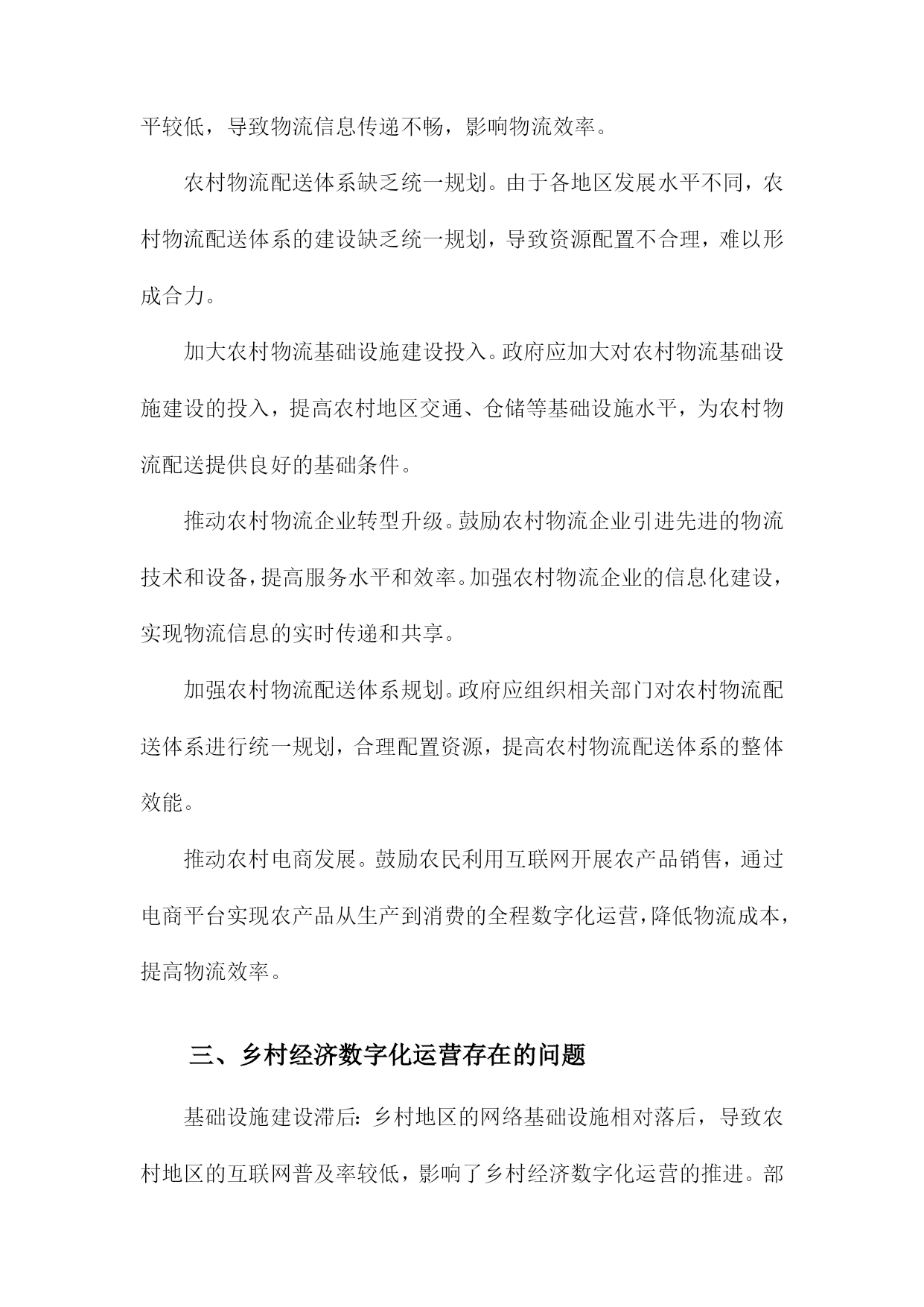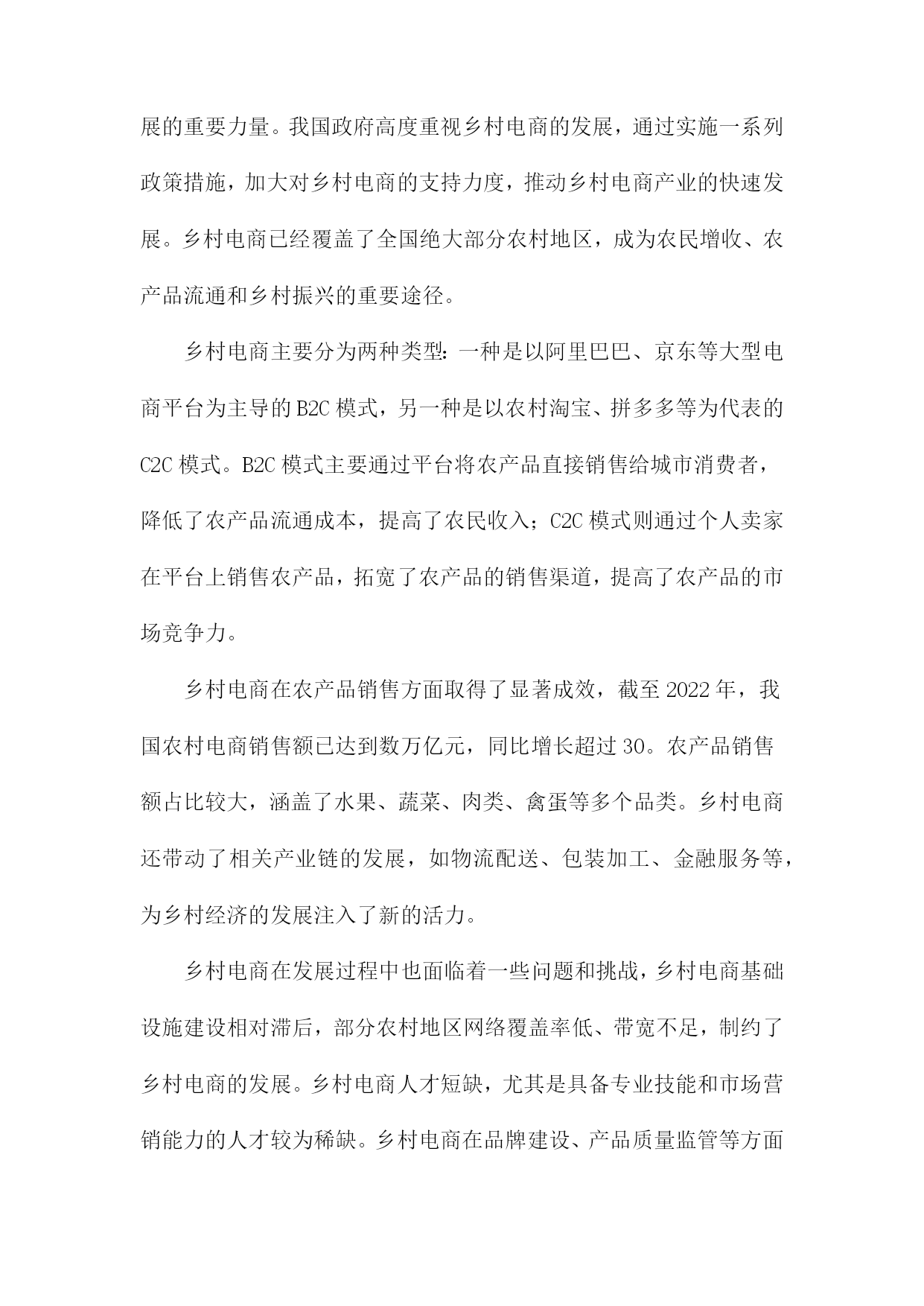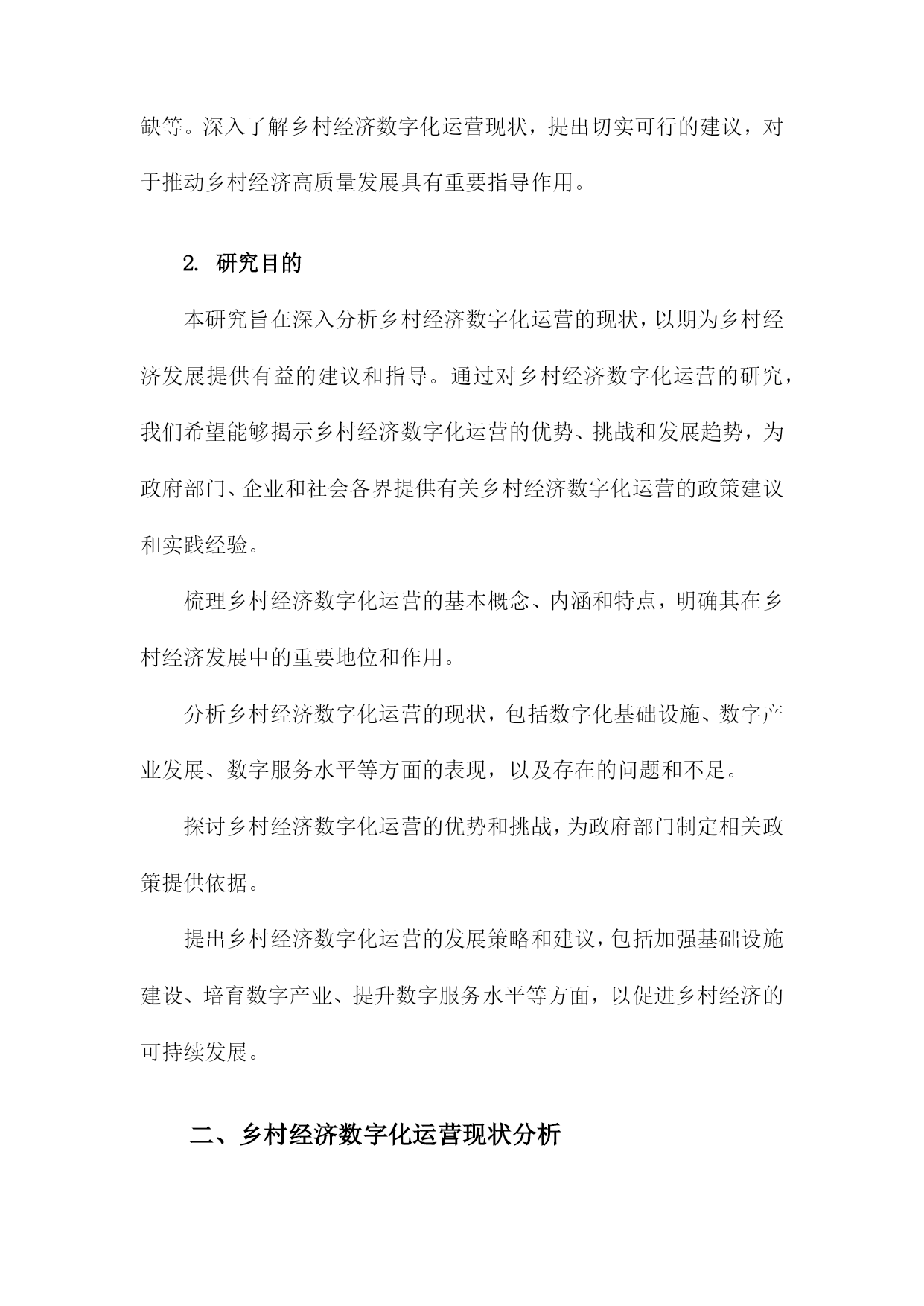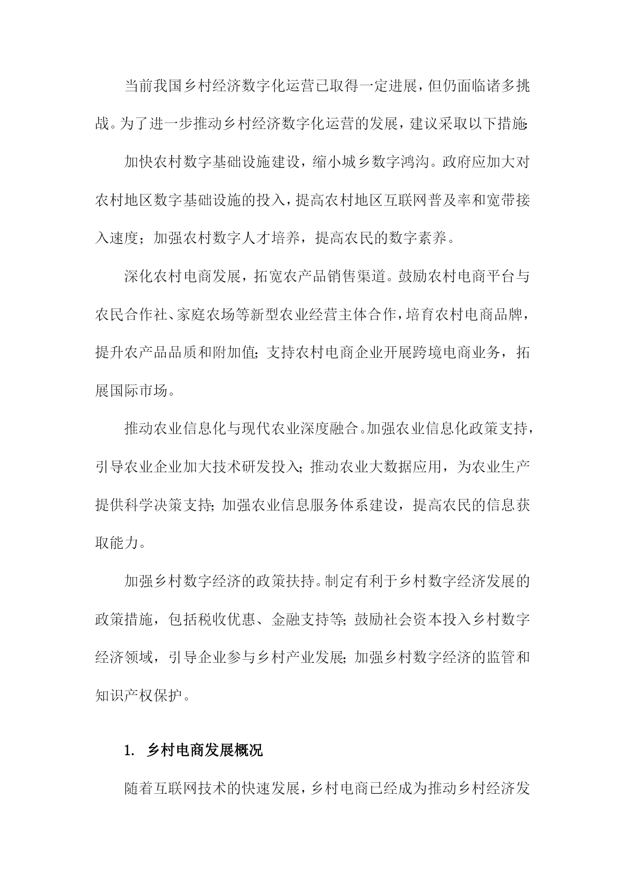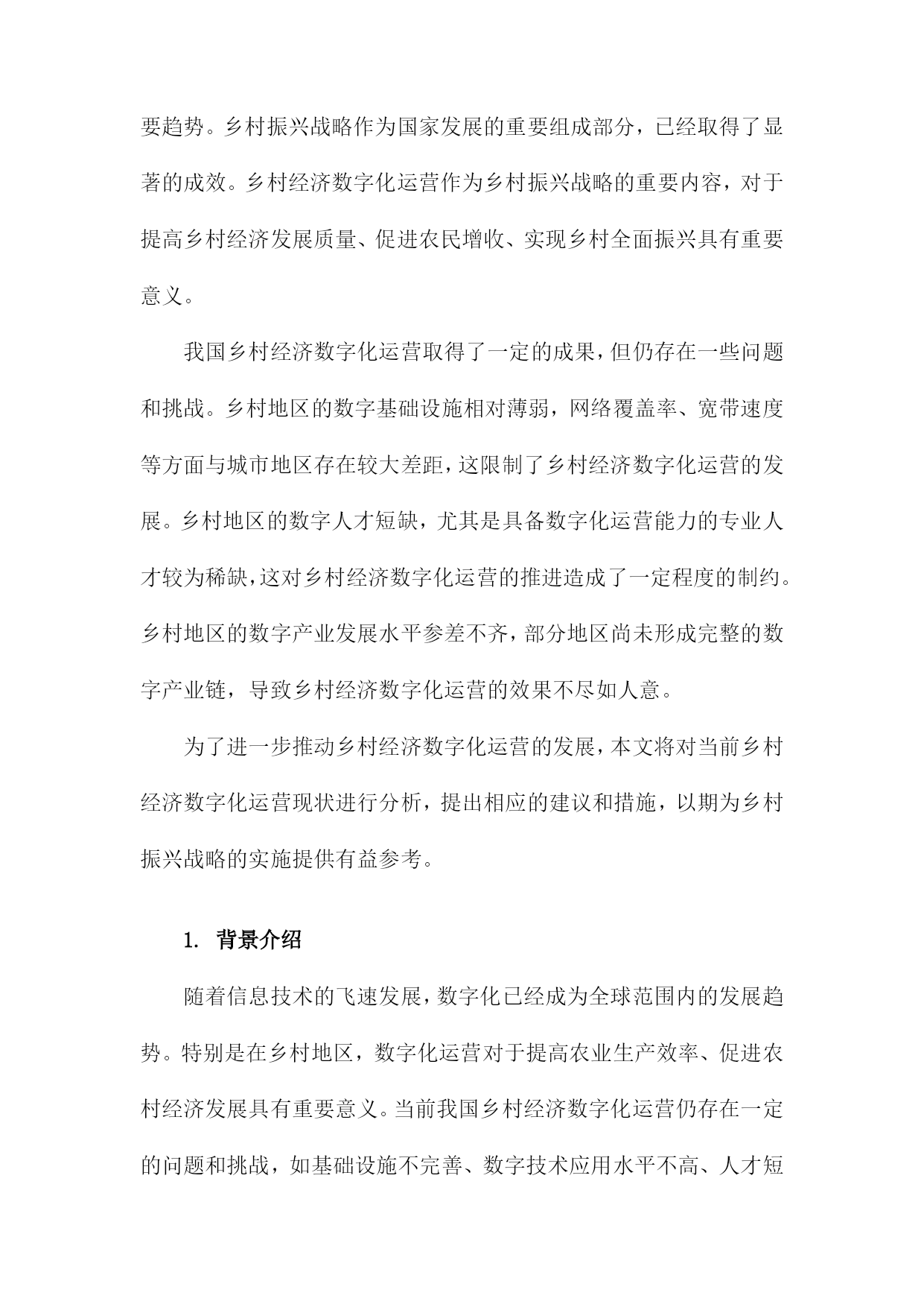 乡村经济数字化运营现状及建议目录一、前言....................................................11.背景介绍..............................................12.研究目的..............................................2二、乡村经济数字化运营现状分析..............................31.乡村电商发展概况......................................52.农产品线上销售情况....................................63.农村物流配送体系......................................8三、乡村经济数字化运营存在的问题............................91.基础设施不足.........................................102.人才短缺.............................................113.产业结构单一.........................................12四、乡村经济数字化运营建议.................................131.加强基础设施建设.....................................142.培养数字化人才.......................................163.优化产业结构,拓展多元化经营模式......................17五、结论与展望.............................................18一、前言随着信息技术的飞速发展,数字化已经成为全球范围内的一种重要趋势。乡村振兴战略作为国家发展的重要组成部分,已经取得了显著的成效。乡村经济数字化运营作为乡村振兴战略的重要内容,对于提高乡村经济发展质量、促进农民增收、实现乡村全面振兴具有重要意义。我国乡村经济数字化运营取得了一定的成果,但仍存在一些问题和挑战。乡村地区的数字基础设施相对薄弱,网络覆盖率、宽带速度等方面与城市地区存在较大差距,这限制了乡村经济数字化运营的发展。乡村地区的数字人才短缺,尤其是具备数字化运营能力的专业人才较为稀缺,这对乡村经济数字化运营的推进造成了一定程度的制约。乡村地区的数字产业发展水平参差不齐,部分地区尚未形成完整的数字产业链,导致乡村经济数字化运营的效果不尽如人意。为了进一步推动乡村经济数字化运营的发展,本文将对当前乡村经济数字化运营现状进行分析,提出相应的建议和措施,以期为乡村振兴战略的实施提供有益参考。1.背景介绍随着信息技术的飞速发展,数字化已经成为全球范围内的发展趋势。特别是在乡村地区,数字化运营对于提高农业生产效率、促进农村经济发展具有重要意义。当前我国乡村经济数字化运营仍存在一定的问题和挑战,如基础设施不完善、数字技术应用水平不高、人才短缺等。深入了解乡村经济数字化运营现状,提出切实可行的建议,对于推动乡村经济高质量发展具有重要指导作用。2.研究目的本研究旨在深入分析乡村经济数字化运营的现状,以期为乡村经济发展提供有益的建议和指导。通过对乡村经济数字化运营的研究,我们希望能够揭示乡村经济数字化运营的优势、挑战和发展趋势,为政府部门、企业和社会各界提供有关乡村经济数字化运营的政策建议和实践经验。梳理乡村经济数字化运营的基本概念、内涵和特点,明确其在乡村经济发展中的重要地位和作用。分析乡村经济数字化运营的现状,包括数字化基础设施、数字产业发展、数字服务水平等方面的表现,以及存在的问题和不足。探讨乡村经济数字化运营的优势和挑战,为政府部门制定相关政策提供依据。提出乡村经济数字化运营的发展策略和建议,包括加强基础设施建设、培育数字产业、提升数字服务水平等方面,以促进乡村经济的可持续发展。二、乡村经济数字化运营现状分析电子商务逐渐普及。随着电商平台如阿里巴巴、京东等在乡村地区的布局和发展,越来越多的农民通过网络销售农产品,拓宽了销售渠道,提高了农产品的附加值。乡村旅游、手工艺品等特色产业也逐渐通过电商平台进行推广和销售。信息化服务水平不断提高。政府部门积极推动乡村信息化建设,通过建立乡村信息服务平台、提供农业信息化培训等方式,提高农民的信息素养和技术水平。一些互联网企业也在乡村地区开展信息服务业务,为农民提供农业生产、农村金融等方面的咨询和服务。数字技术在农业生产中的应用逐步深入