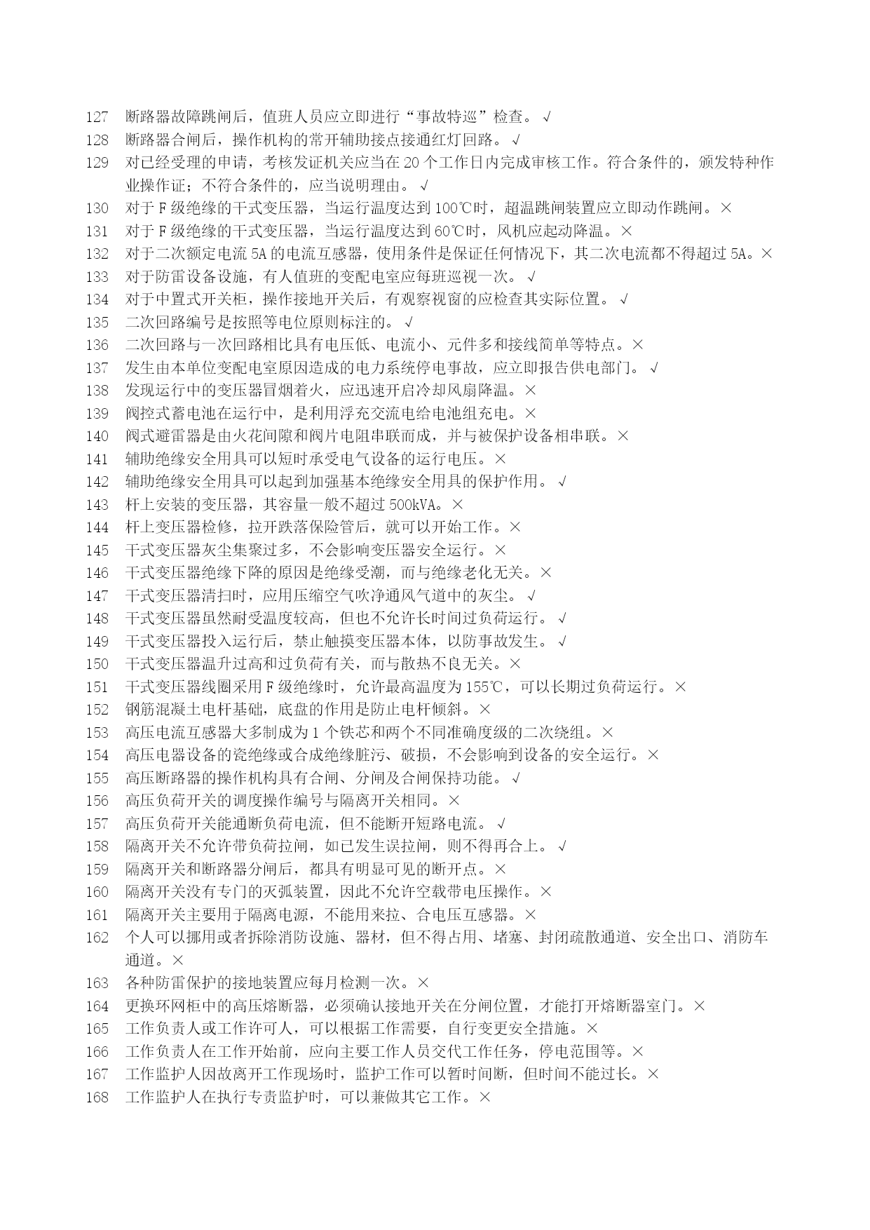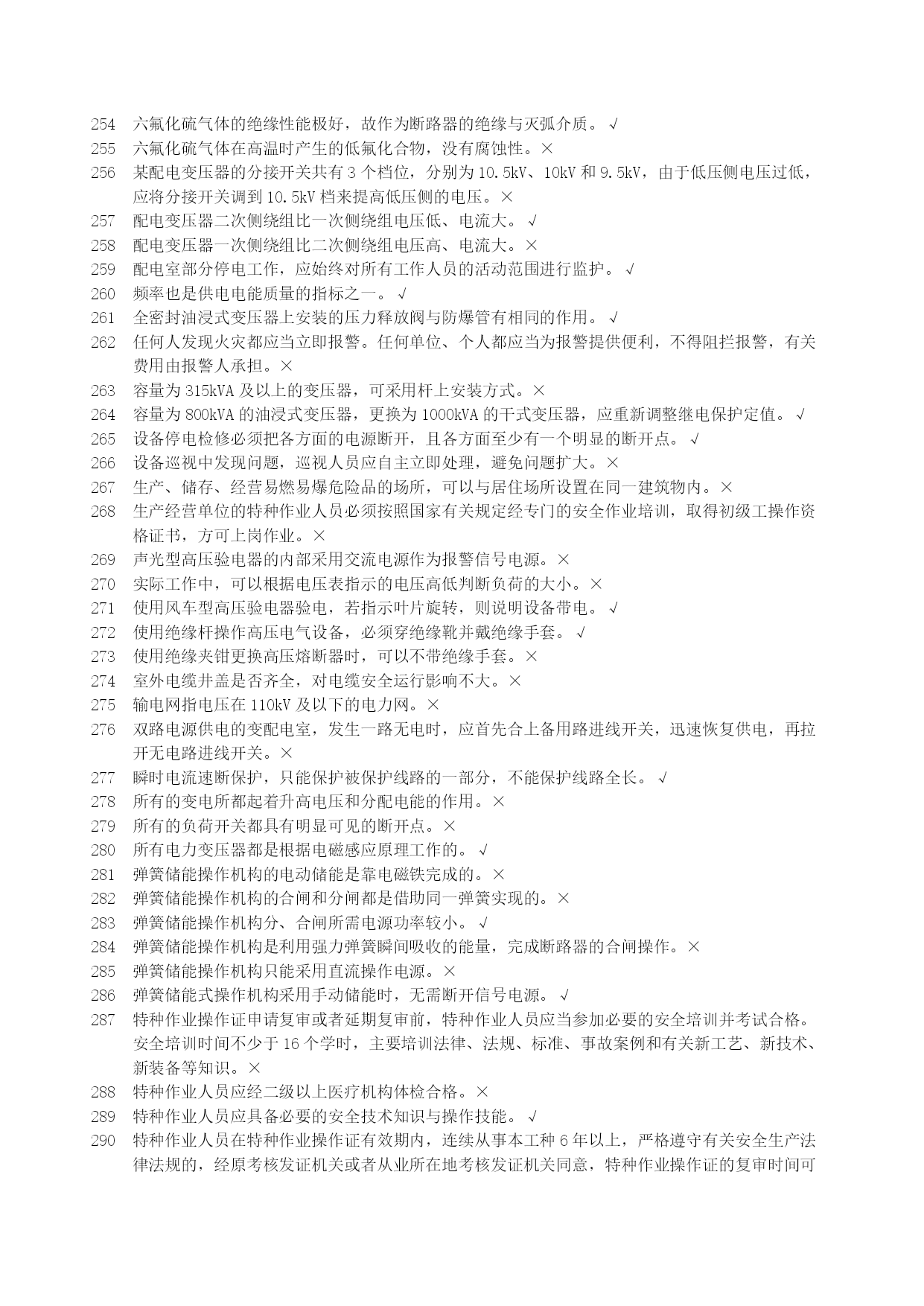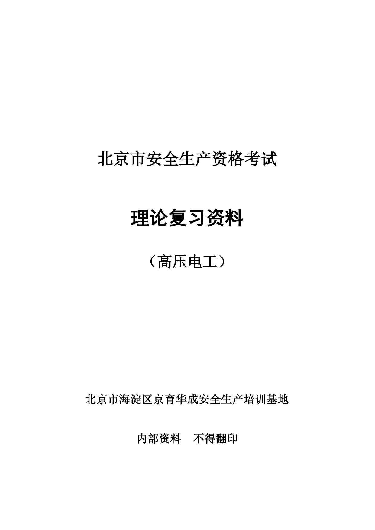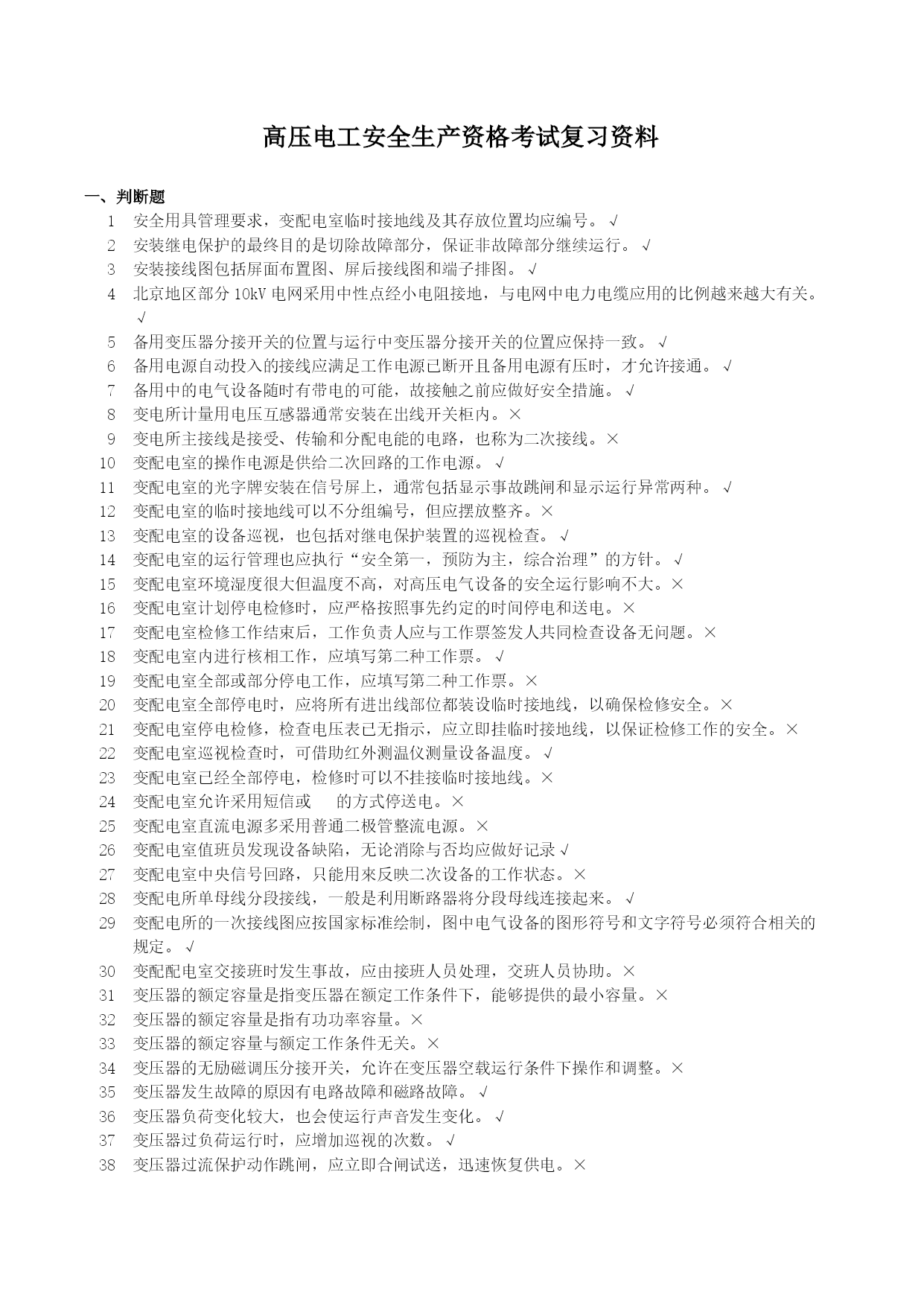 高压电工安全生产资格考试复习资料优质资料(可以直接使用,可编辑优质资料,欢迎下载)北京市安全生产资格考试理论复习资料(高压电工)北京市海淀区京育华成安全生产培训基地内部资料不得翻印高压电工安全生产资格考试复习资料一、判断题1安全用具管理要求,变配电室临时接地线及其存放位置均应编号。√2安装继电保护的最终目的是切除故障部分,保证非故障部分继续运行。√3安装接线图包括屏面布置图、屏后接线图和端子排图。√4北京地区部分10kV电网采用中性点经小电阻接地,与电网中电力电缆应用的比例越来越大有关。√5备用变压器分接开关的位置与运行中变压器分接开关的位置应保持一致。√6备用电源自动投入的接线应满足工作电源已断开且备用电源有压时,才允许接通。√7备用中的电气设备随时有带电的可能,故接触之前应做好安全措施。√8变电所计量用电压互感器通常安装在出线开关柜内。×9变电所主接线是接受、传输和分配电能的电路,也称为二次接线。×10变配电室的操作电源是供给二次回路的工作电源。√11变配电室的光字牌安装在信号屏上,通常包括显示事故跳闸和显示运行异常两种。√12变配电室的临时接地线可以不分组编号,但应摆放整齐。×13变配电室的设备巡视,也包括对继电保护装置的巡视检查。√14变配电室的运行管理也应执行“安全第一,预防为主,综合治理”的方针。√15变配电室环境湿度很大但温度不高,对高压电气设备的安全运行影响不大。×16变配电室计划停电检修时,应严格按照事先约定的时间停电和送电。×17变配电室检修工作结束后,工作负责人应与工作票签发人共同检查设备无问题。×18变配电室内进行核相工作,应填写第二种工作票。√19变配电室全部或部分停电工作,应填写第二种工作票。×20变配电室全部停电时,应将所有进出线部位都装设临时接地线,以确保检修安全。×21变配电室停电检修,检查电压表已无指示,应立即挂临时接地线,以保证检修工作的安全。×22变配电室巡视检查时,可借助红外测温仪测量设备温度。√23变配电室已经全部停电,检修时可以不挂接临时接地线。×24变配电室允许采用短信或的方式停送电。×25变配电室直流电源多采用普通二极管整流电源。×26变配电室值班员发现设备缺陷,无论消除与否均应做好记录√27变配电室中央信号回路,只能用來反映二次设备的工作状态。×28变配电所单母线分段接线,一般是利用断路器将分段母线连接起来。√29变配电所的一次接线图应按国家标准绘制,图中电气设备的图形符号和文字符号必须符合相关的规定。√30变配配电室交接班时发生事故,应由接班人员处理,交班人员协助。×31变压器的额定容量是指变压器在额定工作条件下,能够提供的最小容量。×32变压器的额定容量是指有功功率容量。×33变压器的额定容量与额定工作条件无关。×34变压器的无励磁调压分接开关,允许在变压器空载运行条件下操作和调整。×35变压器发生故障的原因有电路故障和磁路故障。√36变压器负荷变化较大,也会使运行声音发生变化。√37变压器过负荷运行时,应增加巡视的次数。√38变压器过流保护动作跳闸,应立即合闸试送,迅速恢复供电。×39变压器过流保护动作跳闸,有可能是变压器低压侧出口短路造成的。√40变压器过流保护动作跳闸,有可能是同级速断保护拒动造成的。√41变压器过流保护动作跳闸,有可能是下级保护拒动造成的。√42变压器零序保护动作跳闸,不能合闸试送,必须查明原因。√43变压器零序保护动作跳闸,可能是变压器发生了相间短路故障。×44变压器满负荷运行主要是指有功功率达到变压器的额定容量。×45变压器绕组温度超过绝缘耐受温度,会使绝缘受到破坏。√46变压器是用来改变频率的静止电气设备。×47变压器室的门和通风窗应采用非燃材料或难燃材料制成,并应向内开启。×48变压器速断保护动作跳闸,可以立即合闸试送,若再跳闸则不能再次试送。×49变压器外部短路是引起故障跳闸的原因之一。√50变压器外壳接地部位螺栓锈蚀严重,不会影响安全运行。×51变压器一、二次侧感应电势之比近似等于一、二次侧绕组匝数之比。√52变压器一次和二次引线的连接,不能使变压器套管直接受力。√53变压器因为一、二次侧绕组匝数相同,所以能够变换电压。×54变压器预防性试验,摇测绝缘电阻不应低于出厂值的100%。×55变压器运行时各部件的温度是不同的,其中绕组温度最低。×56变压器运行正常时,会发出断续而均匀的嗡嗡声。×57不同金属、不同截面、不同绞向的导线不得在架空线路同一档距内连接。√58采用直流操作电源的变配电室,在交流电源消失后,由蓄电池提供直流电源。√59操作10kV中置式开关柜,其小车摇进或摇出受阻,与误操作无关。×60操作隔离开关合闸时发生电弧,应立即拉开,恢复原状。×61操作票应进行编号,已操作的须注明“
