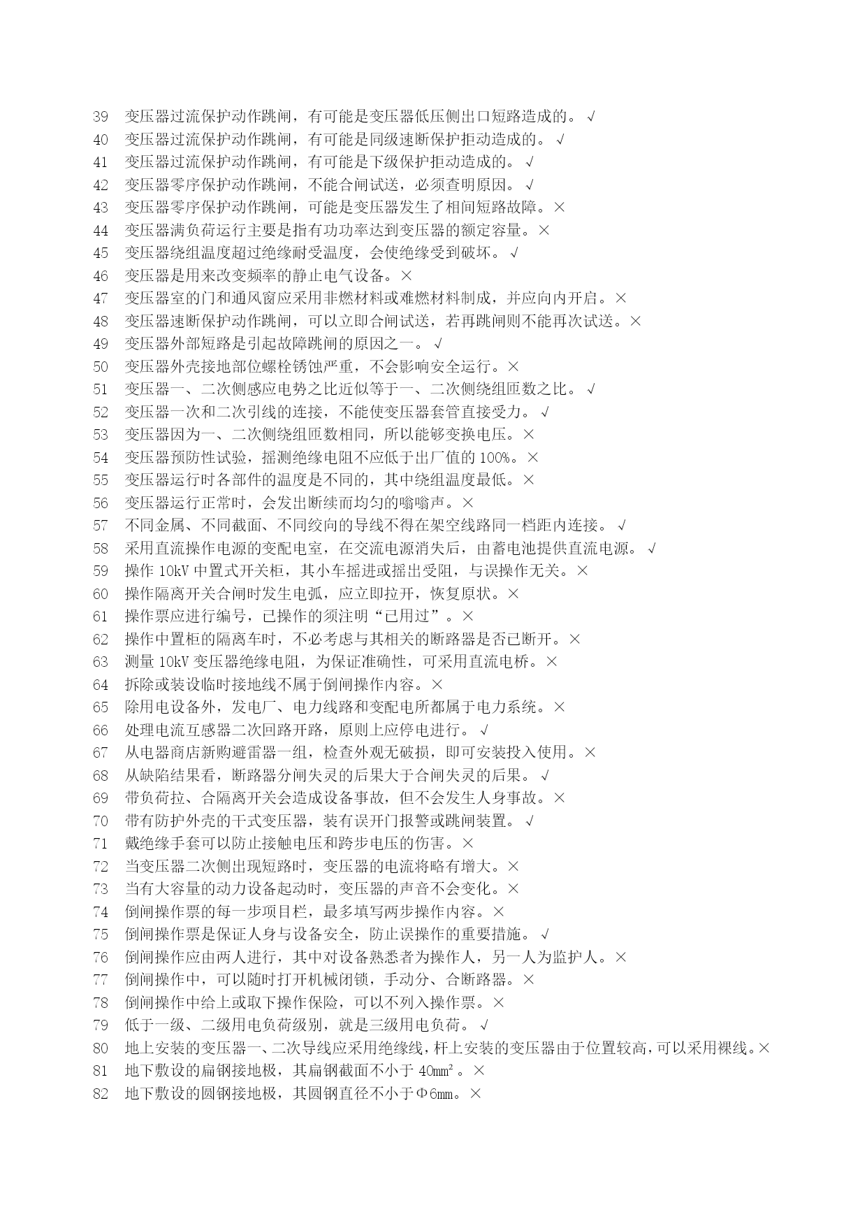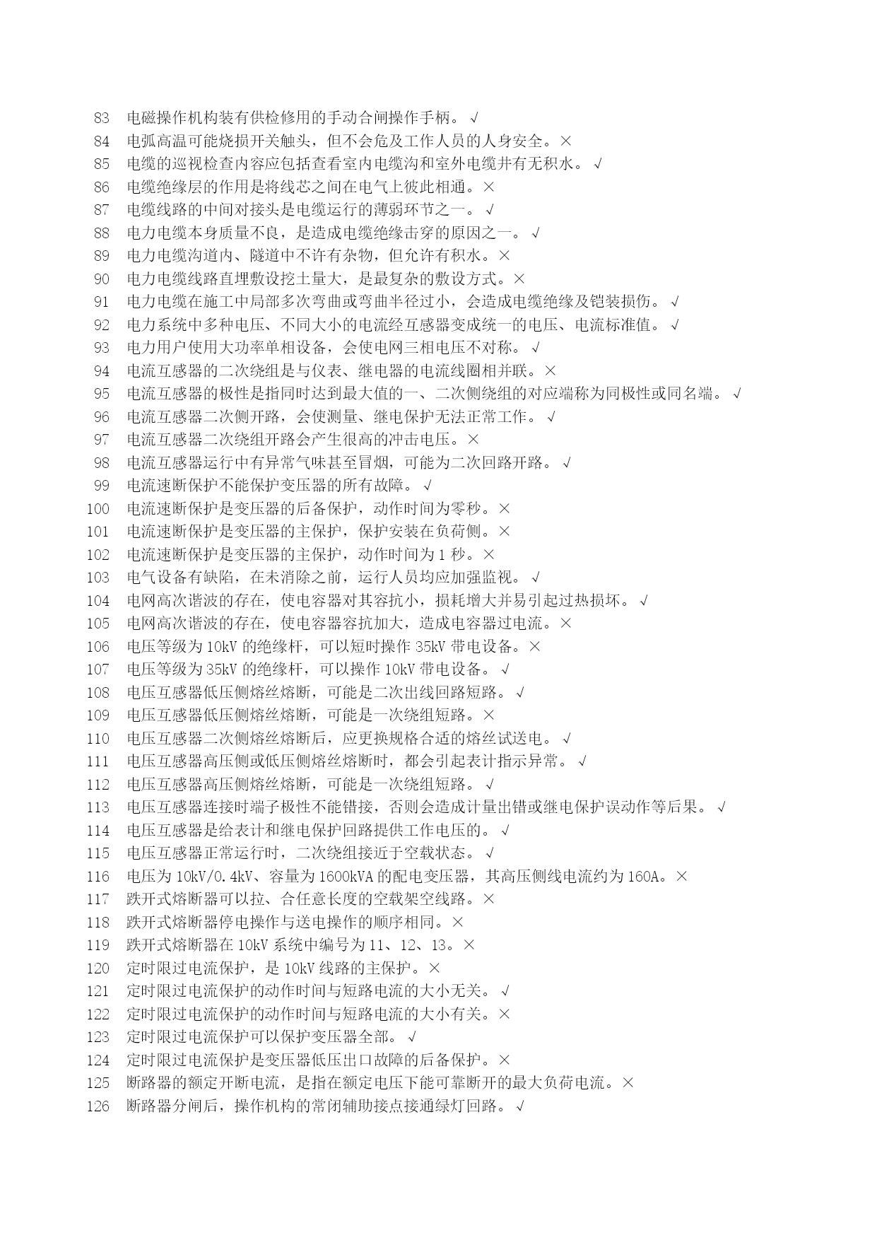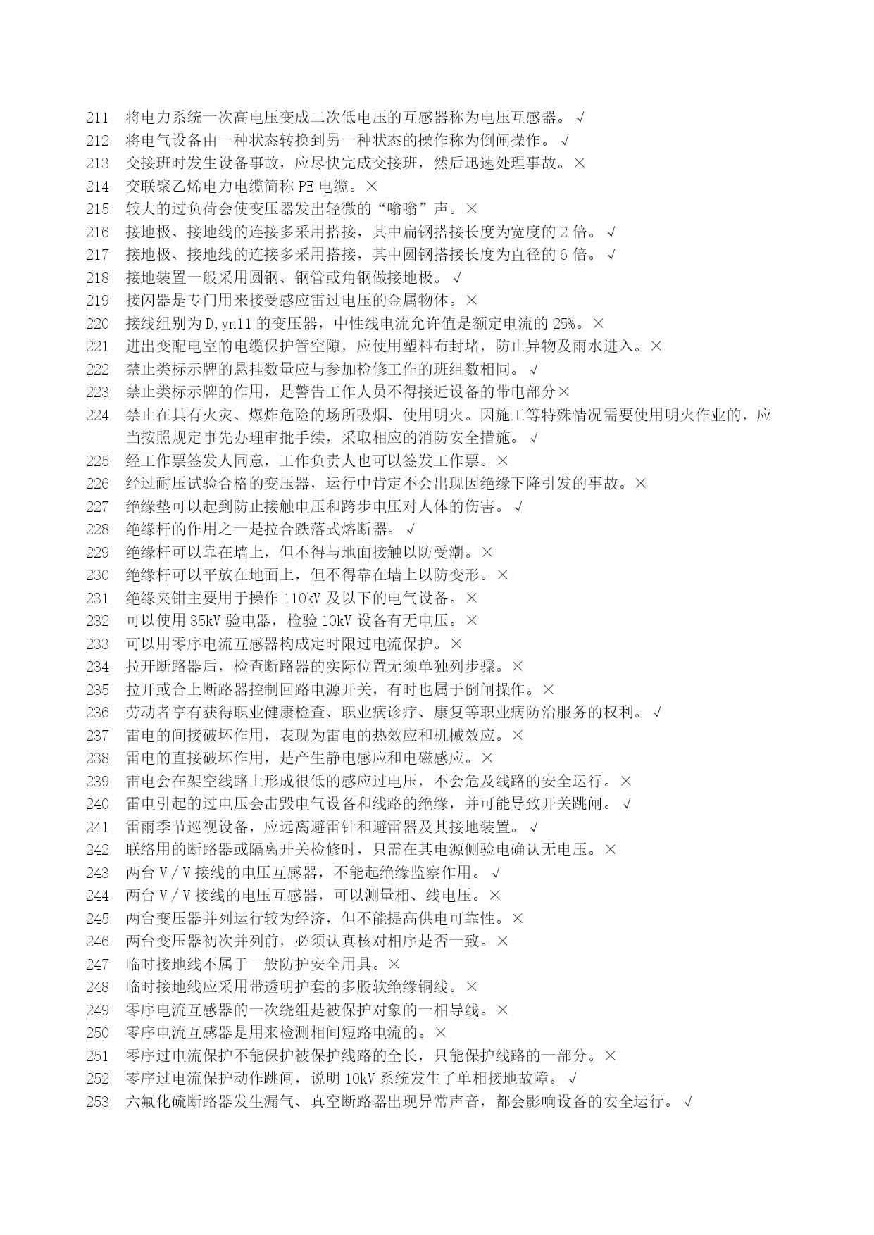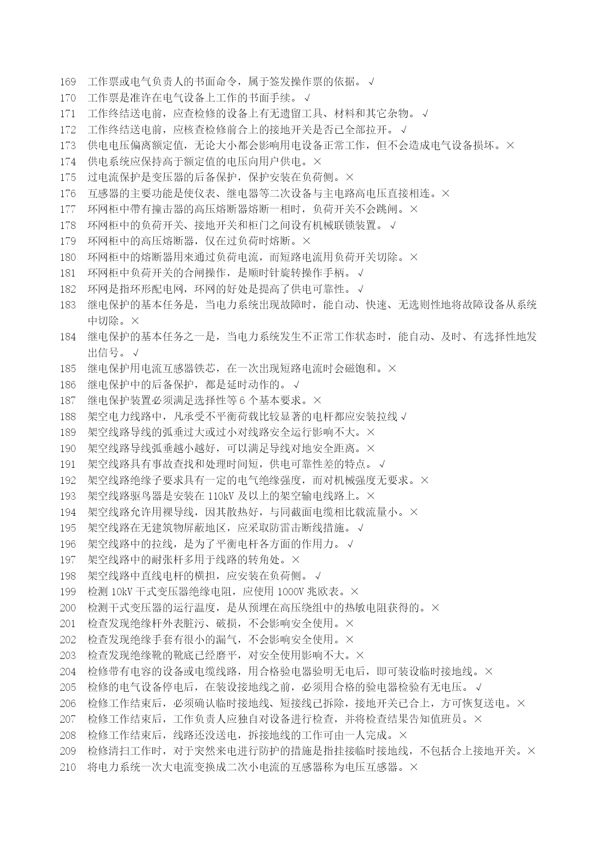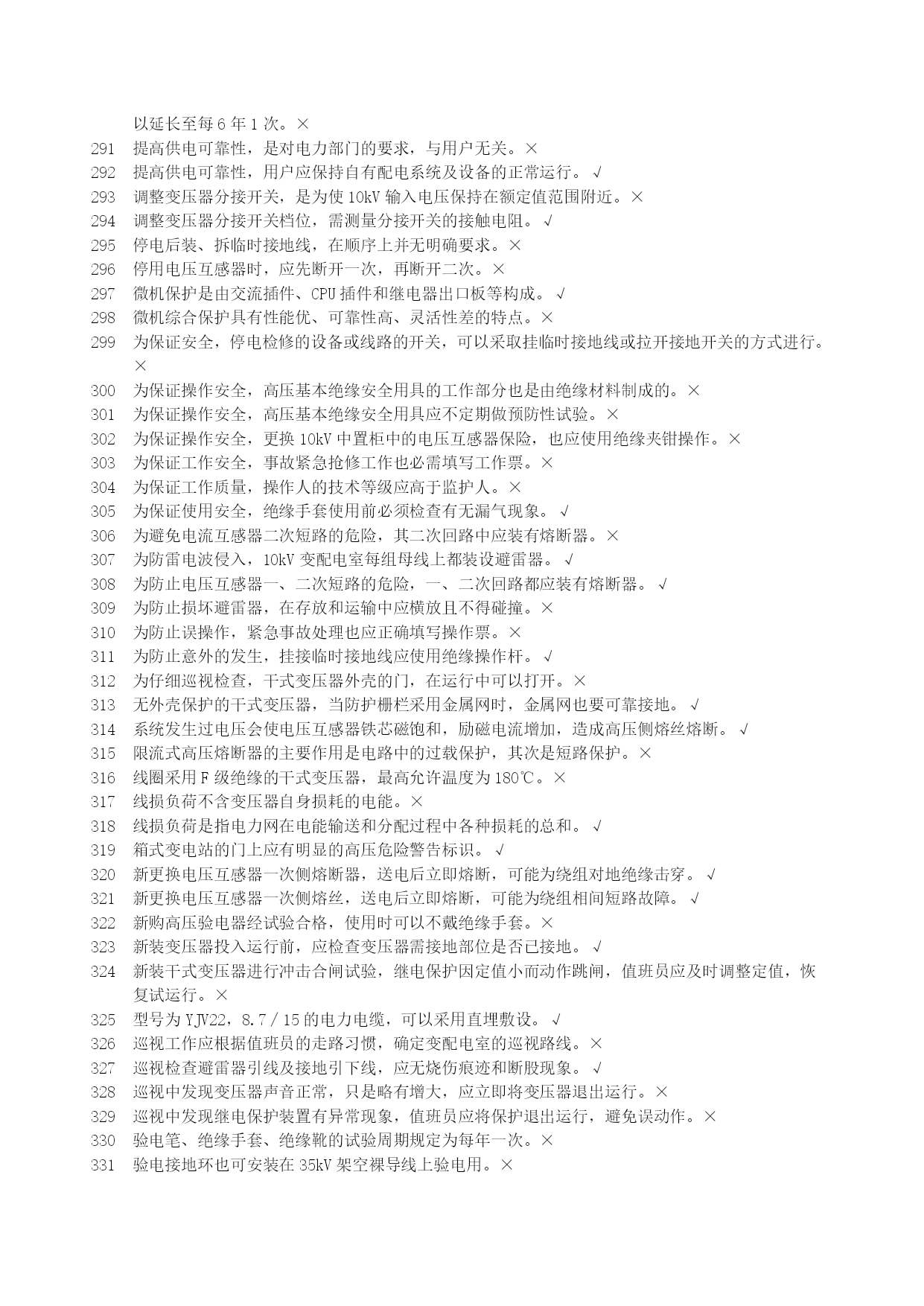 高压电工安全生产资格考试复习资料优质资料(可以直接使用,可编辑优质资料,欢迎下载)北京市安全生产资格考试理论复习资料(高压电工)北京市海淀区京育华成安全生产培训基地内部资料不得翻印高压电工安全生产资格考试复习资料一、判断题1安全用具管理要求,变配电室临时接地线及其存放位置均应编号。√2安装继电保护的最终目的是切除故障部分,保证非故障部分继续运行。√3安装接线图包括屏面布置图、屏后接线图和端子排图。√4北京地区部分10kV电网采用中性点经小电阻接地,与电网中电力电缆应用的比例越来越大有关。√5备用变压器分接开关的位置与运行中变压器分接开关的位置应保持一致。√6备用电源自动投入的接线应满足工作电源已断开且备用电源有压时,才允许接通。√7备用中的电气设备随时有带电的可能,故接触之前应做好安全措施。√8变电所计量用电压互感器通常安装在出线开关柜内。×9变电所主接线是接受、传输和分配电能的电路,也称为二次接线。×10变配电室的操作电源是供给二次回路的工作电源。√11变配电室的光字牌安装在信号屏上,通常包括显示事故跳闸和显示运行异常两种。√12变配电室的临时接地线可以不分组编号,但应摆放整齐。×13变配电室的设备巡视,也包括对继电保护装置的巡视检查。√14变配电室的运行管理也应执行“安全第一,预防为主,综合治理”的方针。√15变配电室环境湿度很大但温度不高,对高压电气设备的安全运行影响不大。×16变配电室计划停电检修时,应严格按照事先约定的时间停电和送电。×17变配电室检修工作结束后,工作负责人应与工作票签发人共同检查设备无问题。×18变配电室内进行核相工作,应填写第二种工作票。√19变配电室全部或部分停电工作,应填写第二种工作票。×20变配电室全部停电时,应将所有进出线部位都装设临时接地线,以确保检修安全。×21变配电室停电检修,检查电压表已无指示,应立即挂临时接地线,以保证检修工作的安全。×22变配电室巡视检查时,可借助红外测温仪测量设备温度。√23变配电室已经全部停电,检修时可以不挂接临时接地线。×24变配电室允许采用短信或的方式停送电。×25变配电室直流电源多采用普通二极管整流电源。×26变配电室值班员发现设备缺陷,无论消除与否均应做好记录√27变配电室中央信号回路,只能用來反映二次设备的工作状态。×28变配电所单母线分段接线,一般是利用断路器将分段母线连接起来。√29变配电所的一次接线图应按国家标准绘制,图中电气设备的图形符号和文字符号必须符合相关的规定。√30变配配电室交接班时发生事故,应由接班人员处理,交班人员协助。×31变压器的额定容量是指变压器在额定工作条件下,能够提供的最小容量。×32变压器的额定容量是指有功功率容量。×33变压器的额定容量与额定工作条件无关。×34变压器的无励磁调压分接开关,允许在变压器空载运行条件下操作和调整。×35变压器发生故障的原因有电路故障和磁路故障。√36变压器负荷变化较大,也会使运行声音发生变化。√37变压器过负荷运行时,应增加巡视的次数。√38变压器过流保护动作跳闸,应立即合闸试送,迅速恢复供电。×39变压器过流保护动作跳闸,有可能是变压器低压侧出口短路造成的。√40变压器过流保护动作跳闸,有可能是同级速断保护拒动造成的。√41变压器过流保护动作跳闸,有可能是下级保护拒动造成的。√42变压器零序保护动作跳闸,不能合闸试送,必须查明原因。√43变压器零序保护动作跳闸,可能是变压器发生了相间短路故障。×44变压器满负荷运行主要是指有功功率达到变压器的额定容量。×45变压器绕组温度超过绝缘耐受温度,会使绝缘受到破坏。√46变压器是用来改变频率的静止电气设备。×47变压器室的门和通风窗应采用非燃材料或难燃材料制成,并应向内开启。×48变压器速断保护动作跳闸,可以立即合闸试送,若再跳闸则不能再次试送。×49变压器外部短路是引起故障跳闸的原因之一。√50变压器外壳接地部位螺栓锈蚀严重,不会影响安全运行。×51变压器一、二次侧感应电势之比近似等于一、二次侧绕组匝数之比。√52变压器一次和二次引线的连接,不能使变压器套管直接受力。√53变压器因为一、二次侧绕组匝数相同,所以能够变换电压。×54变压器预防性试验,摇测绝缘电阻不应低于出厂值的100%。×55变压器运行时各部件的温度是不同的,其中绕组温度最低。×56变压器运行正常时,会发出断续而均匀的嗡嗡声。×57不同金属、不同截面、不同绞向的导线不得在架空线路同一档距内连接。√58采用直流操作电源的变配电室,在交流电源消失后,由蓄电池提供直流电源。√59操作10kV中置式开关柜,其小车摇进或摇出受阻,与误操作无关。×60操作隔离开关合闸时发生电弧,应立即拉开,恢复原状。×61操作票应进行编号,已操作的须注明“