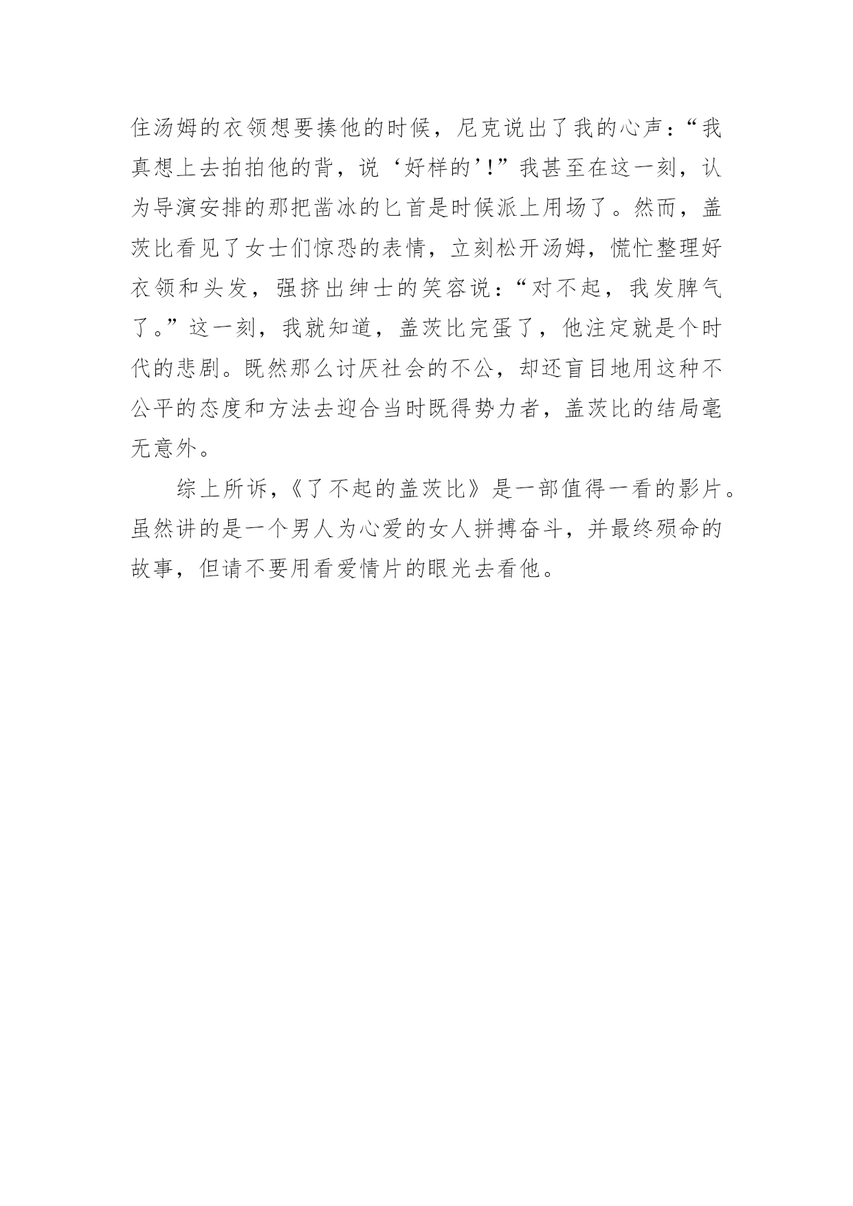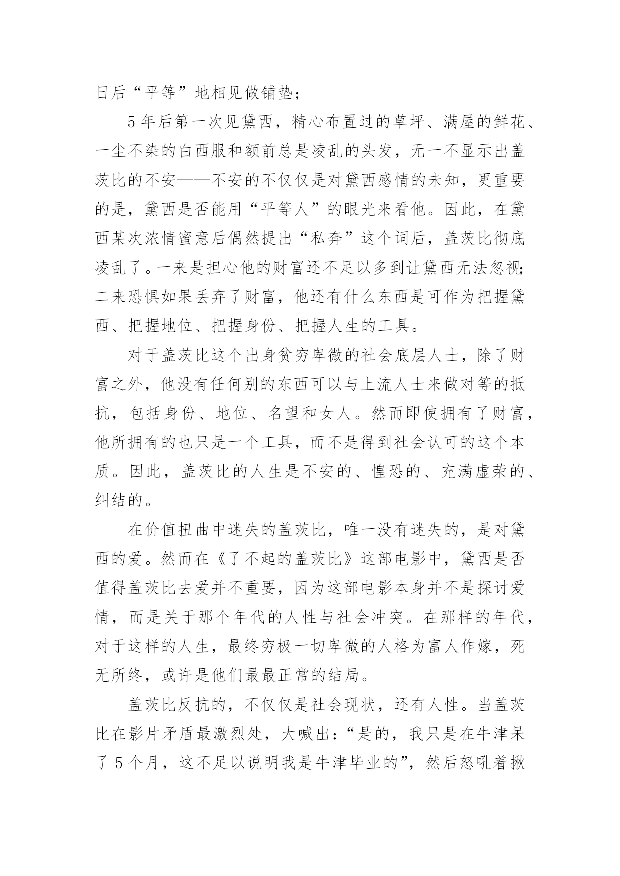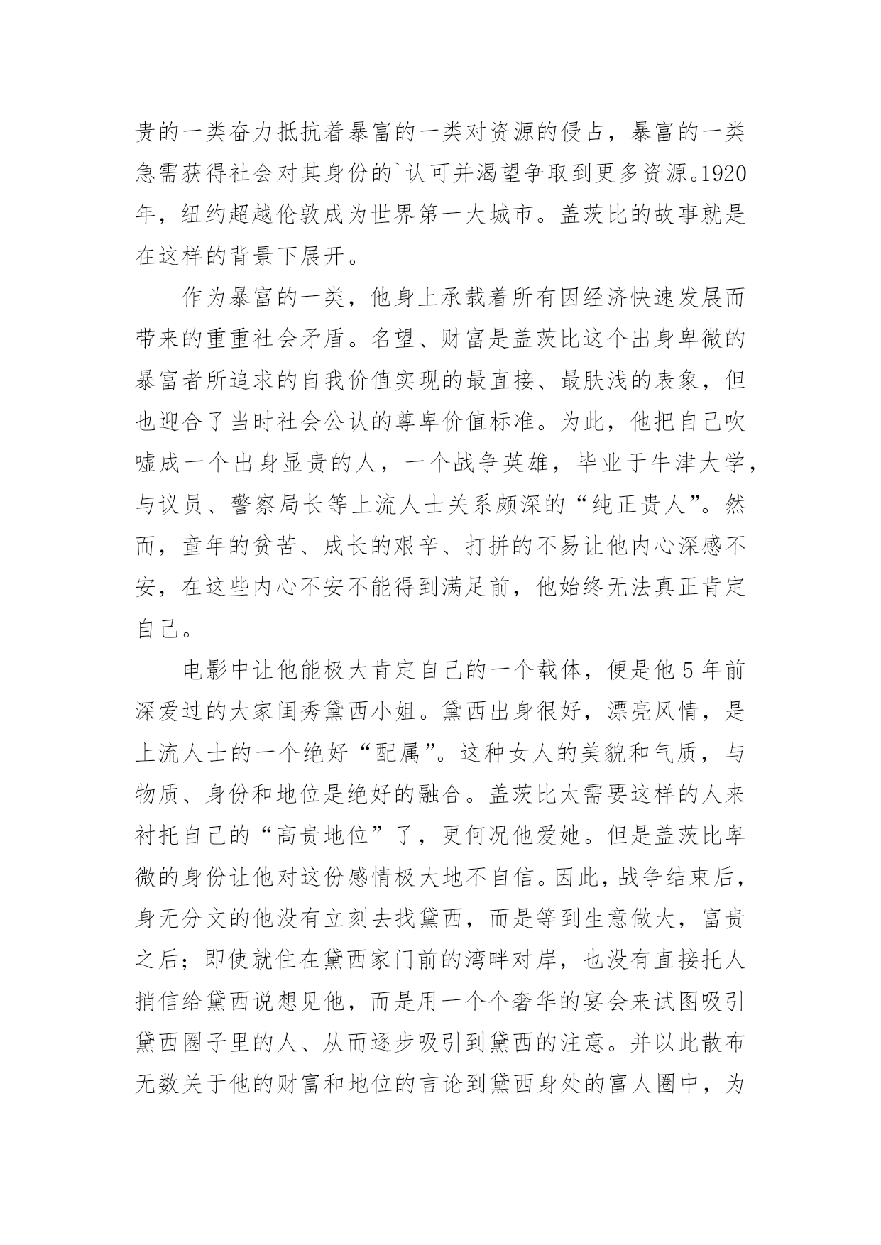 《了不起的盖茨比》观后感《了不起的盖茨比》观后感在观看完一部作品以后,这次观看让你心中有什么感想呢?这时候,最关键的观后感怎么能落下!为了让您不再为写观后感头疼,下面是小编收集整理的《了不起的盖茨比》观后感,欢迎阅读与收藏。《了不起的盖茨比》是一部非常有内涵的影片,莱昂纳多娴熟的演技为影片加分不少。跻身富豪名列却深深为自己的出身感到自卑与不安,不断想实现自我价值却因时代所赋予的尊卑之分备感压力的那份纠结,想来只有莱昂纳多能更好地诠释。快乐时真诚无邪的笑容、不安时额前凌乱的头发、激动时脸部颤抖的肌肉、愤怒时夹着血丝如野兽般的双眼、孤独时浮华褪尽的身影、悲伤时晦暗颓败的脸颊……天堂与地狱那一瞬间的幻化,莱昂纳多演绎地出神入化。甚至连在棺中的安详神情都是深刻的,只有这一刻,永远在自我肯定与否定中徘徊的盖茨比才能真正地得到解脱。1820年至1920年,是美国发展最快的100年。这期间金融业繁荣发展,资本的快速膨胀带给人们物质欲上的极大冲击,资本对人们生活的重要度开始快速提升。这期间,移民大规模发生,新贵与旧势力之间的矛盾日益激化。出身权贵的一类奋力抵抗着暴富的一类对资源的侵占,暴富的一类急需获得社会对其身份的`认可并渴望争取到更多资源。1920年,纽约超越伦敦成为世界第一大城市。盖茨比的故事就是在这样的背景下展开。作为暴富的一类,他身上承载着所有因经济快速发展而带来的重重社会矛盾。名望、财富是盖茨比这个出身卑微的暴富者所追求的自我价值实现的最直接、最肤浅的表象,但也迎合了当时社会公认的尊卑价值标准。为此,他把自己吹嘘成一个出身显贵的人,一个战争英雄,毕业于牛津大学,与议员、警察局长等上流人士关系颇深的“纯正贵人”。然而,童年的贫苦、成长的艰辛、打拼的不易让他内心深感不安,在这些内心不安不能得到满足前,他始终无法真正肯定自己。电影中让他能极大肯定自己的一个载体,便是他5年前深爱过的大家闺秀黛西小姐。黛西出身很好,漂亮风情,是上流人士的一个绝好“配属”。这种女人的美貌和气质,与物质、身份和地位是绝好的融合。盖茨比太需要这样的人来衬托自己的“高贵地位”了,更何况他爱她。但是盖茨比卑微的身份让他对这份感情极大地不自信。因此,战争结束后,身无分文的他没有立刻去找黛西,而是等到生意做大,富贵之后;即使就住在黛西家门前的湾畔对岸,也没有直接托人捎信给黛西说想见他,而是用一个个奢华的宴会来试图吸引黛西圈子里的人、从而逐步吸引到黛西的注意。并以此散布无数关于他的财富和地位的言论到黛西身处的富人圈中,为日后“平等”地相见做铺垫;5年后第一次见黛西,精心布置过的草坪、满屋的鲜花、一尘不染的白西服和额前总是凌乱的头发,无一不显示出盖茨比的不安——不安的不仅仅是对黛西感情的未知,更重要的是,黛西是否能用“平等人”的眼光来看他。因此,在黛西某次浓情蜜意后偶然提出“私奔”这个词后,盖茨比彻底凌乱了。一来是担心他的财富还不足以多到让黛西无法忽视;二来恐惧如果丢弃了财富,他还有什么东西是可作为把握黛西、把握地位、把握身份、把握人生的工具。对于盖茨比这个出身贫穷卑微的社会底层人士,除了财富之外,他没有任何别的东西可以与上流人士来做对等的抵抗,包括身份、地位、名望和女人。然而即使拥有了财富,他所拥有的也只是一个工具,而不是得到社会认可的这个本质。因此,盖茨比的人生是不安的、惶恐的、充满虚荣的、纠结的。在价值扭曲中迷失的盖茨比,唯一没有迷失的,是对黛西的爱。然而在《了不起的盖茨比》这部电影中,黛西是否值得盖茨比去爱并不重要,因为这部电影本身并不是探讨爱情,而是关于那个年代的人性与社会冲突。在那样的年代,对于这样的人生,最终穷极一切卑微的人格为富人作嫁,死无所终,或许是他们最最正常的结局。盖茨比反抗的,不仅仅是社会现状,还有人性。当盖茨比在影片矛盾最激烈处,大喊出:“是的,我只是在牛津呆了5个月,这不足以说明我是牛津毕业的”,然后怒吼着揪住汤姆的衣领想要揍他的时候,尼克说出了我的心声:“我真想上去拍拍他的背,说‘好样的’!”我甚至在这一刻,认为导演安排的那把凿冰的匕首是时候派上用场了。然而,盖茨比看见了女士们惊恐的表情,立刻松开汤姆,慌忙整理好衣领和头发,强挤出绅士的笑容说:“对不起,我发脾气了。”这一刻,我就知道,盖茨比完蛋了,他注定就是个时代的悲剧。既然那么讨厌社会的不公,却还盲目地用这种不公平的态度和方法去迎合当时既得势力者,盖茨比的结局毫无意外。综上所诉,《了不起的盖茨比》是一部值得一看的影片。虽然讲的是一个男人为心爱的女人拼搏奋斗,并最终殒命的故事,但请不要用看爱情片的眼光去看他。