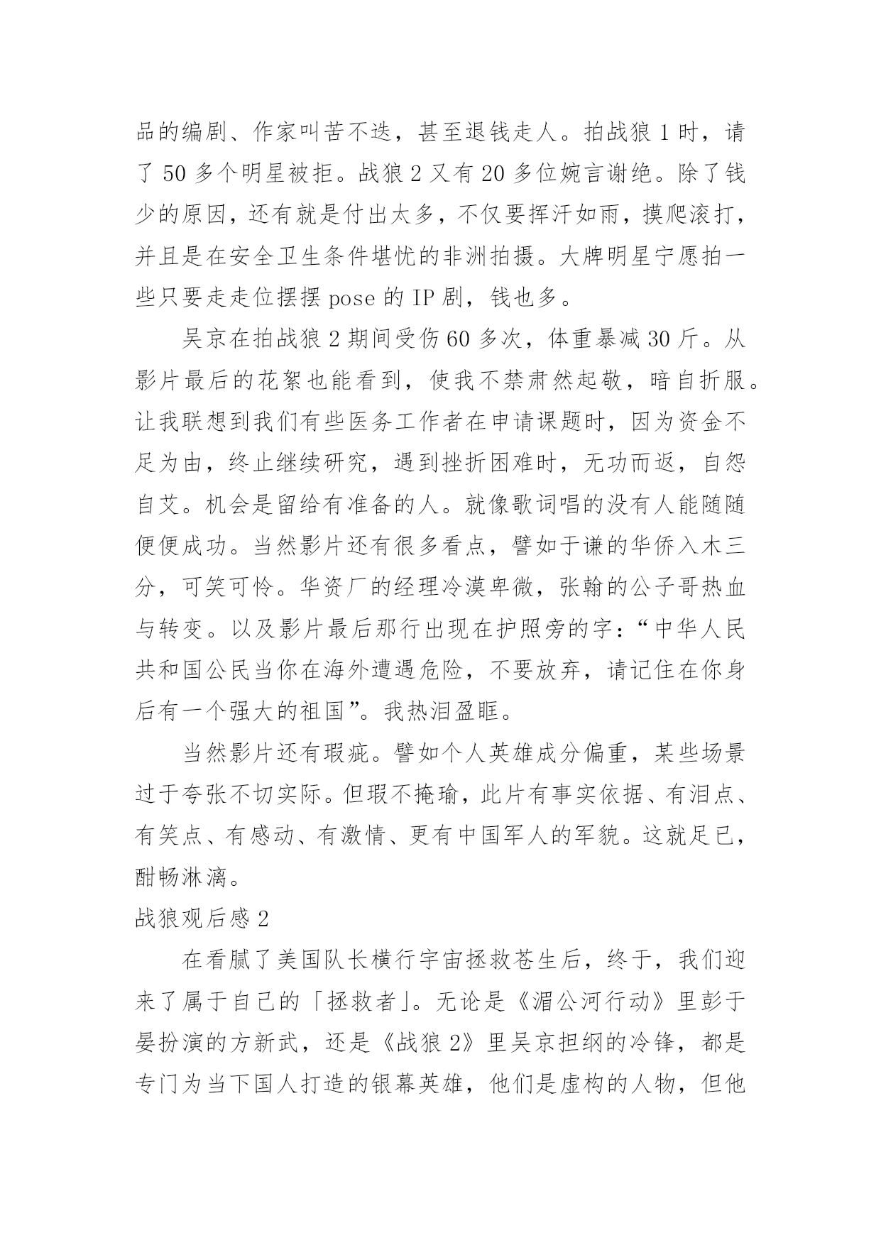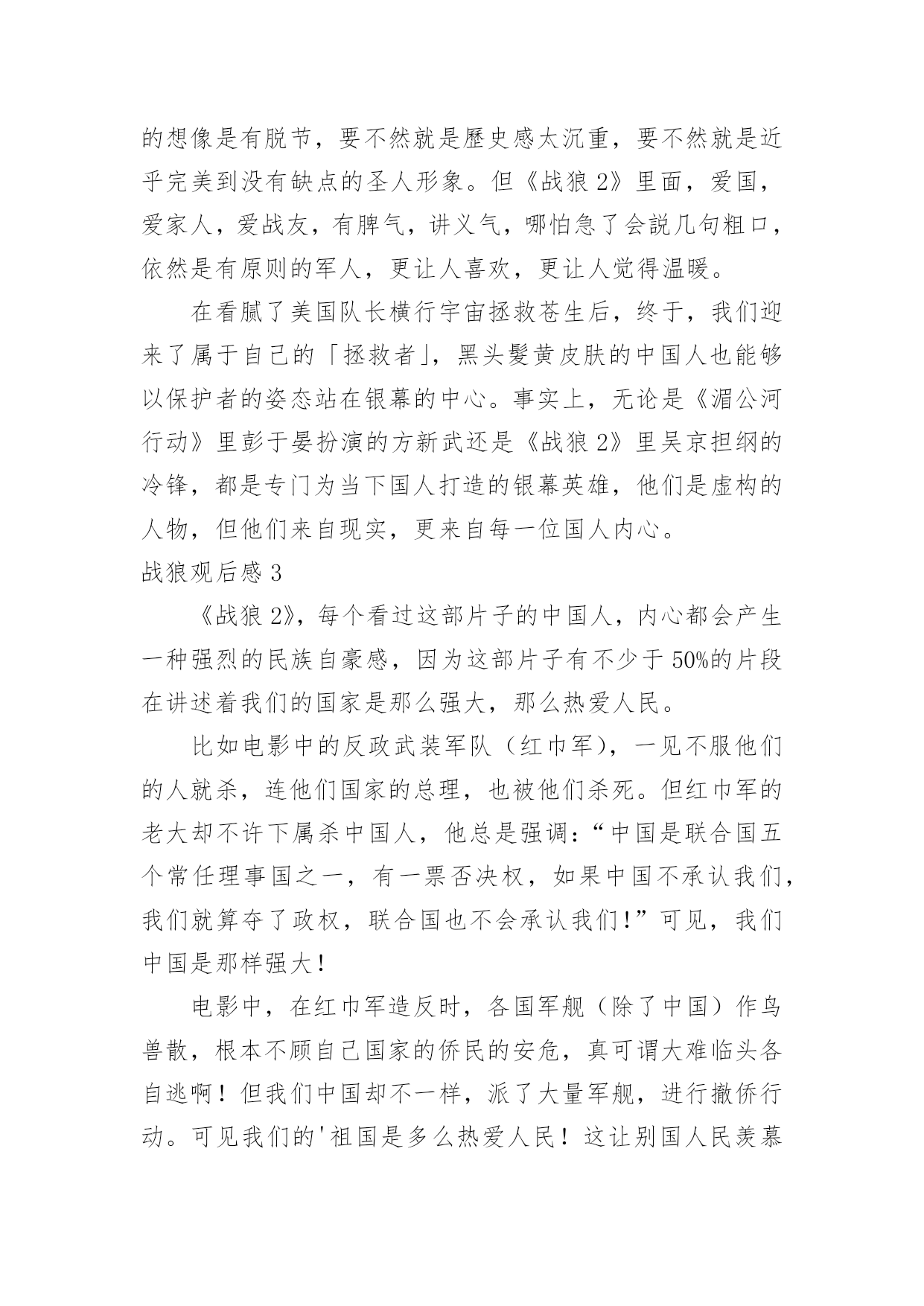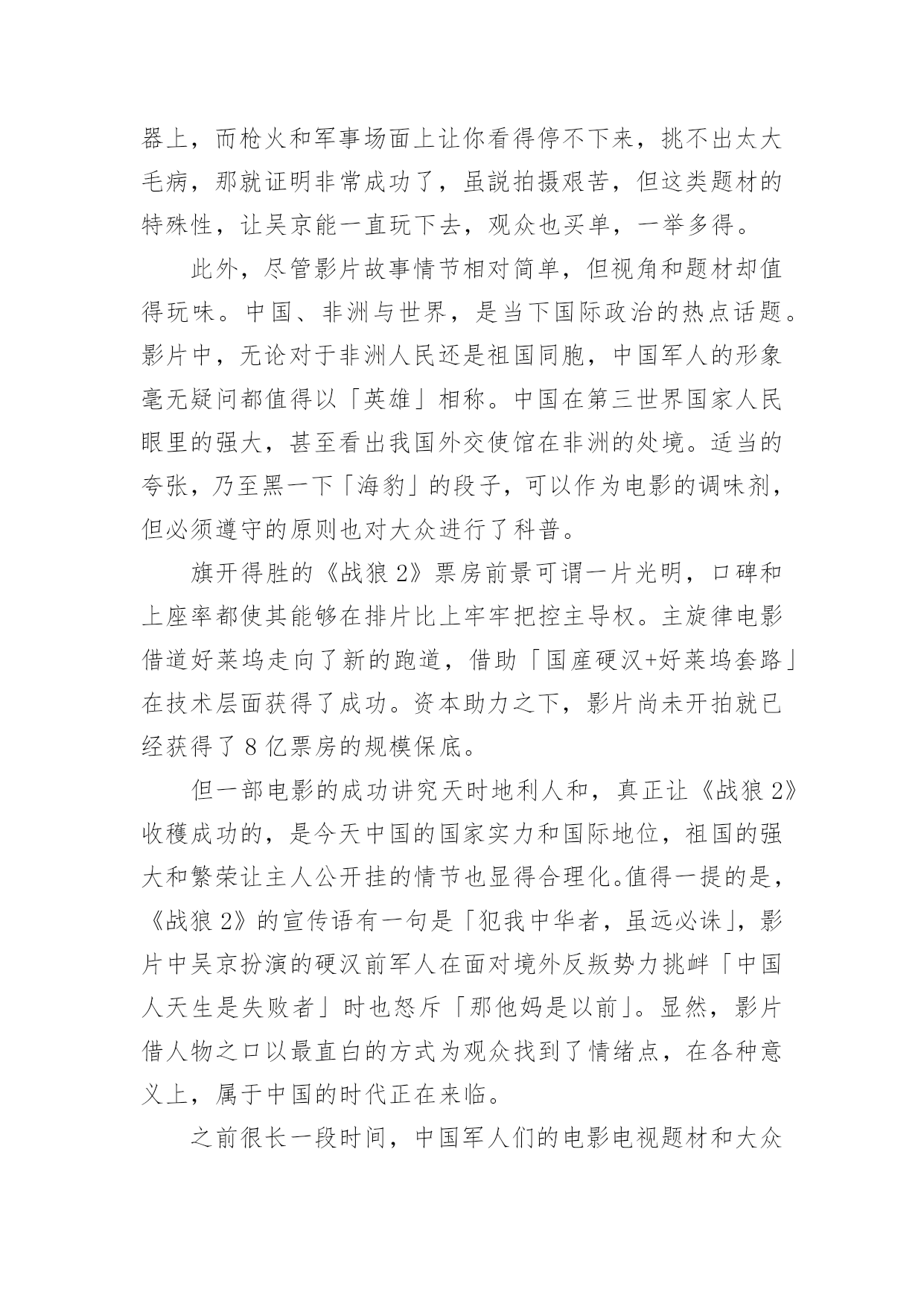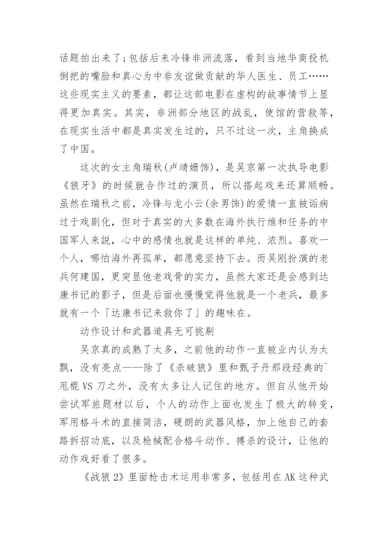 战狼观后感战狼观后感[共15篇]当看完一部影视作品后,相信大家增长不少见闻吧,此时需要认真地做好记录,写写观后感了。那么你会写观后感吗?下面是小编为大家收集的战狼观后感,欢迎大家借鉴与参考,希望对大家有所帮助。战狼观后感1观影前顺便补习了战狼1,了解了大概剧情。实话说1和2比还是有巨大差距的。2的制作精良了不少,堪比美式大片。真正的良心之作呀,并且三观正,扬我国威,不火才是奇事一桩。看得观众热血沸腾,跃跃欲试。最让人铭记的是片中主角吴京在卡车上以臂为杆高举国旗的场景,英姿飒爽,独领风骚,震撼全场,叹为观止。真是九十年代李连杰,零零年代甑子丹,如今武打看吴京。听说好莱坞力邀其参演新一部敢死队系列影片。瞬间增粉不少,大红大紫。可是在此背后又有谁知道他的心路历程。战狼系列是其自编自导自演,甚至演唱主题曲。一定会有人说他多才多艺。其实是投资方出钱少,无奈之举。其实很早吴京就有拍战狼的.计划,和制片方多次沟通才勉强获得答应投拍。并未对其作品抱有希望,要知道现代战争是多么难拍。为此他深入军营先拍摄了军事题材的电视剧加以磨炼。又对剧本几易其稿,逐字推敲。逼得国内响当当的写类似作品的编剧、作家叫苦不迭,甚至退钱走人。拍战狼1时,请了50多个明星被拒。战狼2又有20多位婉言谢绝。除了钱少的原因,还有就是付出太多,不仅要挥汗如雨,摸爬滚打,并且是在安全卫生条件堪忧的非洲拍摄。大牌明星宁愿拍一些只要走走位摆摆pose的IP剧,钱也多。吴京在拍战狼2期间受伤60多次,体重暴减30斤。从影片最后的花絮也能看到,使我不禁肃然起敬,暗自折服。让我联想到我们有些医务工作者在申请课题时,因为资金不足为由,终止继续研究,遇到挫折困难时,无功而返,自怨自艾。机会是留给有准备的人。就像歌词唱的没有人能随随便便成功。当然影片还有很多看点,譬如于谦的华侨入木三分,可笑可怜。华资厂的经理冷漠卑微,张翰的公子哥热血与转变。以及影片最后那行出现在护照旁的字:“中华人民共和国公民当你在海外遭遇危险,不要放弃,请记住在你身后有一个强大的祖国”。我热泪盈眶。当然影片还有瑕疵。譬如个人英雄成分偏重,某些场景过于夸张不切实际。但瑕不掩瑜,此片有事实依据、有泪点、有笑点、有感动、有激情、更有中国军人的军貌。这就足已,酣畅淋漓。战狼观后感2在看腻了美国队长横行宇宙拯救苍生后,终于,我们迎来了属于自己的「拯救者」。无论是《湄公河行动》里彭于晏扮演的方新武,还是《战狼2》里吴京担纲的冷锋,都是专门为当下国人打造的银幕英雄,他们是虚构的人物,但他们来自现实,更来自每一位国人内心。真实感让容易雷同的题材显出新意时隔3年,吴京一手打造的动作题材电影《战狼2》回归银幕,27日首映4小时横扫9741万、24小时近3亿、4天突破9亿票房大关。进电影院看《战狼2》的观众不少被燃得热血沸腾,想不到国産主旋律电影还有这种操作。是的,就是有这种操作。事实上,自去年《湄公河行动》以来,国産主旋律已经找准了自己的节奏。《战狼2》的成功几乎同《湄公河行动》如出一辙,甚至有些方面更胜一筹。无论是金三角跨国追捕毒枭,还是勇斗非洲反叛军保护撤侨。总之,以中国军人为核心的英雄主角,加之惊险刺激的视觉画面,令人肾上腺素飙升肯定是没跑了。《战狼2》的剧情和人物都不复杂,但是也很巧妙。延续了第一部的故事情节,只不过这一部的故事从之前的「国境线上作战」变成了「走出去作战」,吴京主演的冷锋这个角色,通过两部戏的锤炼,还是饱满了起来——倔强而不失原则,单纯但不愚钝,这都是一个好士兵必须具备的素质,通常这种系列的电影很容易雷同,让人失去兴趣,比如《敢死队》系列,很多影迷现在根本不记得这个系列一二三部分别讲了什么。而《战狼2》里面的设定非但不让人感觉到厌倦,反而很巧妙地用一些矛盾设定,让观众保持浓厚的兴趣看下去。包括一开始的村霸强拆,冷锋出手相助,不惜坐牢也要保全战友一家——没错,《战狼2》里就是大大方方地把社会敏感话题拍出来了;包括后来冷锋非洲流落,看到当地华商投机倒把的嘴脸和真心为中非友谊做贡献的华人医生、员工……这些现实主义的要素,都让这部电影在虚构的故事情节上显得更加真实。其实,非洲部分地区的战乱,使馆的营救等,在现实生活中都是真实发生过的,只不过这一次,主角换成了中国。这次的女主角瑞秋(卢靖姗饰),是吴京第一次执导电影《狼牙》的时候就合作过的演员,所以搭起戏来还算顺畅。虽然在瑞秋之前,冷锋与龙小云(余男饰)的爱情一直被诟病过于戏剧化,但对于真实的大多数在海外执行维和任务的中国军人来説,心中的感情也就是这样的单纯、浓烈。喜欢一个人,哪怕海外再孤单,都愿意坚持下去。而吴刚扮演的老兵何建国,更突显他老戏骨的实力,虽然大家还是会感到达康书记的影子,但是后面也慢慢觉得他就是一个老兵,最多就有一个「达康书记来救你了」的趣味在。动作设计和武器