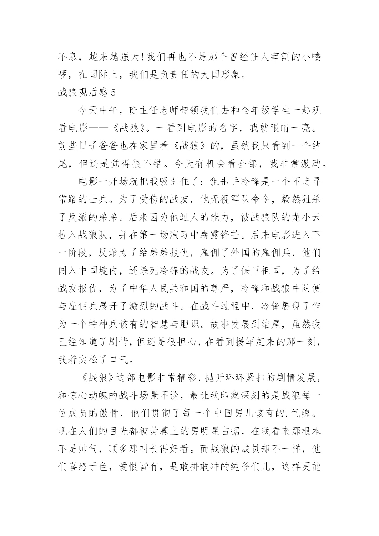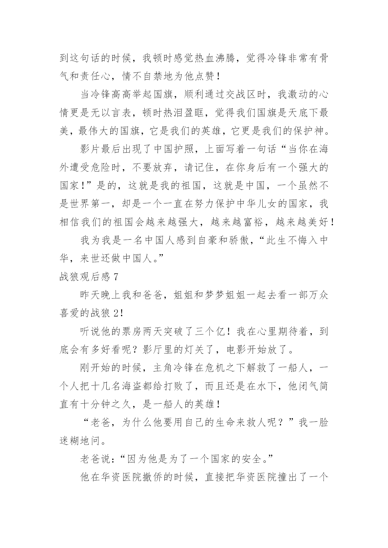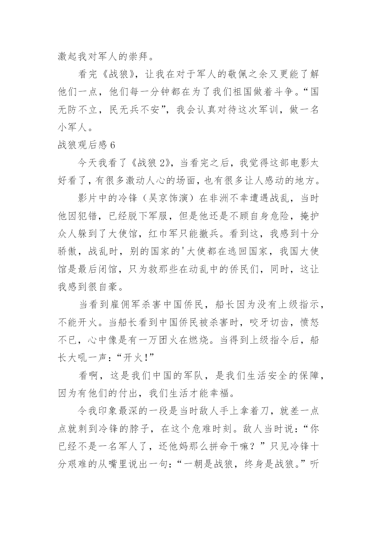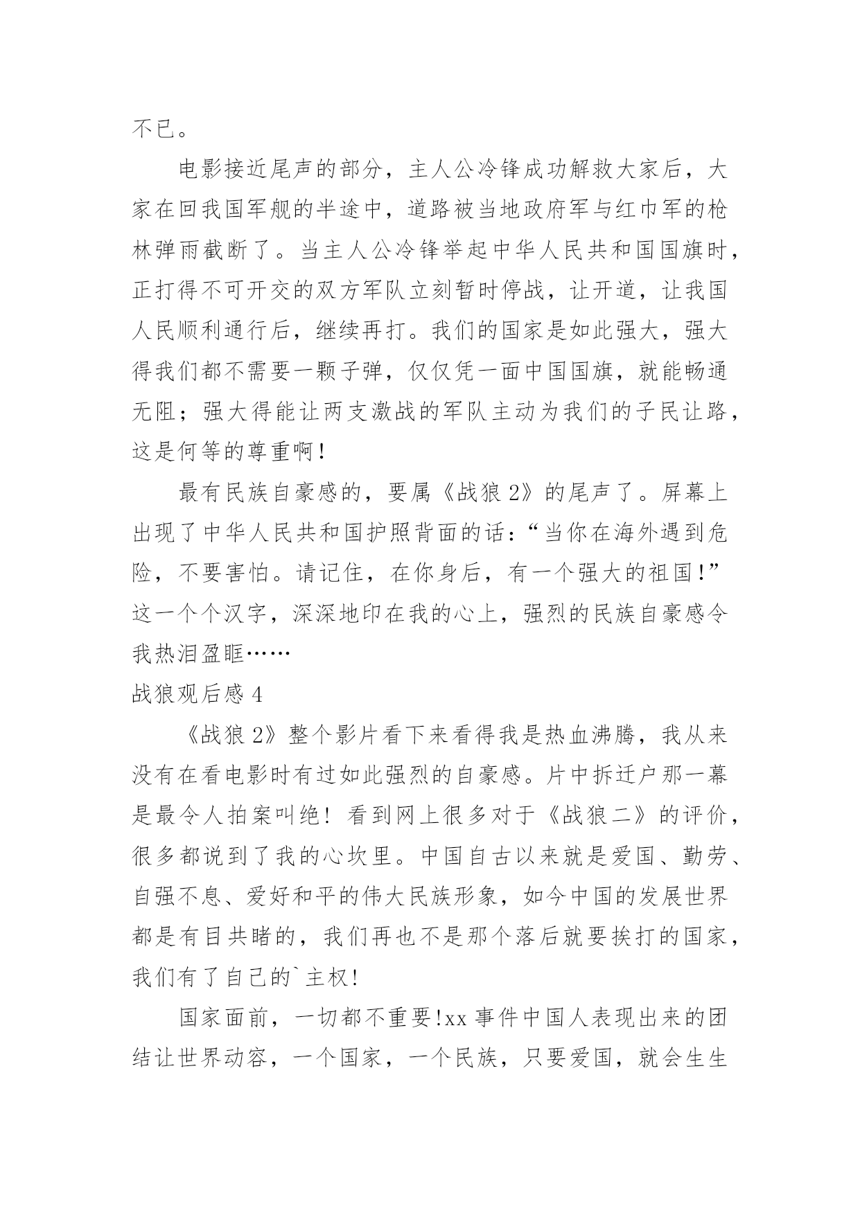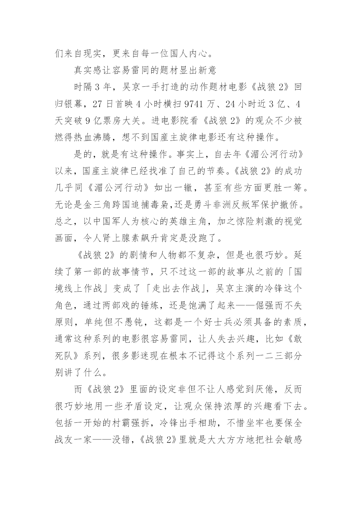 战狼观后感战狼观后感[共15篇]当看完一部影视作品后,相信大家增长不少见闻吧,此时需要认真地做好记录,写写观后感了。那么你会写观后感吗?下面是小编为大家收集的战狼观后感,欢迎大家借鉴与参考,希望对大家有所帮助。战狼观后感1观影前顺便补习了战狼1,了解了大概剧情。实话说1和2比还是有巨大差距的。2的制作精良了不少,堪比美式大片。真正的良心之作呀,并且三观正,扬我国威,不火才是奇事一桩。看得观众热血沸腾,跃跃欲试。最让人铭记的是片中主角吴京在卡车上以臂为杆高举国旗的场景,英姿飒爽,独领风骚,震撼全场,叹为观止。真是九十年代李连杰,零零年代甑子丹,如今武打看吴京。听说好莱坞力邀其参演新一部敢死队系列影片。瞬间增粉不少,大红大紫。可是在此背后又有谁知道他的心路历程。战狼系列是其自编自导自演,甚至演唱主题曲。一定会有人说他多才多艺。其实是投资方出钱少,无奈之举。其实很早吴京就有拍战狼的.计划,和制片方多次沟通才勉强获得答应投拍。并未对其作品抱有希望,要知道现代战争是多么难拍。为此他深入军营先拍摄了军事题材的电视剧加以磨炼。又对剧本几易其稿,逐字推敲。逼得国内响当当的写类似作品的编剧、作家叫苦不迭,甚至退钱走人。拍战狼1时,请了50多个明星被拒。战狼2又有20多位婉言谢绝。除了钱少的原因,还有就是付出太多,不仅要挥汗如雨,摸爬滚打,并且是在安全卫生条件堪忧的非洲拍摄。大牌明星宁愿拍一些只要走走位摆摆pose的IP剧,钱也多。吴京在拍战狼2期间受伤60多次,体重暴减30斤。从影片最后的花絮也能看到,使我不禁肃然起敬,暗自折服。让我联想到我们有些医务工作者在申请课题时,因为资金不足为由,终止继续研究,遇到挫折困难时,无功而返,自怨自艾。机会是留给有准备的人。就像歌词唱的没有人能随随便便成功。当然影片还有很多看点,譬如于谦的华侨入木三分,可笑可怜。华资厂的经理冷漠卑微,张翰的公子哥热血与转变。以及影片最后那行出现在护照旁的字:“中华人民共和国公民当你在海外遭遇危险,不要放弃,请记住在你身后有一个强大的祖国”。我热泪盈眶。当然影片还有瑕疵。譬如个人英雄成分偏重,某些场景过于夸张不切实际。但瑕不掩瑜,此片有事实依据、有泪点、有笑点、有感动、有激情、更有中国军人的军貌。这就足已,酣畅淋漓。战狼观后感2在看腻了美国队长横行宇宙拯救苍生后,终于,我们迎来了属于自己的「拯救者」。无论是《湄公河行动》里彭于晏扮演的方新武,还是《战狼2》里吴京担纲的冷锋,都是专门为当下国人打造的银幕英雄,他们是虚构的人物,但他们来自现实,更来自每一位国人内心。真实感让容易雷同的题材显出新意时隔3年,吴京一手打造的动作题材电影《战狼2》回归银幕,27日首映4小时横扫9741万、24小时近3亿、4天突破9亿票房大关。进电影院看《战狼2》的观众不少被燃得热血沸腾,想不到国産主旋律电影还有这种操作。是的,就是有这种操作。事实上,自去年《湄公河行动》以来,国産主旋律已经找准了自己的节奏。《战狼2》的成功几乎同《湄公河行动》如出一辙,甚至有些方面更胜一筹。无论是金三角跨国追捕毒枭,还是勇斗非洲反叛军保护撤侨。总之,以中国军人为核心的英雄主角,加之惊险刺激的视觉画面,令人肾上腺素飙升肯定是没跑了。《战狼2》的剧情和人物都不复杂,但是也很巧妙。延续了第一部的故事情节,只不过这一部的故事从之前的「国境线上作战」变成了「走出去作战」,吴京主演的冷锋这个角色,通过两部戏的锤炼,还是饱满了起来——倔强而不失原则,单纯但不愚钝,这都是一个好士兵必须具备的素质,通常这种系列的电影很容易雷同,让人失去兴趣,比如《敢死队》系列,很多影迷现在根本不记得这个系列一二三部分别讲了什么。而《战狼2》里面的设定非但不让人感觉到厌倦,反而很巧妙地用一些矛盾设定,让观众保持浓厚的兴趣看下去。包括一开始的村霸强拆,冷锋出手相助,不惜坐牢也要保全战友一家——没错,《战狼2》里就是大大方方地把社会敏感话题拍出来了;包括后来冷锋非洲流落,看到当地华商投机倒把的嘴脸和真心为中非友谊做贡献的华人医生、员工……这些现实主义的要素,都让这部电影在虚构的故事情节上显得更加真实。其实,非洲部分地区的战乱,使馆的营救等,在现实生活中都是真实发生过的,只不过这一次,主角换成了中国。这次的女主角瑞秋(卢靖姗饰),是吴京第一次执导电影《狼牙》的时候就合作过的演员,所以搭起戏来还算顺畅。虽然在瑞秋之前,冷锋与龙小云(余男饰)的爱情一直被诟病过于戏剧化,但对于真实的大多数在海外执行维和任务的中国军人来説,心中的感情也就是这样的单纯、浓烈。喜欢一个人,哪怕海外再孤单,都愿意坚持下去。而吴刚扮演的老兵何建国,更突显他老戏骨的实力,虽然大家还是会感到达康书记的影子,但是后面也慢慢觉得他就是一个老兵,最多就有一个「达康书记来救你了」的趣味在。动作设计和武器