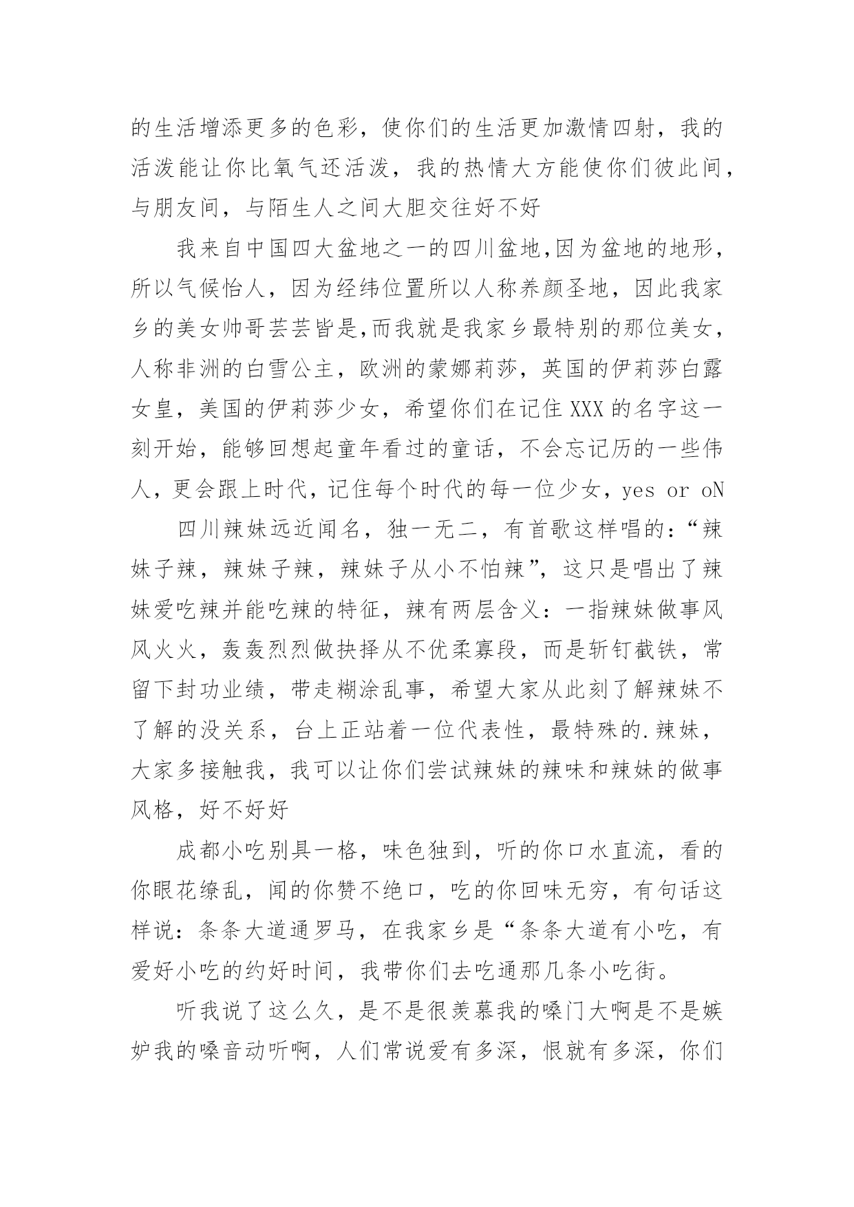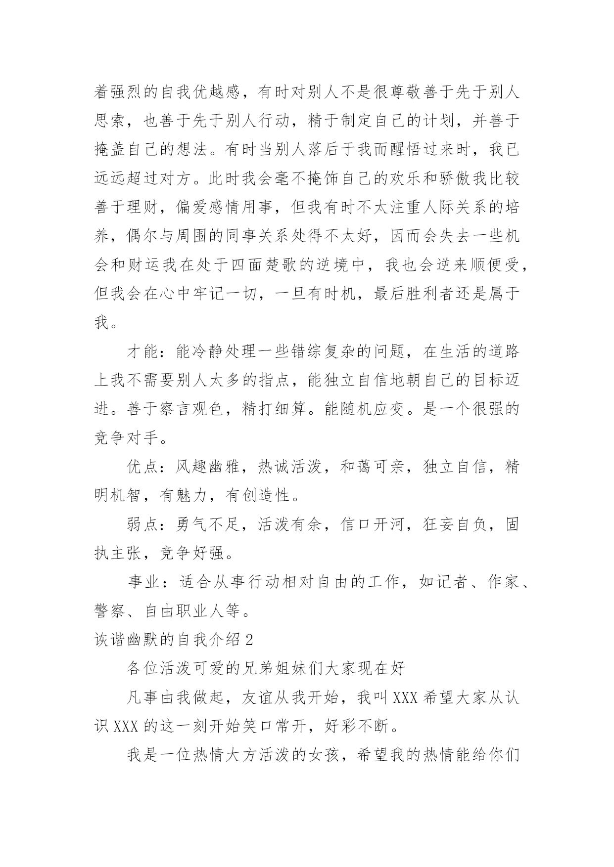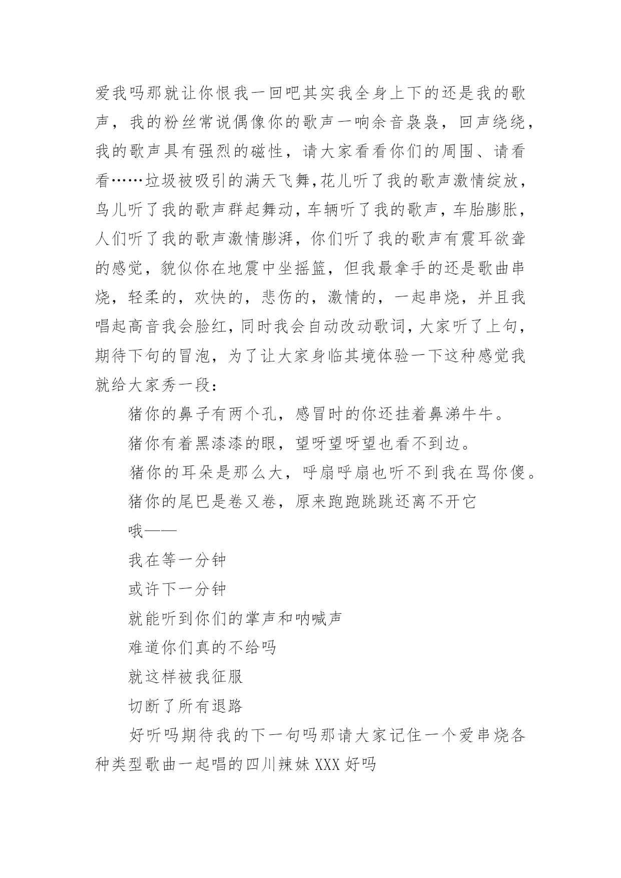 诙谐幽默的自我介绍诙谐幽默的自我介绍当我们在一个陌生场合中,我们总少不了要向他人介绍自己,自我介绍可以满足我们渴望得到尊重的心理。现在你是否对自我介绍一筹莫展呢?以下是小编为大家收集的诙谐幽默的自我介绍,欢迎大家分享。诙谐幽默的自我介绍1我叫朱x,生于农历戊申年五月二十八,O型巨蟹座投胎于猴年,跻身于男性“王国”。智者曰:“猴,一年到头忙,吃不愁,穿不愁,荣华富贵到白头,当官容易当家难,工作肯干,任劳任怨,不晋级就提干,不当先进就当模范。”当然,我不知这些说法有没有道理,我对自己的总体评价是:为人性急,作事虎头蛇尾,一生劳碌辛苦,利官近贵,财帛足用。特点:我是一个想象力极为丰富的人,为人和蔼可亲,有一定责任心,喜欢做有兴趣的工作不干涉他人,自己的事也不让别人干涉,对人对事容易盲从善于耐心地倾听别人诉苦,此时的我就好象是一位心理医生或象母亲一样,使人感到安心我的`防卫意识很强,我很多时候比较保守和现实。另一方面,我的虚荣心、嫉妒心、疑心比较强,为人做事总是从自己的角度出发,过多的考虑自己的得失为人机灵,有着强烈的自我优越感,有时对别人不是很尊敬善于先于别人思索,也善于先于别人行动,精于制定自己的计划,并善于掩盖自己的想法。有时当别人落后于我而醒悟过来时,我已远远超过对方。此时我会毫不掩饰自己的欢乐和骄傲我比较善于理财,偏爱感情用事,但我有时不太注重人际关系的培养,偶尔与周围的同事关系处得不太好,因而会失去一些机会和财运我在处于四面楚歌的逆境中,我也会逆来顺便受,但我会在心中牢记一切,一旦有时机,最后胜利者还是属于我。才能:能冷静处理一些错综复杂的问题,在生活的道路上我不需要别人太多的指点,能独立自信地朝自己的目标迈进。善于察言观色,精打细算。能随机应变。是一个很强的竞争对手。优点:风趣幽雅,热诚活泼,和蔼可亲,独立自信,精明机智,有魅力,有创造性。弱点:勇气不足,活泼有余,信口开河,狂妄自负,固执主张,竞争好强。事业:适合从事行动相对自由的工作,如记者、作家、警察、自由职业人等。诙谐幽默的自我介绍2各位活泼可爱的兄弟姐妹们大家现在好凡事由我做起,友谊从我开始,我叫XXX希望大家从认识XXX的这一刻开始笑口常开,好彩不断。我是一位热情大方活泼的女孩,希望我的热情能给你们的生活增添更多的色彩,使你们的生活更加激情四射,我的活泼能让你比氧气还活泼,我的热情大方能使你们彼此间,与朋友间,与陌生人之间大胆交往好不好我来自中国四大盆地之一的四川盆地,因为盆地的地形,所以气候怡人,因为经纬位置所以人称养颜圣地,因此我家乡的美女帅哥芸芸皆是,而我就是我家乡最特别的那位美女,人称非洲的白雪公主,欧洲的蒙娜莉莎,英国的伊莉莎白露女皇,美国的伊莉莎少女,希望你们在记住XXX的名字这一刻开始,能够回想起童年看过的童话,不会忘记历的一些伟人,更会跟上时代,记住每个时代的每一位少女,yesoroN四川辣妹远近闻名,独一无二,有首歌这样唱的:“辣妹子辣,辣妹子辣,辣妹子从小不怕辣”,这只是唱出了辣妹爱吃辣并能吃辣的特征,辣有两层含义:一指辣妹做事风风火火,轰轰烈烈做抉择从不优柔寡段,而是斩钉截铁,常留下封功业绩,带走糊涂乱事,希望大家从此刻了解辣妹不了解的没关系,台上正站着一位代表性,最特殊的.辣妹,大家多接触我,我可以让你们尝试辣妹的辣味和辣妹的做事风格,好不好好成都小吃别具一格,味色独到,听的你口水直流,看的你眼花缭乱,闻的你赞不绝口,吃的你回味无穷,有句话这样说:条条大道通罗马,在我家乡是“条条大道有小吃,有爱好小吃的约好时间,我带你们去吃通那几条小吃街。听我说了这么久,是不是很羡慕我的嗓门大啊是不是嫉妒我的嗓音动听啊,人们常说爱有多深,恨就有多深,你们爱我吗那就让你恨我一回吧其实我全身上下的还是我的歌声,我的粉丝常说偶像你的歌声一响余音袅袅,回声绕绕,我的歌声具有强烈的磁性,请大家看看你们的周围、请看看……垃圾被吸引的满天飞舞,花儿听了我的歌声激情绽放,鸟儿听了我的歌声群起舞动,车辆听了我的歌声,车胎膨胀,人们听了我的歌声激情膨湃,你们听了我的歌声有震耳欲聋的感觉,貌似你在地震中坐摇篮,但我最拿手的还是歌曲串烧,轻柔的,欢快的,悲伤的,激情的,一起串烧,并且我唱起高音我会脸红,同时我会自动改动歌词,大家听了上句,期待下句的冒泡,为了让大家身临其境体验一下这种感觉我就给大家秀一段:猪你的鼻子有两个孔,感冒时的你还挂着鼻涕牛牛。猪你有着黑漆漆的眼,望呀望呀望也看不到边。猪你的耳朵是那么大,呼扇呼扇也听不到我在骂你傻。猪你的尾巴是卷又卷,原来跑跑跳跳还离不开它哦——我在等一分钟或许下一分钟就能听到你们的掌声和呐喊声难道你们真的不给吗就这样被我征服切断了所有退路好听吗期待我的下一句吗那请大家记住一个爱串烧各种类型歌曲一起唱的四川辣妹XXX好吗最后祝大家: