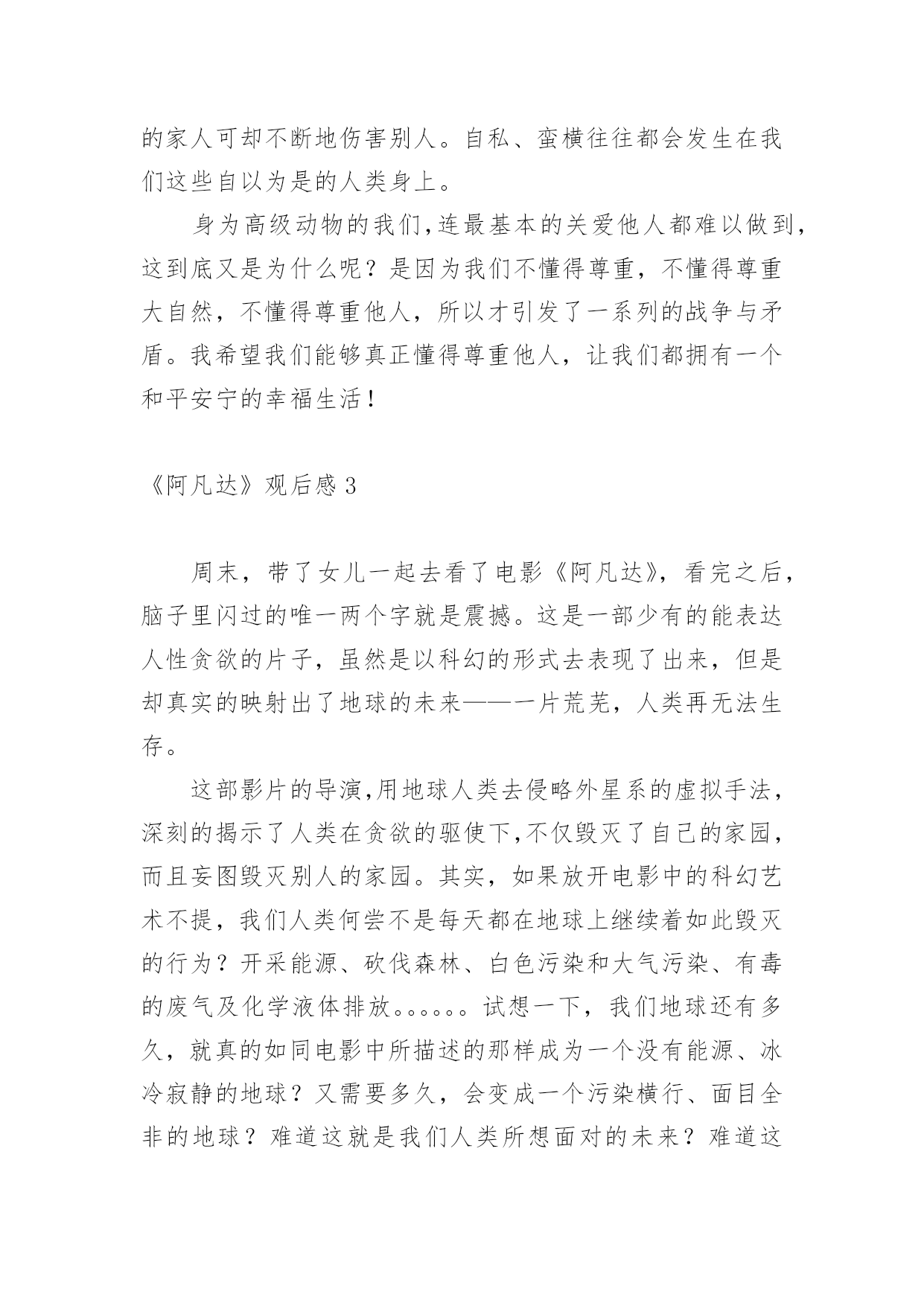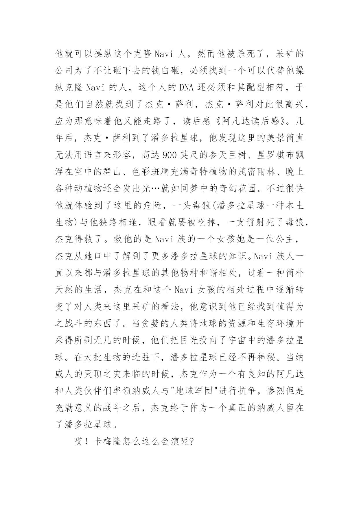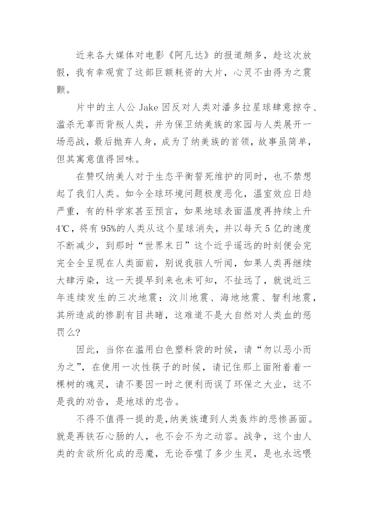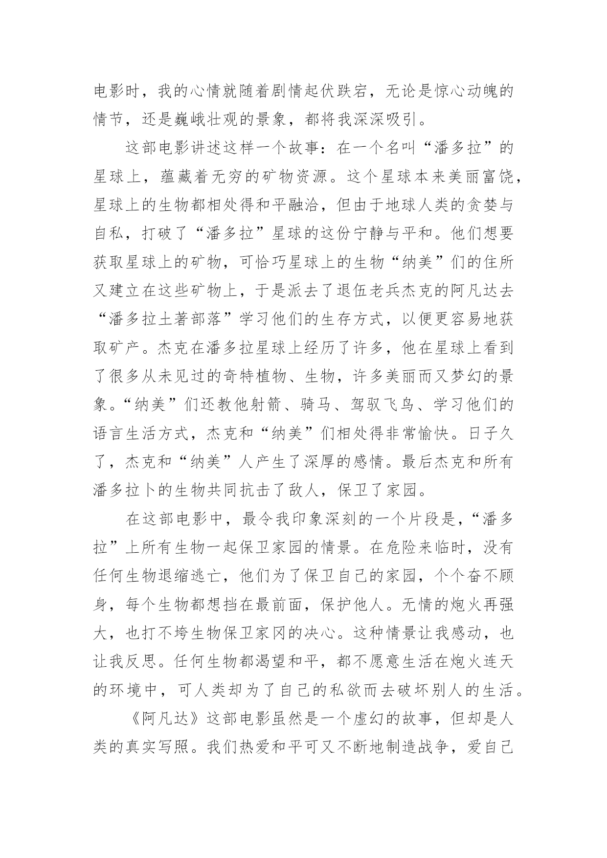 《阿凡达》观后感看完一部作品以后,一定对生活有了新的感悟和看法吧,不能光会看哦,写一篇观后感吧。到底应如何写观后感呢?下面是小编整理的《阿凡达》观后感,希望能够帮助到大家。《阿凡达》观后感1目前全世界票房收入最高、历史之上最成功的电影之一《阿凡达》的导演就是因创作《泰坦尼克号》而名震一时的詹姆斯?卡梅隆。少年时代的卡梅隆就已经开始科幻小说的创作,14岁时,他看了大师斯坦利?库布里克的《20xx太空漫游》,这部电影为他之后的科幻电影之路奠定了坚实基础。在《泰坦尼克号》之后,他发现精进的电影工业技术只是用来使一个原本就精彩的剧情更加引人入胜的手段,单靠特效无法成就一部好电影。于是他花14年时间谨慎构思,投入3亿美元,以亲自研发的虚拟影像撷取科技,花4年时间拍摄,终于在09年推出影迷期待已久的影片-《阿凡达》。与以往拍摄的科幻片不同,此次卡梅隆导演的讲述视角可谓独具匠心。运用第一人称视角凸显主人公的心理变化,从开始的一点点私心(想借助开采公司给的费用去做手术重新站起来)到他为完成任务而主动接近纳美人,再到后来爱上女主角,同时在内心认同纳美人,甘愿做一名纳美土著战士。衔接自然紧凑,在主人公感情的微小变化中我们能感受到这是一种必然,我想这是影片能够感动观众的原因之一。不能不说《阿凡达》如此成功很大程度上归功于独到细致的特技。我们可以在男女主句的脸上看到他们心理变化的蛛丝马迹。特技给观众带来超强视觉效果,不得不使观众感叹导演的拍摄功底。《星球大战》开启了特效电影的新时代,同时自那时起,越来越多的电脑制作图像被运用到了电影作品中,不但取代了传统特技,也令视觉效果的魅力大大超过电影故事本身。在感叹影片中精湛特效技术的同时我想到我国目前的一些影片中使用的特技效果,远不及此,令人惋惜。当影片无数次的出现人类用各种大型机械来破坏潘多拉星球时,我的心为之一震。导演的深度就在于影片在给我们视觉冲击的同时,也向我们抛出了一个重点问题――环保。随着工业的发展,人类的生活日新月异,但人类只是无限度的享受着美好生活,不曾想到工业污染对我们赖以生存的地球产生了多么大的威胁。当人类无限度的利用资源破坏环境之时,可曾想到有一天我们会因为这些做法而受到惩罚?如果我们还得向外星人或者虚幻的角色学习如何保护环境,那将是怎样的悲哀?电影《阿凡达》给我们带来的是一种视觉冲击,更是一种心灵震撼,不要让如梦似幻的潘多拉星球的悲剧发生在我们身上!《阿凡达》观后感2当《阿凡达》的风暴席卷全球时,怀着期待的心情,我观看了《阿凡达》这部年度大片,果然没有使我失望。观看电影时,我的心情就随着剧情起伏跌宕,无论是惊心动魄的情节,还是巍峨壮观的景象,都将我深深吸引。这部电影讲述这样一个故事:在一个名叫“潘多拉”的星球上,蕴藏着无穷的矿物资源。这个星球本来美丽富饶,星球上的生物都相处得和平融洽,但由于地球人类的贪婪与自私,打破了“潘多拉”星球的这份宁静与平和。他们想要获取星球上的矿物,可恰巧星球上的生物“纳美”们的住所又建立在这些矿物上,于是派去了退伍老兵杰克的阿凡达去“潘多拉土著部落”学习他们的生存方式,以便更容易地获取矿产。杰克在潘多拉星球上经历了许多,他在星球上看到了很多从未见过的奇特植物、生物,许多美丽而又梦幻的景象。“纳美”们还教他射箭、骑马、驾驭飞鸟、学习他们的语言生活方式,杰克和“纳美”们相处得非常愉快。日子久了,杰克和“纳美”人产生了深厚的感情。最后杰克和所有潘多拉卜的生物共同抗击了敌人,保卫了家园。在这部电影中,最令我印象深刻的一个片段是,“潘多拉”上所有生物一起保卫家园的情景。在危险来临时,没有任何生物退缩逃亡,他们为了保卫自己的家园,个个奋不顾身,每个生物都想挡在最前面,保护他人。无情的炮火再强大,也打不垮生物保卫家冈的决心。这种情景让我感动,也让我反思。任何生物都渴望和平,都不愿意生活在炮火连天的环境中,可人类却为了自己的私欲而去破坏别人的生活。《阿凡达》这部电影虽然是一个虚幻的故事,但却是人类的真实写照。我们热爱和平可又不断地制造战争,爱自己的家人可却不断地伤害别人。自私、蛮横往往都会发生在我们这些自以为是的人类身上。身为高级动物的我们,连最基本的关爱他人都难以做到,这到底又是为什么呢?是因为我们不懂得尊重,不懂得尊重大自然,不懂得尊重他人,所以才引发了一系列的战争与矛盾。我希望我们能够真正懂得尊重他人,让我们都拥有一个和平安宁的幸福生活!《阿凡达》观后感3周末,带了女儿一起去看了电影《阿凡达》,看完之后,脑子里闪过的唯一两个字就是震撼。这是一部少有的能表达人性贪欲的片子,虽然是以科幻的形式去表现了出来,但是却真实的映射出了地球的未来——一片荒芜,人类再无法生存。这部影片的导演,用地球人类去侵略外星系的虚拟手法,深刻的揭示了人类在贪欲的驱使下,不仅毁灭了自己的家园,