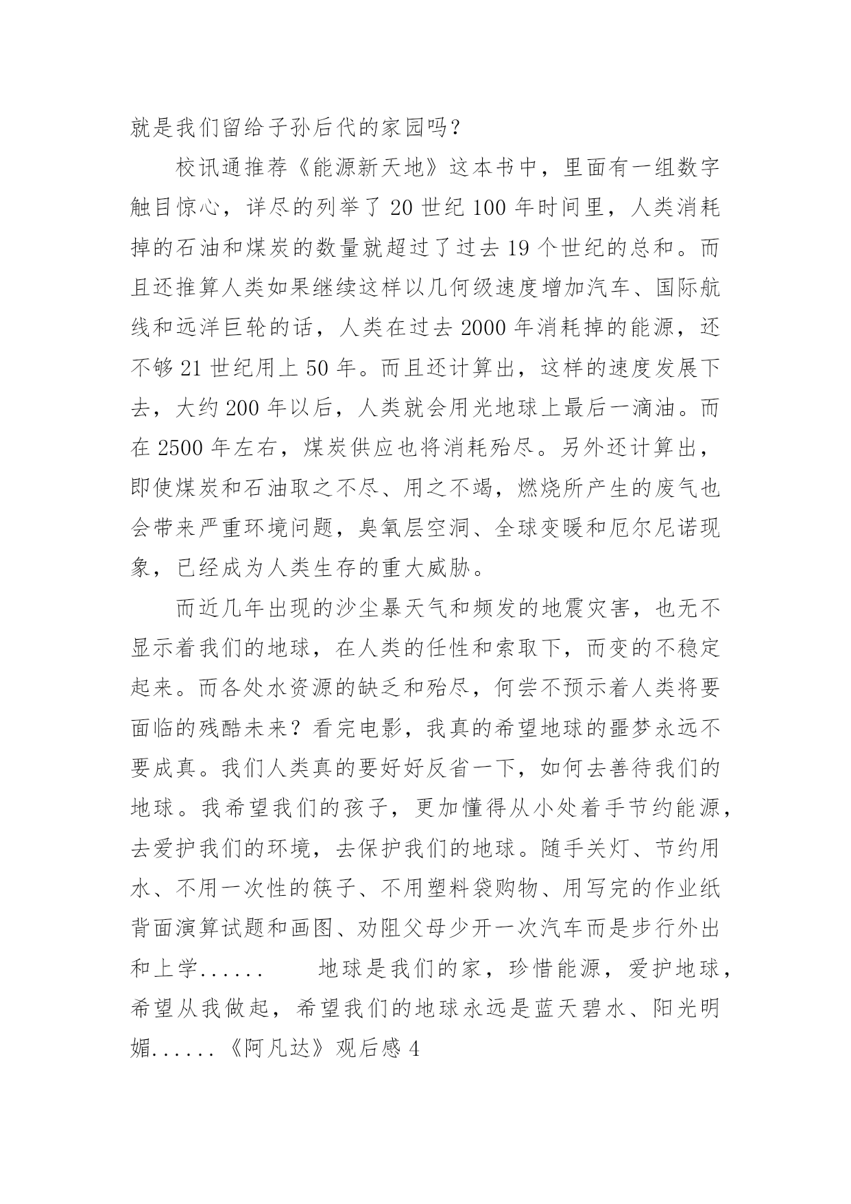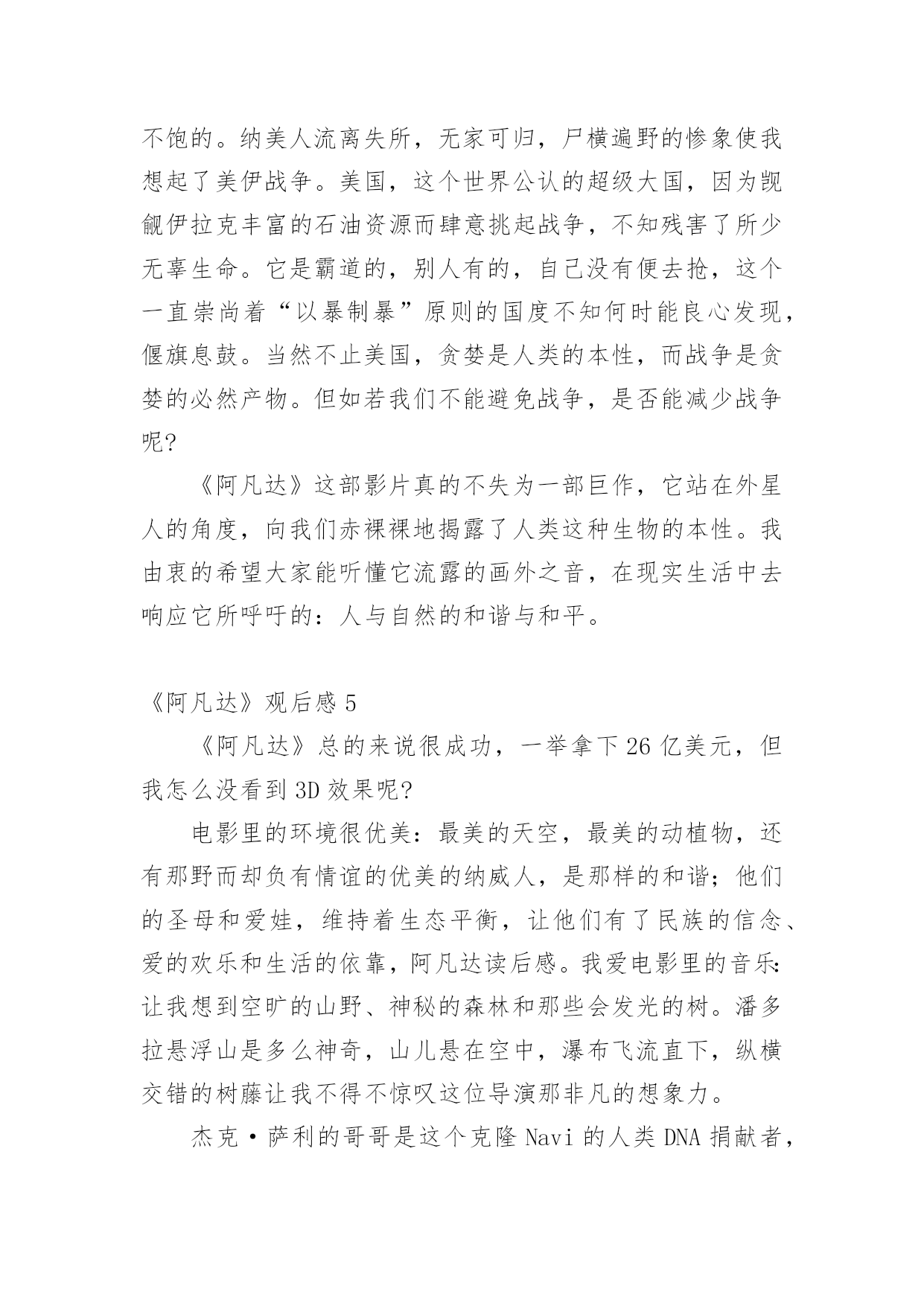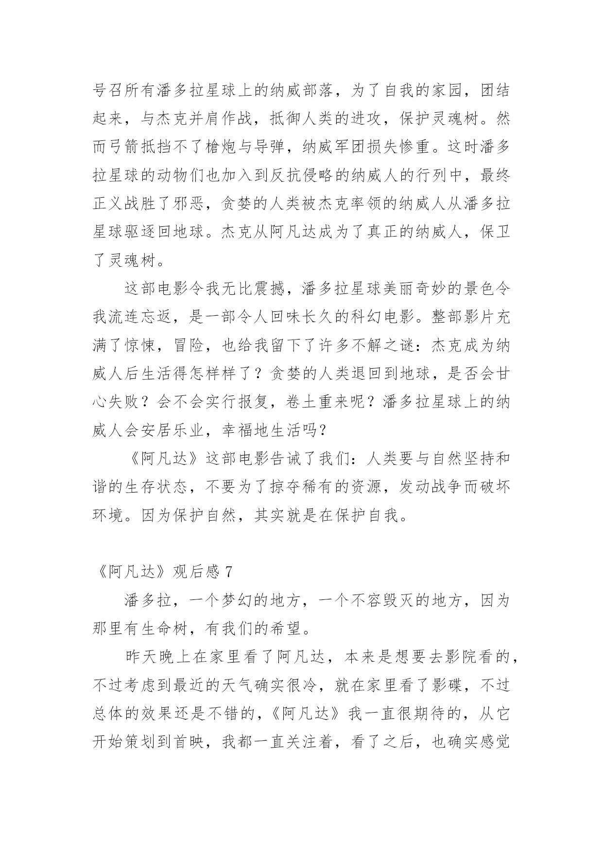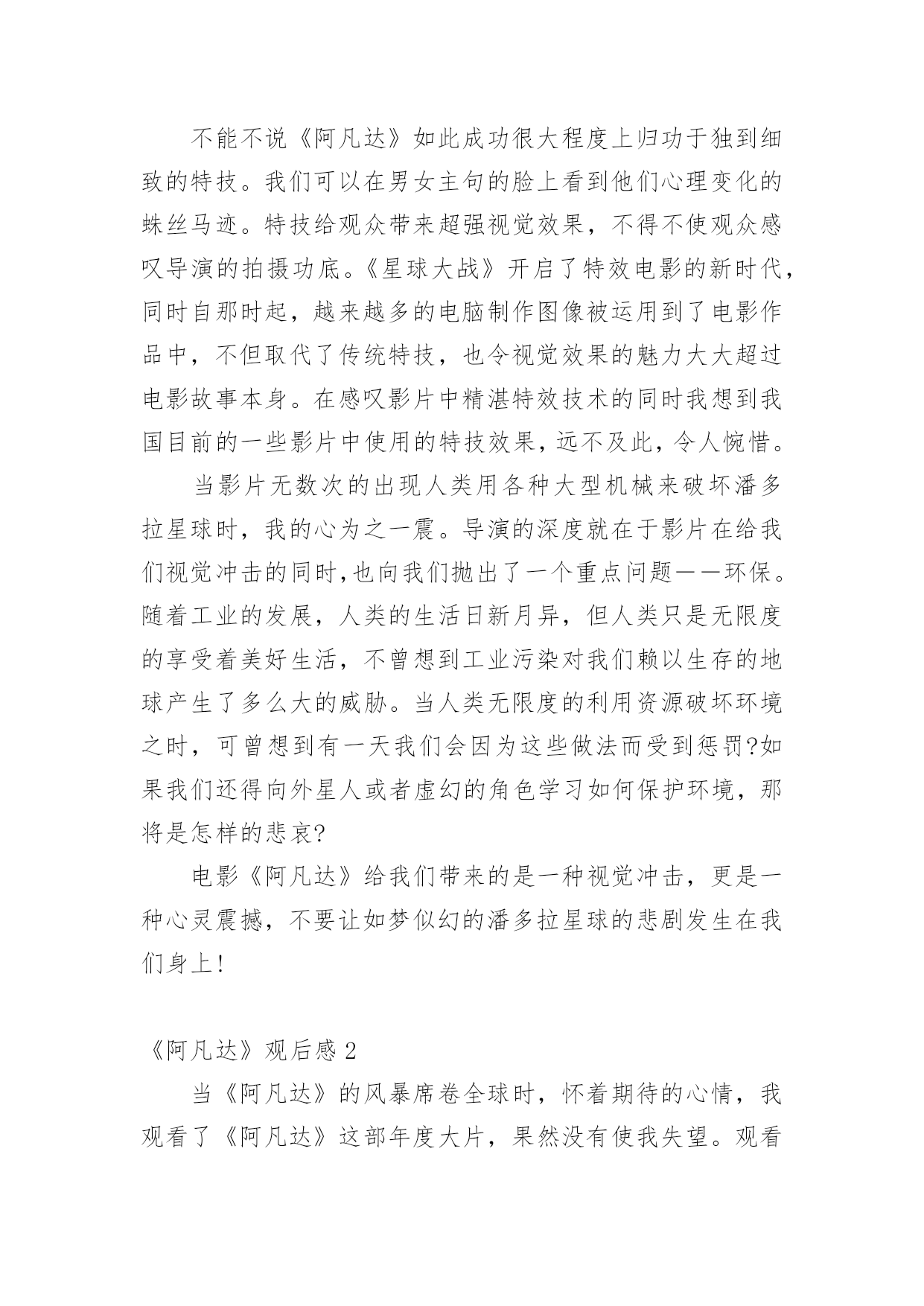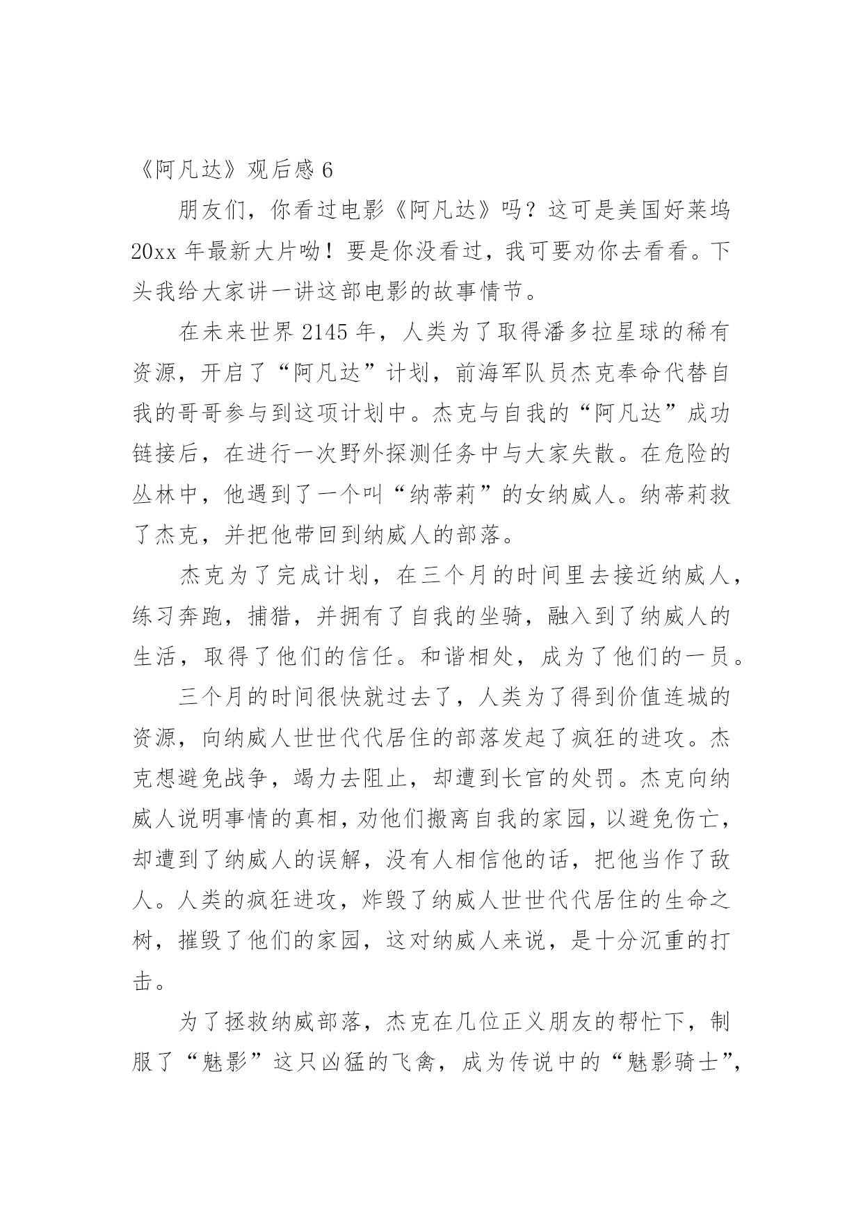 《阿凡达》观后感看完一部作品以后,一定对生活有了新的感悟和看法吧,不能光会看哦,写一篇观后感吧。到底应如何写观后感呢?下面是小编整理的《阿凡达》观后感,希望能够帮助到大家。《阿凡达》观后感1目前全世界票房收入最高、历史之上最成功的电影之一《阿凡达》的导演就是因创作《泰坦尼克号》而名震一时的詹姆斯?卡梅隆。少年时代的卡梅隆就已经开始科幻小说的创作,14岁时,他看了大师斯坦利?库布里克的《20xx太空漫游》,这部电影为他之后的科幻电影之路奠定了坚实基础。在《泰坦尼克号》之后,他发现精进的电影工业技术只是用来使一个原本就精彩的剧情更加引人入胜的手段,单靠特效无法成就一部好电影。于是他花14年时间谨慎构思,投入3亿美元,以亲自研发的虚拟影像撷取科技,花4年时间拍摄,终于在09年推出影迷期待已久的影片-《阿凡达》。与以往拍摄的科幻片不同,此次卡梅隆导演的讲述视角可谓独具匠心。运用第一人称视角凸显主人公的心理变化,从开始的一点点私心(想借助开采公司给的费用去做手术重新站起来)到他为完成任务而主动接近纳美人,再到后来爱上女主角,同时在内心认同纳美人,甘愿做一名纳美土著战士。衔接自然紧凑,在主人公感情的微小变化中我们能感受到这是一种必然,我想这是影片能够感动观众的原因之一。不能不说《阿凡达》如此成功很大程度上归功于独到细致的特技。我们可以在男女主句的脸上看到他们心理变化的蛛丝马迹。特技给观众带来超强视觉效果,不得不使观众感叹导演的拍摄功底。《星球大战》开启了特效电影的新时代,同时自那时起,越来越多的电脑制作图像被运用到了电影作品中,不但取代了传统特技,也令视觉效果的魅力大大超过电影故事本身。在感叹影片中精湛特效技术的同时我想到我国目前的一些影片中使用的特技效果,远不及此,令人惋惜。当影片无数次的出现人类用各种大型机械来破坏潘多拉星球时,我的心为之一震。导演的深度就在于影片在给我们视觉冲击的同时,也向我们抛出了一个重点问题――环保。随着工业的发展,人类的生活日新月异,但人类只是无限度的享受着美好生活,不曾想到工业污染对我们赖以生存的地球产生了多么大的威胁。当人类无限度的利用资源破坏环境之时,可曾想到有一天我们会因为这些做法而受到惩罚?如果我们还得向外星人或者虚幻的角色学习如何保护环境,那将是怎样的悲哀?电影《阿凡达》给我们带来的是一种视觉冲击,更是一种心灵震撼,不要让如梦似幻的潘多拉星球的悲剧发生在我们身上!《阿凡达》观后感2当《阿凡达》的风暴席卷全球时,怀着期待的心情,我观看了《阿凡达》这部年度大片,果然没有使我失望。观看电影时,我的心情就随着剧情起伏跌宕,无论是惊心动魄的情节,还是巍峨壮观的景象,都将我深深吸引。这部电影讲述这样一个故事:在一个名叫“潘多拉”的星球上,蕴藏着无穷的矿物资源。这个星球本来美丽富饶,星球上的生物都相处得和平融洽,但由于地球人类的贪婪与自私,打破了“潘多拉”星球的这份宁静与平和。他们想要获取星球上的矿物,可恰巧星球上的生物“纳美”们的住所又建立在这些矿物上,于是派去了退伍老兵杰克的阿凡达去“潘多拉土著部落”学习他们的生存方式,以便更容易地获取矿产。杰克在潘多拉星球上经历了许多,他在星球上看到了很多从未见过的奇特植物、生物,许多美丽而又梦幻的景象。“纳美”们还教他射箭、骑马、驾驭飞鸟、学习他们的语言生活方式,杰克和“纳美”们相处得非常愉快。日子久了,杰克和“纳美”人产生了深厚的感情。最后杰克和所有潘多拉卜的生物共同抗击了敌人,保卫了家园。在这部电影中,最令我印象深刻的一个片段是,“潘多拉”上所有生物一起保卫家园的情景。在危险来临时,没有任何生物退缩逃亡,他们为了保卫自己的家园,个个奋不顾身,每个生物都想挡在最前面,保护他人。无情的炮火再强大,也打不垮生物保卫家冈的决心。这种情景让我感动,也让我反思。任何生物都渴望和平,都不愿意生活在炮火连天的环境中,可人类却为了自己的私欲而去破坏别人的生活。《阿凡达》这部电影虽然是一个虚幻的故事,但却是人类的真实写照。我们热爱和平可又不断地制造战争,爱自己的家人可却不断地伤害别人。自私、蛮横往往都会发生在我们这些自以为是的人类身上。身为高级动物的我们,连最基本的关爱他人都难以做到,这到底又是为什么呢?是因为我们不懂得尊重,不懂得尊重大自然,不懂得尊重他人,所以才引发了一系列的战争与矛盾。我希望我们能够真正懂得尊重他人,让我们都拥有一个和平安宁的幸福生活!《阿凡达》观后感3周末,带了女儿一起去看了电影《阿凡达》,看完之后,脑子里闪过的唯一两个字就是震撼。这是一部少有的能表达人性贪欲的片子,虽然是以科幻的形式去表现了出来,但是却真实的映射出了地球的未来——一片荒芜,人类再无法生存。这部影片的导演,用地球人类去侵略外星系的虚拟手法,深刻的揭示了人类在贪欲的驱使下,不仅毁灭了自己的家园,