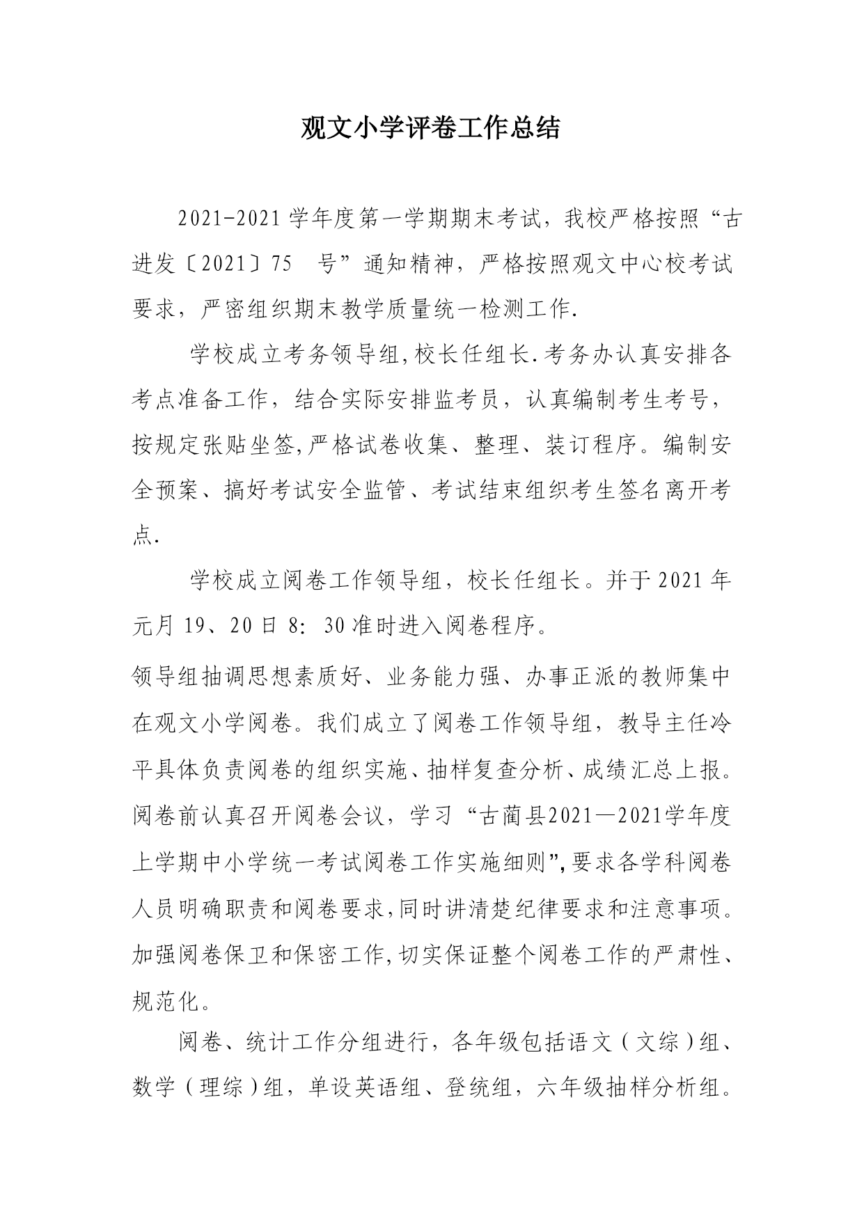 阅卷工作总结实用文档(实用文档,可以直接使用,可编辑优秀版资料,欢迎下载)观文小学评卷工作总结2021-2021学年度第一学期期末考试,我校严格按照“古进发〔2021〕75号”通知精神,严格按照观文中心校考试要求,严密组织期末教学质量统一检测工作.学校成立考务领导组,校长任组长.考务办认真安排各考点准备工作,结合实际安排监考员,认真编制考生考号,按规定张贴坐签,严格试卷收集、整理、装订程序。编制安全预案、搞好考试安全监管、考试结束组织考生签名离开考点.学校成立阅卷工作领导组,校长任组长。并于2021年元月19、20日8:30准时进入阅卷程序。领导组抽调思想素质好、业务能力强、办事正派的教师集中在观文小学阅卷。我们成立了阅卷工作领导组,教导主任冷平具体负责阅卷的组织实施、抽样复查分析、成绩汇总上报。阅卷前认真召开阅卷会议,学习“古蔺县2021—2021学年度上学期中小学统一考试阅卷工作实施细则”,要求各学科阅卷人员明确职责和阅卷要求,同时讲清楚纪律要求和注意事项。加强阅卷保卫和保密工作,切实保证整个阅卷工作的严肃性、规范化。阅卷、统计工作分组进行,各年级包括语文(文综)组、数学(理综)组,单设英语组、登统组,六年级抽样分析组。整个阅卷工作实行组长负责制,成员分工协作;各学科采取流水作业形式阅卷,杜绝包本作业。阅卷前,由组长组织学习参考答案,统一评分标准.对于超课标、超教材、有歧义的试题及答案,先在阅卷前统一评卷尺度。标准统一后,分工协作,采用流水作业形式阅卷。阅卷后,教师要在试卷上相应位置签名确认。阅卷时,无关人员严禁入内,阅卷教师不能越组干扰。领导组加强阅卷巡视,保证此项工作规范运作.阅卷复查责任到人。阅卷复查准确无误后,组长把试卷交回考务办。由登统组负责登统工作。同时领导组抽调骨干力量对试卷进行抽样评估分析。尤其是对六年级各科试卷抽取50份进行剖析。剖析内容包括试题范围、题型特点、难易、学生答卷得分情况、存在突出问题等方面。精品文档,你值得期待整个阅卷、统计过程,组织严密,标准统一,操作规范,评分公正,能够为来期教学常规工作提供可靠的基础性数据。防火工作总结局防指:我站今年森林防火工作在林业局党委、林业局的统一领导下,一如继往,坚定不移地认真贯彻执行《森林法》、《森林防火条例》等法律法规及林业局森林防火工作会议精神,坚持”预防为主、积极消灭"的森林防火方针,狠抓了责任制落实、防火宣传、野外火源管理及隐患排查等方面的工作,在全站和扎赉河农场的齐抓共管下,经全体林业职工的共同努力,圆满地完成了今年的防火工作任务取得了全年零火警的好成绩.现将我站全年森林防火工作总结如下:一、工作开展情况(一)健全机构,充实设备,完善扑救预案管护站建立健全扑火组织机构.局森林防火指挥部为切实加强对全局森林防火工作的组织领导,及时调整充实了朝阳管护站,车辆一台、对讲机2部、GPS2个、割灌机1台、油锯2台等.管护站完善和细化了《扑救森林火灾预案》。具体工作:1、跟雪点烧防火隔离带180。5公里(前后从复点烧五遍),2、自制防火旗帜300面(防指发200面,共计500面),3、防火协查员袖标55个,4、签订防火责任状568份,5、关于防火宣传《致学生家长的一封信》计:160封.6、张贴防火标语400幅。7、悬挂防火宣传横幅5幅,联合五个管护站在春秋两个防火期开展防火宣传活动.(二)强化领导,落实责任,消除火险隐患为切实把管理局、局防指森林防火工作的有关精神、指示落到实处,针对不同时期的不同情况进行深入研究和部署,年初,林业局与各管护站签订了森林防火责任书,全面落实森林防火工作责任制,实行全程负责.局防指不定期到各管护站对森林防火工作落实情况进行明查暗访,重点检查防火措施、防火预案及防火责任人落实情况等,尤其是森林防火预案的制定作为安全检查工作的支撑点来抓,确保预案制定工作落到实处。(三)广泛宣传,警钟长鸣,增强防火意识充分利用广播、电视等多种宣传方式,开展内容丰富、形式多样、群众喜闻乐见的森林防火宣传教育活动,切实提高全民防火意识和法制观念,做到防火教育警钟长鸣。(1)在进入林区的主要路口、重点地段和风景旅游区设立永久固定森林防火宣传警示牌和悬挂宣传标语。共设立了永久固定宣传警示牌,对进山作业人员起到了良好的警示作用。(2)在电视、报刊等宣传媒体开辟森林防火专题栏目。在全镇营造了浓厚的防火舆论氛围.(3)我站在采取行政手段抓森林防火的同时,切实加强法制教育,坚持依法治火,充分发挥法律手段在森林防火中的重要作用。(四)强化措施,加强管护,狠抓火源管理管护站以片为单位划分了森林防火责任区,在每块责任区均落实了责任领导及包干责任人。对村民采集山野菜,实行人性化管理,没有办理一个野外扎点采集点.