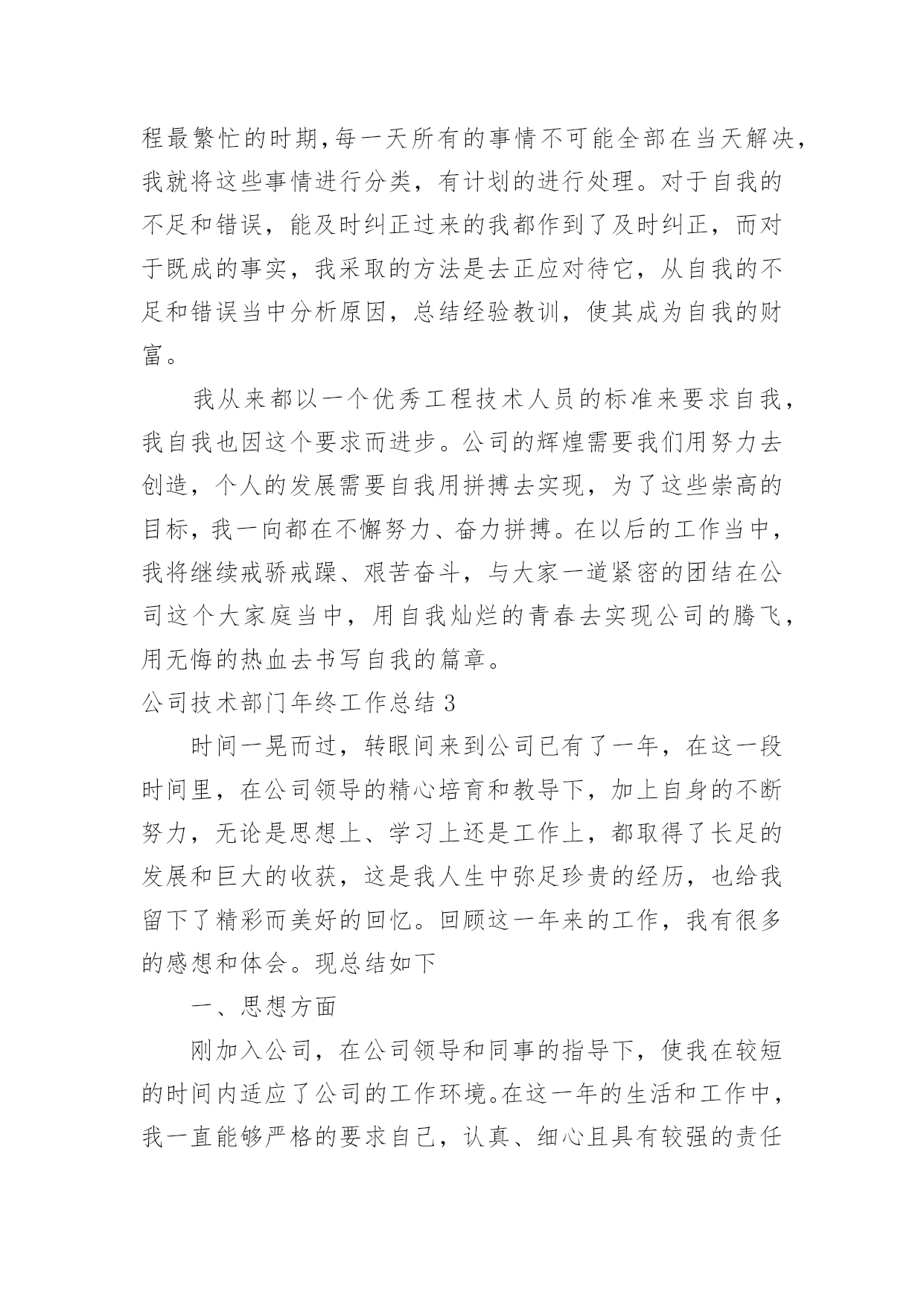 公司技术部门年终工作总结公司技术部门年终工作总结总结就是对一个时期的学习、工作或其完成情况进行一次全面系统的回顾和分析的书面材料,写总结有利于我们学习和工作能力的提高,不如静下心来好好写写总结吧。总结你想好怎么写了吗?下面是小编帮大家整理的公司技术部门年终工作总结,欢迎大家借鉴与参考,希望对大家有所帮助。公司技术部门年终工作总结1在过去的20xx年里,技术部门所有人员在不断的学习中,逐渐熟悉公司新的管理模式和新的文件流程方式;本着对工作认真负责的态度,参加各种工程会议;,认真检查、跟踪落实各分项工程施工质量及进展情况;了解工程动态,对有可能出现问题的项目进行事前预控,将损失降到最小。维护公司利益,把公司的利益放在首位;尽忠于公司,把公司的事业与自身的发展融为一体;尽责于本职工作,均没有缺习早退现象,没有任何工程师受过任何处分;互相能妥善处理好同事之间的关系,积极发挥团队合作精神,基本能按时努力完成领导下达的各项指标任务,对工程提出理论性、经验性、实际性建议,促使工程顺利圆满。在过去一年中,技术部的工作任务是繁杂/繁琐的一年,回顾20xx年的工作,技术部工作总结如下:资源共享系统建设的完成:已经完成所有门店及新建项目已有的图纸电子归档集成系统,一、项目支持:技术项目组就长兴八佰伴项目、金坛西门新建项目,全程参与了项目的规划及实施,对各阶段方案进行技术分析及把控,对设计方出图进行综合审查并与其沟通审查意见。密切跟踪长兴项目现阶段的基坑工程,对图纸变更及施工方案进行研讨及把控,提供必要的技术支持。泰兴大统华项目:负责结构加固方案的确定及施工图审查,协调事业部与设计方设计过程中的'方案变更事宜。为屋顶新增生活水箱设计基础,为楼板上新增砌体墙提供结构处理方案。目前该项目正在准备进行结构加固施工。常州武进项目:负责对广场原下地下室楼梯改为自动扶梯的结构加固进行跟踪。目前该处结构改造工程已接近尾声。无锡八佰伴自动扶梯改造项目:主要负责对原结构加固图纸的审核,看其是否满足本次扶梯改造的要求。原图纸已经设计了新增扶梯的基坑等构件,可以按图施工。霞客大统华项目:审查结构加固图纸,对屋顶新增水箱的屋面承重进行复核。现工程已完工。技术部年度工作总结华士大统华项目,参与江阴华士超市扩初设计方案讨论,并跟踪项目实施进度。目前工程正按施工计划有序进行。丹阳华地十字路口地下车库项目,对丹阳华地十字路口地下车库的规划进行结构设计并绘制结构图,以便计算工程造价,为项目投资提供参考数据。自行提出结构改造方案:就和信店自动扶梯改造项目提出《和信电动扶梯改造4套方案的结构提案报告》;对溧阳大统华改造提出楼板加固方案;对无锡八佰伴七楼的外婆家楼板漏水情况进行分析并提出处理方案;泰兴项目加固工程技术方案等。拟建项目的总体规划:绘制合肥市冻结地块初步规划方案;绘制合肥中心商务区地块初步规划方案;绘制金坛老西门菜场地块初步规划方案。图纸及合同任务书的审查工作:审查南通百货大楼中庭加扶梯改造图;审查宜兴和信店及南京八佰伴改造项目的设计图纸完成情况;审查"苏地20xx-B-57地块商业办公"的建筑图纸,对该建筑是否符合华地集团开店的物业要求提出参考意见;查看近期运行的各项目的交付条件或租赁合同,分析条款里应明确但未明确的权责与义务,为今后的合同完善做支持。二、技术纲要编制:技术部项目组协助相关部门编制制度及标准:《华地国际工程项目技术工作进展跟踪计划表》;各项目的层高、荷载、装修高度的设计标准;《华地国际工程管理制度总纲及流程》;《华地国际工程改(扩)建项目管理制度及流程》;《设计管理制度及流程》;《华地企业超市待建(租赁)项目建筑技术标准(20xx年7月试用版)》;《华地国际百货(购物中心)收购(租赁)项目建筑技术参考》;《关于项目图纸变更程序与图纸归档的规定》;《工程技术与物管条款》;《华地功能招商营建原则》等等。三、工作中存在的问题:1.与各部门间的沟通问题:在工作中,和各部门的沟通存在问题,很多问题不能在第一时间反应到技术部,就不能及时解决,将影响各部门的工作。经过10月份与各部门开会商讨的结果,目前有很大的变化,基本能及时掌握信息。2.问题解决存在不及时:由于是技术分工与专业专人负责制度,有些问题相互存在矛盾和冲突,不能及时解决处理,从20xx年开始,就计划就一些问题,召集开店部/规划部,等各专业就一些问题,集中讨论,集中解决,加快工作效率。形成一个整体团队。3.业务专业能力加强:日常工作开展还可以,但就一些,新科技,创新方面还很不足,今后要加强人员自我学习。20xx年度重点技术攻关项目是,空调/暖通系统设计要创新,发挥多年来汲取的技术与经验,就目前所有门店下冷上热状态,要有较大的改观,在技术上要攻关,要突破这个难题,啃下这个硬骨头,弥补这一技术空白。4.技术力量分
