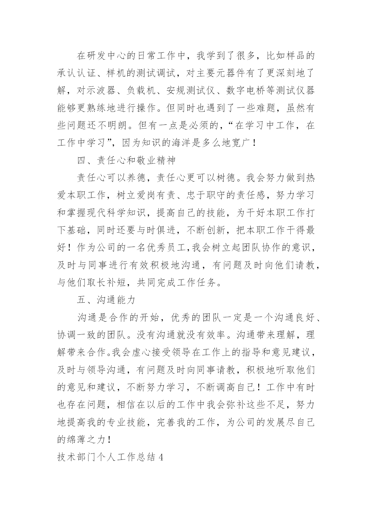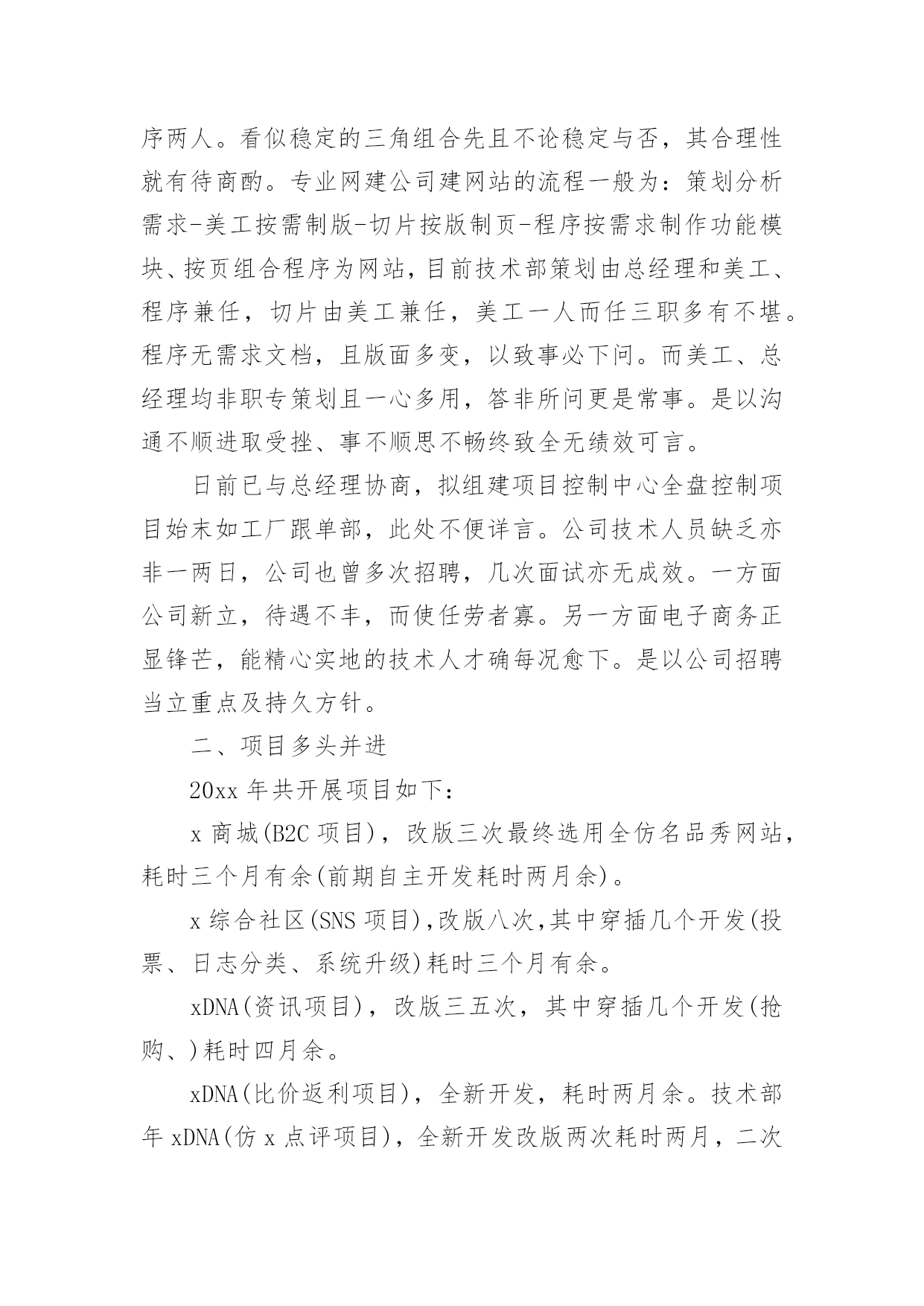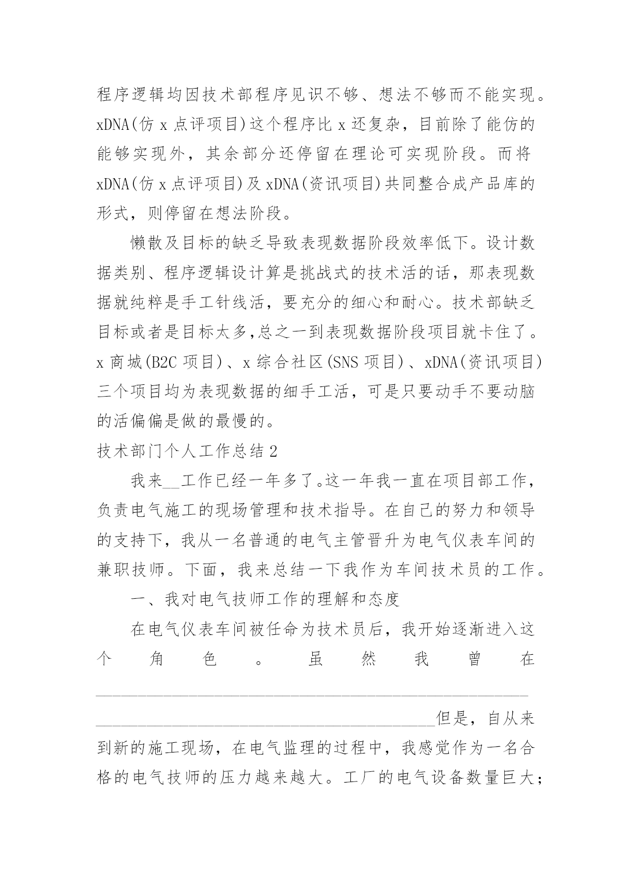 技术部门个人工作总结技术部门个人工作总结(15篇)总结是在某一特定时间段对学习和工作生活或其完成情况,包括取得的成绩、存在的问题及得到的经验和教训加以回顾和分析的书面材料,它有助于我们寻找工作和事物发展的规律,从而掌握并运用这些规律,让我们一起来学习写总结吧。那么如何把总结写出新花样呢?下面是小编整理的技术部门个人工作总结,欢迎大家借鉴与参考,希望对大家有所帮助。技术部门个人工作总结1温故而知新,前行回望更知曲直,20xx平静悄无声息的过去,可是作为一个锐意进取的人来说过去的不是结束,而是新起点爆发力的积累。在此辞旧迎新之际展翅欲飞时,将技术部门在20xx年的工作做一个回顾,旨在去疑窦、组纲目、立主脑,为20xx年能具有绩效的工作,打下坚实的基础。20xx年技术部门各工作人员善处于单兵据点各自为战的磨合期,而主要工作任务也是学习各优秀站点成功的技术应用和运营方式。在那里我对技术部目前遇到的困难及解决方式作个总结:一、专业技术队伍薄弱由于新公司成立不久,存在人才奇缺的严重不足。作为新兴的信息科技公司目前公司技术部共三人,美工一人、程序两人。看似稳定的三角组合先且不论稳定与否,其合理性就有待商酌。专业网建公司建网站的流程一般为:策划分析需求-美工按需制版-切片按版制页-程序按需求制作功能模块、按页组合程序为网站,目前技术部策划由总经理和美工、程序兼任,切片由美工兼任,美工一人而任三职多有不堪。程序无需求文档,且版面多变,以致事必下问。而美工、总经理均非职专策划且一心多用,答非所问更是常事。是以沟通不顺进取受挫、事不顺思不畅终致全无绩效可言。日前已与总经理协商,拟组建项目控制中心全盘控制项目始末如工厂跟单部,此处不便详言。公司技术人员缺乏亦非一两日,公司也曾多次招聘,几次面试亦无成效。一方面公司新立,待遇不丰,而使任劳者寡。另一方面电子商务正显锋芒,能精心实地的技术人才确每况愈下。是以公司招聘当立重点及持久方针。二、项目多头并进20xx年共开展项目如下:x商城(B2C项目),改版三次最终选用全仿名品秀网站,耗时三个月有余(前期自主开发耗时两月余)。x综合社区(SNS项目),改版八次,其中穿插几个开发(投票、日志分类、系统升级)耗时三个月有余。xDNA(资讯项目),改版三五次,其中穿插几个开发(抢购、)耗时四月余。xDNA(比价返利项目),全新开发,耗时两月余。技术部年xDNA(仿x点评项目),全新开发改版两次耗时两月,二次开发耗时一月。这些项目中我想仅有开发者自身才明白这些项目的特性或许有些特性开发者也已经忘记或被混淆了。这些项目仅有"仿x点评项目"和"资讯项目"是贴合最初构思目标和目的的。项目的多头并进是任何一个追求绩效的公司的忌讳,缺乏单纯动机的多项目开发往往使得开发人员多不可估算的项目产生恐惧。三、技术可是关网站不是一堆网页的集合,而是现实生活中的可见的或不可见的数据的集合并以必须可变的逻辑表现出来。技术部的任务大致能够分为三类:设计数据类别以便存储数据、归纳常用逻辑、表现数据,目前技术部三块均存在问题。设计数据类别:技术部门没有专业市场认识,对可能出现的数据类型缺乏预见性,以致开发的系统不能如同行网站一样运营。其中技术部美工对市场缺乏认识,导致前台界面与后台数据不吻合被迫改版或导致图片版与最终效果不一致。另技术部程序对系统数据设计和开发时间缺乏安排,导致xDNA(仿x点评项目)和xDNA(比价返利项目)均不一样程度的进行二次开发。程序逻辑设计:x商城(B2C项目)、x综合社区(SNS项目)、xDNA(资讯项目)这三个项目开源程序涉及的仅简单的页面显示逻辑。xDNA(比价返利项目)程序逻辑设计目前仅实现比价逻辑,返利、产品搜索、与其它平台同步价格这几快程序逻辑均因技术部程序见识不够、想法不够而不能实现。xDNA(仿x点评项目)这个程序比x还复杂,目前除了能仿的能够实现外,其余部分还停留在理论可实现阶段。而将xDNA(仿x点评项目)及xDNA(资讯项目)共同整合成产品库的形式,则停留在想法阶段。懒散及目标的缺乏导致表现数据阶段效率低下。设计数据类别、程序逻辑设计算是挑战式的技术活的话,那表现数据就纯粹是手工针线活,要充分的细心和耐心。技术部缺乏目标或者是目标太多,总之一到表现数据阶段项目就卡住了。x商城(B2C项目)、x综合社区(SNS项目)、xDNA(资讯项目)三个项目均为表现数据的细手工活,可是只要动手不要动脑的活偏偏是做的最慢的。技术部门个人工作总结2我来__工作已经一年多了。这一年我一直在项目部工作,负责电气施工的现场管理和技术指导。在自己的努力和领导的支持下,我从一名普通的电气主管晋升为电气仪表车间的兼职技师。下面,我来总结一下我作为车间技术员的工作。一、我对电气技师工作的理解和态度在电气仪表车间被任命为技术员后,