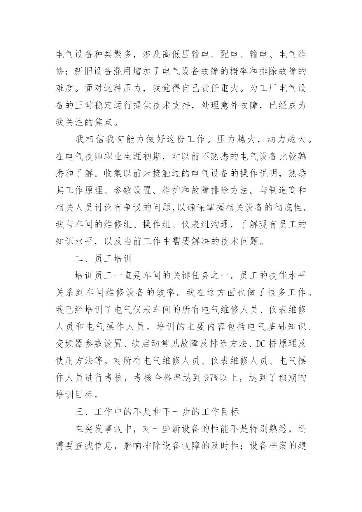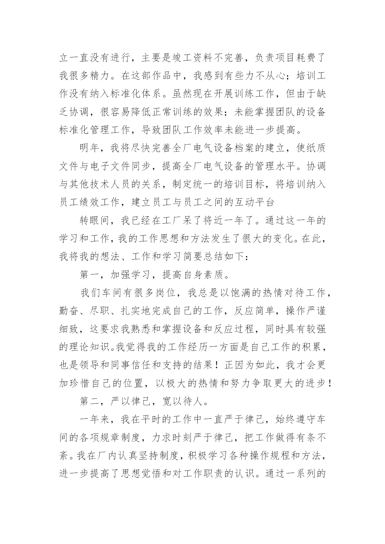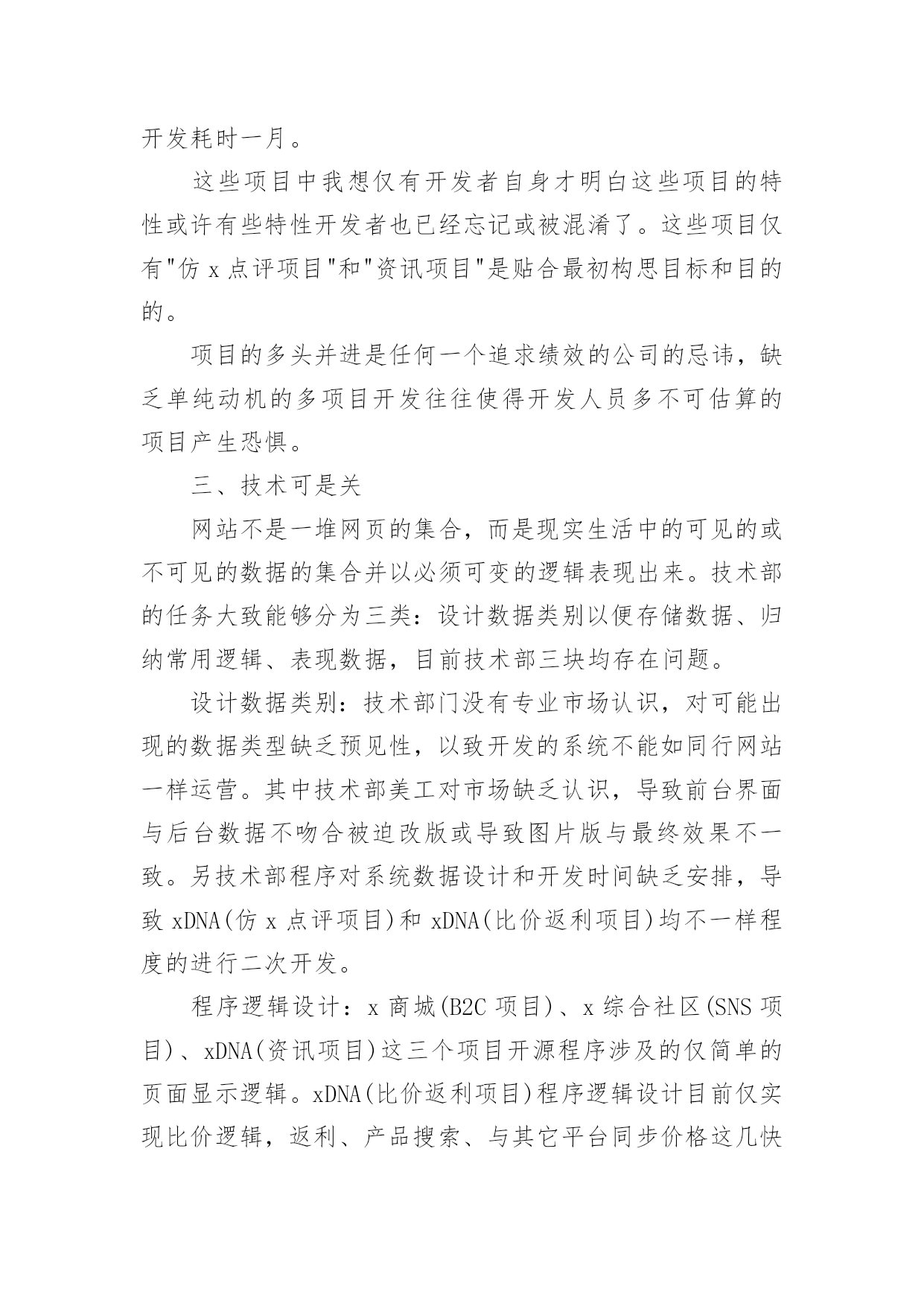 技术部门个人工作总结技术部门个人工作总结(15篇)总结是在某一特定时间段对学习和工作生活或其完成情况,包括取得的成绩、存在的问题及得到的经验和教训加以回顾和分析的书面材料,它有助于我们寻找工作和事物发展的规律,从而掌握并运用这些规律,让我们一起来学习写总结吧。那么如何把总结写出新花样呢?下面是小编整理的技术部门个人工作总结,欢迎大家借鉴与参考,希望对大家有所帮助。技术部门个人工作总结1温故而知新,前行回望更知曲直,20xx平静悄无声息的过去,可是作为一个锐意进取的人来说过去的不是结束,而是新起点爆发力的积累。在此辞旧迎新之际展翅欲飞时,将技术部门在20xx年的工作做一个回顾,旨在去疑窦、组纲目、立主脑,为20xx年能具有绩效的工作,打下坚实的基础。20xx年技术部门各工作人员善处于单兵据点各自为战的磨合期,而主要工作任务也是学习各优秀站点成功的技术应用和运营方式。在那里我对技术部目前遇到的困难及解决方式作个总结:一、专业技术队伍薄弱由于新公司成立不久,存在人才奇缺的严重不足。作为新兴的信息科技公司目前公司技术部共三人,美工一人、程序两人。看似稳定的三角组合先且不论稳定与否,其合理性就有待商酌。专业网建公司建网站的流程一般为:策划分析需求-美工按需制版-切片按版制页-程序按需求制作功能模块、按页组合程序为网站,目前技术部策划由总经理和美工、程序兼任,切片由美工兼任,美工一人而任三职多有不堪。程序无需求文档,且版面多变,以致事必下问。而美工、总经理均非职专策划且一心多用,答非所问更是常事。是以沟通不顺进取受挫、事不顺思不畅终致全无绩效可言。日前已与总经理协商,拟组建项目控制中心全盘控制项目始末如工厂跟单部,此处不便详言。公司技术人员缺乏亦非一两日,公司也曾多次招聘,几次面试亦无成效。一方面公司新立,待遇不丰,而使任劳者寡。另一方面电子商务正显锋芒,能精心实地的技术人才确每况愈下。是以公司招聘当立重点及持久方针。二、项目多头并进20xx年共开展项目如下:x商城(B2C项目),改版三次最终选用全仿名品秀网站,耗时三个月有余(前期自主开发耗时两月余)。x综合社区(SNS项目),改版八次,其中穿插几个开发(投票、日志分类、系统升级)耗时三个月有余。xDNA(资讯项目),改版三五次,其中穿插几个开发(抢购、)耗时四月余。xDNA(比价返利项目),全新开发,耗时两月余。技术部年xDNA(仿x点评项目),全新开发改版两次耗时两月,二次开发耗时一月。这些项目中我想仅有开发者自身才明白这些项目的特性或许有些特性开发者也已经忘记或被混淆了。这些项目仅有"仿x点评项目"和"资讯项目"是贴合最初构思目标和目的的。项目的多头并进是任何一个追求绩效的公司的忌讳,缺乏单纯动机的多项目开发往往使得开发人员多不可估算的项目产生恐惧。三、技术可是关网站不是一堆网页的集合,而是现实生活中的可见的或不可见的数据的集合并以必须可变的逻辑表现出来。技术部的任务大致能够分为三类:设计数据类别以便存储数据、归纳常用逻辑、表现数据,目前技术部三块均存在问题。设计数据类别:技术部门没有专业市场认识,对可能出现的数据类型缺乏预见性,以致开发的系统不能如同行网站一样运营。其中技术部美工对市场缺乏认识,导致前台界面与后台数据不吻合被迫改版或导致图片版与最终效果不一致。另技术部程序对系统数据设计和开发时间缺乏安排,导致xDNA(仿x点评项目)和xDNA(比价返利项目)均不一样程度的进行二次开发。程序逻辑设计:x商城(B2C项目)、x综合社区(SNS项目)、xDNA(资讯项目)这三个项目开源程序涉及的仅简单的页面显示逻辑。xDNA(比价返利项目)程序逻辑设计目前仅实现比价逻辑,返利、产品搜索、与其它平台同步价格这几快程序逻辑均因技术部程序见识不够、想法不够而不能实现。xDNA(仿x点评项目)这个程序比x还复杂,目前除了能仿的能够实现外,其余部分还停留在理论可实现阶段。而将xDNA(仿x点评项目)及xDNA(资讯项目)共同整合成产品库的形式,则停留在想法阶段。懒散及目标的缺乏导致表现数据阶段效率低下。设计数据类别、程序逻辑设计算是挑战式的技术活的话,那表现数据就纯粹是手工针线活,要充分的细心和耐心。技术部缺乏目标或者是目标太多,总之一到表现数据阶段项目就卡住了。x商城(B2C项目)、x综合社区(SNS项目)、xDNA(资讯项目)三个项目均为表现数据的细手工活,可是只要动手不要动脑的活偏偏是做的最慢的。技术部门个人工作总结2我来__工作已经一年多了。这一年我一直在项目部工作,负责电气施工的现场管理和技术指导。在自己的努力和领导的支持下,我从一名普通的电气主管晋升为电气仪表车间的兼职技师。下面,我来总结一下我作为车间技术员的工作。一、我对电气技师工作的理解和态度在电气仪表车间被任命为技术员后,