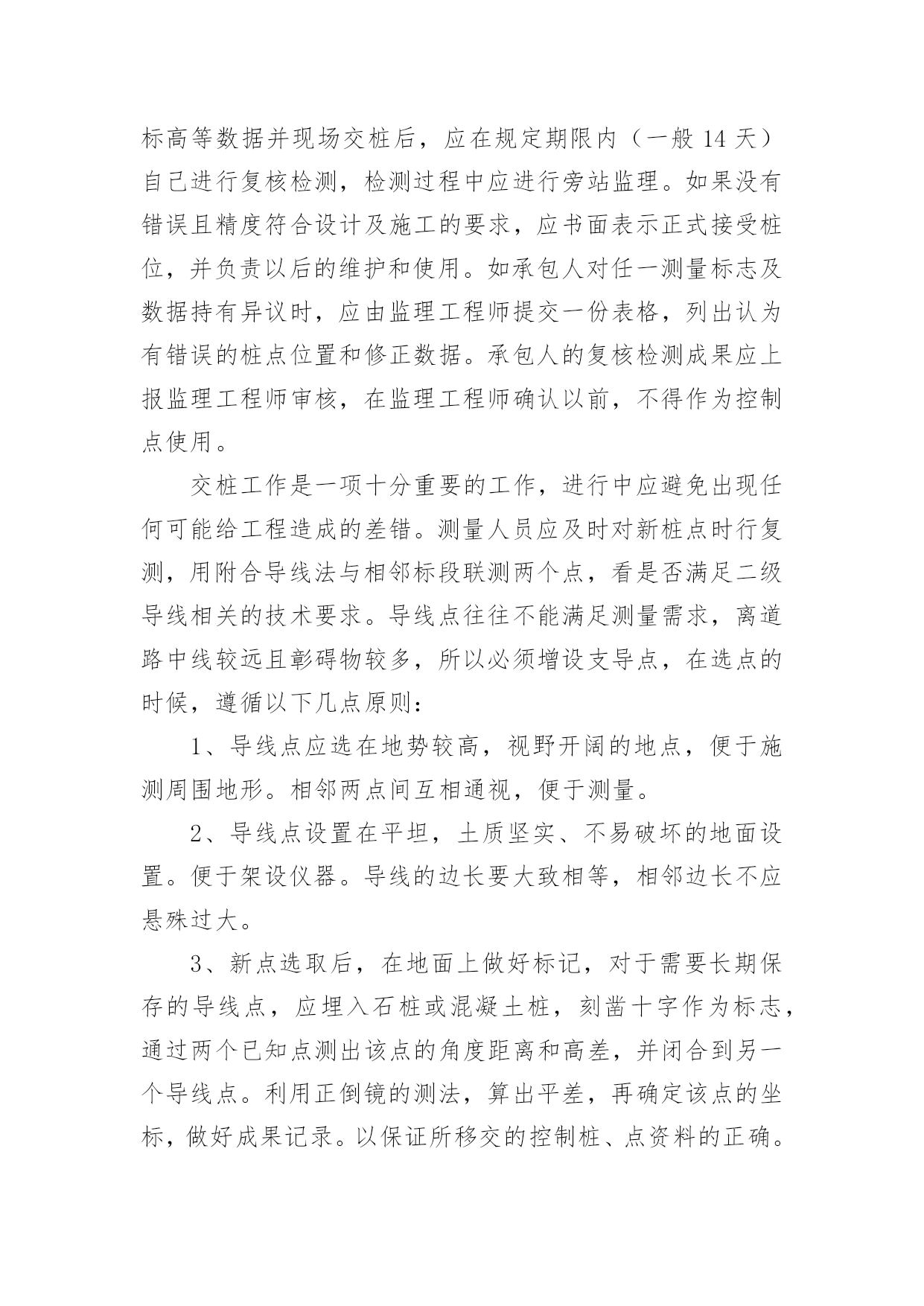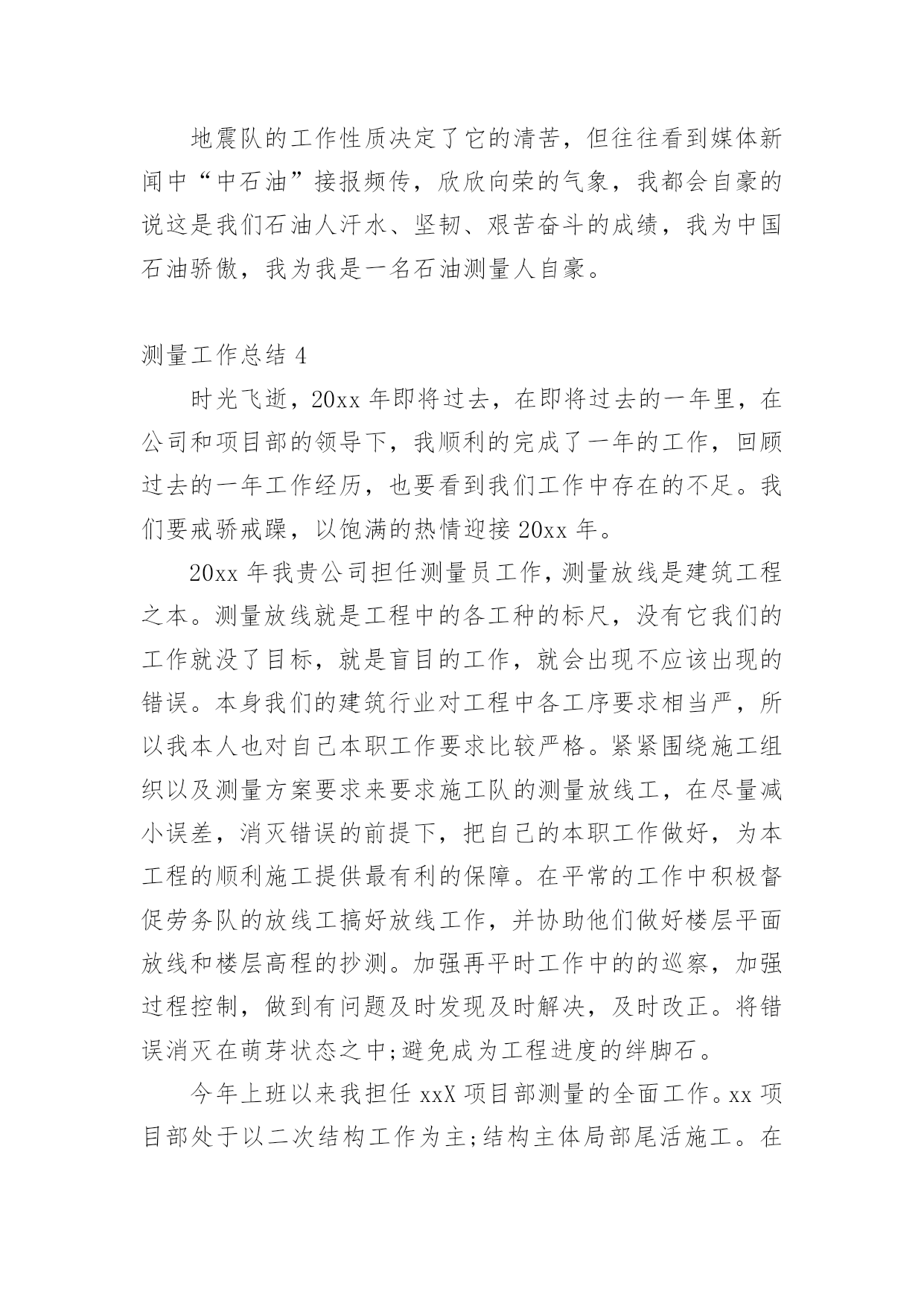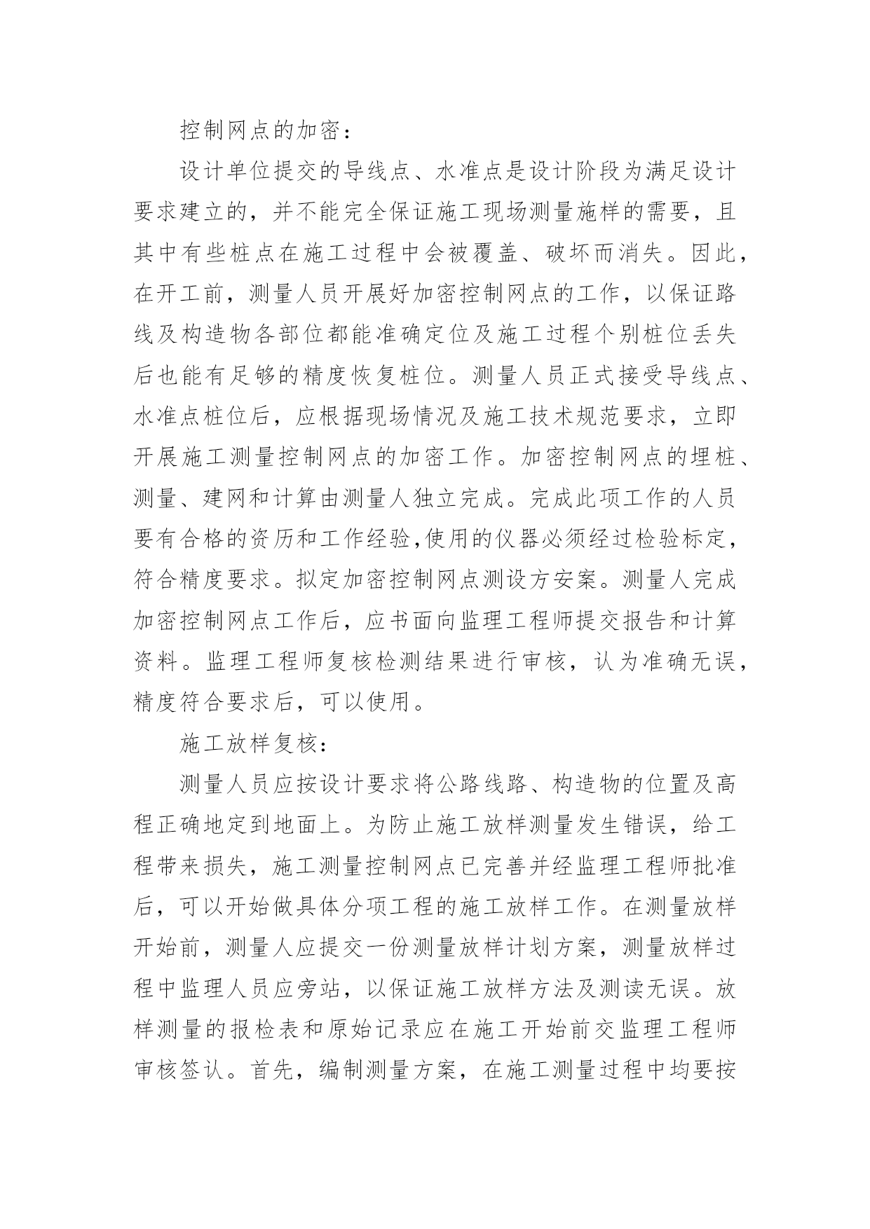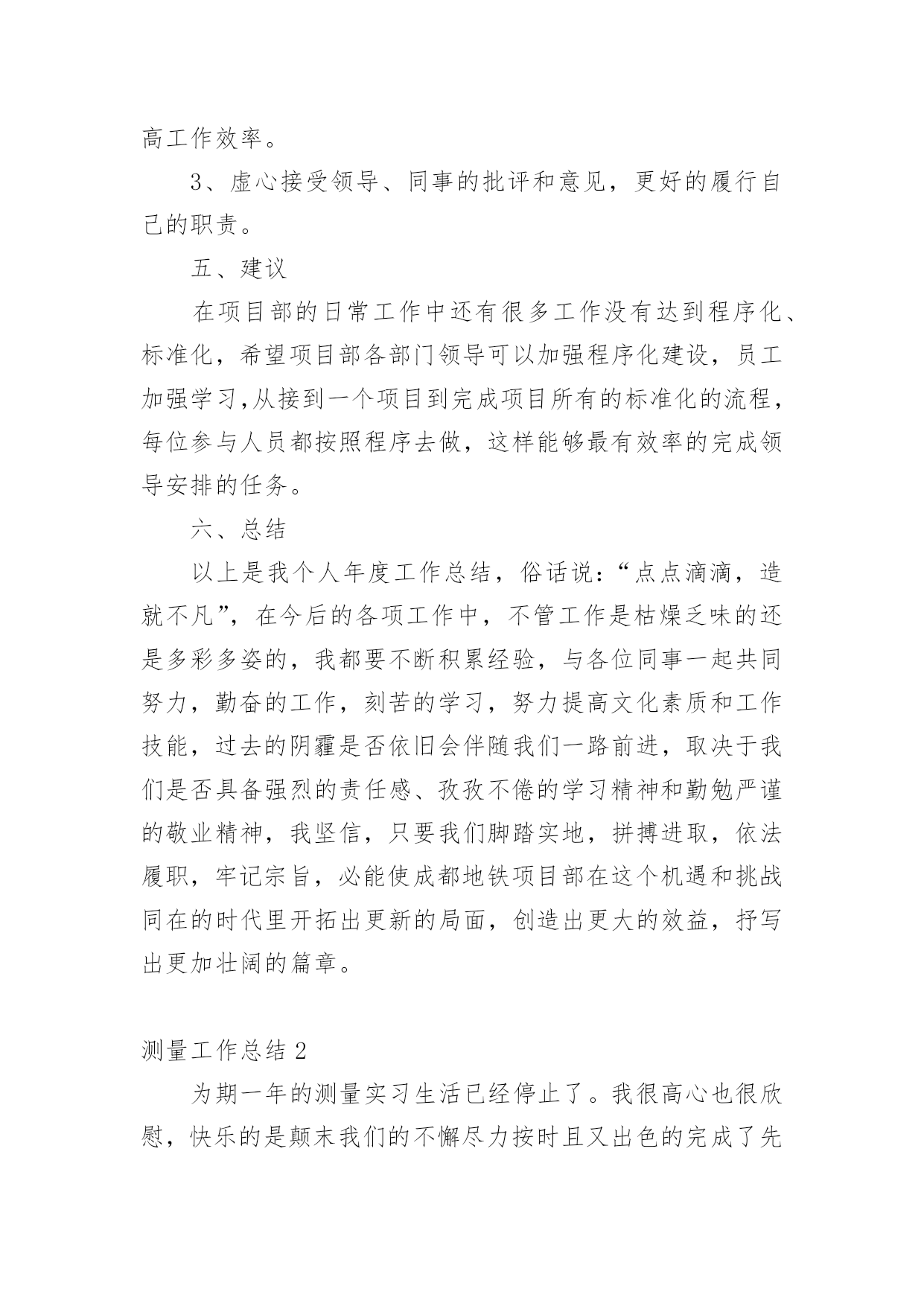 测量工作总结总结是指社会团体、企业单位和个人对某一阶段的学习、工作或其完成情况加以回顾和分析,得出教训和一些规律性认识的一种书面材料,写总结有利于我们学习和工作能力的提高,因此我们要做好归纳,写好总结。那么你知道总结如何写吗?以下是小编为大家整理的测量工作总结,欢迎阅读与收藏。测量工作总结1紧张的20___年过去了,作为xx桥建设有限公司一名技术人员,我在公司领导、项目部领导和同志们的关心和支持下,通过努力工作,为企业做出了应有的贡献。在这一年中,我在工作和生活中高标准要求自己,做了很多工作,现将20___年工作总结如下:一、测量工作导线点、水准点的交接:施工放样是在施工承包合同生效后按设计图纸进行的,施工放样前,测量人员应全面的熟悉设计文件及监理细则,接受监理工程师或设计单位交给的导线桩、水准点和设计院逐桩坐标资料及其他桩志。在监理工程师的主持下,设计单位按照图纸资料在现场直接向承包人交桩。若发现连续两个以上控制桩点丢失、损坏时,应要求设计单位补定。承包人在接到设计单位发出的桩位图及坐标、标高等数据并现场交桩后,应在规定期限内(一般14天)自己进行复核检测,检测过程中应进行旁站监理。如果没有错误且精度符合设计及施工的要求,应书面表示正式接受桩位,并负责以后的维护和使用。如承包人对任一测量标志及数据持有异议时,应由监理工程师提交一份表格,列出认为有错误的桩点位置和修正数据。承包人的复核检测成果应上报监理工程师审核,在监理工程师确认以前,不得作为控制点使用。交桩工作是一项十分重要的工作,进行中应避免出现任何可能给工程造成的差错。测量人员应及时对新桩点时行复测,用附合导线法与相邻标段联测两个点,看是否满足二级导线相关的技术要求。导线点往往不能满足测量需求,离道路中线较远且彰碍物较多,所以必须增设支导点,在选点的时候,遵循以下几点原则:1、导线点应选在地势较高,视野开阔的地点,便于施测周围地形。相邻两点间互相通视,便于测量。2、导线点设置在平坦,土质坚实、不易破坏的地面设置。便于架设仪器。导线的边长要大致相等,相邻边长不应悬殊过大。3、新点选取后,在地面上做好标记,对于需要长期保存的导线点,应埋入石桩或混凝土桩,刻凿十字作为标志,通过两个已知点测出该点的角度距离和高差,并闭合到另一个导线点。利用正倒镜的测法,算出平差,再确定该点的坐标,做好成果记录。以保证所移交的控制桩、点资料的正确。控制网点的加密:设计单位提交的导线点、水准点是设计阶段为满足设计要求建立的,并不能完全保证施工现场测量施样的需要,且其中有些桩点在施工过程中会被覆盖、破坏而消失。因此,在开工前,测量人员开展好加密控制网点的工作,以保证路线及构造物各部位都能准确定位及施工过程个别桩位丢失后也能有足够的精度恢复桩位。测量人员正式接受导线点、水准点桩位后,应根据现场情况及施工技术规范要求,立即开展施工测量控制网点的加密工作。加密控制网点的埋桩、测量、建网和计算由测量人独立完成。完成此项工作的人员要有合格的资历和工作经验,使用的仪器必须经过检验标定,符合精度要求。拟定加密控制网点测设方安案。测量人完成加密控制网点工作后,应书面向监理工程师提交报告和计算资料。监理工程师复核检测结果进行审核,认为准确无误,精度符合要求后,可以使用。施工放样复核:测量人员应按设计要求将公路线路、构造物的位置及高程正确地定到地面上。为防止施工放样测量发生错误,给工程带来损失,施工测量控制网点已完善并经监理工程师批准后,可以开始做具体分项工程的施工放样工作。在测量放样开始前,测量人应提交一份测量放样计划方案,测量放样过程中监理人员应旁站,以保证施工放样方法及测读无误。放样测量的报检表和原始记录应在施工开始前交监理工程师审核签认。首先,编制测量方案,在施工测量过程中均要按批准的方案实施,且先进行自检、互检,合格后再请监理人员复核。二、技术管理1、努力学习专业知识,提高专业技术水平去年x月底,随着一百亩场内道路的顺利完工,我被从一百亩调到麒麟科技创新园钟学路道路工程项目管理部工作。工作伊始,我发现学校里学到的道路、桥梁等工程专业知识,同实际工作有很大的不同和差距,为了尽快转变角色,适应工作的要求,我自觉加强学习,重点学习工程方面的专业知识,努力提高自己的专业技术水平,虚心求教,不断理清工作思路,总结工作经验。一方面在实践中学习,不断积累经验。注重以工作任务为牵引,依托工作岗位学习提高,通过观察、摸索、查阅资料和实践锻炼,较快的完成任务。另一方面,问书本,问同事,不断丰富知识掌握技巧。利用项目部组织的各项学习活动在各级领导和同事的帮助指导下,不断进步,逐渐摸清工作中的基本情况,找到了切入点,把握学习的重点和难点。在这1年内,我通过自己的努力及同事的帮助,能比较熟练灵活的地进行工程技术等日常事务处理工作。