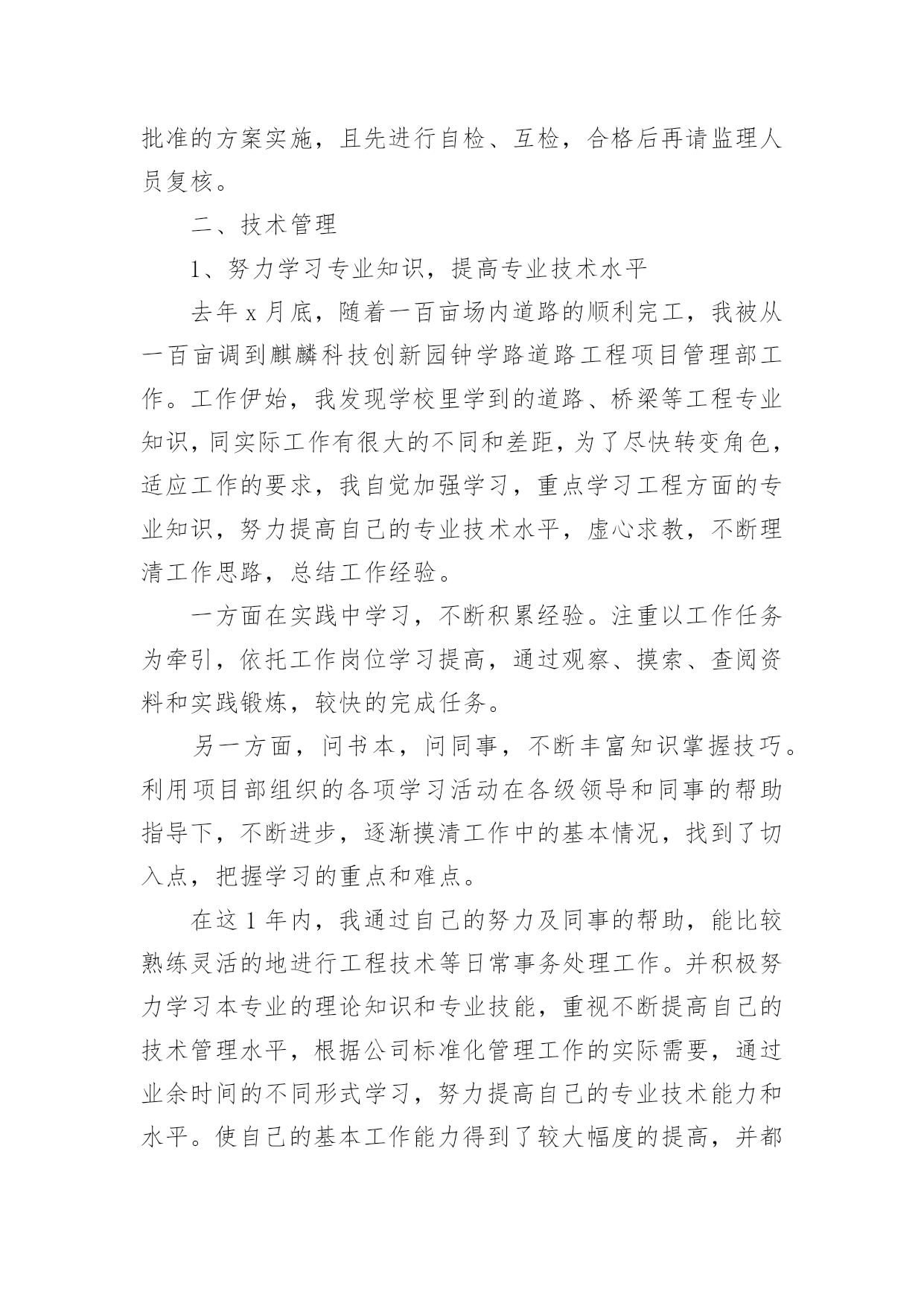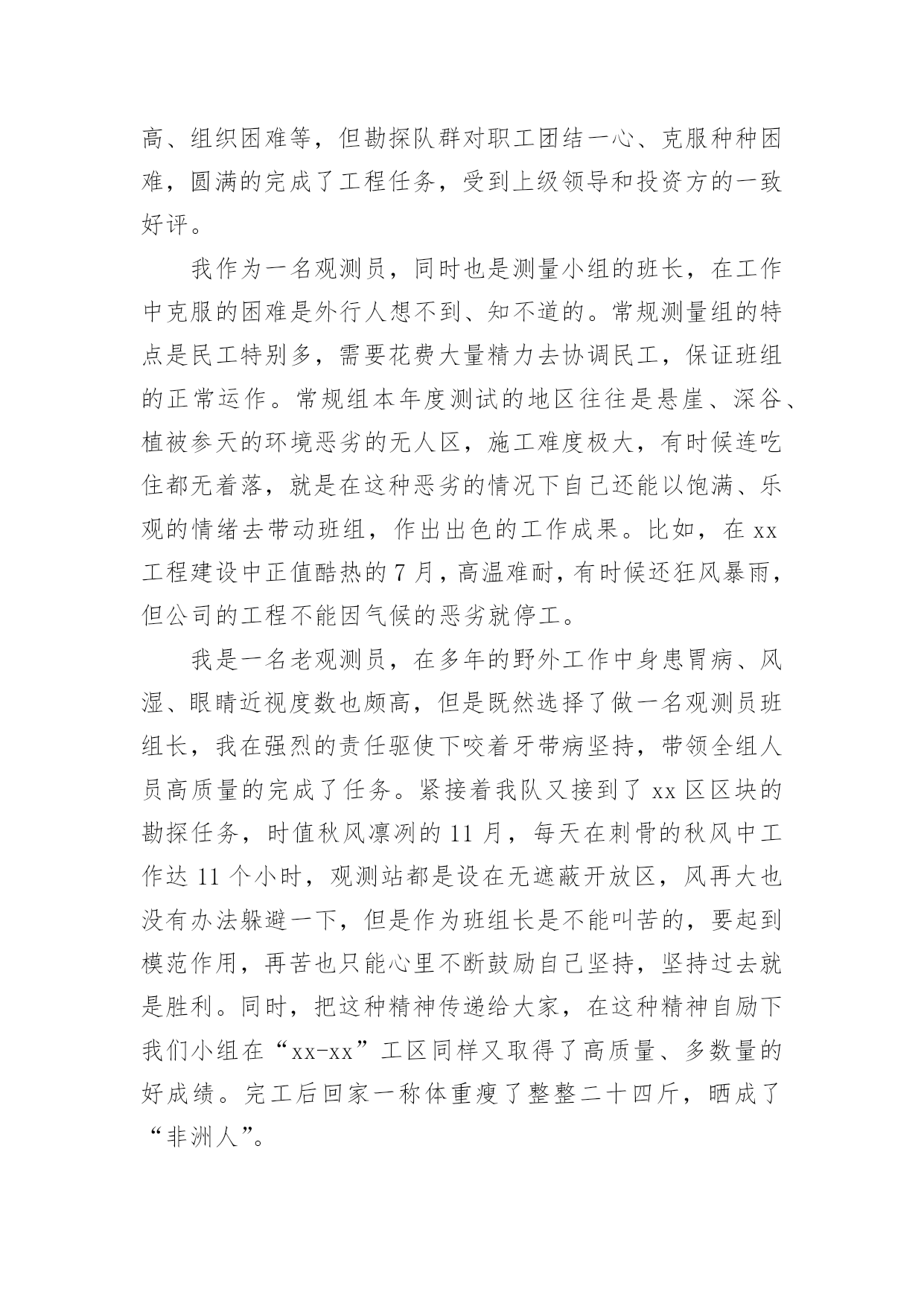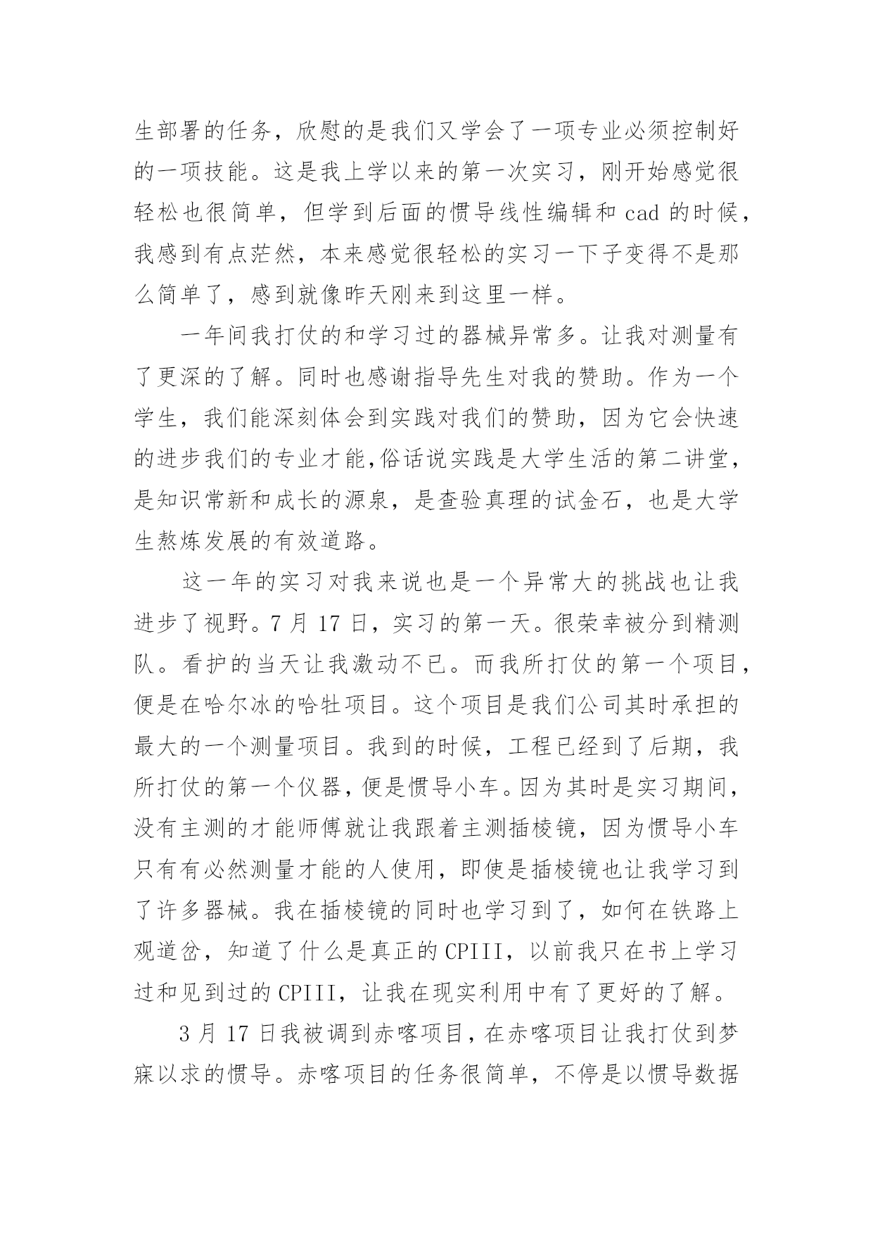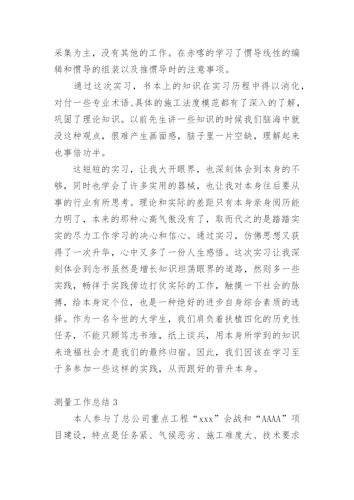 测量工作总结总结是指社会团体、企业单位和个人对某一阶段的学习、工作或其完成情况加以回顾和分析,得出教训和一些规律性认识的一种书面材料,写总结有利于我们学习和工作能力的提高,因此我们要做好归纳,写好总结。那么你知道总结如何写吗?以下是小编为大家整理的测量工作总结,欢迎阅读与收藏。测量工作总结1紧张的20___年过去了,作为xx桥建设有限公司一名技术人员,我在公司领导、项目部领导和同志们的关心和支持下,通过努力工作,为企业做出了应有的贡献。在这一年中,我在工作和生活中高标准要求自己,做了很多工作,现将20___年工作总结如下:一、测量工作导线点、水准点的交接:施工放样是在施工承包合同生效后按设计图纸进行的,施工放样前,测量人员应全面的熟悉设计文件及监理细则,接受监理工程师或设计单位交给的导线桩、水准点和设计院逐桩坐标资料及其他桩志。在监理工程师的主持下,设计单位按照图纸资料在现场直接向承包人交桩。若发现连续两个以上控制桩点丢失、损坏时,应要求设计单位补定。承包人在接到设计单位发出的桩位图及坐标、标高等数据并现场交桩后,应在规定期限内(一般14天)自己进行复核检测,检测过程中应进行旁站监理。如果没有错误且精度符合设计及施工的要求,应书面表示正式接受桩位,并负责以后的维护和使用。如承包人对任一测量标志及数据持有异议时,应由监理工程师提交一份表格,列出认为有错误的桩点位置和修正数据。承包人的复核检测成果应上报监理工程师审核,在监理工程师确认以前,不得作为控制点使用。交桩工作是一项十分重要的工作,进行中应避免出现任何可能给工程造成的差错。测量人员应及时对新桩点时行复测,用附合导线法与相邻标段联测两个点,看是否满足二级导线相关的技术要求。导线点往往不能满足测量需求,离道路中线较远且彰碍物较多,所以必须增设支导点,在选点的时候,遵循以下几点原则:1、导线点应选在地势较高,视野开阔的地点,便于施测周围地形。相邻两点间互相通视,便于测量。2、导线点设置在平坦,土质坚实、不易破坏的地面设置。便于架设仪器。导线的边长要大致相等,相邻边长不应悬殊过大。3、新点选取后,在地面上做好标记,对于需要长期保存的导线点,应埋入石桩或混凝土桩,刻凿十字作为标志,通过两个已知点测出该点的角度距离和高差,并闭合到另一个导线点。利用正倒镜的测法,算出平差,再确定该点的坐标,做好成果记录。以保证所移交的控制桩、点资料的正确。控制网点的加密:设计单位提交的导线点、水准点是设计阶段为满足设计要求建立的,并不能完全保证施工现场测量施样的需要,且其中有些桩点在施工过程中会被覆盖、破坏而消失。因此,在开工前,测量人员开展好加密控制网点的工作,以保证路线及构造物各部位都能准确定位及施工过程个别桩位丢失后也能有足够的精度恢复桩位。测量人员正式接受导线点、水准点桩位后,应根据现场情况及施工技术规范要求,立即开展施工测量控制网点的加密工作。加密控制网点的埋桩、测量、建网和计算由测量人独立完成。完成此项工作的人员要有合格的资历和工作经验,使用的仪器必须经过检验标定,符合精度要求。拟定加密控制网点测设方安案。测量人完成加密控制网点工作后,应书面向监理工程师提交报告和计算资料。监理工程师复核检测结果进行审核,认为准确无误,精度符合要求后,可以使用。施工放样复核:测量人员应按设计要求将公路线路、构造物的位置及高程正确地定到地面上。为防止施工放样测量发生错误,给工程带来损失,施工测量控制网点已完善并经监理工程师批准后,可以开始做具体分项工程的施工放样工作。在测量放样开始前,测量人应提交一份测量放样计划方案,测量放样过程中监理人员应旁站,以保证施工放样方法及测读无误。放样测量的报检表和原始记录应在施工开始前交监理工程师审核签认。首先,编制测量方案,在施工测量过程中均要按批准的方案实施,且先进行自检、互检,合格后再请监理人员复核。二、技术管理1、努力学习专业知识,提高专业技术水平去年x月底,随着一百亩场内道路的顺利完工,我被从一百亩调到麒麟科技创新园钟学路道路工程项目管理部工作。工作伊始,我发现学校里学到的道路、桥梁等工程专业知识,同实际工作有很大的不同和差距,为了尽快转变角色,适应工作的要求,我自觉加强学习,重点学习工程方面的专业知识,努力提高自己的专业技术水平,虚心求教,不断理清工作思路,总结工作经验。一方面在实践中学习,不断积累经验。注重以工作任务为牵引,依托工作岗位学习提高,通过观察、摸索、查阅资料和实践锻炼,较快的完成任务。另一方面,问书本,问同事,不断丰富知识掌握技巧。利用项目部组织的各项学习活动在各级领导和同事的帮助指导下,不断进步,逐渐摸清工作中的基本情况,找到了切入点,把握学习的重点和难点。在这1年内,我通过自己的努力及同事的帮助,能比较熟练灵活的地进行工程技术等日常事务处理工作。