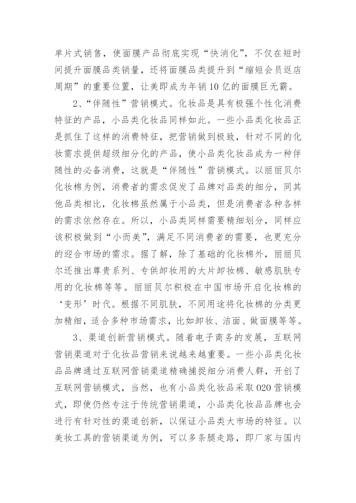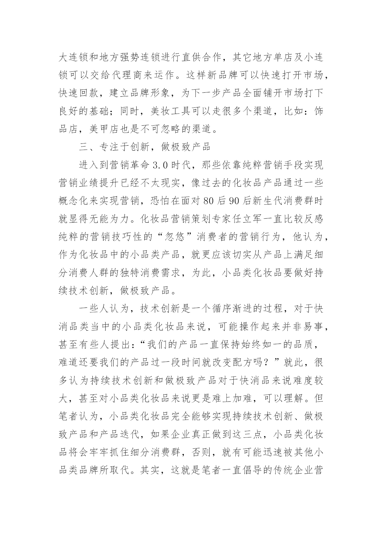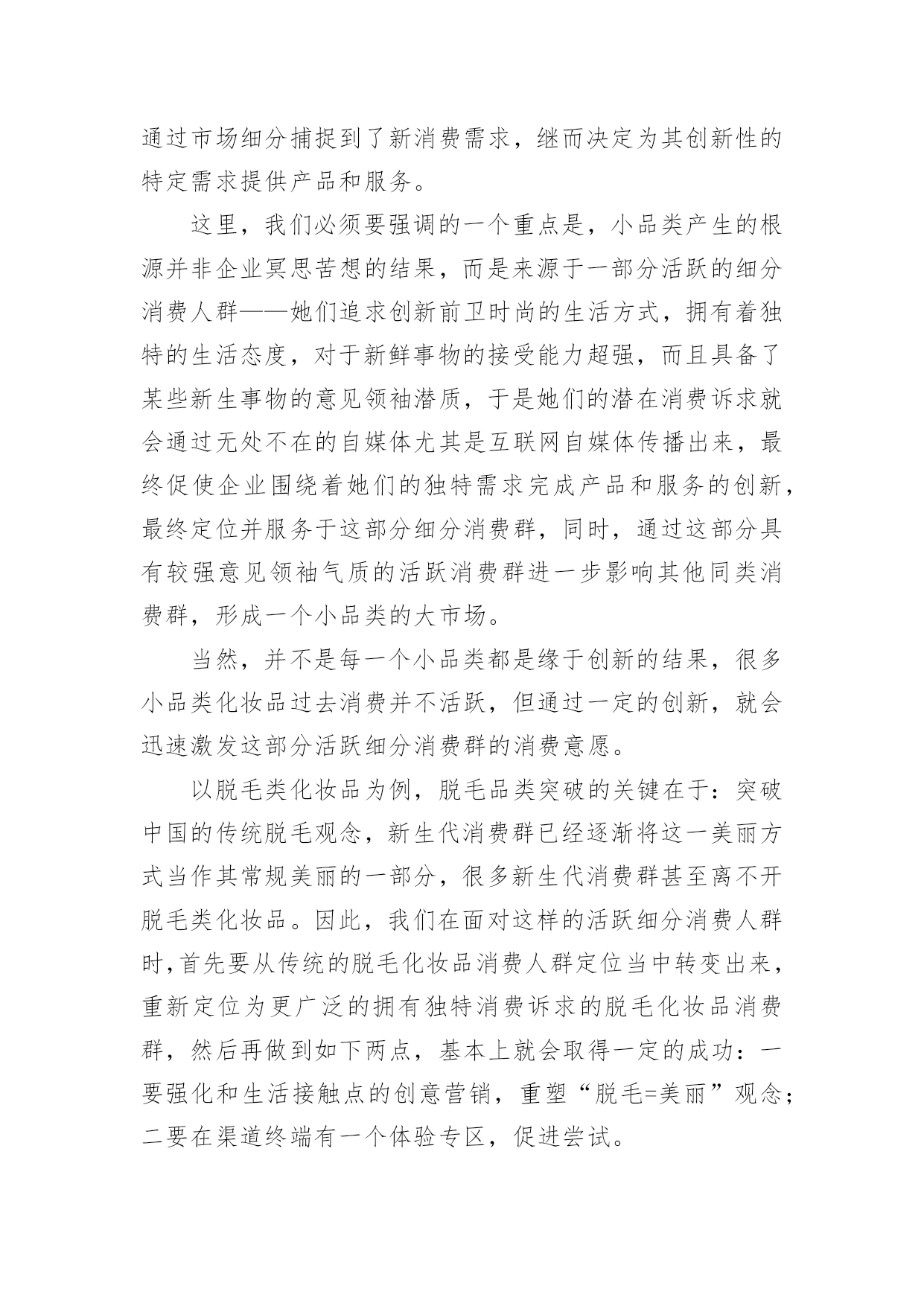 化妆品营销策划书一段时间的工作在不知不觉间已经告一段落了,迎接我们的将是新的工作目标,立即行动起来写一份策划书吧。你所见过的策划书应该是什么样的?以下是小编为大家收集的化妆品营销策划书,仅供参考,大家一起来看看吧。化妆品营销策划书1随着化妆品市场传统格局的定型,各个化妆品企业开始寻求新的市场突破点。在市场进入营销革命3.0时代,面对80后90后新生代消费群的崛起,小品类化妆品成为各大化妆品企业拓展市场的利器,因此,有人把xx年称为化妆品的“品类元年”,通过小品类引流、小品类定位、专业化服务,把中国化妆品竞