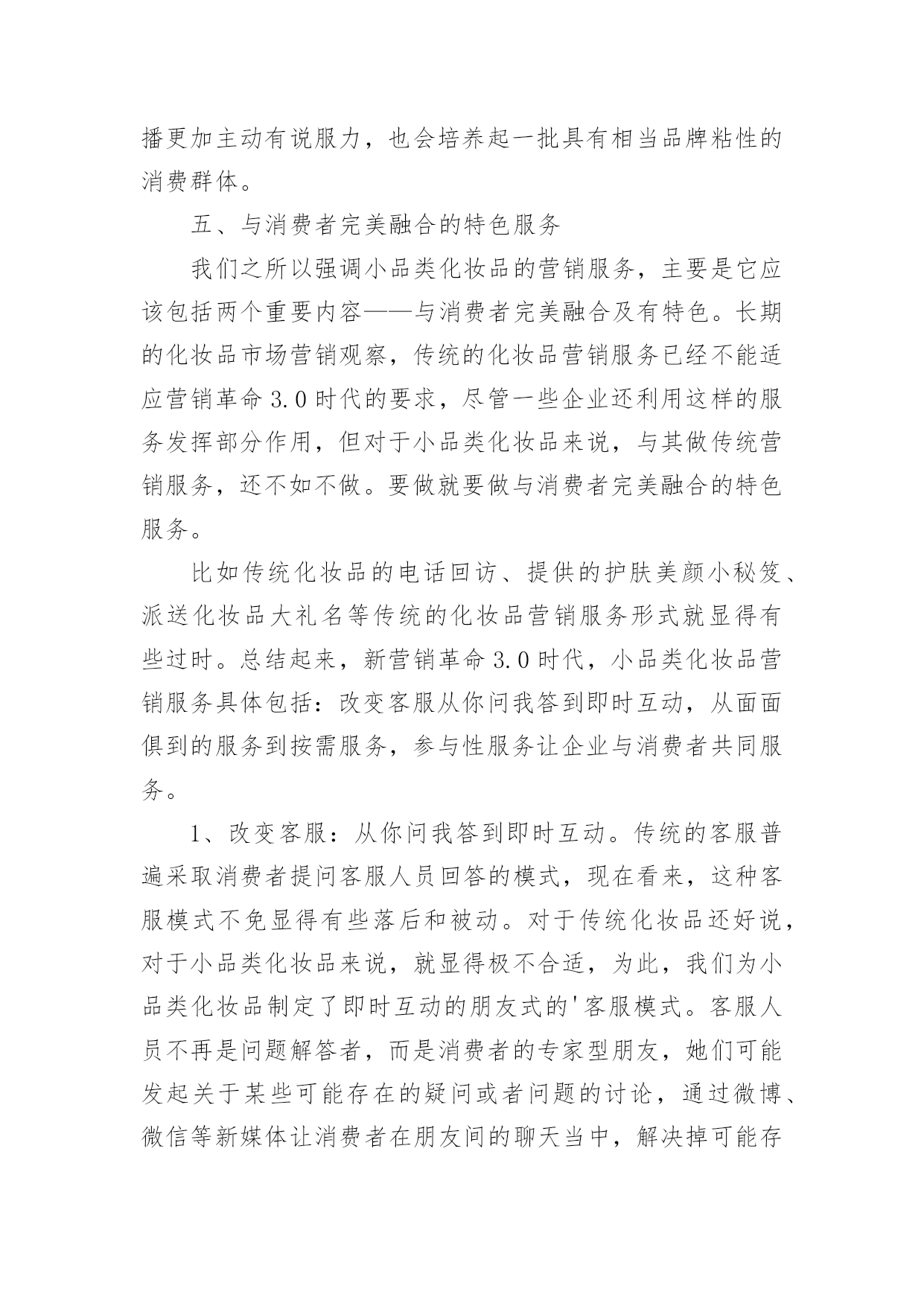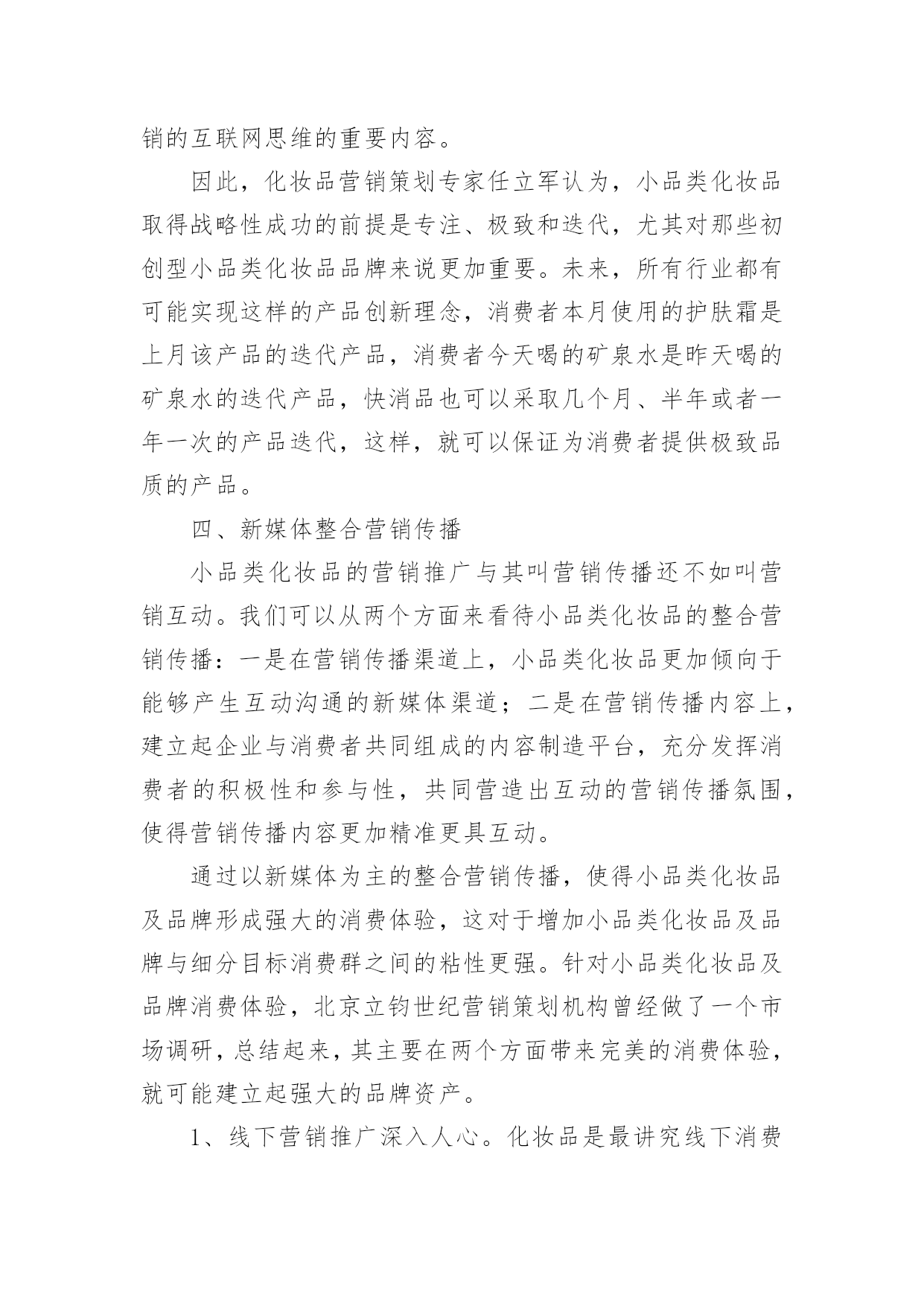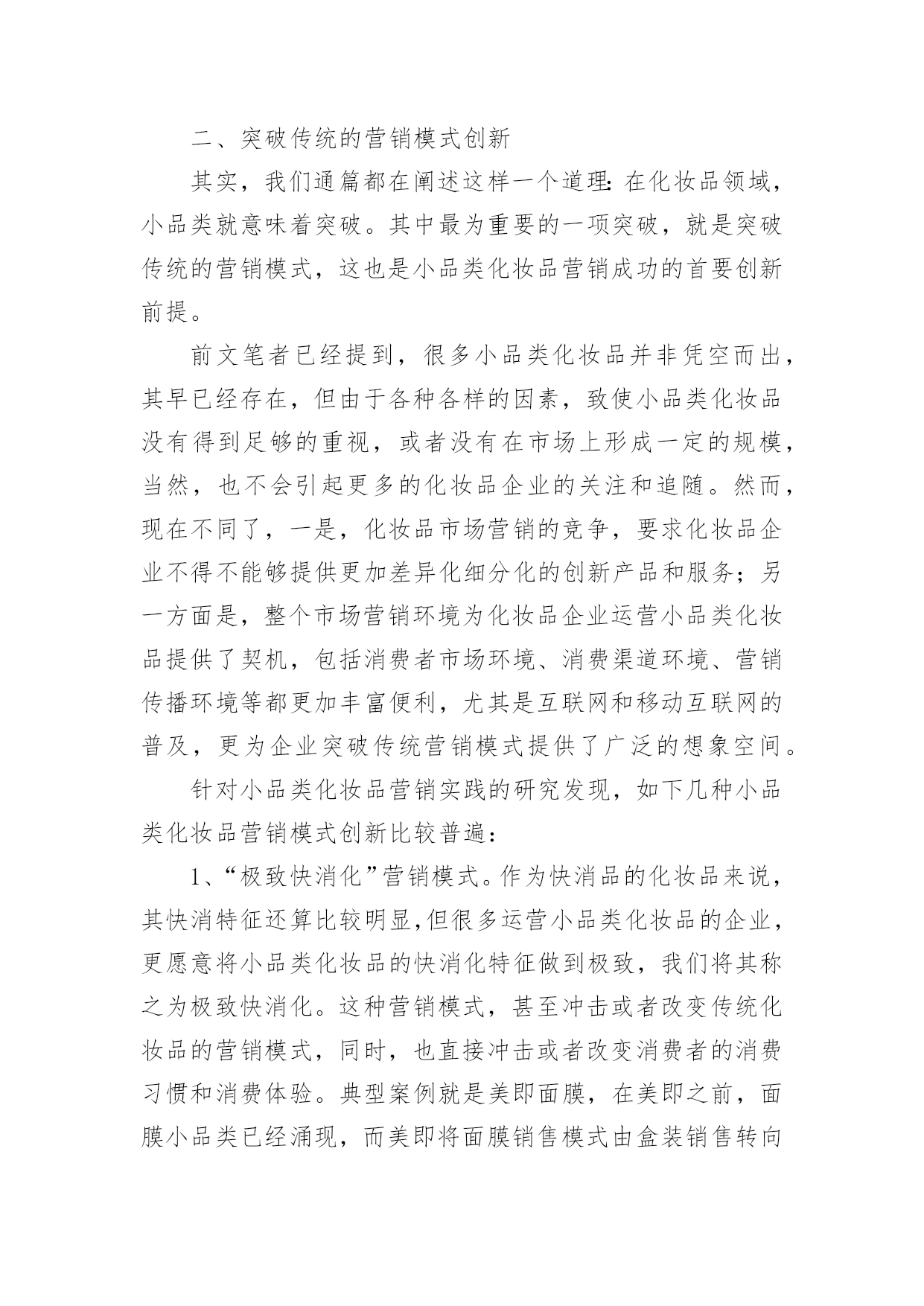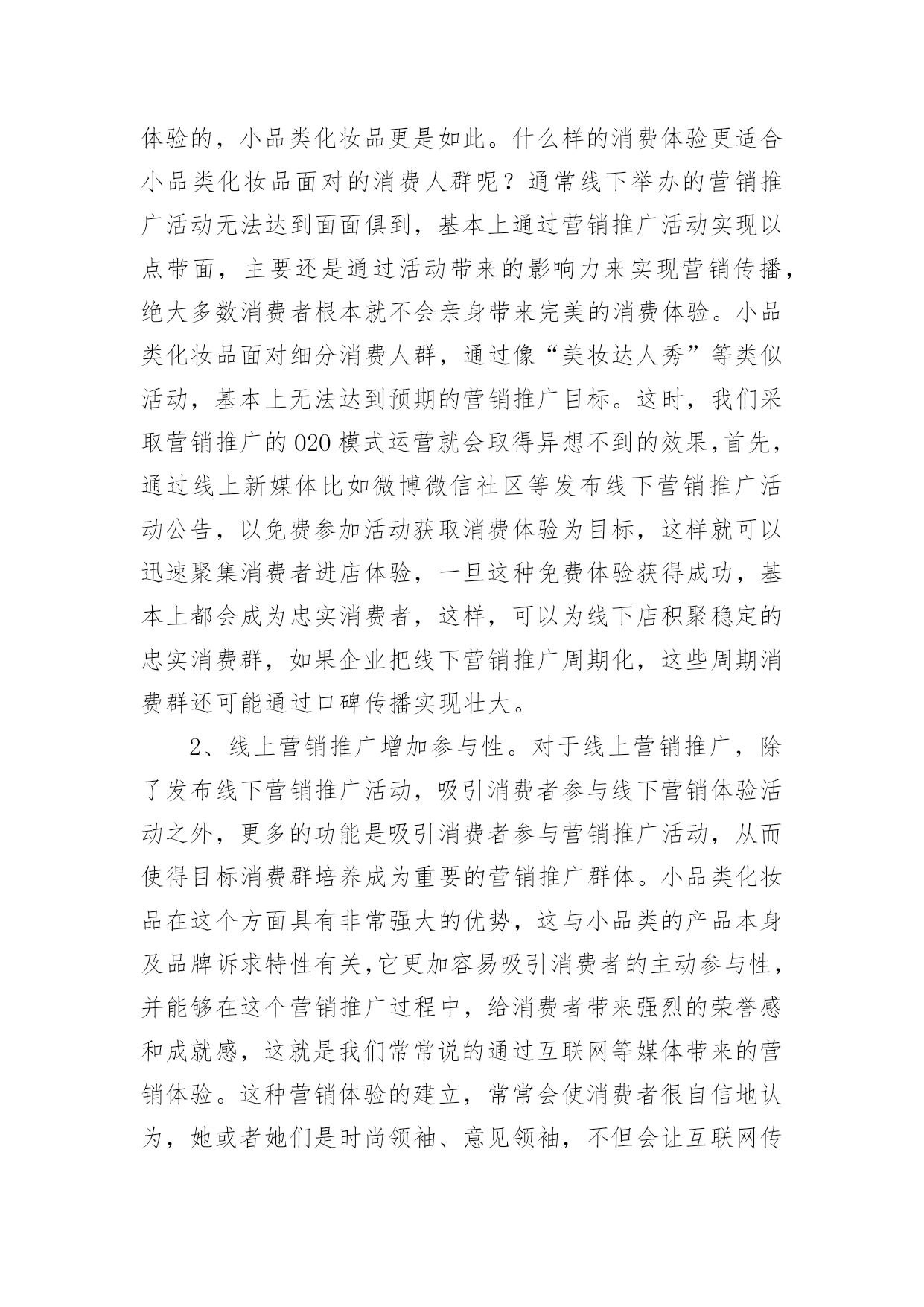 化妆品营销策划书一段时间的工作在不知不觉间已经告一段落了,迎接我们的将是新的工作目标,立即行动起来写一份策划书吧。你所见过的策划书应该是什么样的?以下是小编为大家收集的化妆品营销策划书,仅供参考,大家一起来看看吧。化妆品营销策划书1随着化妆品市场传统格局的定型,各个化妆品企业开始寻求新的市场突破点。在市场进入营销革命3.0时代,面对80后90后新生代消费群的崛起,小品类化妆品成为各大化妆品企业拓展市场的利器,因此,有人把xx年称为化妆品的“品类元年”,通过小品类引流、小品类定位、专业化服务,把中国化妆品竞