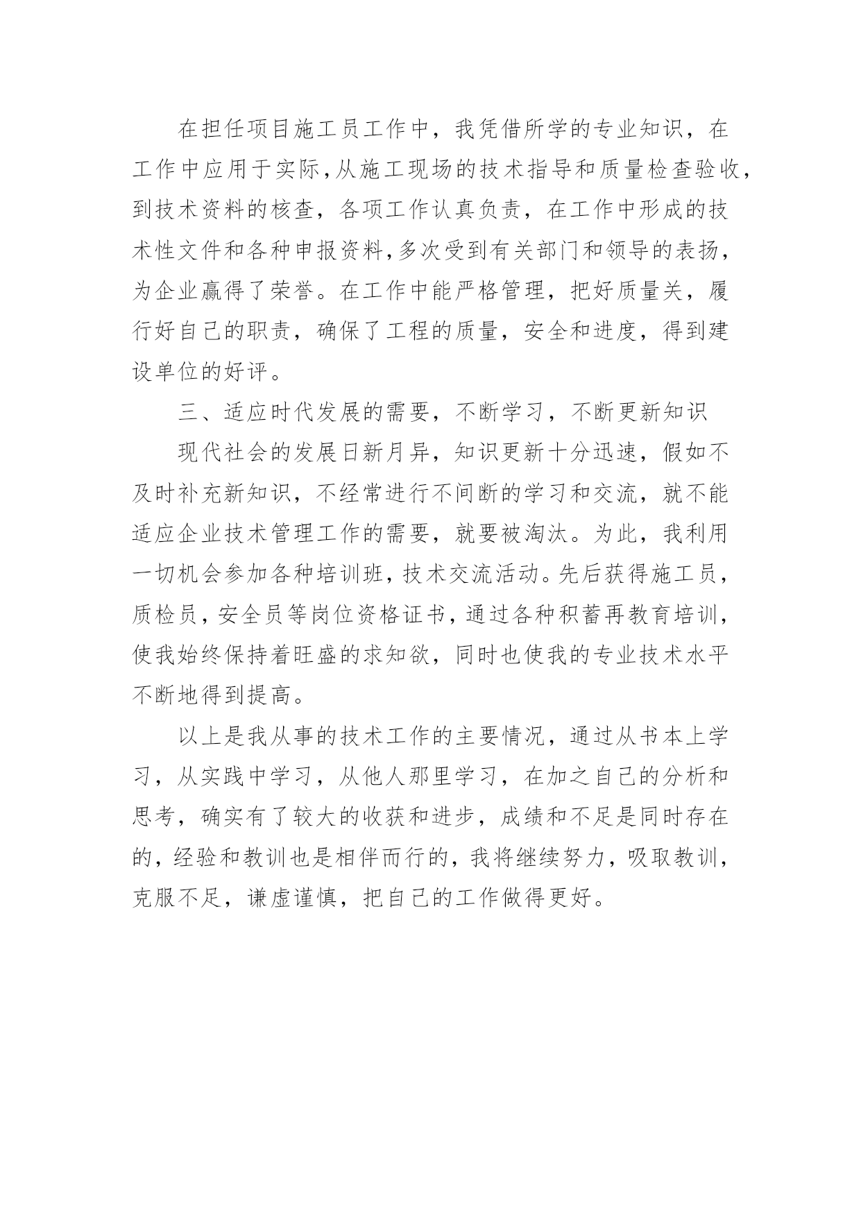 工程师职称评定专业技术工作总结工程师职称评定专业技术工作总结总结是事后对某一时期、某一项目或某些工作进行回顾和分析,从而做出带有规律性的结论,它能够使头脑更加清醒,目标更加明确,是时候写一份总结了。总结怎么写才能发挥它的作用呢?下面是小编收集整理的工程师职称评定专业技术工作总结,欢迎阅读,希望大家能够喜欢。工程师职称评定专业技术工作总结1我,1xx9年12月认定为助理工程师,先后工作于河北省第二工程建设有限公司、唐山现代建筑工程有限公司,XX年9月在唐山现代建筑安装工程有限公司技术质量科任科长。在此期间,我努力钻研专业技术知识,在技术治理过程中努力推行“新工艺、新结构、新材料、新设备”,对科技创新和技术进步倾注了满腔热情。任助理工程师专业技术职务以后,先后在丰南市国税局群体住宅小区工程和唐山一中第二教学楼工程中担任技术负责人,这两个工程竣工以后均被评为唐山市优质工程,而且唐山一中第二教学楼工程在评为市优工程的基础上又被评为XX年度河北省优质工程。在施工一线锻炼的几年中,通过理论联系实际,在大学期间所学的专业理论知识迅速转化为了业务能力。作为公司的技术和质量治理部门,在公司经理和公司总工程师的直接领导下,对技术治理一丝不苟,对工程质量从严控制。经过数年的努力,公司已建立了严格的治理体系,并且获得了国际承认的建筑施工企业的三大认证:质量治理体系(iso9001)认证、职业安全健康治理体系(oshms)认证、环境治理体系(iso14001)认证,是河北省第一家获得三个认证证书的建筑施工企业。五年来,在为公司的发展贡献自己的聪明才智的过程中,也使个人的专业技术能力得到了充实和提高。总之,五年来自己做了一些有益的'工作,但也存在着很多有待提高的问题。现对几年来的专业技术工作总结一、积极推广使用“四新”技术,营造建筑精品1xx9年12月,我在唐山一中第二教学楼工程项目部任技术负责人。工程质量是建筑施工企业的生命,而要想获得好的工程质量,就要求技术治理人员要具有创优良工程的先进意识,作为该工程的技术负责人,由我牵头,首先着手建立、健全项目部的有关技术、质量治理制度。按照项目工程施工方法,以我为首,将工程质量目标分解到各个专业技术岗位,在按照技术岗位的要求组织施工。先后建立了技术复核制度、工程质量检查制度、隐蔽验收制度以及质量通病控制措施和半成品保护措施等一系列有益于保证工程质量的治理制度。根据本工程大开间及混凝土浇筑量大的特点,模板支撑选用工具式快拆体系,配合使用覆塑竹胶合大模板,保证竹模板间隙不大于1mm;接缝高低差不大于1mm,表面平整度不大于2mm,顶棚可取消抹灰工序,既可以节省水泥用量,又可以彻底根除顶棚抹灰空裂的质量隐患,取得了经济效益和社会效益的双丰收。内外墙瓷砖表面平整、洁净、色泽协调一致,接缝填嵌密实、平直、宽窄一致,颜色一致;屋面防水层细部均经过精心处理,做法一致、美观;门窗表面洁净,无划痕、碰伤,涂胶表面光滑、平整、厚度均匀,无气孔;楼梯踏步相邻两步宽度和高度差不超过10mm,齿角整洁,防滑条顺直。施工过程中严格按照设计施工图和国家规范、规程和通用图集的要求施工,并按照创精品工程细部做法要求精心完成每一个分项工程,实现了“创高标准优质工程”的质量目标。通过对该工程技术工作的直接参与和控制,使该工程的质量、进度和效益都收到了较好的效果。唐山一中第二教学楼工程荣获XX年度优质工程(金牌奖)及XX年度河北省优质工程奖。二、努力钻研专业技术业务,做好本职工作自从到唐山现代建筑安装工程有限公司工作以来,各项工作干得更是出色。调任技术质量科科长之后,恰逢公司建立iso9001质量治理体系,由于时间紧、任务重,该同志自愿放弃个人休息时间,一心铺于质量治理手册、程序文件以及作业指导书的编写和修改工作中,加班加点,毫无怨言,充分体现了一个青年专业技术人员应有的先锋模范作用。在总结我公司建立质量治理体系的相关经验,我形成了《浅析建筑质量治理体系》一文,并获得河北省建设系统科技技术论文一等奖。在日常工作中,该同志凭借扎实的专业知识和理论基础,工作中如鱼得水,从施工现场的技术指导和质量检查验收到施工技术资料的核查和治理,各项工作样样精通。在工作中形成的技术性文件和各种申报资料做得结构严谨、术语规范、见解独特、论断精僻,送到市里交流的技术性文件多次受到唐山市建设局、唐山市质量监督检测站有关领导的表扬,为企业赢得了荣誉。随着公司治理体制改革的逐步深入,公司领导决定启动oshms职业安全健康治理体系认证和iso14001环境治理体系认证。在上述两个治理体系建立的过程中,该同志又一如既往地投入到体系文件编写、初始状态评价、重大危险和环境因素辨识、治理方案的制定等工作当中,为企业顺利通过注册认证作出了突出贡献。在参与建立企业质量治理体系、职业安全健康