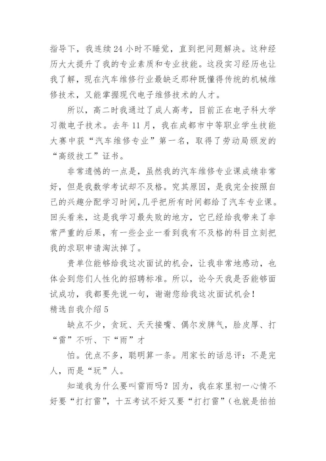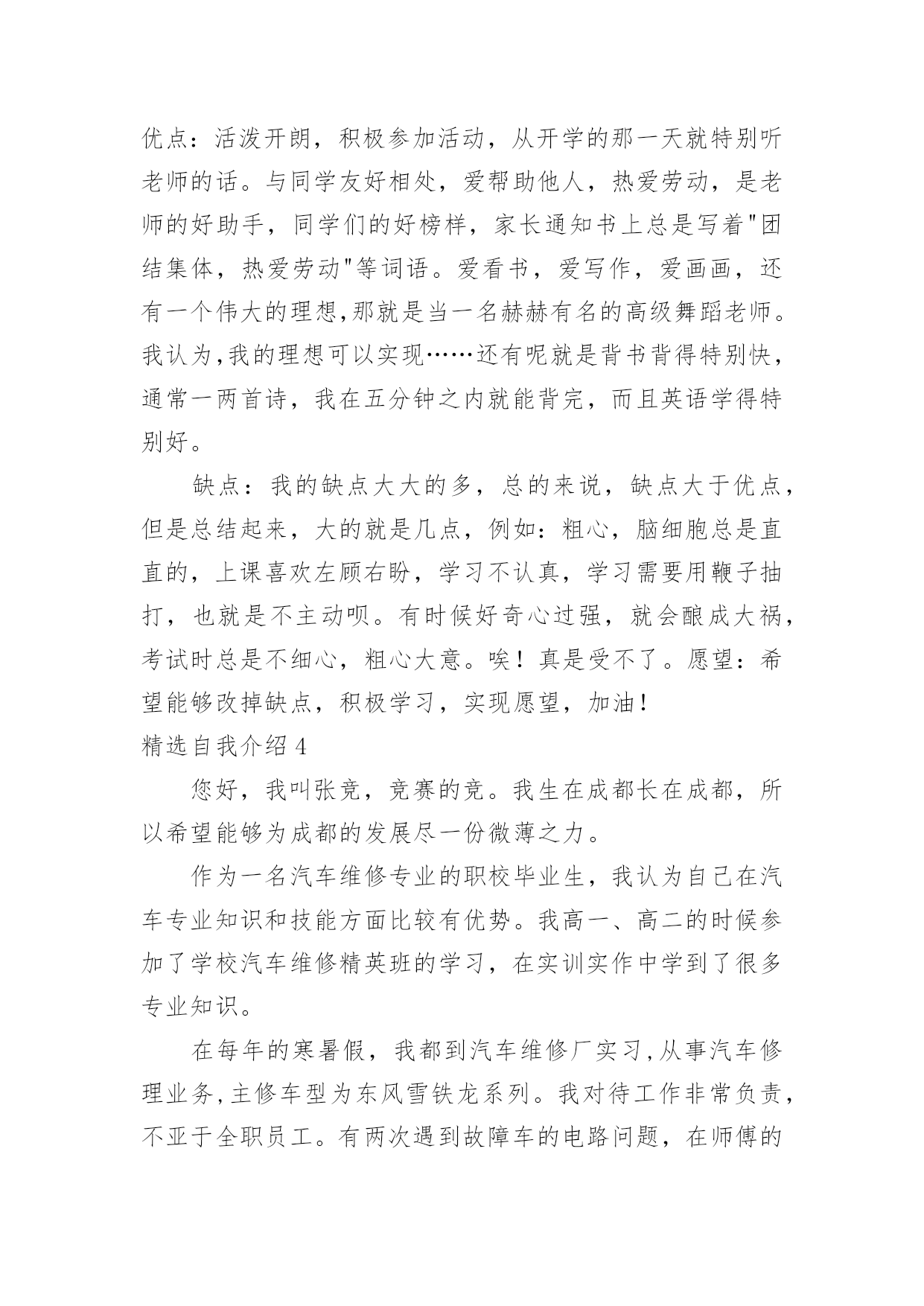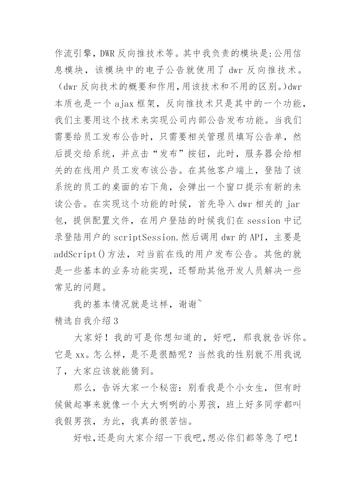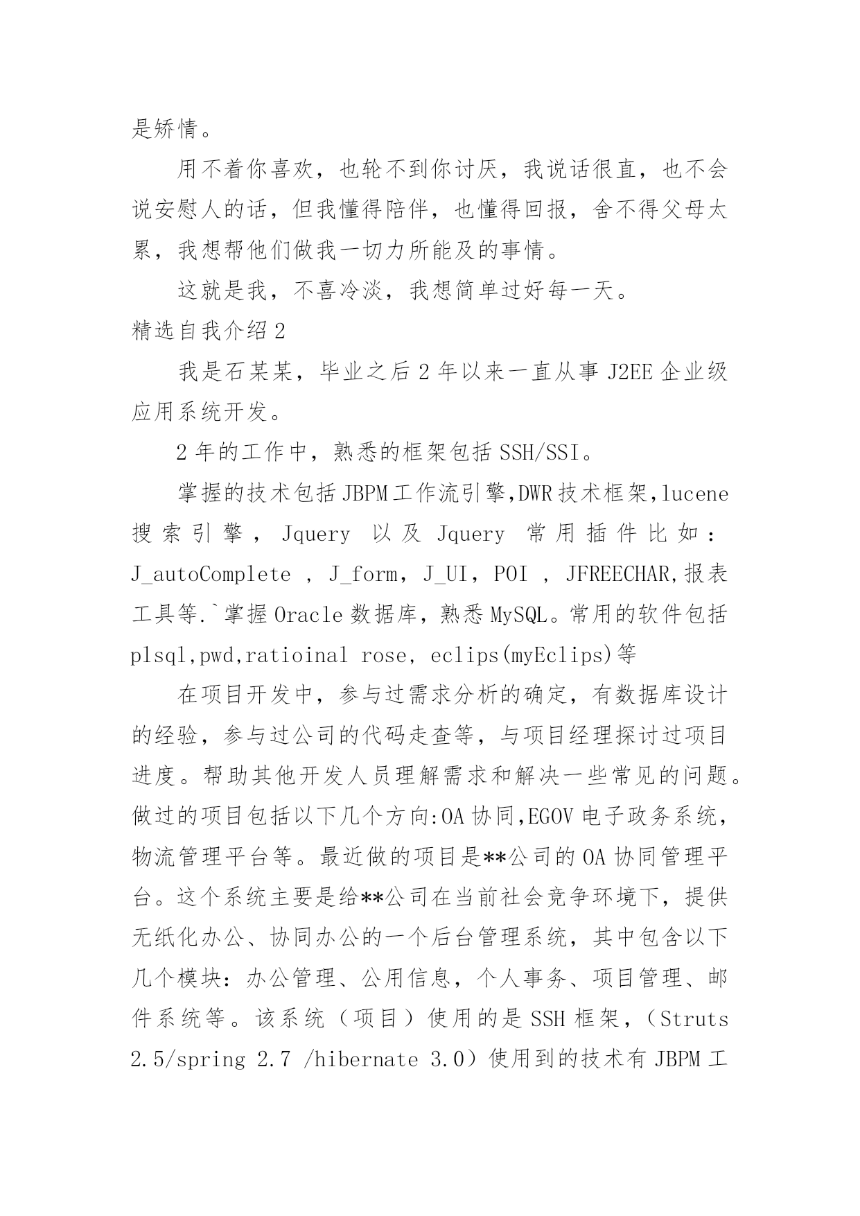 自我介绍精选自我介绍当到达一个陌生的环境后,我们时常会需要作自我介绍,自我介绍是结识新朋友的重要手段。但是自我介绍有什么要求呢?下面是小编帮大家整理的精选自我介绍,希望能够帮助到大家。精选自我介绍1我叫王淑红,00年生于夏,毕业于实验中学,有很多兴趣爱好,例如听歌。我觉得听歌是一种享受,也是一种宣泄心情的方式,伤心时可以听一些轻松欢快的曲子,无聊的闲暇时间也可以听音乐来打发时间也是一种不错的选择。我很爱干净也很勤快。我性格很内向,对外人很冷淡,但跟我熟的人都会举得我很疯,我希望和大家都能成为朋友,平时,你们所看到的都不是最真实的我自己,我也会很悲伤,会因为一点小事发脾气,我脾气不好,但留下了最真的人,因为即使我发脾气,爱我的人依然在我身边。我很坚强,比一般的女生要坚强,我不会因为一个毛毛虫而被吓哭,我也不会因为一点儿小伤心而小题大做,我觉得坚强的女孩子搜是最美丽的,我宁可笑着流泪也不会假装委屈换的别人的同情,成天杞人忧天,哭哭啼啼的女生,就是矫情。用不着你喜欢,也轮不到你讨厌,我说话很直,也不会说安慰人的话,但我懂得陪伴,也懂得回报,舍不得父母太累,我想帮他们做我一切力所能及的事情。这就是我,不喜冷淡,我想简单过好每一天。精选自我介绍2我是石某某,毕业之后2年以来一直从事J2EE企业级应用系统开发。2年的工作中,熟悉的框架包括SSH/SSI。掌握的技术包括JBPM工作流引擎,DWR技术框架,lucene搜索引擎,Jquery以及Jquery常用插件比如:J_autoComplete,J_form,J_UI,POI,JFREECHAR,报表工具等.`掌握Oracle数据库,熟悉MySQL。常用的软件包括plsql,pwd,ratioinalrose,eclips(myEclips)等在项目开发中,参与过需求分析的确定,有数据库设计的经验,参与过公司的代码走查等,与项目经理探讨过项目进度。帮助其他开发人员理解需求和解决一些常见的问题。做过的项目包括以下几个方向:OA协同,EGOV电子政务系统,物流管理平台等。最近做的项目是**公司的OA协同管理平台。这个系统主要是给**公司在当前社会竞争环境下,提供无纸化办公、协同办公的一个后台管理系统,其中包含以下几个模块:办公管理、公用信息,个人事务、项目管理、邮件系统等。该系统(项目)使用的是SSH框架,(Struts2.5/spring2.7/hibernate3.0)使用到的技术有JBPM工作流引擎,DWR反向推技术等。其中我负责的模块是:公用信息模块,该模块中的电子公告就使用了dwr反向推技术。(dwr反向技术的概要和作用,用该技术和不用的区别。)dwr本质也是一个ajax框架,反向推技术只是其中的一个功能,我们主要用这个技术来实现公司内部公告发布功能。当我们需要给员工发布公告时,只需要相关管理员填写公告单,然后提交给系统,并点击“发布”按钮,此时,服务器会给相关的在线用户员工发布该公告。在其他客户端上,登陆了该系统的员工的桌面的右下角,会弹出一个窗口提示有新的未读公告。在实现这个功能的时候,首先导入dwr相关的jar包,提供配置文件,在用户登陆的时候我们在session中记录登陆用户的scriptSession.然后调用dwr的API,主要是addScript()方法,对当前在线的用户发布公告。其他的就是一些基本的业务功能实现,还帮助其他开发人员解决一些常见的问题。我的基本情况就是这样,谢谢~精选自我介绍3大家好!我的可是你想知道的,好吧,那我就告诉你。它是xx。怎么样,是不是很酷呢?当然我的性别就不用我说了,大家应该就能猜到。那么,告诉大家一个秘密:别看我是个小女生,但有时候做起事来就像一个大大咧咧的小男孩,班上好多同学都叫我假男孩,为此,我真的很苦恼。好啦,还是向大家介绍一下我吧,想必你们都等急了吧!优点:活泼开朗,积极参加活动,从开学的那一天就特别听老师的话。与同学友好相处,爱帮助他人,热爱劳动,是老师的好助手,同学们的好榜样,家长通知书上总是写着"团结集体,热爱劳动"等词语。爱看书,爱写作,爱画画,还有一个伟大的理想,那就是当一名赫赫有名的高级舞蹈老师。我认为,我的理想可以实现……还有呢就是背书背得特别快,通常一两首诗,我在五分钟之内就能背完,而且英语学得特别好。缺点:我的缺点大大的多,总的来说,缺点大于优点,但是总结起来,大的就是几点,例如:粗心,脑细胞总是直直的,上课喜欢左顾右盼,学习不认真,学习需要用鞭子抽打,也就是不主动呗。有时候好奇心过强,就会酿成大祸,考试时总是不细心,粗心大意。唉!真是受不了。愿望:希望能够改掉缺点,积极学习,实现愿望,加油!精选自我介绍4您好,我叫张竞,竞赛的竞。我生在成都长在成都,所以希望能够为成都的发展尽一份微薄之力。作为一名汽车维修专