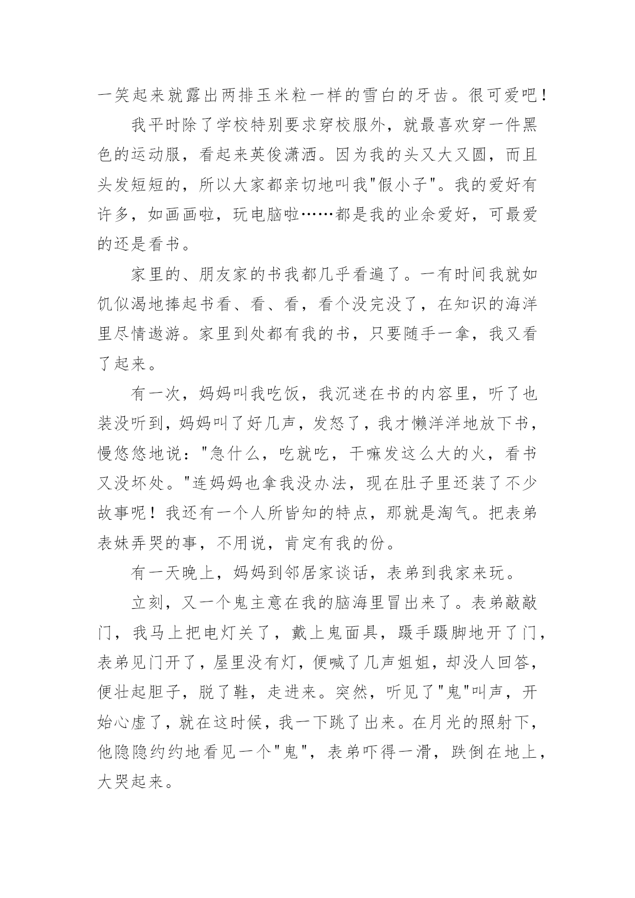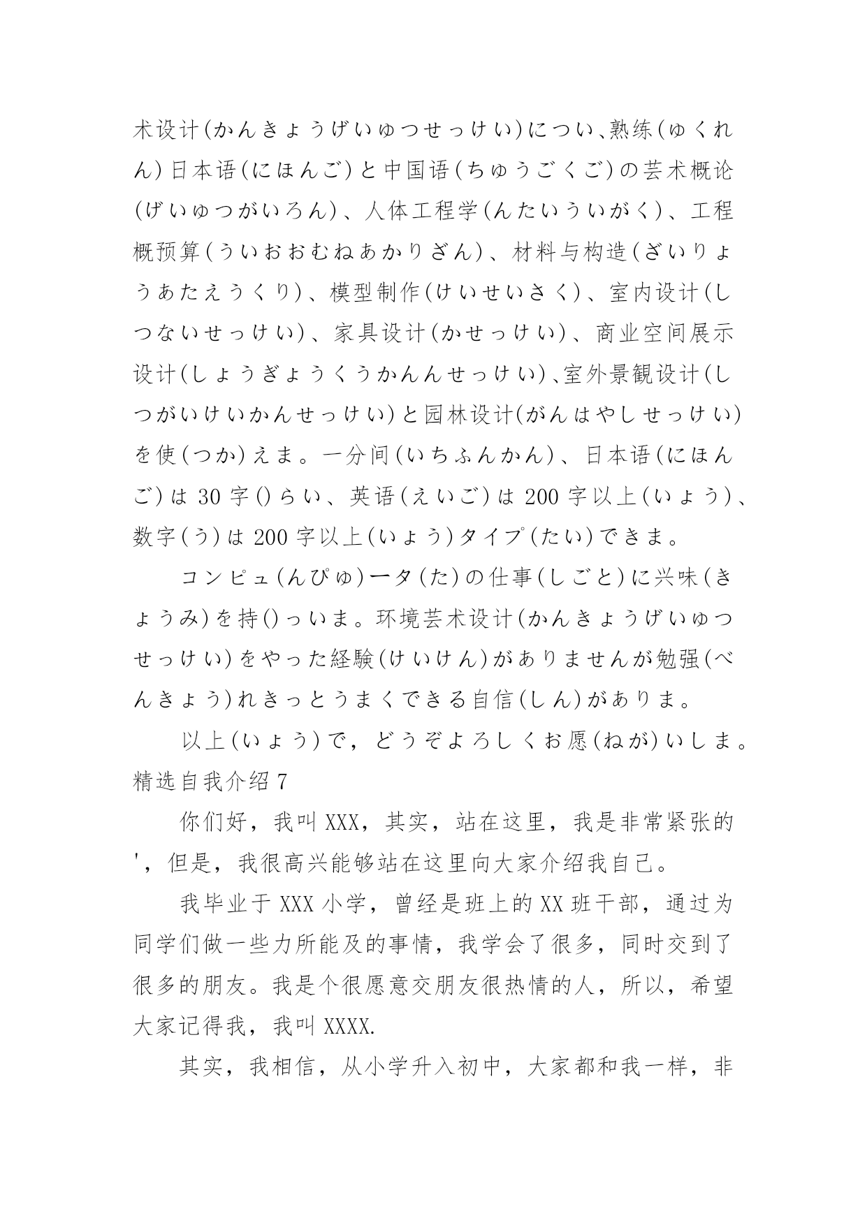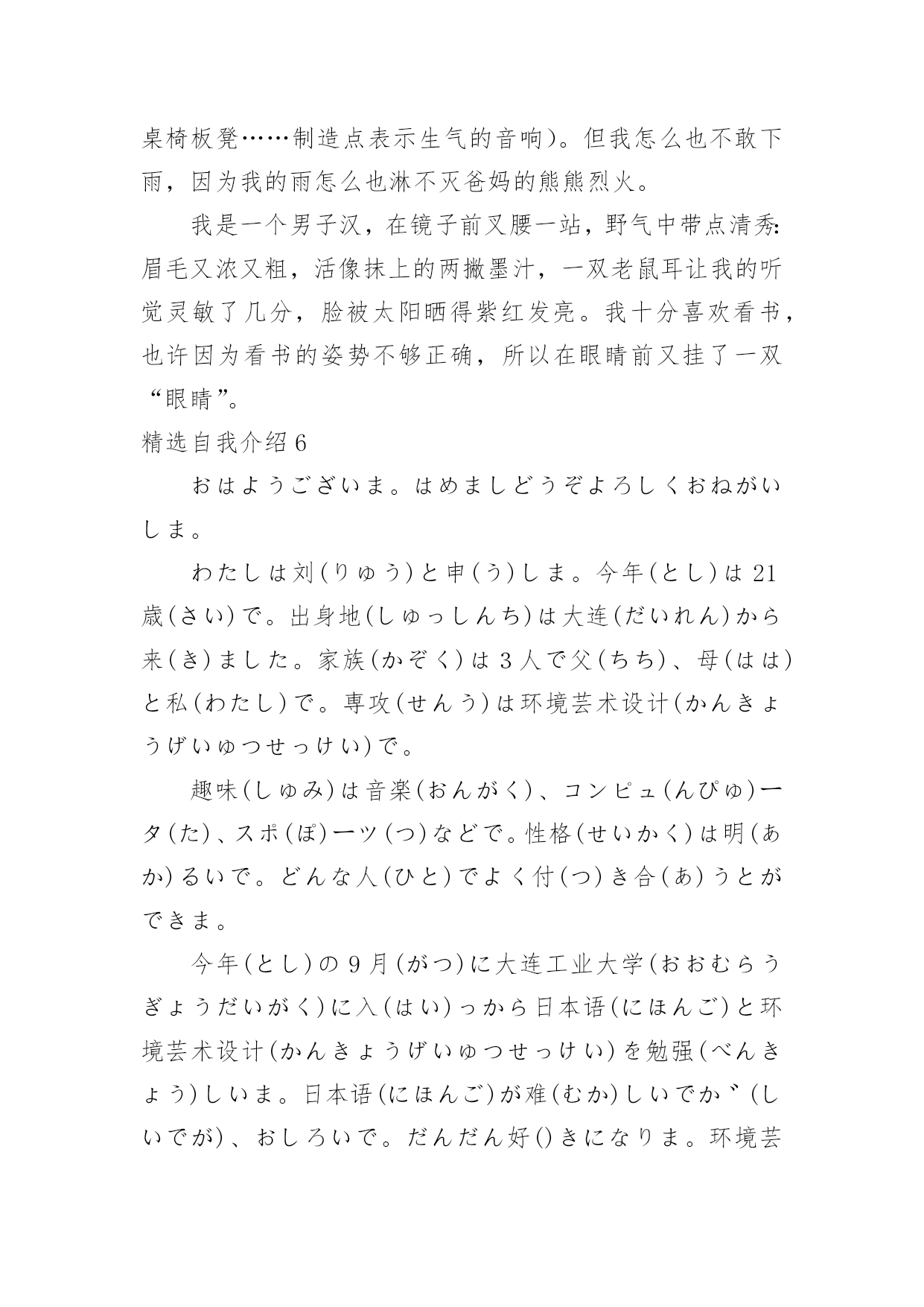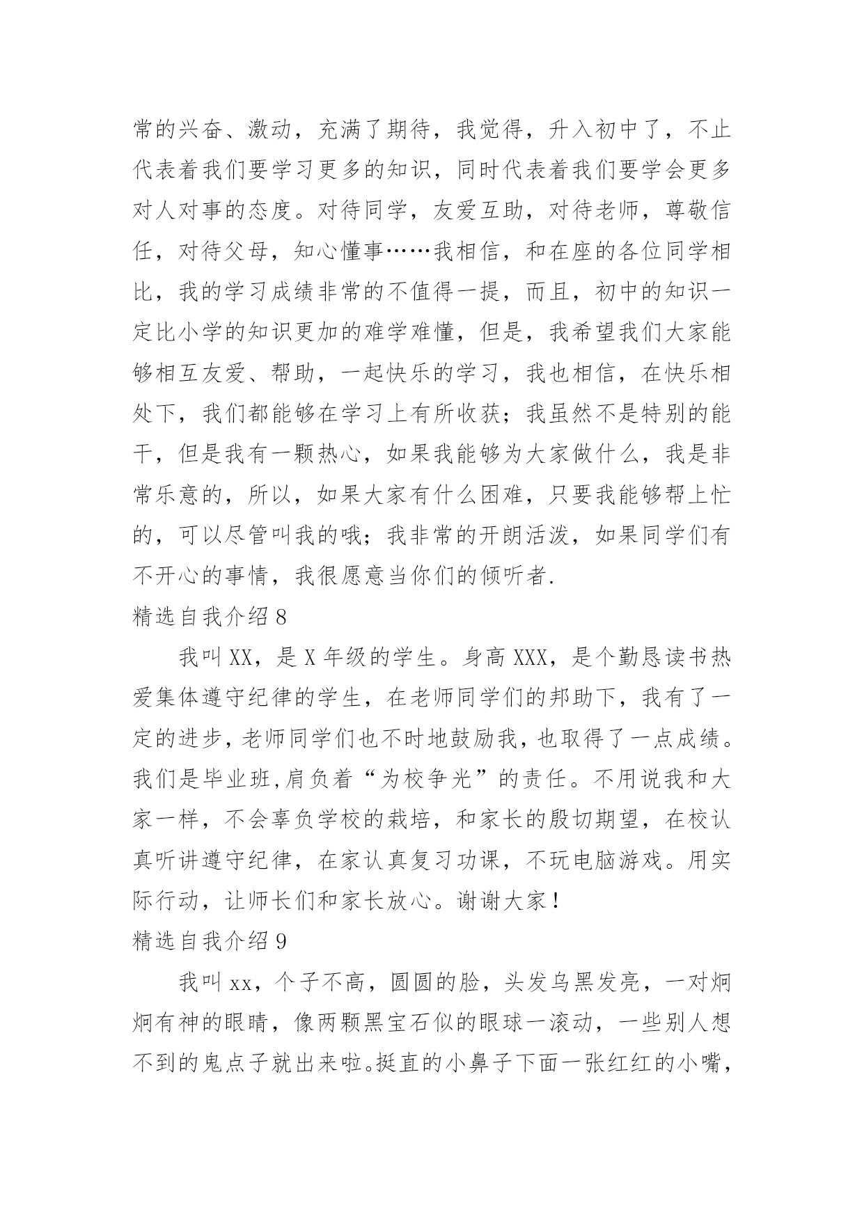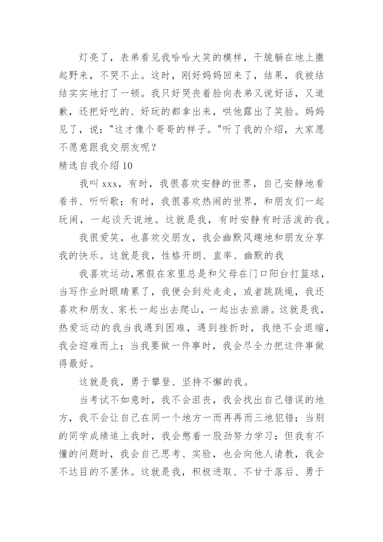 自我介绍精选自我介绍当到达一个陌生的环境后,我们时常会需要作自我介绍,自我介绍是结识新朋友的重要手段。但是自我介绍有什么要求呢?下面是小编帮大家整理的精选自我介绍,希望能够帮助到大家。精选自我介绍1我叫王淑红,00年生于夏,毕业于实验中学,有很多兴趣爱好,例如听歌。我觉得听歌是一种享受,也是一种宣泄心情的方式,伤心时可以听一些轻松欢快的曲子,无聊的闲暇时间也可以听音乐来打发时间也是一种不错的选择。我很爱干净也很勤快。我性格很内向,对外人很冷淡,但跟我熟的人都会举得我很疯,我希望和大家都能成为朋友,平时,你们所看到的都不是最真实的我自己,我也会很悲伤,会因为一点小事发脾气,我脾气不好,但留下了最真的人,因为即使我发脾气,爱我的人依然在我身边。我很坚强,比一般的女生要坚强,我不会因为一个毛毛虫而被吓哭,我也不会因为一点儿小伤心而小题大做,我觉得坚强的女孩子搜是最美丽的,我宁可笑着流泪也不会假装委屈换的别人的同情,成天杞人忧天,哭哭啼啼的女生,就是矫情。用不着你喜欢,也轮不到你讨厌,我说话很直,也不会说安慰人的话,但我懂得陪伴,也懂得回报,舍不得父母太累,我想帮他们做我一切力所能及的事情。这就是我,不喜冷淡,我想简单过好每一天。精选自我介绍2我是石某某,毕业之后2年以来一直从事J2EE企业级应用系统开发。2年的工作中,熟悉的框架包括SSH/SSI。掌握的技术包括JBPM工作流引擎,DWR技术框架,lucene搜索引擎,Jquery以及Jquery常用插件比如:J_autoComplete,J_form,J_UI,POI,JFREECHAR,报表工具等.`掌握Oracle数据库,熟悉MySQL。常用的软件包括plsql,pwd,ratioinalrose,eclips(myEclips)等在项目开发中,参与过需求分析的确定,有数据库设计的经验,参与过公司的代码走查等,与项目经理探讨过项目进度。帮助其他开发人员理解需求和解决一些常见的问题。做过的项目包括以下几个方向:OA协同,EGOV电子政务系统,物流管理平台等。最近做的项目是**公司的OA协同管理平台。这个系统主要是给**公司在当前社会竞争环境下,提供无纸化办公、协同办公的一个后台管理系统,其中包含以下几个模块:办公管理、公用信息,个人事务、项目管理、邮件系统等。该系统(项目)使用的是SSH框架,(Struts2.5/spring2.7/hibernate3.0)使用到的技术有JBPM工作流引擎,DWR反向推技术等。其中我负责的模块是:公用信息模块,该模块中的电子公告就使用了dwr反向推技术。(dwr反向技术的概要和作用,用该技术和不用的区别。)dwr本质也是一个ajax框架,反向推技术只是其中的一个功能,我们主要用这个技术来实现公司内部公告发布功能。当我们需要给员工发布公告时,只需要相关管理员填写公告单,然后提交给系统,并点击“发布”按钮,此时,服务器会给相关的在线用户员工发布该公告。在其他客户端上,登陆了该系统的员工的桌面的右下角,会弹出一个窗口提示有新的未读公告。在实现这个功能的时候,首先导入dwr相关的jar包,提供配置文件,在用户登陆的时候我们在session中记录登陆用户的scriptSession.然后调用dwr的API,主要是addScript()方法,对当前在线的用户发布公告。其他的就是一些基本的业务功能实现,还帮助其他开发人员解决一些常见的问题。我的基本情况就是这样,谢谢~精选自我介绍3大家好!我的可是你想知道的,好吧,那我就告诉你。它是xx。怎么样,是不是很酷呢?当然我的性别就不用我说了,大家应该就能猜到。那么,告诉大家一个秘密:别看我是个小女生,但有时候做起事来就像一个大大咧咧的小男孩,班上好多同学都叫我假男孩,为此,我真的很苦恼。好啦,还是向大家介绍一下我吧,想必你们都等急了吧!优点:活泼开朗,积极参加活动,从开学的那一天就特别听老师的话。与同学友好相处,爱帮助他人,热爱劳动,是老师的好助手,同学们的好榜样,家长通知书上总是写着"团结集体,热爱劳动"等词语。爱看书,爱写作,爱画画,还有一个伟大的理想,那就是当一名赫赫有名的高级舞蹈老师。我认为,我的理想可以实现……还有呢就是背书背得特别快,通常一两首诗,我在五分钟之内就能背完,而且英语学得特别好。缺点:我的缺点大大的多,总的来说,缺点大于优点,但是总结起来,大的就是几点,例如:粗心,脑细胞总是直直的,上课喜欢左顾右盼,学习不认真,学习需要用鞭子抽打,也就是不主动呗。有时候好奇心过强,就会酿成大祸,考试时总是不细心,粗心大意。唉!真是受不了。愿望:希望能够改掉缺点,积极学习,实现愿望,加油!精选自我介绍4您好,我叫张竞,竞赛的竞。我生在成都长在成都,所以希望能够为成都的发展尽一份微薄之力。作为一名汽车维修专
