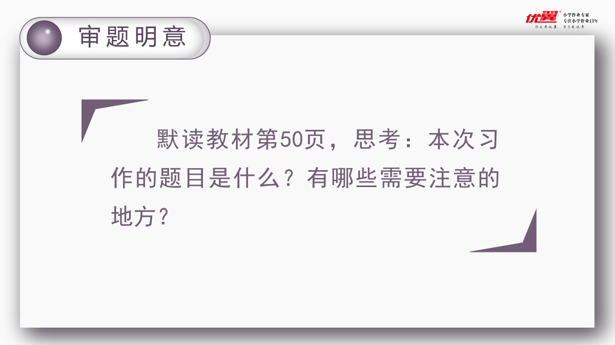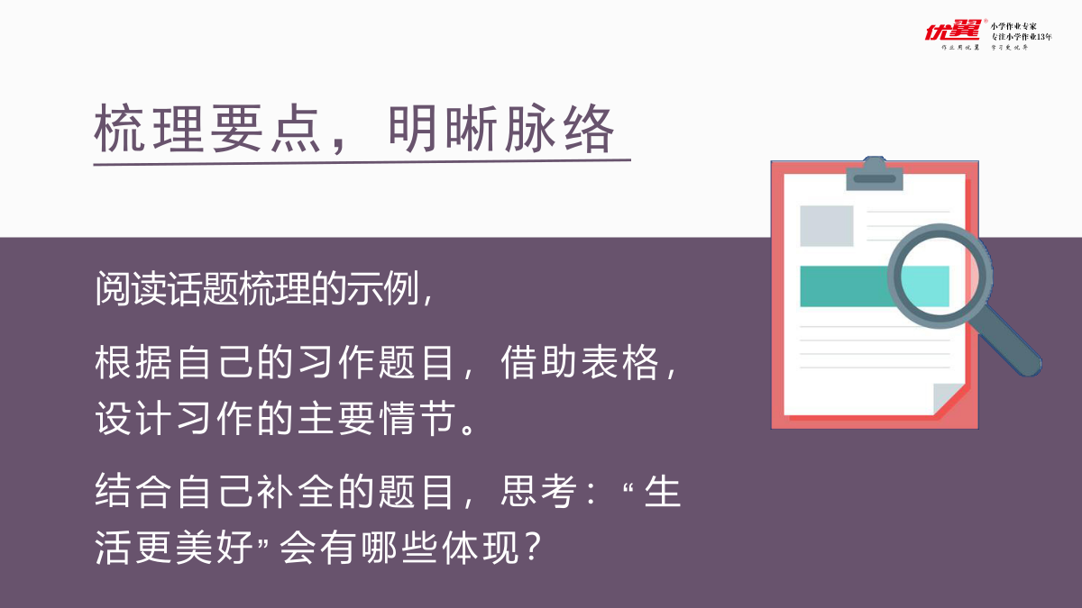 习作三________让生活更美妙[教学目标]1.选择让自己生活更美妙的一件事情、一样事物或一种品质写下来。2.写清楚它是怎样影响自己生活的,把它让生活更美妙的原因写具体。【语文要素】3.分享习作心得体会。[教学重难点]1.基于写作目的,写清楚某件事物让生活更美妙的经历,情节要围绕这件事物对生活的影响展开。2.能把某件事物让生活更美妙的原因写清楚,写具体。[教学课时]1—2课时一、仔细审题,明确要点师:同学们,在这个单元,我们通过学习课文,一起进行“有目的地阅读”。这次习作,我们也要先明确写作的目的,做到